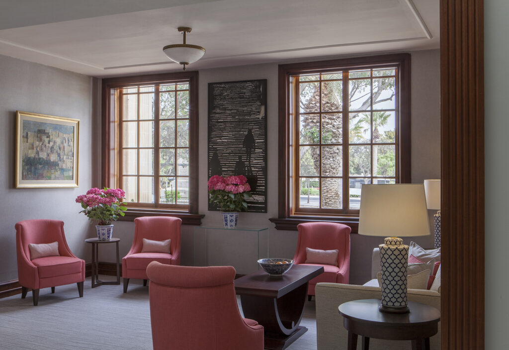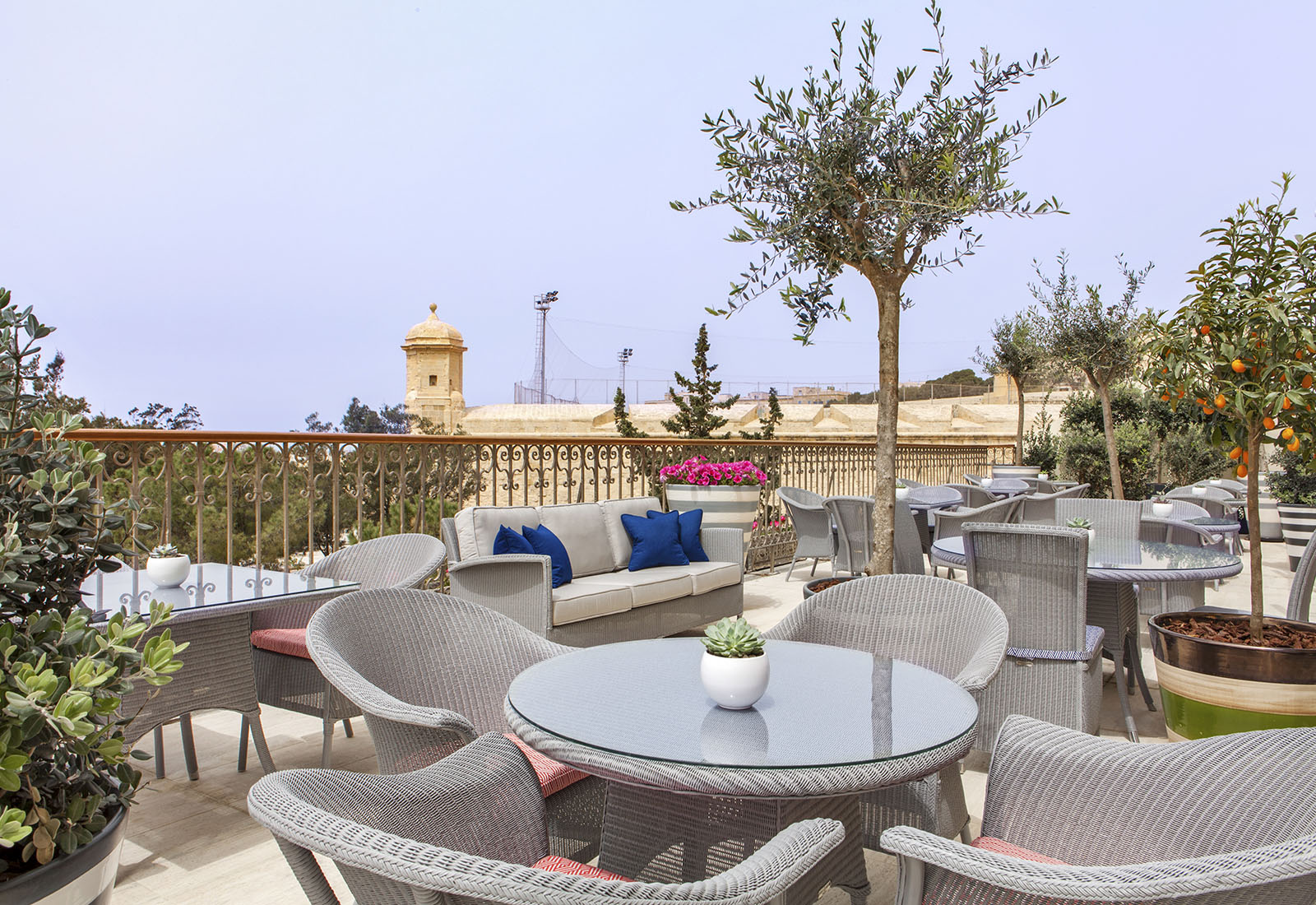 Hotellet omges av 7,5 tunnland terrasserade trädgårdar, med utsikter över hamnen och Vallettas historiska murar. Här finns lugna gångvägar, utsiktsplatser och den ikoniska Bastion Pool, inhuggen direkt i stadsmuren – en av Maltas allra första pooler. Palm Court Lounge är hotellets eleganta hjärta – en historisk mötesplats där man serverar klassiskt afternoon tea, cocktails och lätta rätter i en atmosfär som kombinerar sofistikerad historia med avkopplad elegans. Afternoon tea är en av hotellets signaturupplevelser, med handgjorda bakverk och scones. 1 200 kvm spa & wellness-avdelning integrerat i en äkta 1500-talsmur.