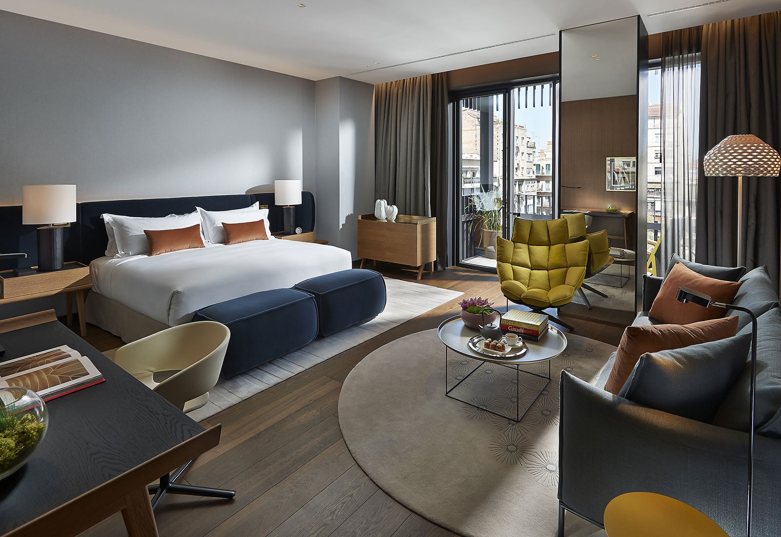 Minimalism, ljus, bekvämlighet, rena linjer, sparsmakad färgskala och det allra senaste i form av utrustning och accessoarer. I deluxerum mot boulevarden ser du hela Barcelona city. Hungrig? Restaurang Moments har en Michelinstjärna och är bland stans bästa; i trädgården finns romantiska Restaurang Mimosa.