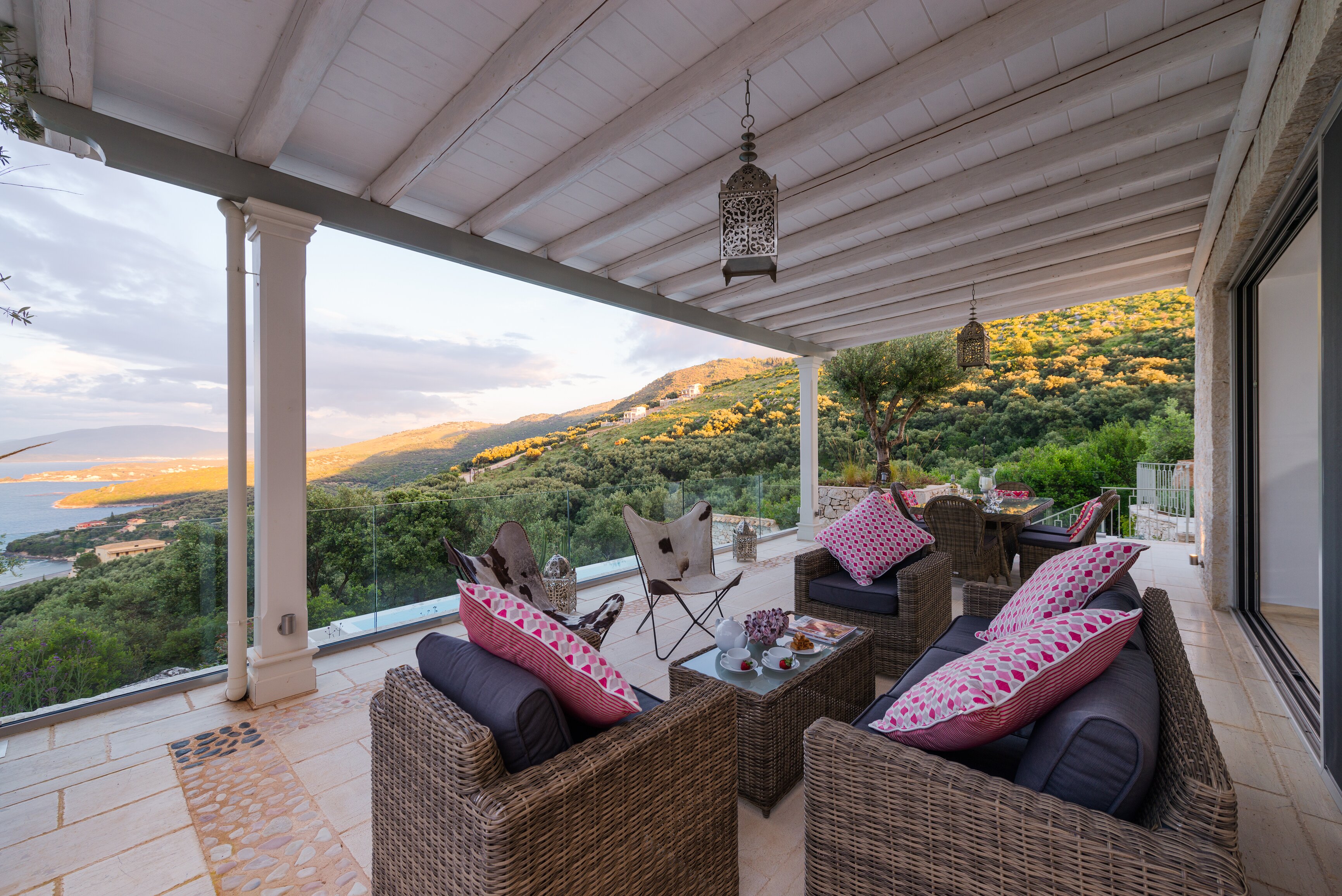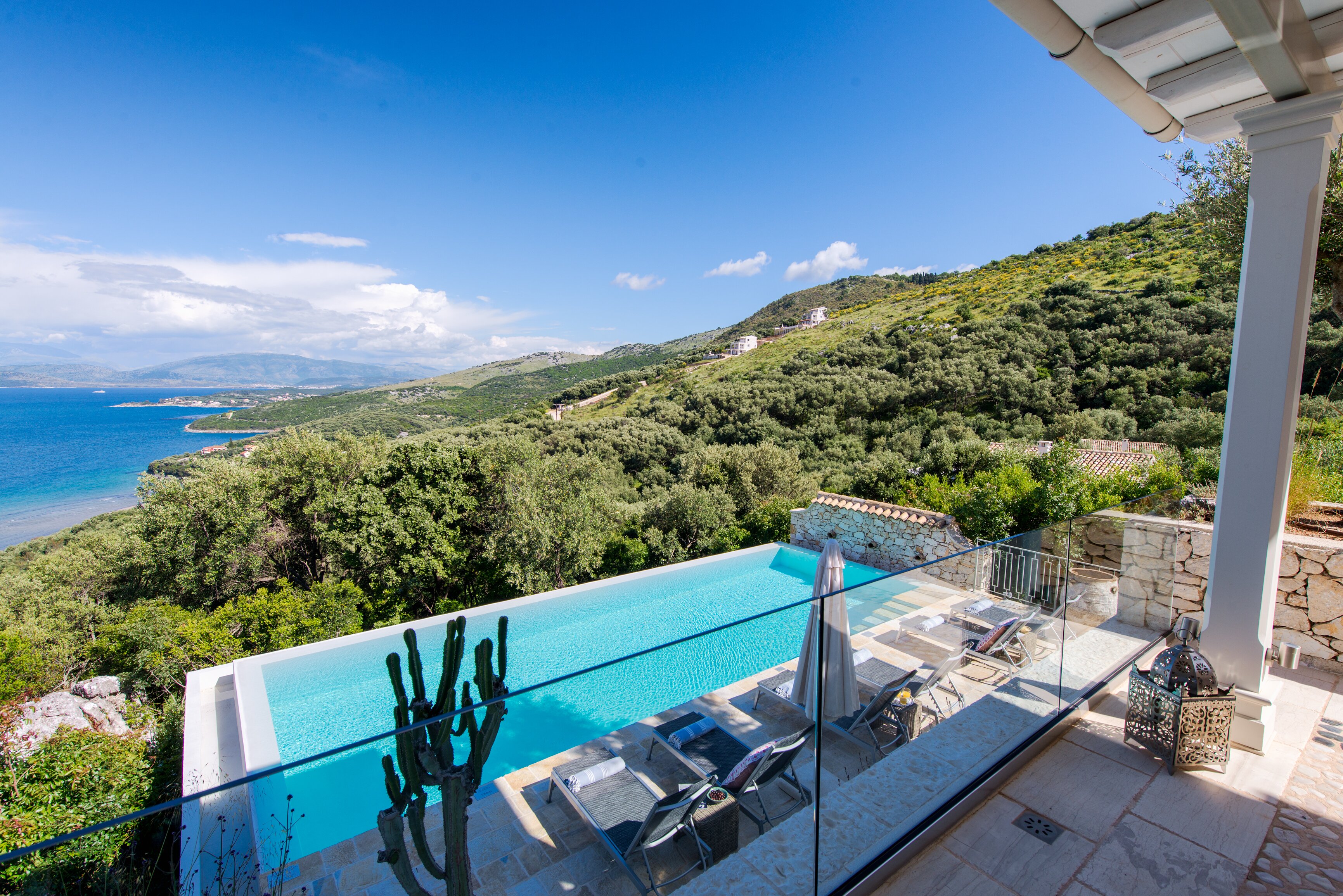 Perched on a coastal hillside overlooking Kalamaki Bay, this luxury villa in Corfu is privately secluded in large landscaped gardens, with brilliant sea views from every room and from furnished terrace