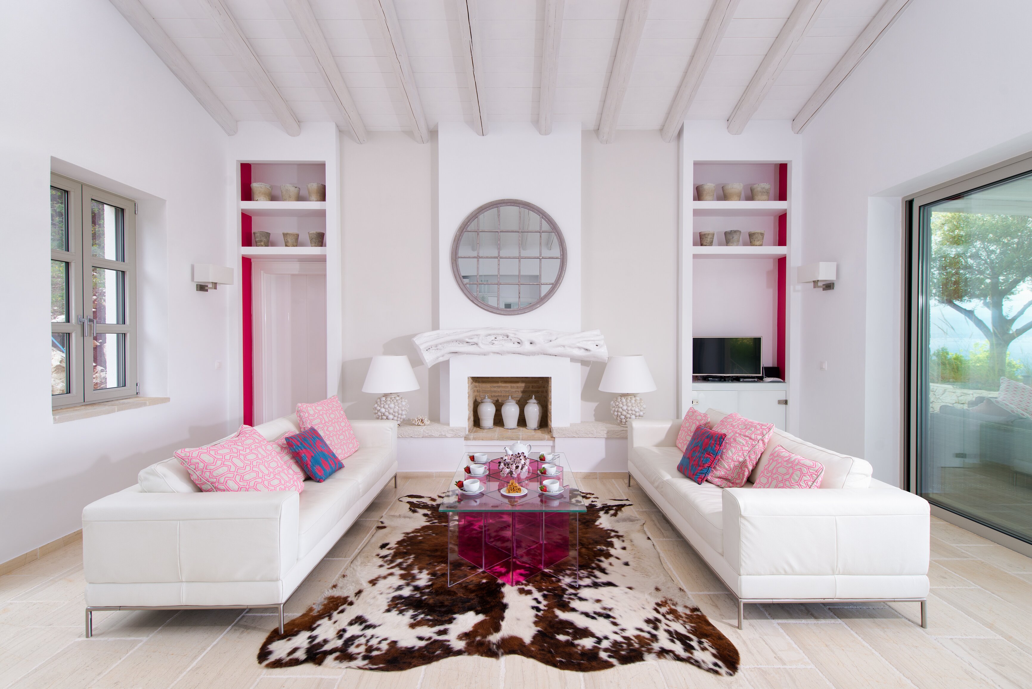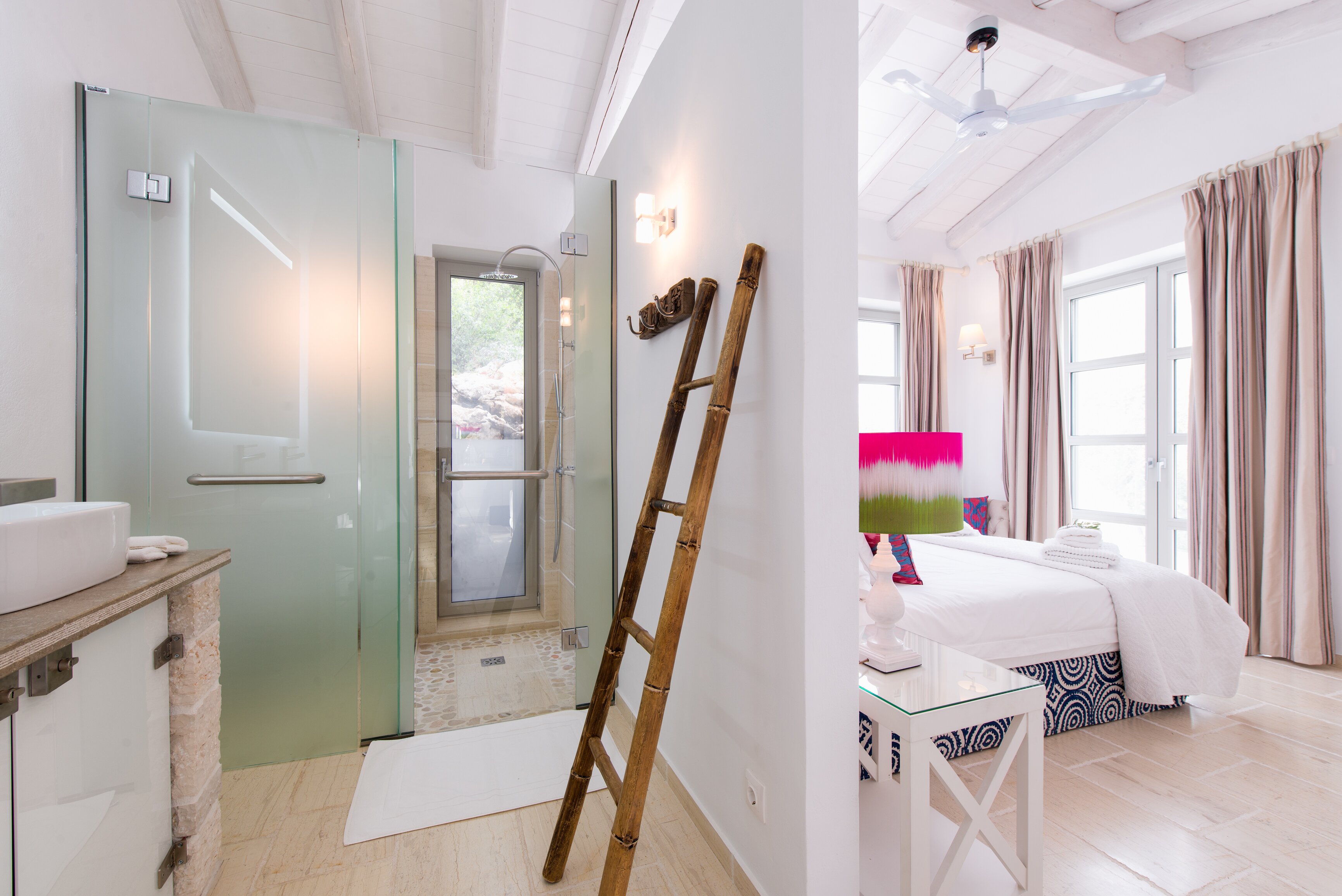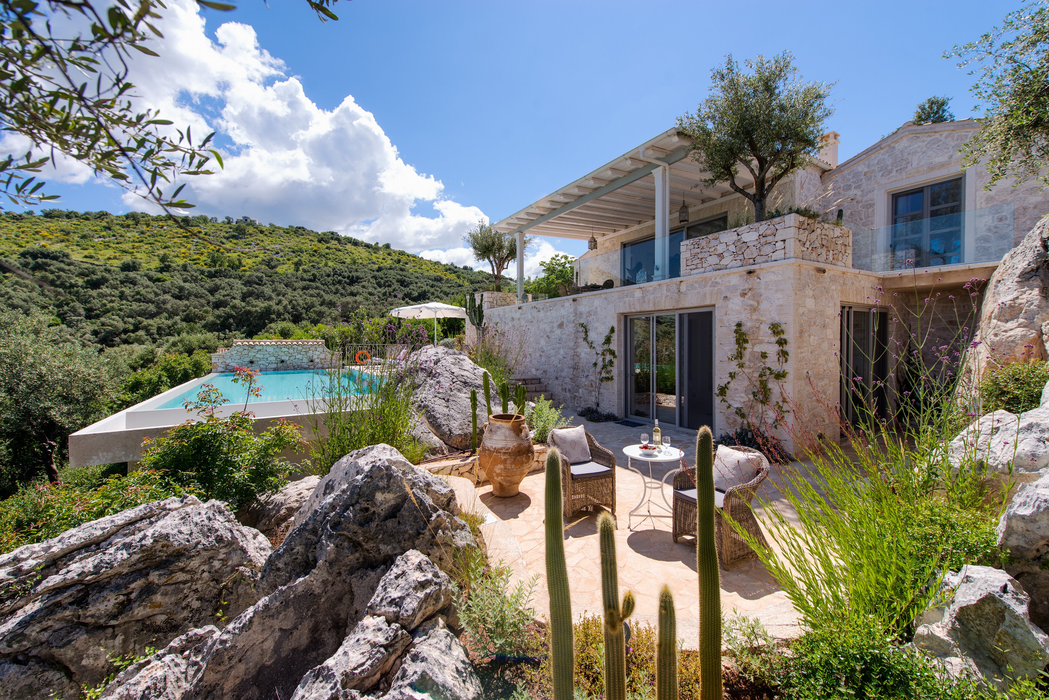 The private Kardaki Estate spreads over forty acres of olive grove slopes, at the north-eastern tip of Corfu, between popular Kassiopi and peaceful St. Spiridon. With gorgeous views down to the sea and sands of Kalamaki Bay, Acacia House is proving an enormous success. Steeped in tranquillity, its architectural design and interior décor reflect Greek island traditions, while adding 21st century facilities, and a chic and contemporary style. Terraced into the slope, the villa’s main floor is home to two en suite bedrooms, each with a private patio; and to a modern kitchen and a large living/dining room with huge glass doors to a covered terrace. With lounging and dining areas, olive tree shade and views over the Ionian Channel, the broad terrace has an exterior stairway to the lower level, where a guest suite enjoys extra privacy, opens on to the poolside and has the option of an extra child’s bed. The villa’s generous infinity pool is the focus of al fresco living. Tavernas in pretty Perithia are just 1km away.