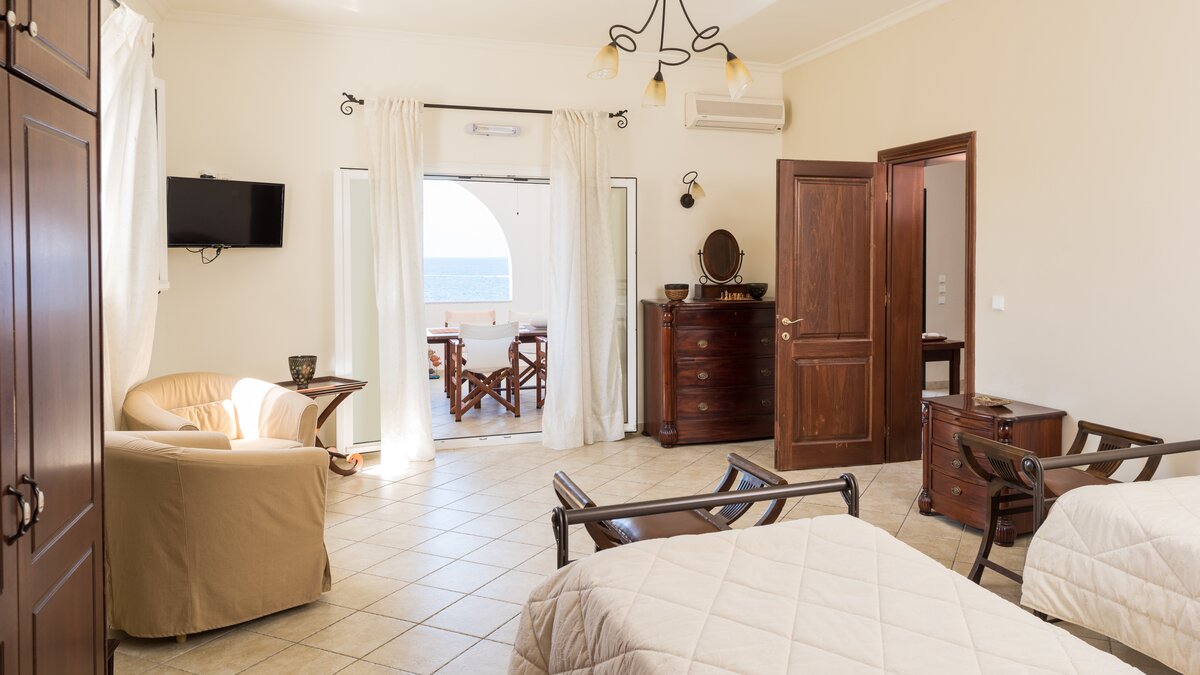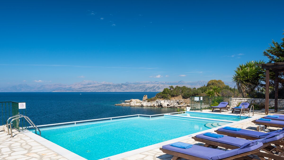 With rock bathing quite literally ‘on the doorstep’ and the beautiful Kanoni and Bataria beaches a five minute stroll away, this very comfortable family villa boasts an enviable location and really makes the most of it with terraces and verandas on three levels. All enjoy fantastic views across the bay to Albania’s coastal mountains, and all are furnished to form expansive al fresco living space. At ground level, just a few feet above the sea, a lovely infinity swimming pool is joined by a generously sized children’s pool, and overlooked from the main sitting/dining veranda, where big arches frame the views. The sunny upper terrace is shared by two large bedrooms, and the double room on the top floor has a private balcony. Each of the four bedrooms has a TV and air conditioning, and the house has a play room and open-plan living/dining room. Set on the headland which is crowned by Kassiopi’s fortress ruins, Aktea is an easy walk, along a fairly quiet road, from the resort’s amenities and nightlife, making it an especially popular choice for families with teenagers.