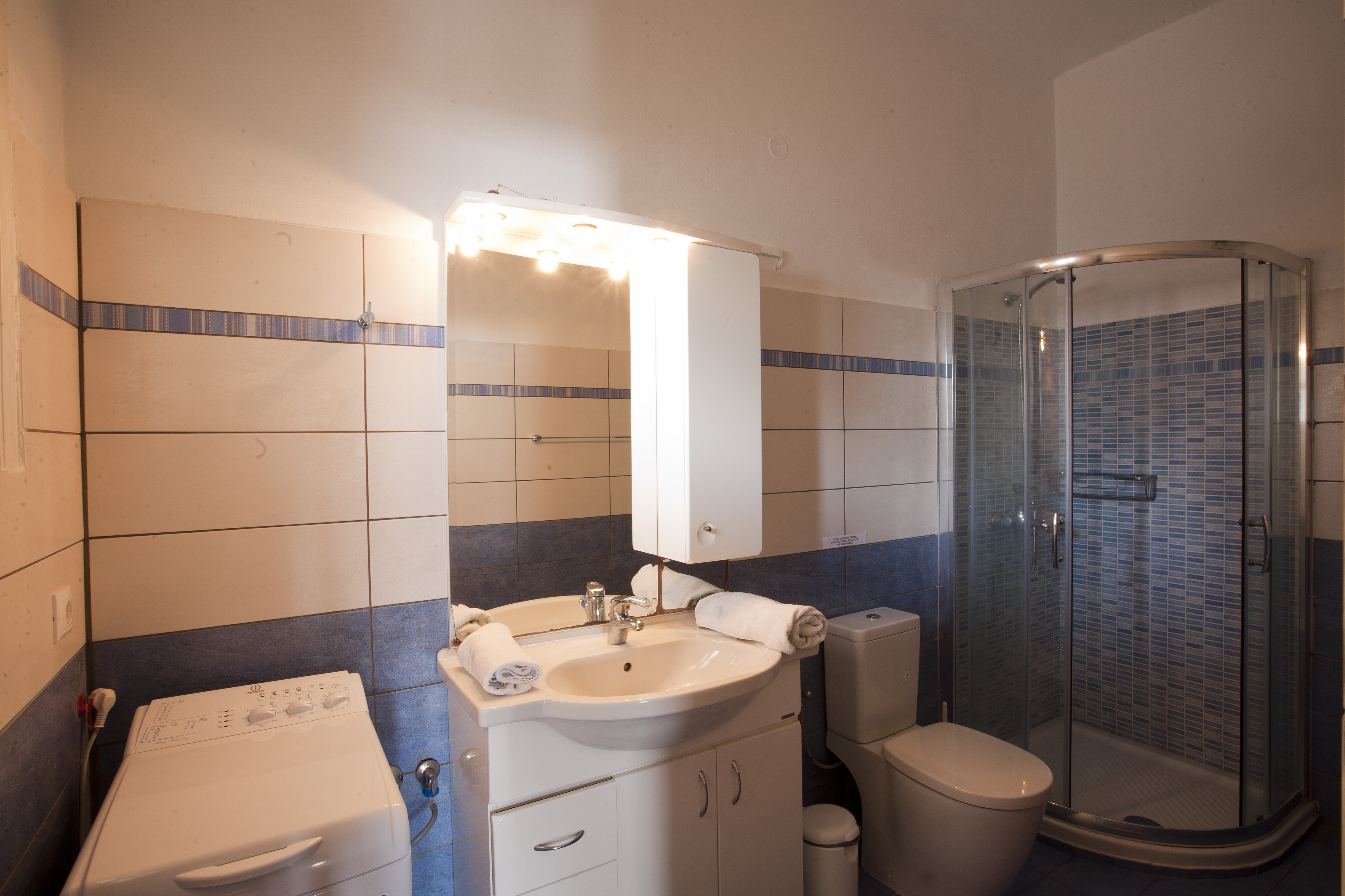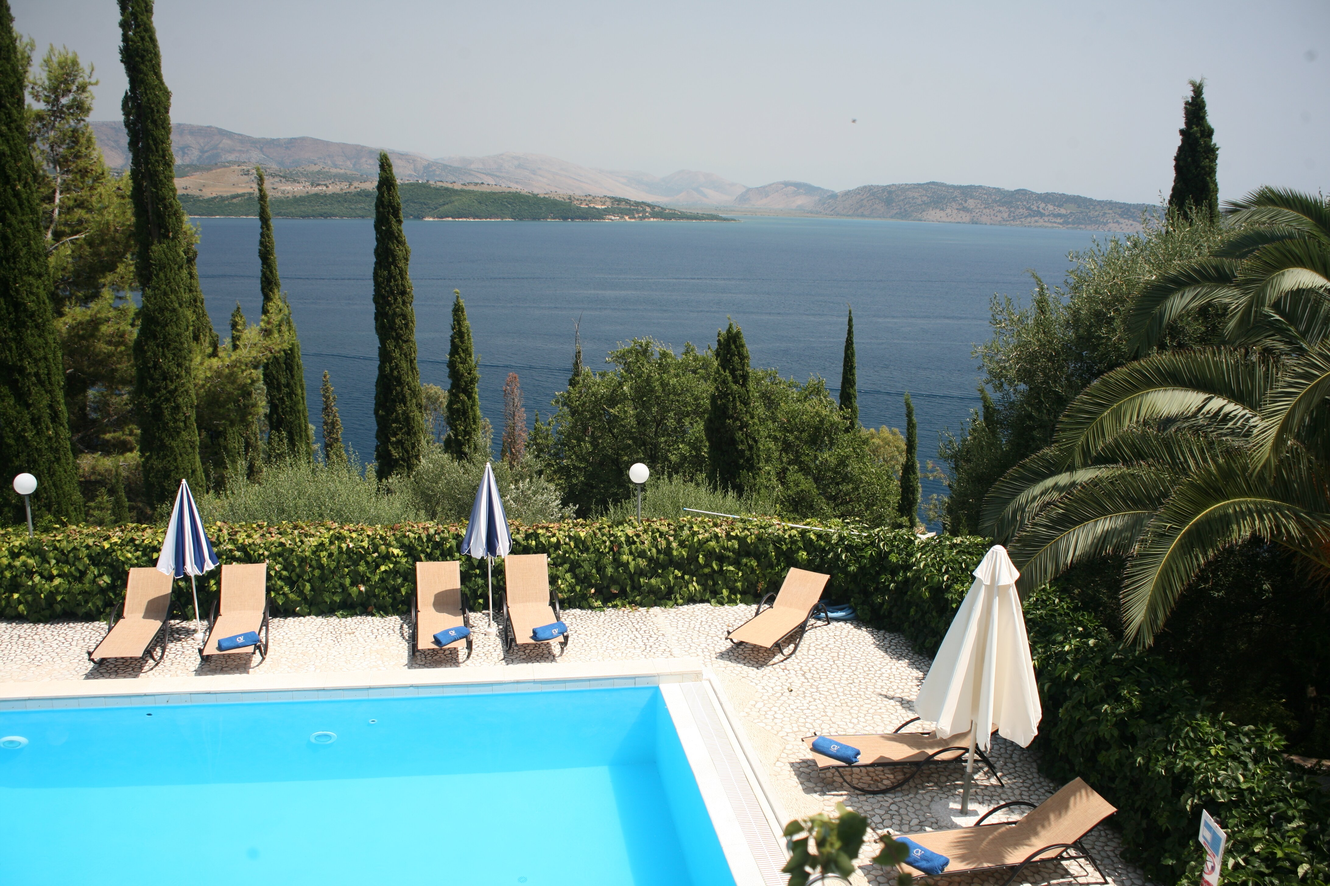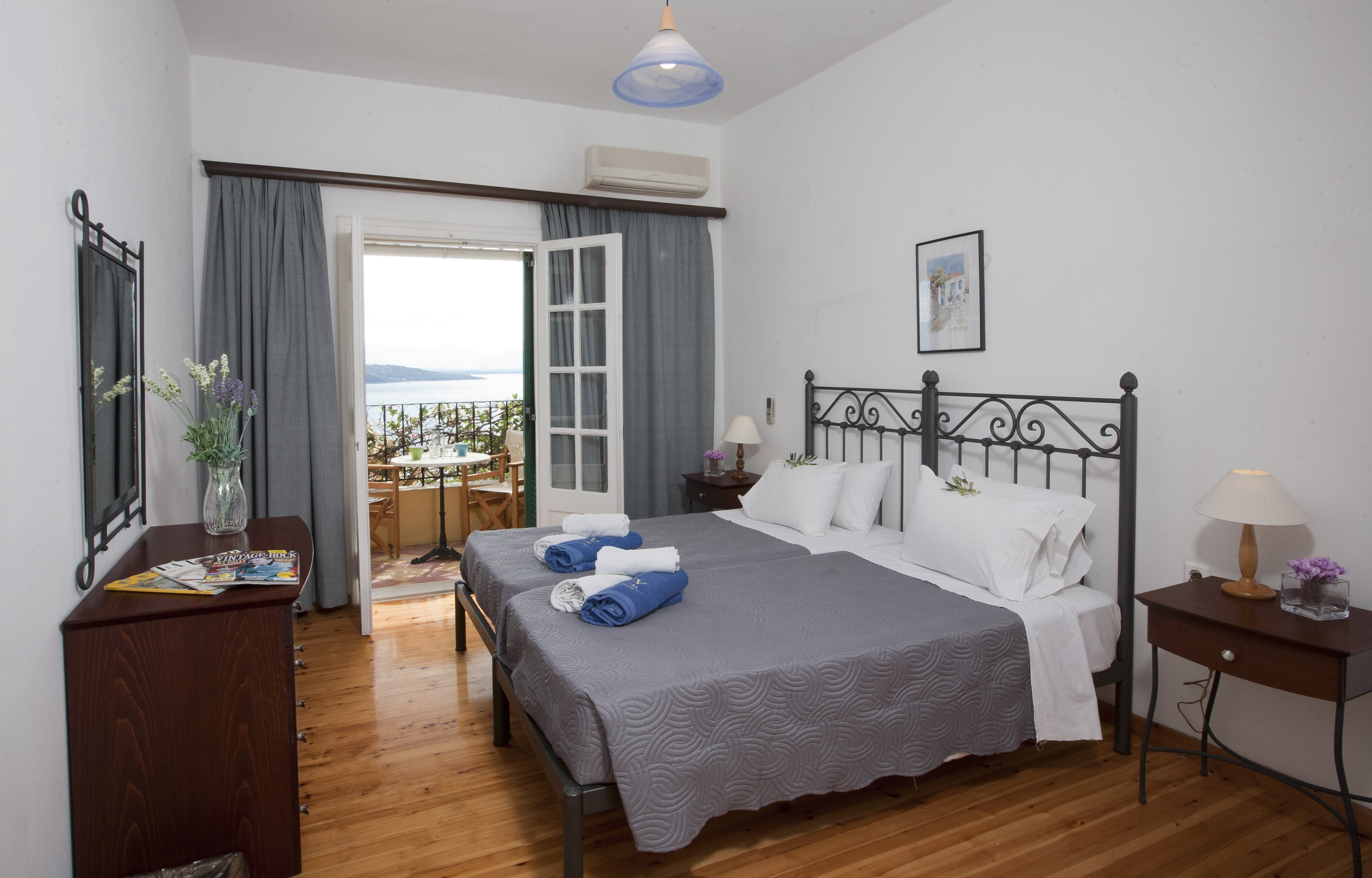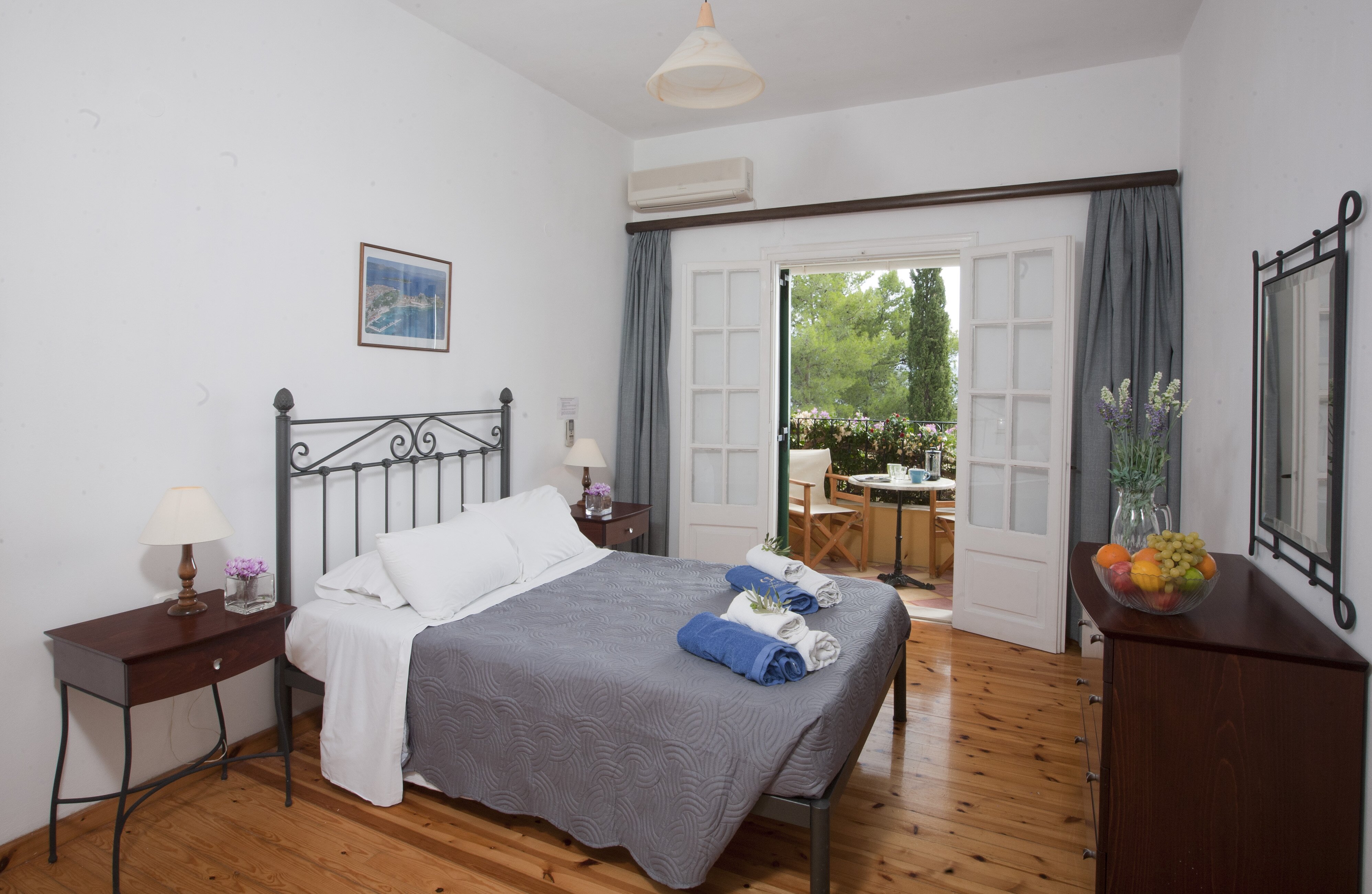 Cloaked in colourful cascades of trailing flowers and bright bougainvillea, the very photogenic Kasometria is built over several levels, enabling each separate apartment to enjoy glorious sea views from its private balcony or terrace. Located on the first floor, Angela also has a second shady terrace, facing the hillside behind the property and accessed from the living room. This is furnished in cheerful colours and is open-plan to a bar-style kitchen, and there are two bedrooms, each with air conditioning. A lovely choice for a family or friends, Kasomitria is unpretentious, comfortably furnished and affordably priced.Its six apartments share a swimming pool and children’s splash pool set in a sunny sea-view terrace, a built-in barbecue area, and a tennis court which, it must be said, is more for fun than serious competition. With gorgeous views of the bay and mountains beyond, it is a ten minute walk from Kerasia beach and fifteen minutes from St. Stephano. Two or more of the apartments could be booked together here, and the entire villa would accommodate eighteen.