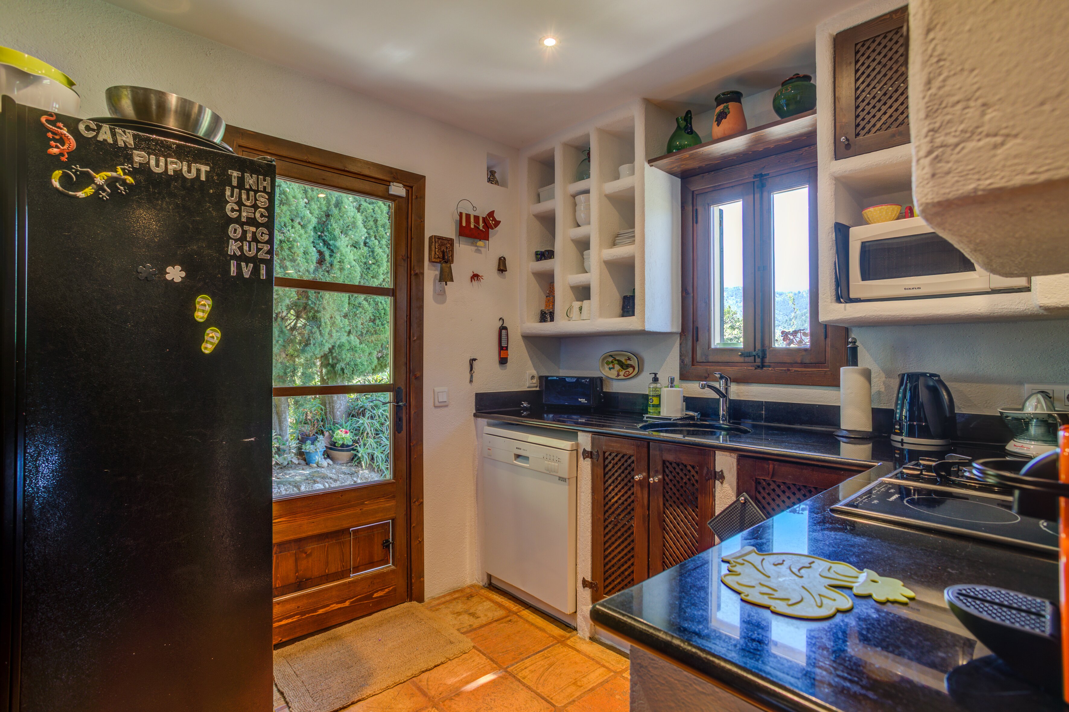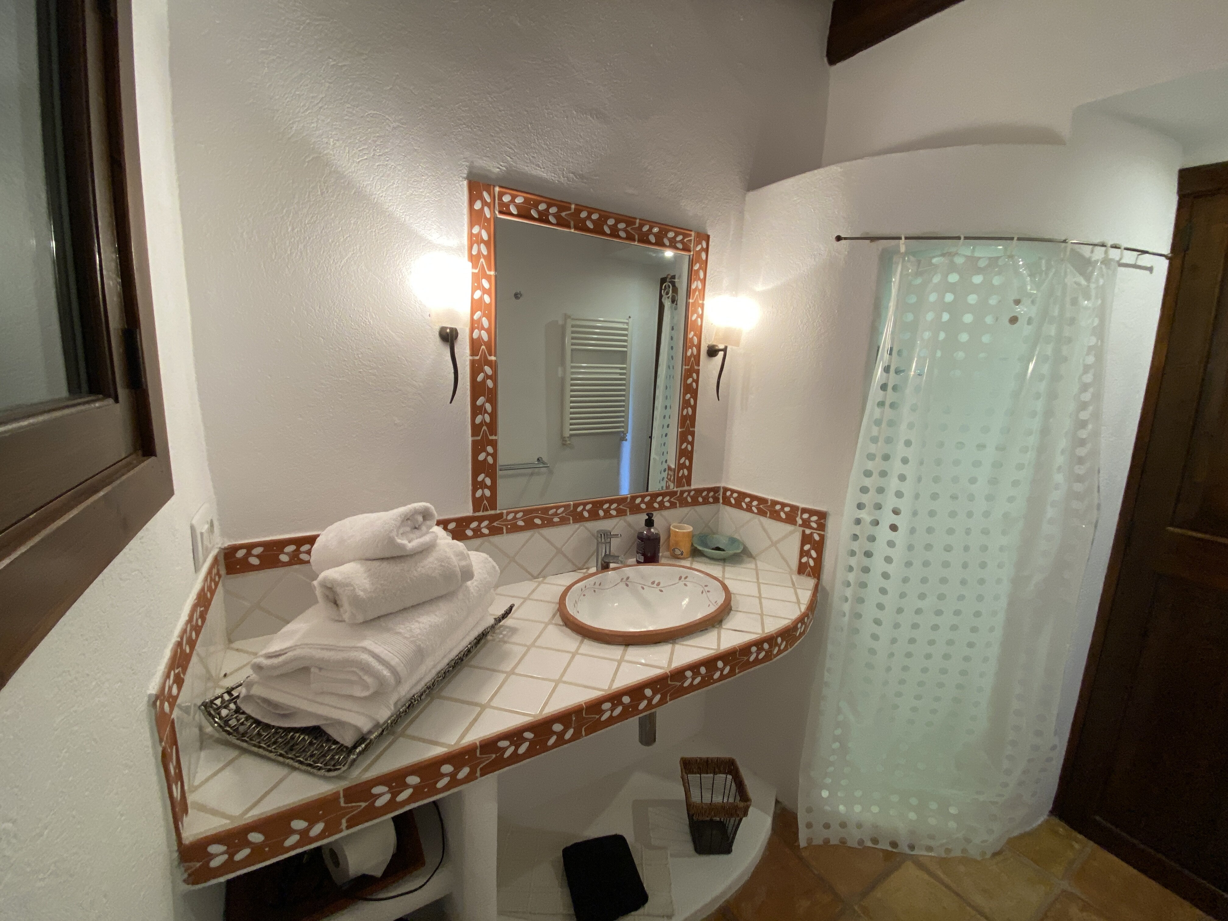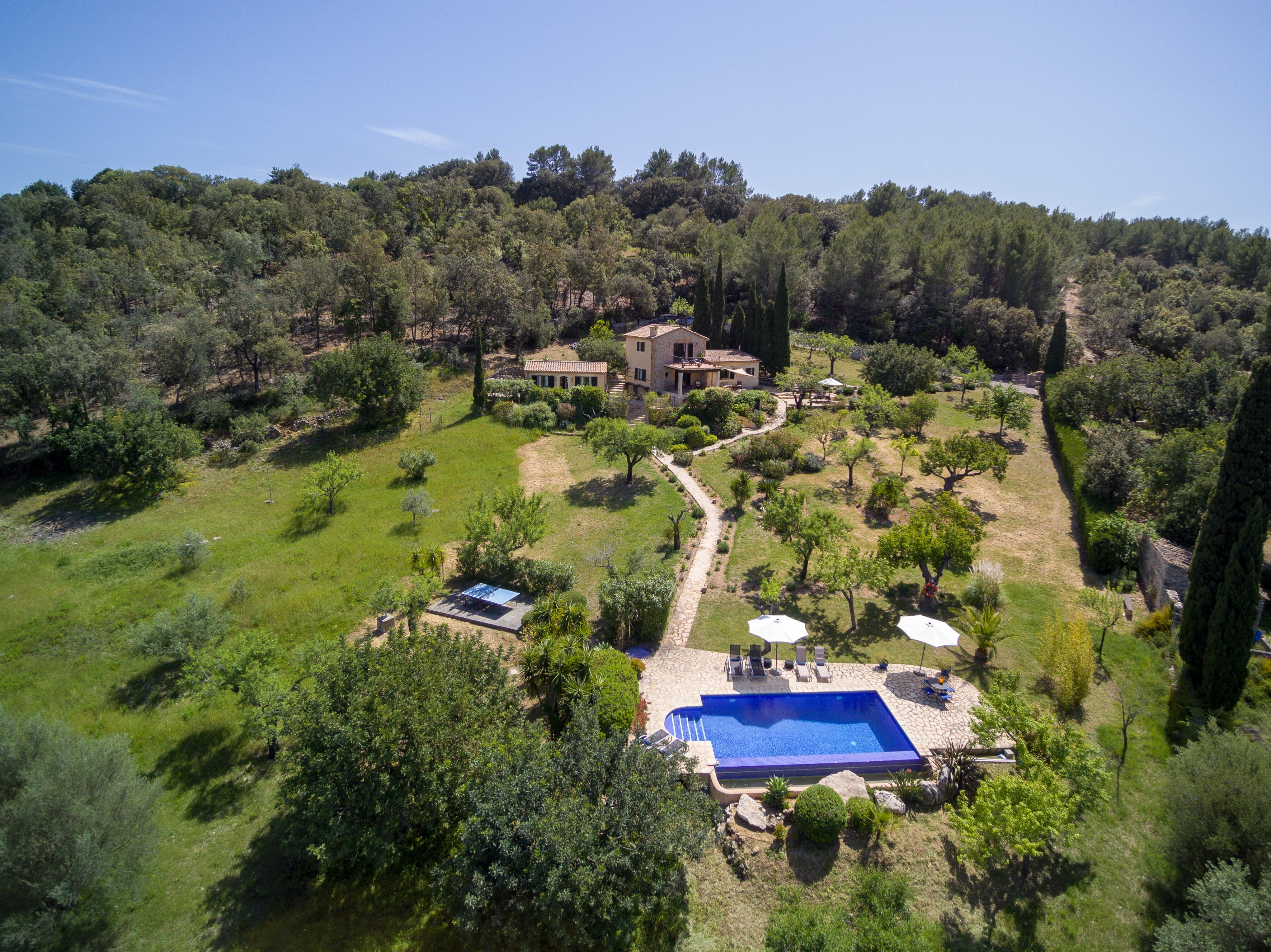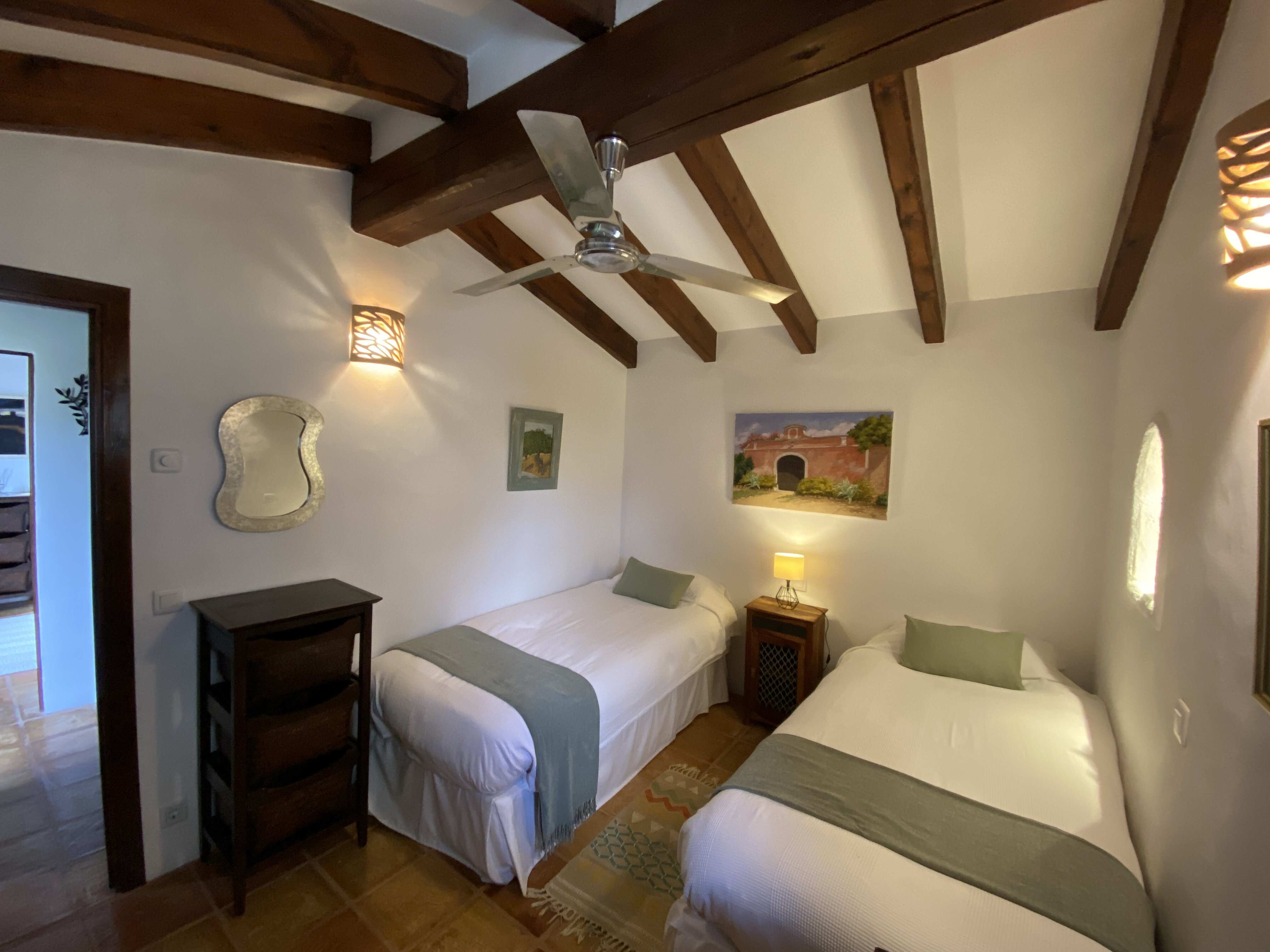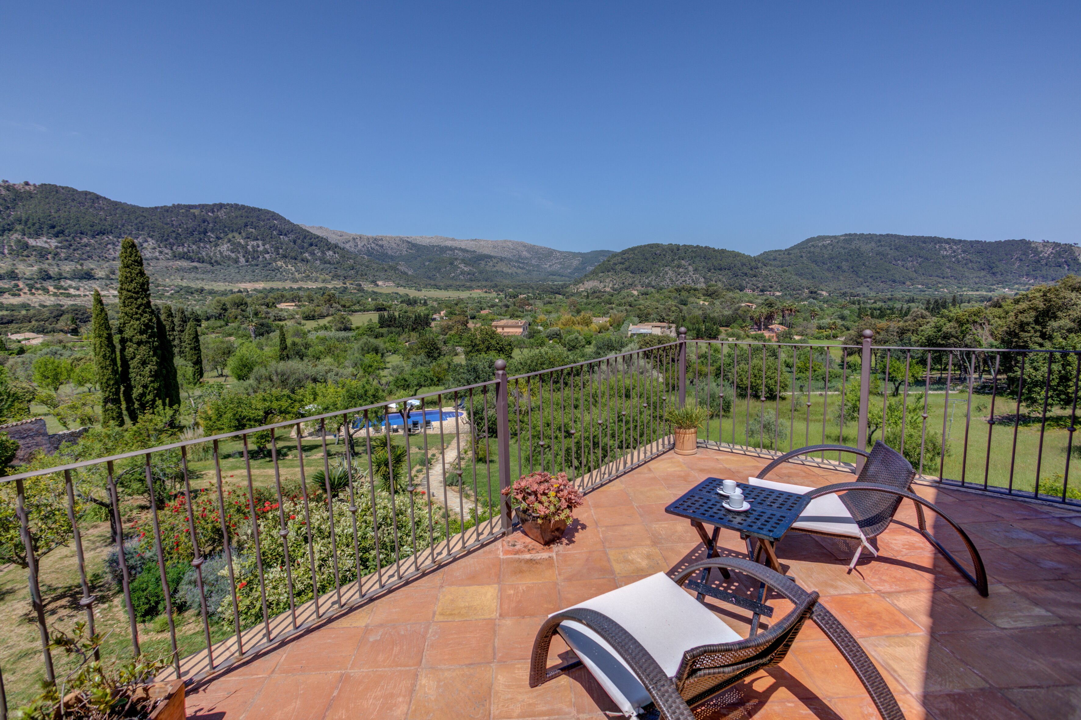 Tucked away in unspoilt countryside, this charming villa is set at the top of a sloping garden, where banks of lavender scent the air and line the pathways down to an infinity swimming pool. A parasol on the paved poolside terrace shades a pretty table, perfectly placed for sundowners, while higher in the garden a lovely dining patio looks through a little orchard to the pool and its mountain backdrop. Within the welcoming and comfortably furnished house, a combined living/dining room adjoins a compact but well equipped kitchen, and the staircase leads straight into the cosy master bedroom, with en suite bathroom and a panoramic furnished balcony. The other two bedrooms are in a bedroom wing just a few steps away from the main house, a layout which could suit two couples holidaying together. A couple can also take just the main house and the bedroom wing will be closed. While Ca’n Puput feels very private, it is a walkable 1km from Campanet, where there are shops and restaurants, caves and tennis courts, and Pollensa’s beaches are an easy fifteen minute drive away. Some of Mallorca's best restaurants are within very easy reach at Moscari and Caimari.