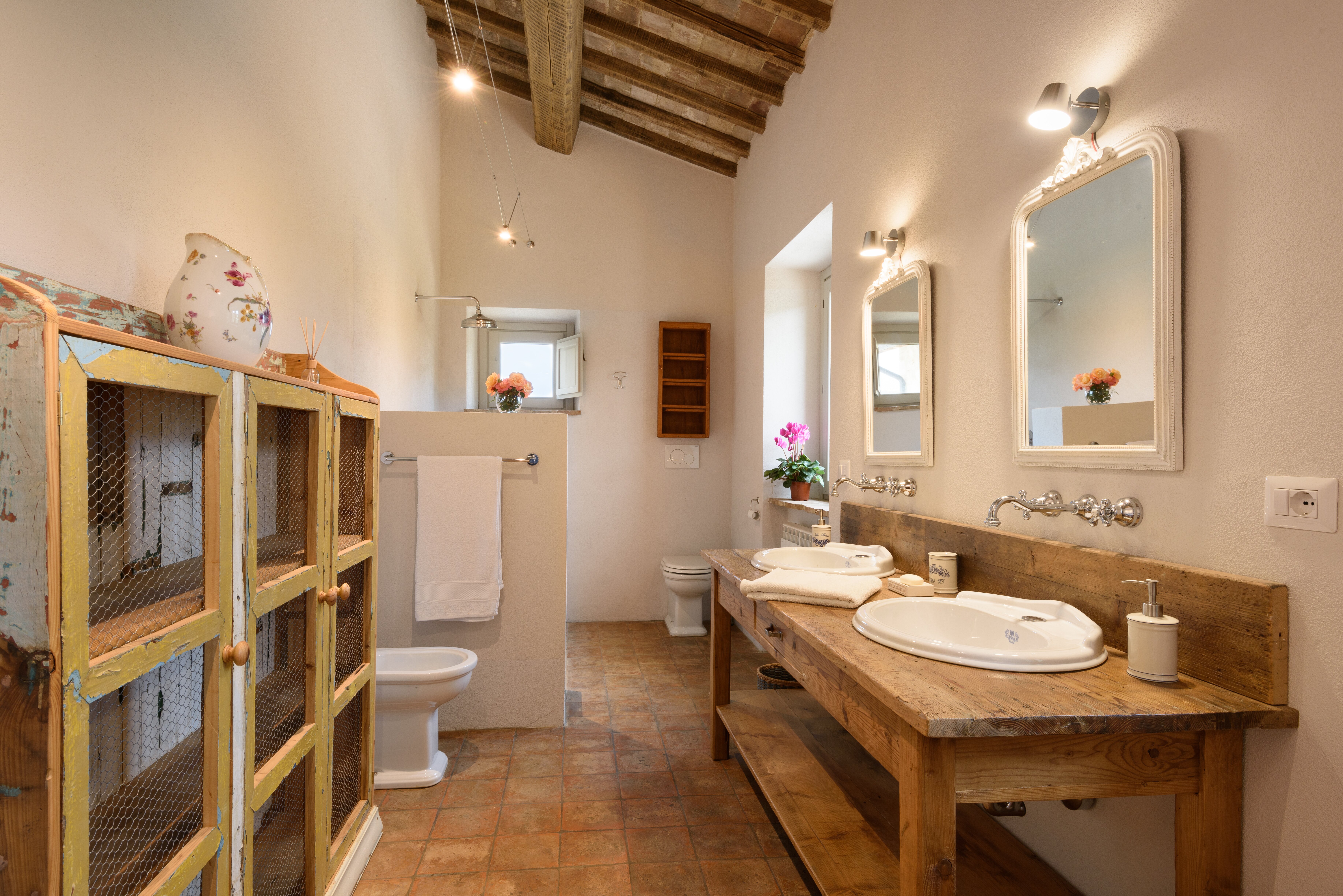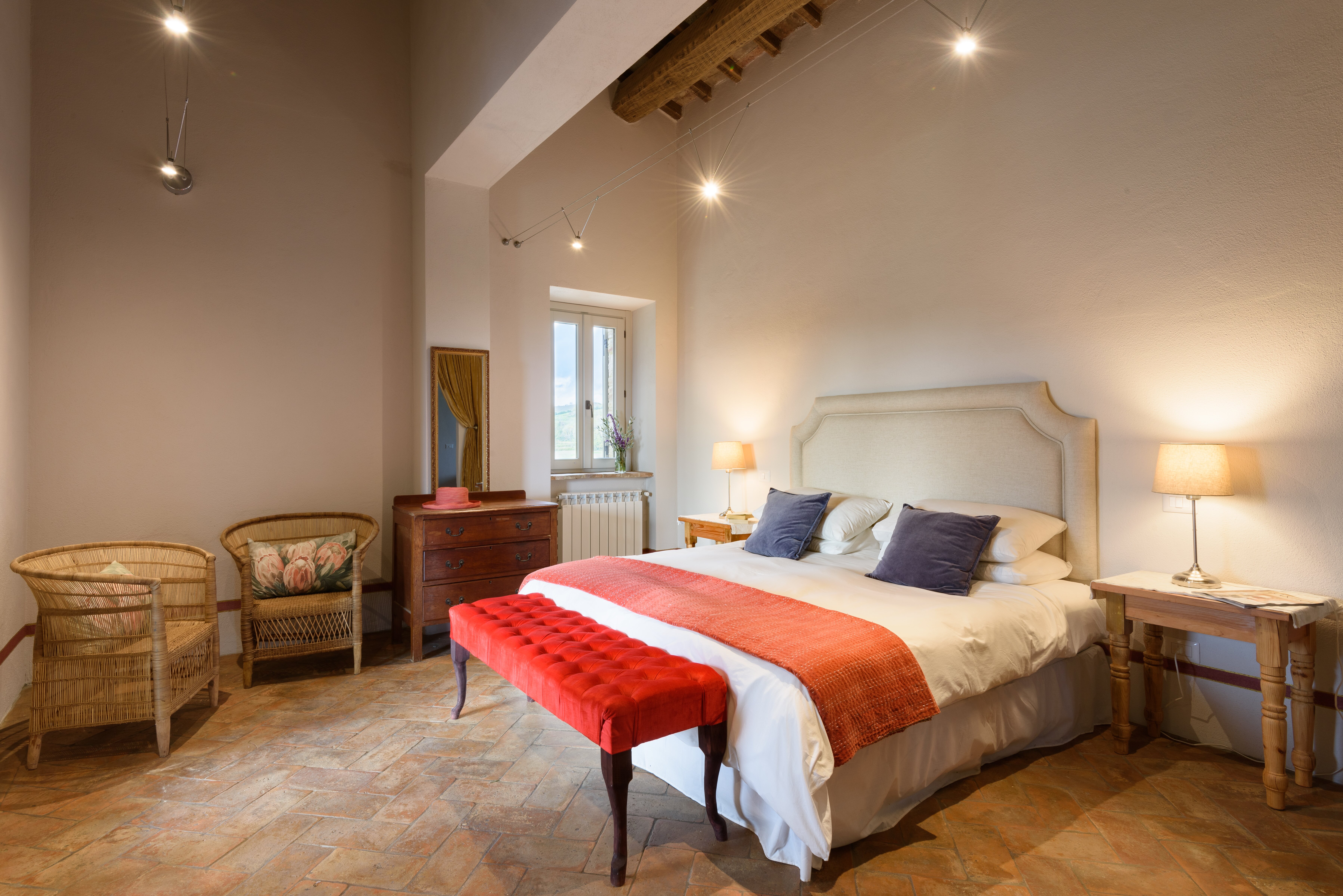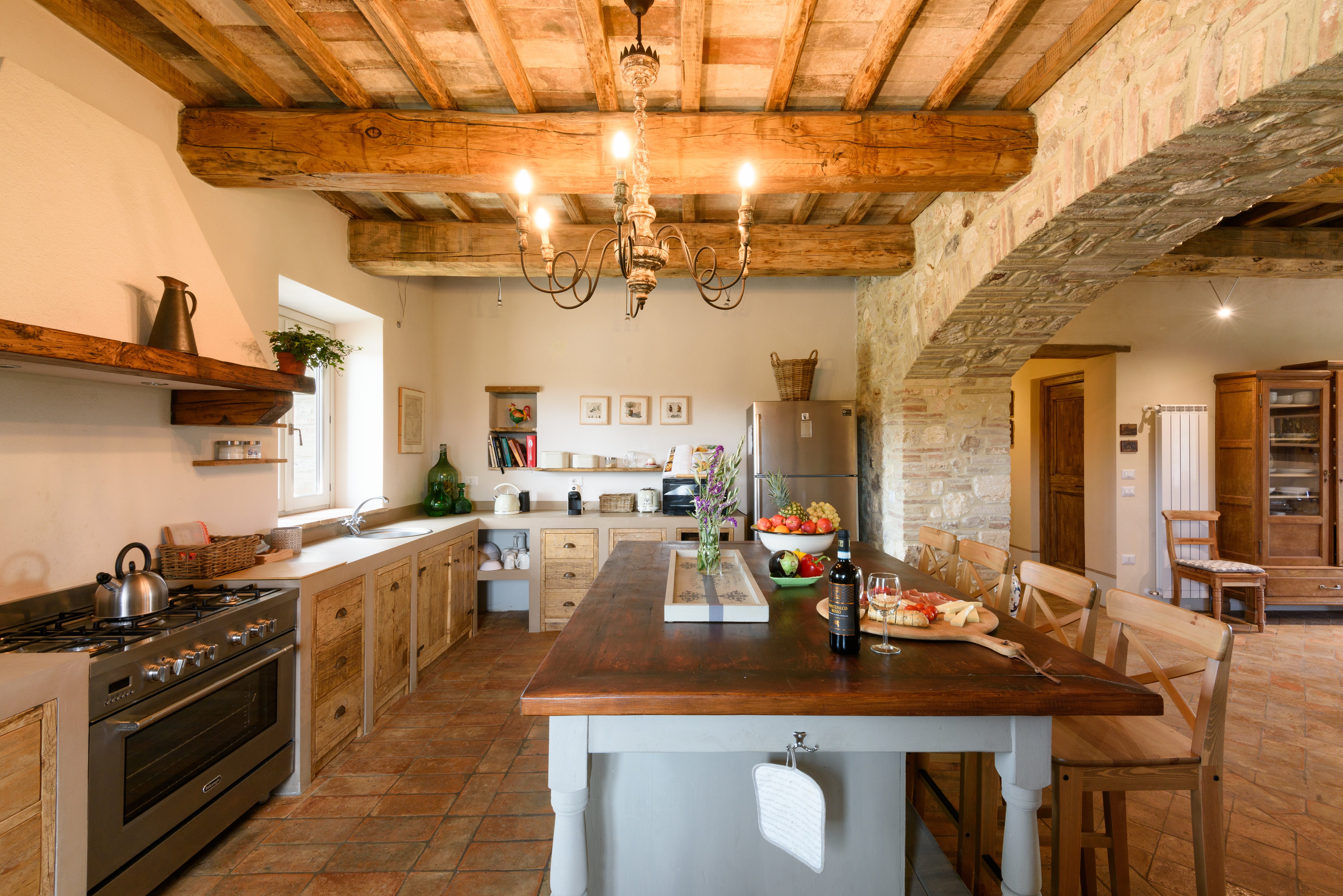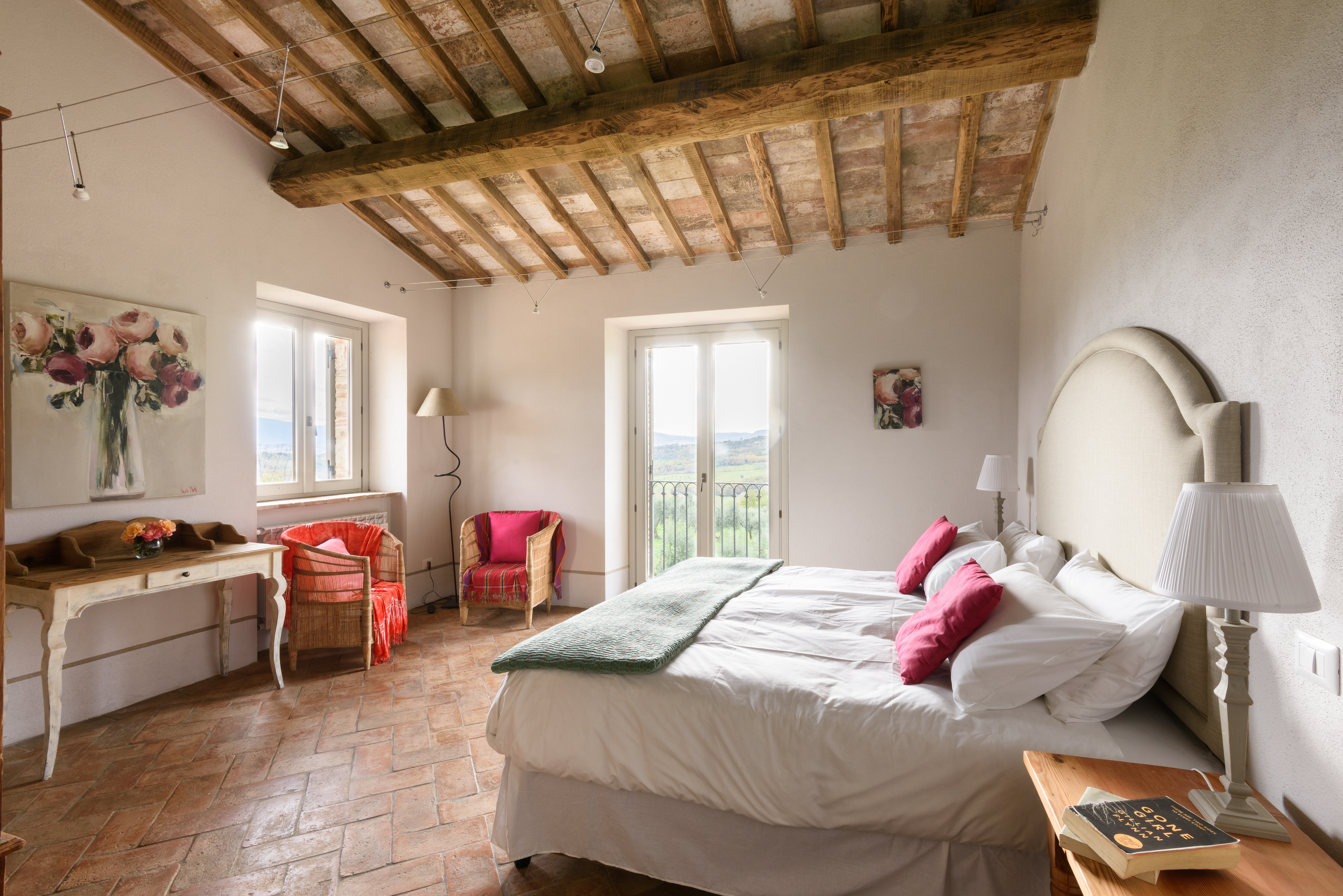 Casa Canaiolo is a retreat of rustic elegance – and is the perfect size for a group of friends or family. Rustic charms embrace the authentic Umbrian experience, but there’s also the perfect amount of contemporary style included for a luxury stay, too. There are four en suite bedrooms in the villa, each one indulgently placed with views across the valley. Three are on the first floor, and one on the ground, but all are super king in size, with the possibility to be made up as twins if required. On the first floor, two bedrooms include access to a traditional stone loggia (a covered open-sided gallery), a great spot to enjoy the views with comfortable seating. Downstairs is the open plan living, dining and gourmet kitchen area – superbly-equipped with all the top-of-the-range mod cons, and a large 10-seater dining table for delicious villa-cooked meals. A large teak table and traditional pizza oven can also be found on the adjacent outdoor loggia – looking over the uninterrupted country views, this setting is just perfect for al fresco summer dining.