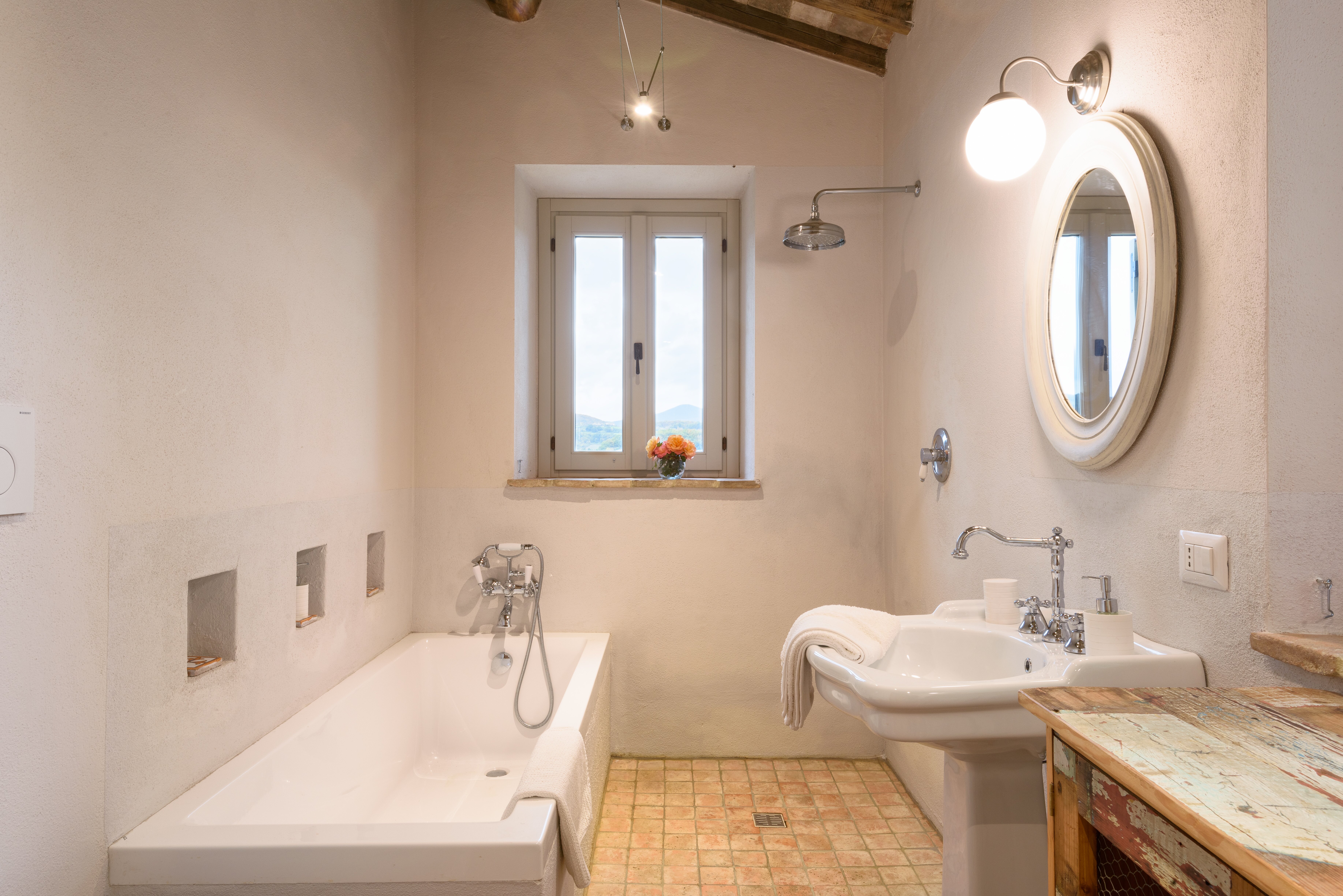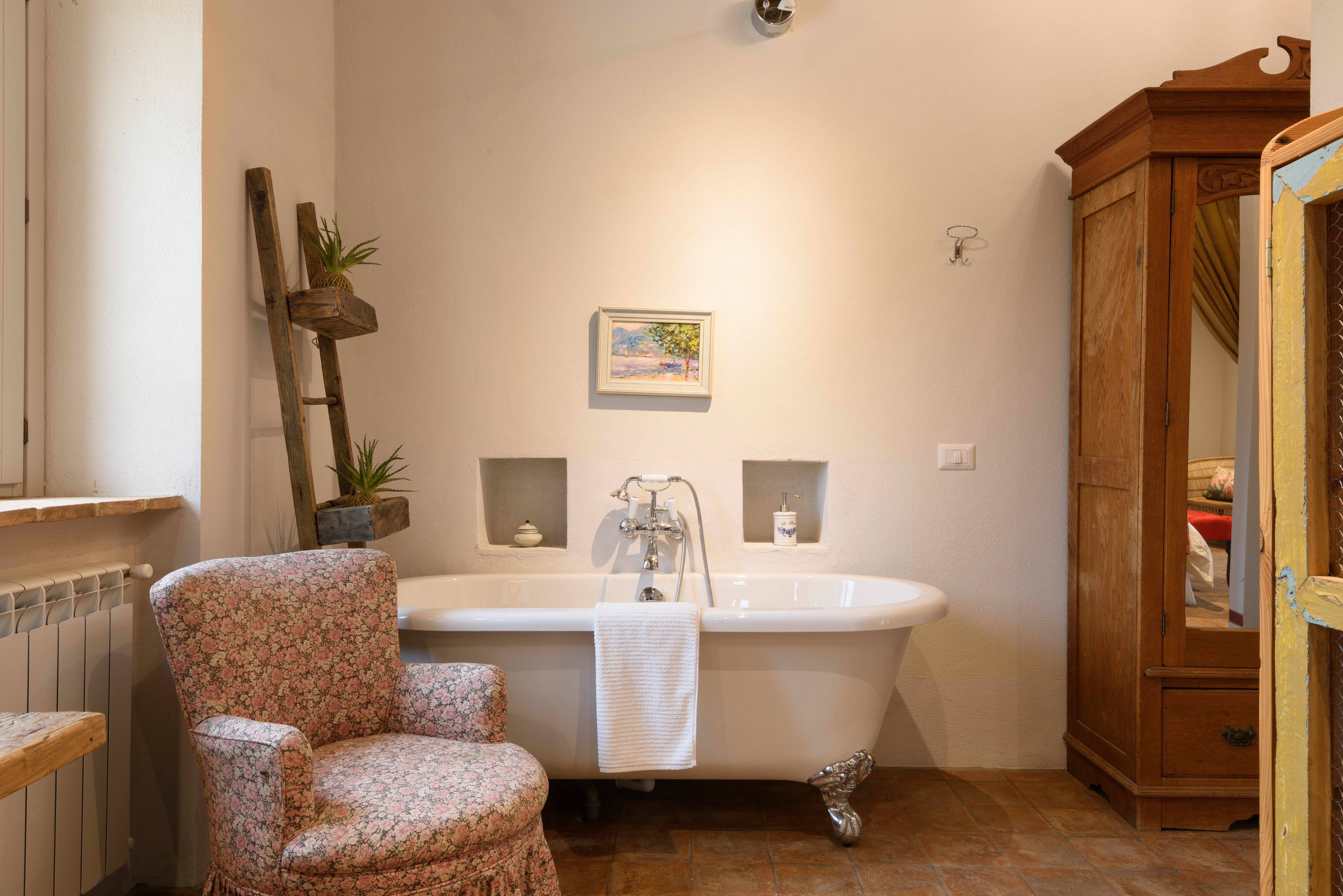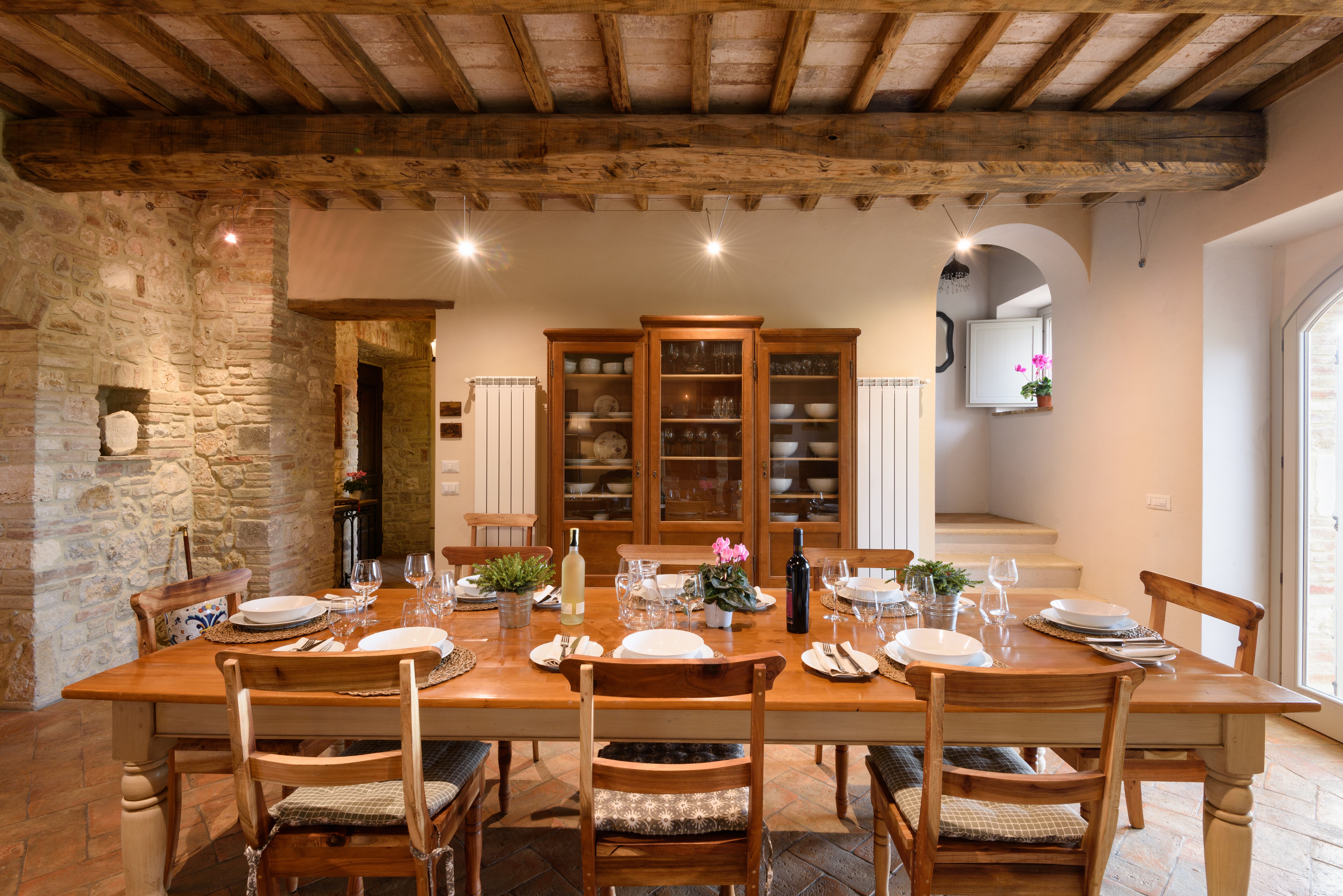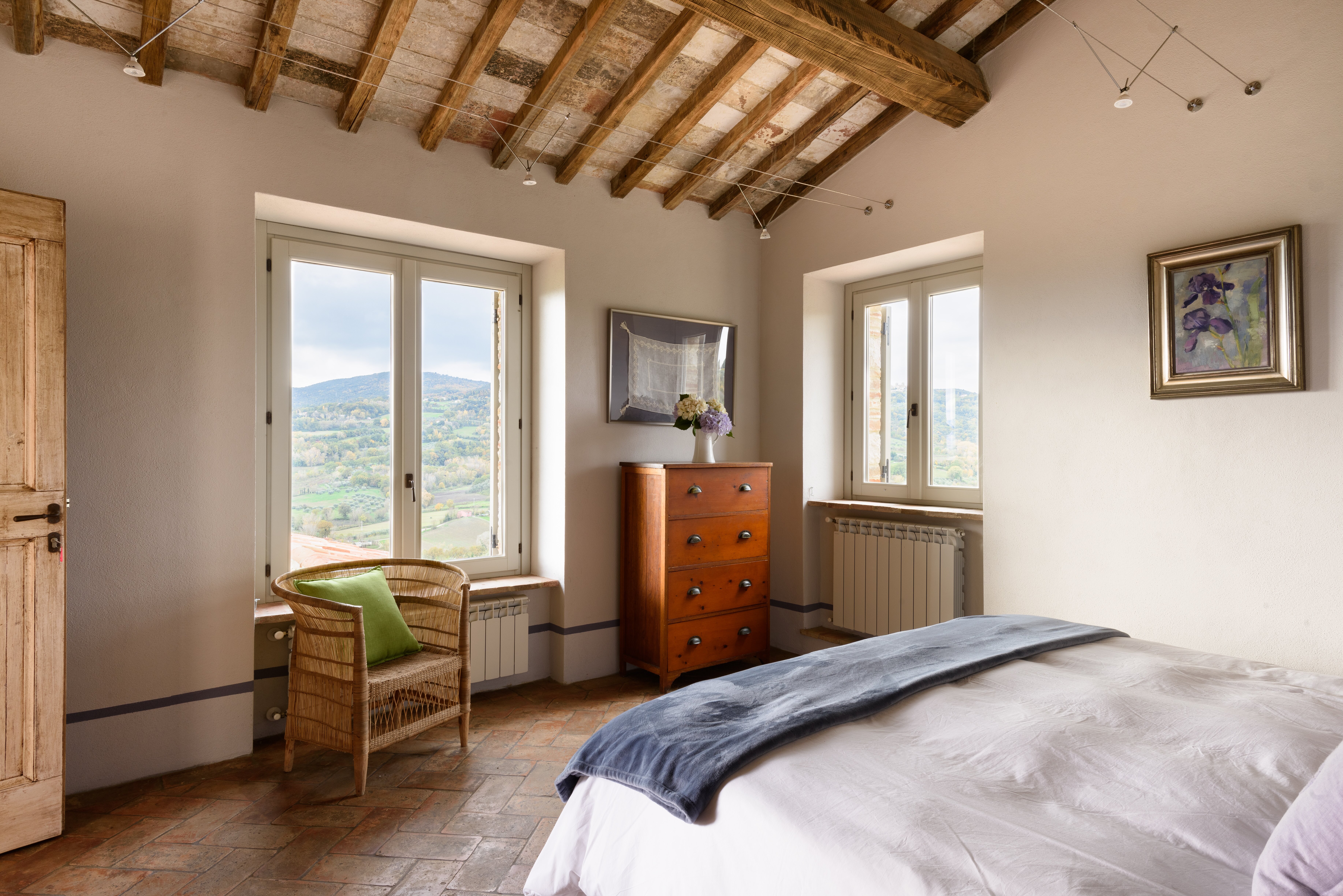 Casa Canaiolo is a retreat of rustic elegance – and is the perfect size for a group of friends or family. Rustic charms embrace the authentic Umbrian experience, but there’s also the perfect amount of contemporary style included for a luxury stay, too. There are four en suite bedrooms in the villa, each one indulgently placed with views across the valley. Three are on the first floor, and one on the ground, but all are super king in size, with the possibility to be made up as twins if required. On the first floor, two bedrooms include access to a traditional stone loggia (a covered open-sided gallery), a great spot to enjoy the views with comfortable seating. Downstairs is the open plan living, dining and gourmet kitchen area – superbly-equipped with all the top-of-the-range mod cons, and a large 10-seater dining table for delicious villa-cooked meals. A large teak table and traditional pizza oven can also be found on the adjacent outdoor loggia – looking over the uninterrupted country views, this setting is just perfect for al fresco summer dining.