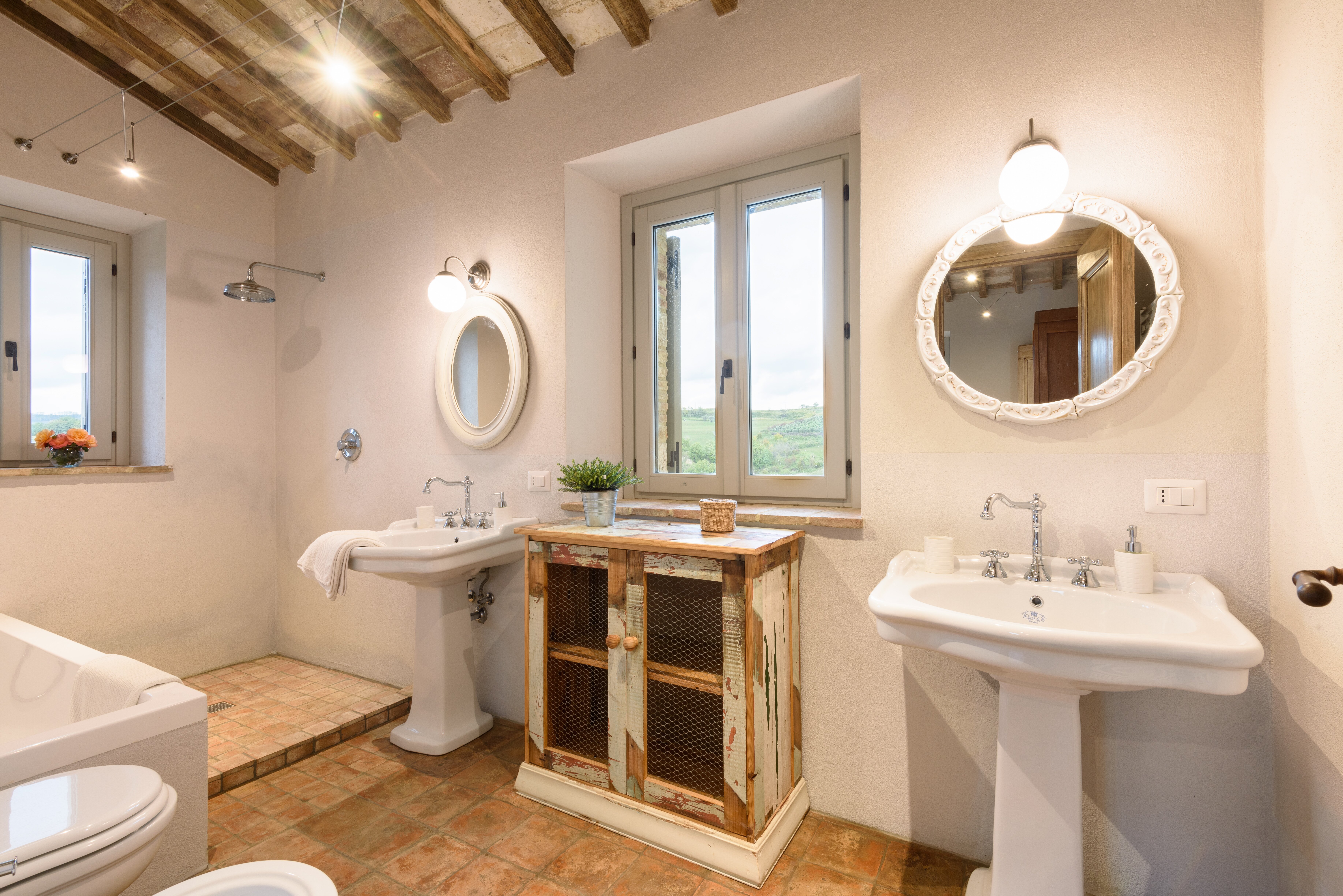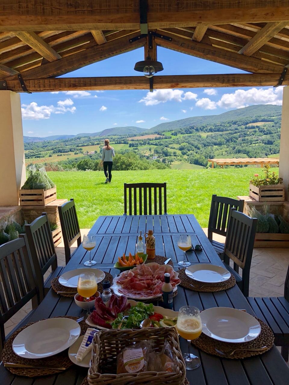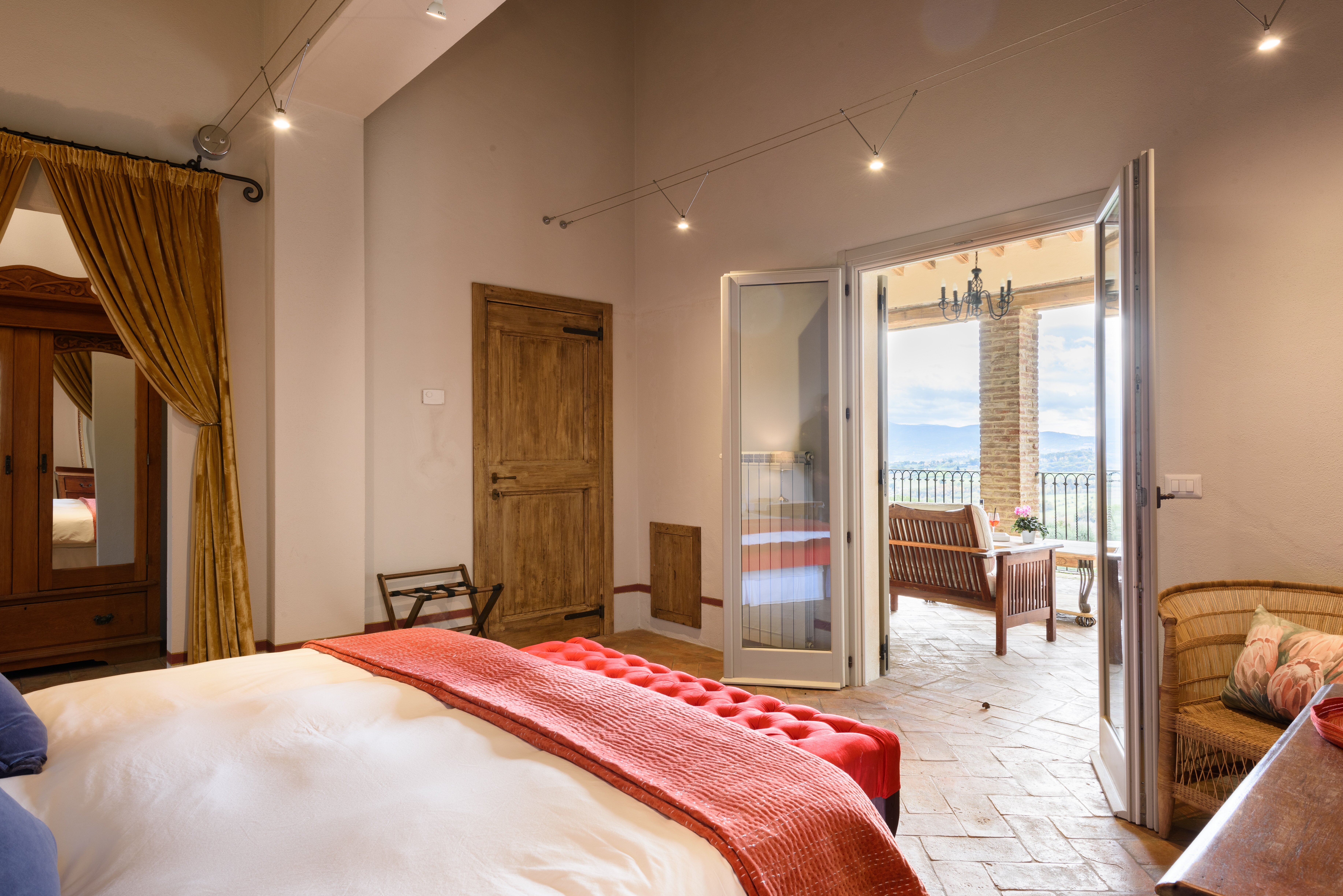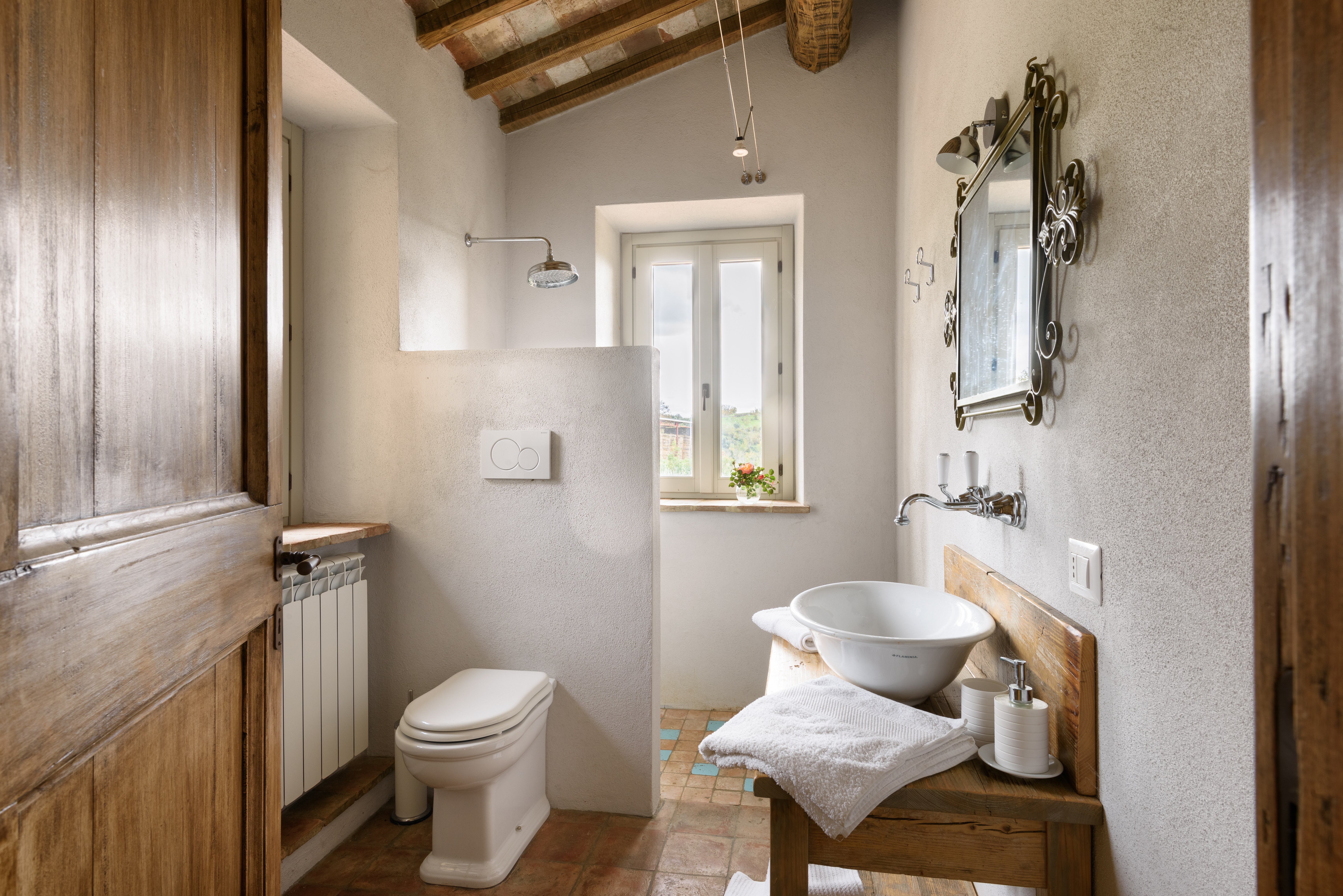 Casa Canaiolo is a retreat of rustic elegance – and is the perfect size for a group of friends or family. Rustic charms embrace the authentic Umbrian experience, but there’s also the perfect amount of contemporary style included for a luxury stay, too. There are four en suite bedrooms in the villa, each one indulgently placed with views across the valley. Three are on the first floor, and one on the ground, but all are super king in size, with the possibility to be made up as twins if required. On the first floor, two bedrooms include access to a traditional stone loggia (a covered open-sided gallery), a great spot to enjoy the views with comfortable seating. Downstairs is the open plan living, dining and gourmet kitchen area – superbly-equipped with all the top-of-the-range mod cons, and a large 10-seater dining table for delicious villa-cooked meals. A large teak table and traditional pizza oven can also be found on the adjacent outdoor loggia – looking over the uninterrupted country views, this setting is just perfect for al fresco summer dining.