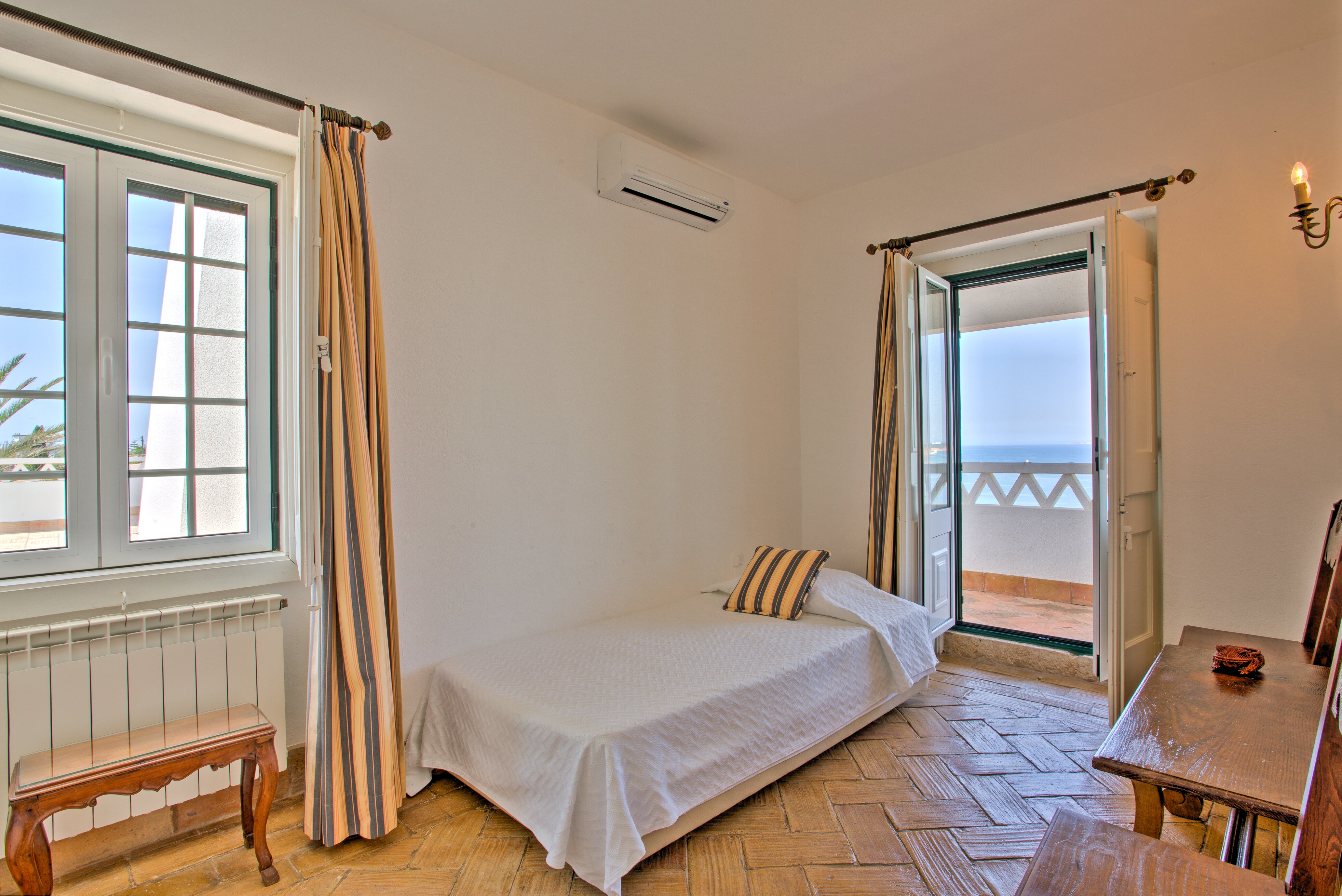 A royal property in a regal setting, this huge villa is perched in splendid seclusion in extensive grounds on a cliff-top overlooking the sea facing west towards Sagres and the setting sun with terraces at all levels for eating indoors or just chilling, enjoying the magnificent views and a swimming pool overlooking the sea. Immaculately kept, it retains its informal atmosphere and personal touches. Facilities include table tennis in the games room, a grand piano in a sitting room, a bar at pool terrace level, a large TV room and a private chapel. The style of this unique house is one of past grandeur, beamed ceilings, antique tiles and traditional furnishings adding character to comfort.