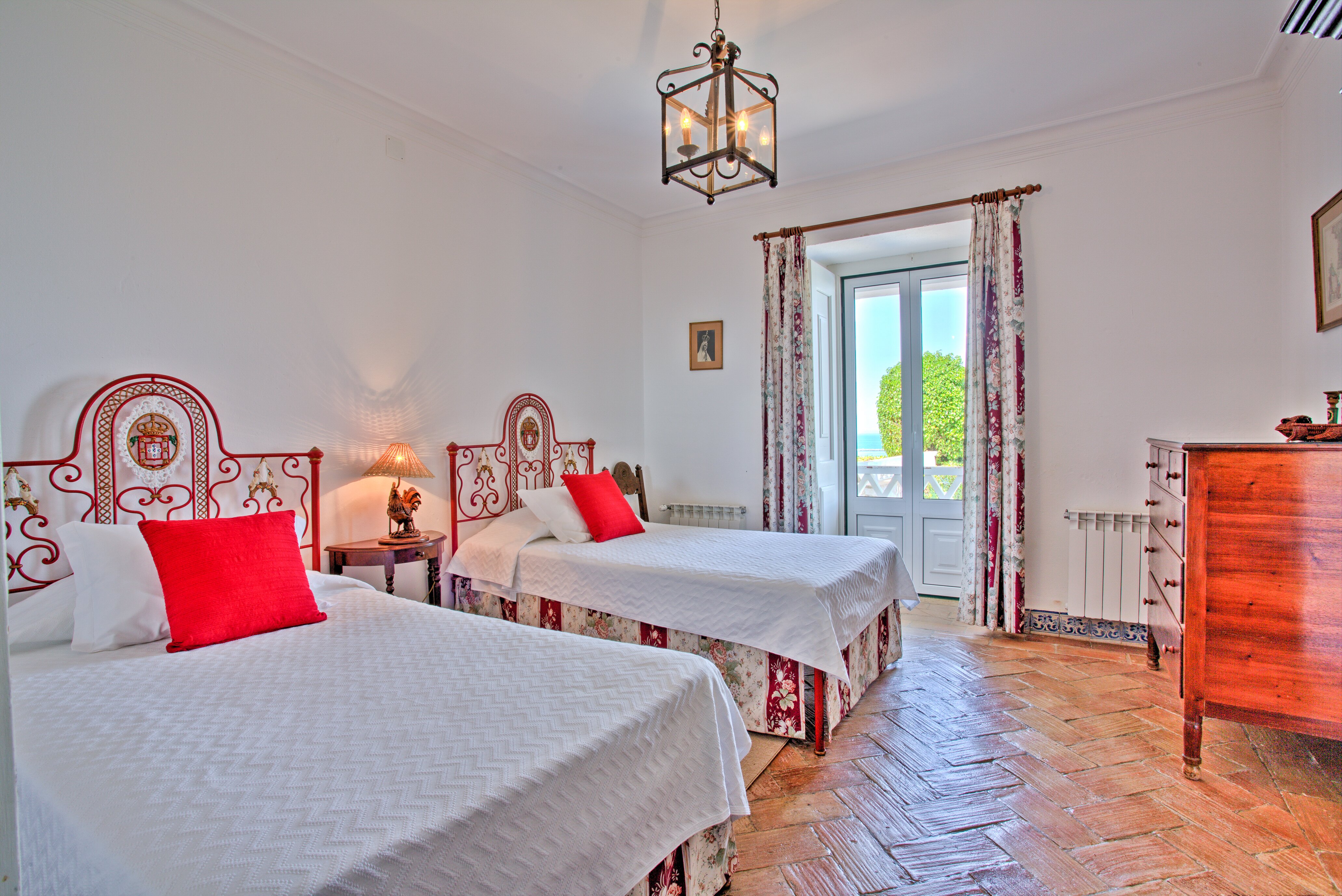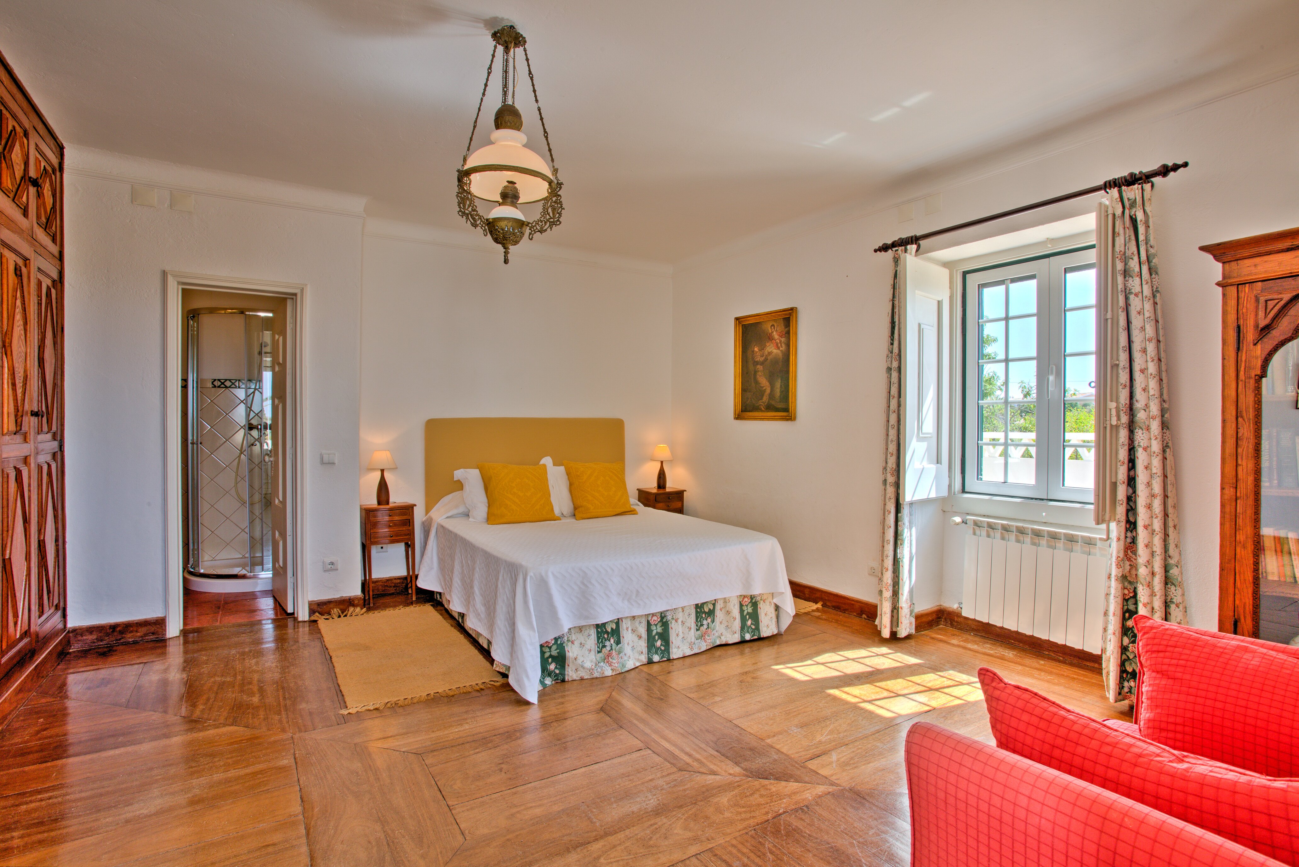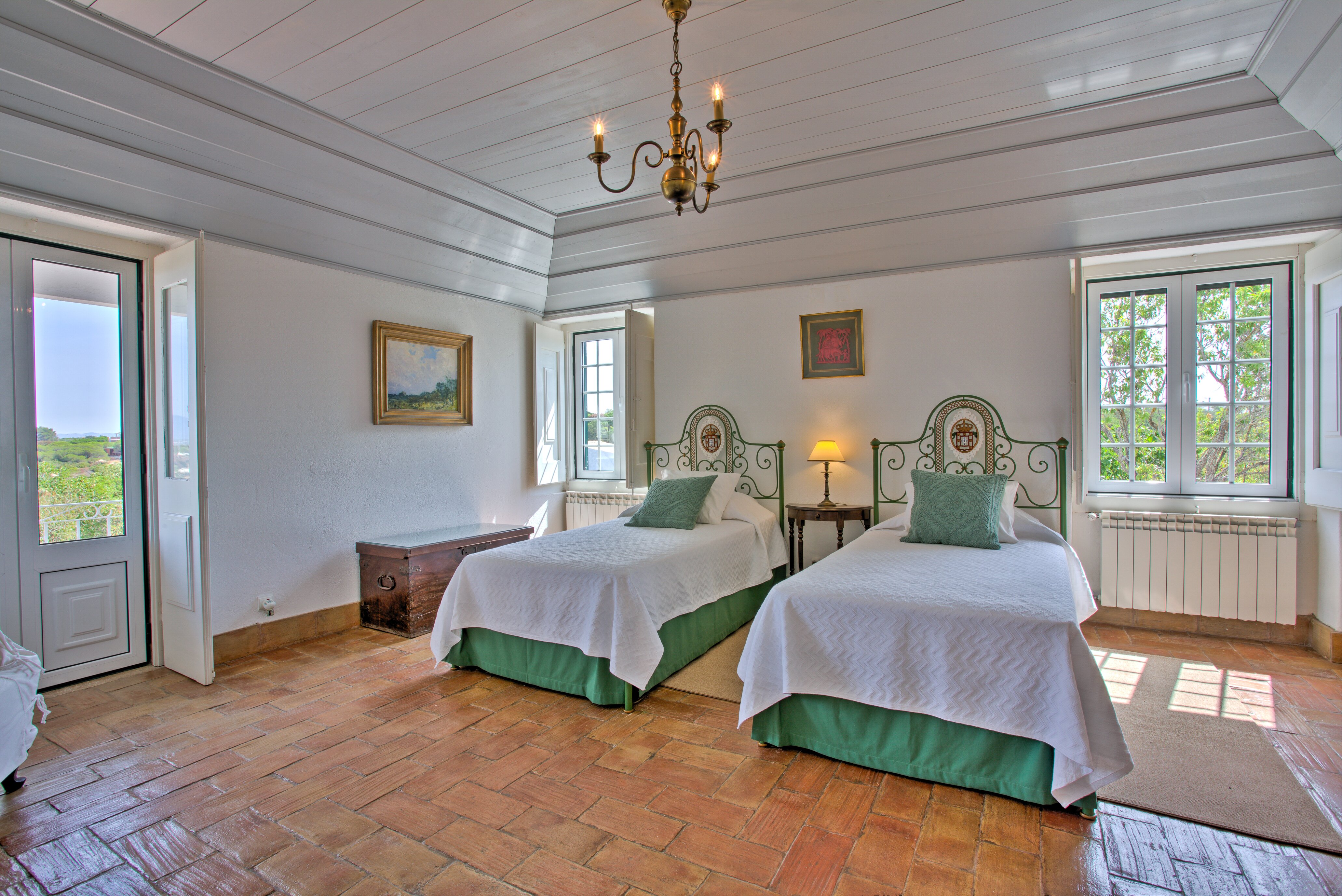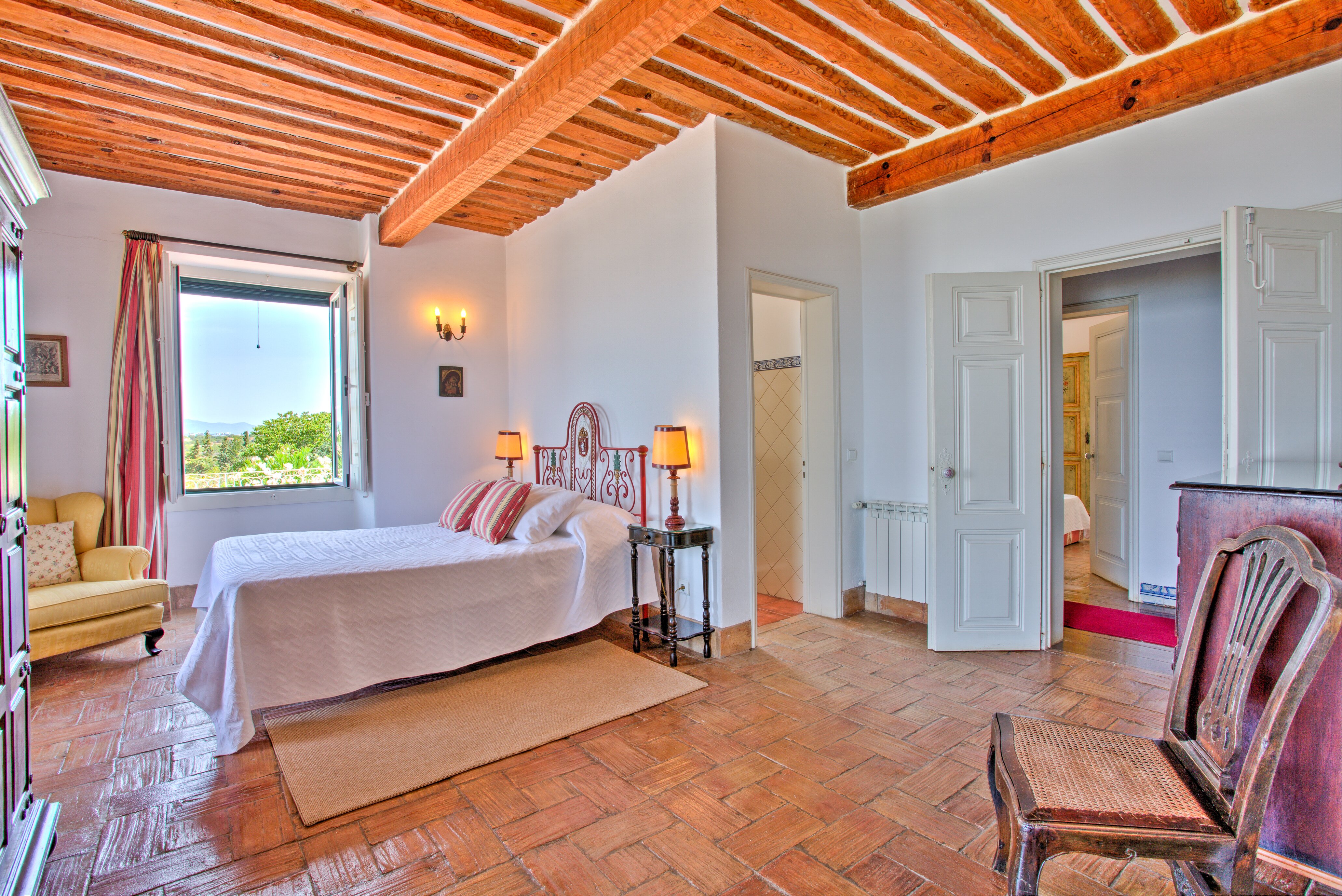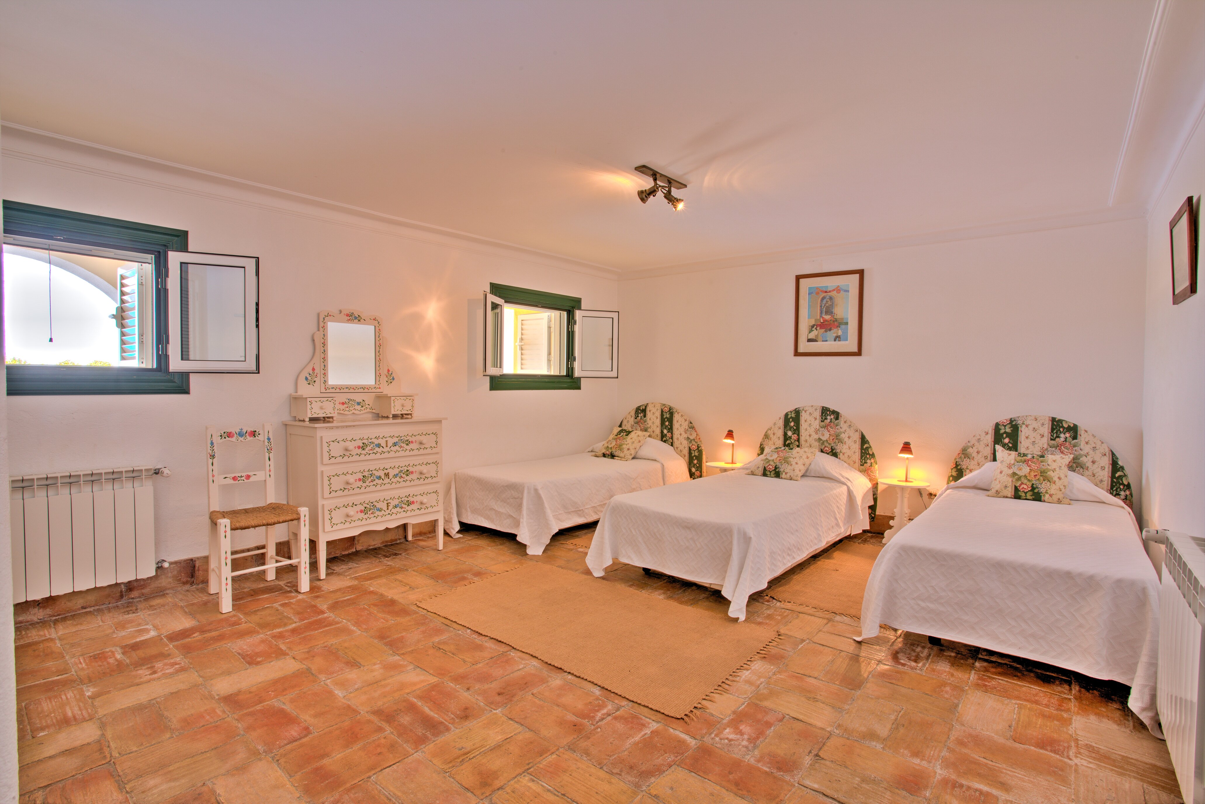 Large twin bedroom with bathroom en suite and garden viewsVery large double bedroom with shower room en suite and doors to upper terraceHall / ante-room with 2 twin bedrooms (one room with beds in an L shape) leading off it and sharing a bathroom. There is access to shared terrace from these rooms. These bedrooms are more suitable for childrenFacilities