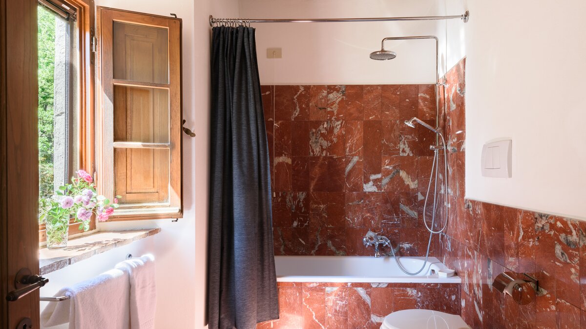 Tucked privately away in the folds of forested hills, this old stone house is perfectly at home with its timeless landscape. Imposing from the outside, it is delightfully welcoming in its big, airy rooms, where mellowed timber beams and terracotta floor tiles create a period frame for 21st century comfort. Rustic chic blends imperceptibly with understated elegance, in the charming breakfast kitchen, well equipped with modern appliances; the cool-toned country style dining room; and the adjacent spacious yet cosy sitting room.A separate library area and TV room add informal social space, beautiful bedrooms feature four-poster beds, bathrooms are replete with polished marble, and a games room, with table tennis, opens out to the garden. Here there are shaded terraces for dining or simply relaxing and long lawns edged with lavender banks and sprinkled with trees. The beautiful swimming pool is situated in an elevated and sheltered, sunny spot approximately 50m from the villa. Sharing the same private estate as its popular sister-villa Vercenni, the house offers cook service for an extra leisurely touch, and is 3km from little shops and restaurants in Radda.