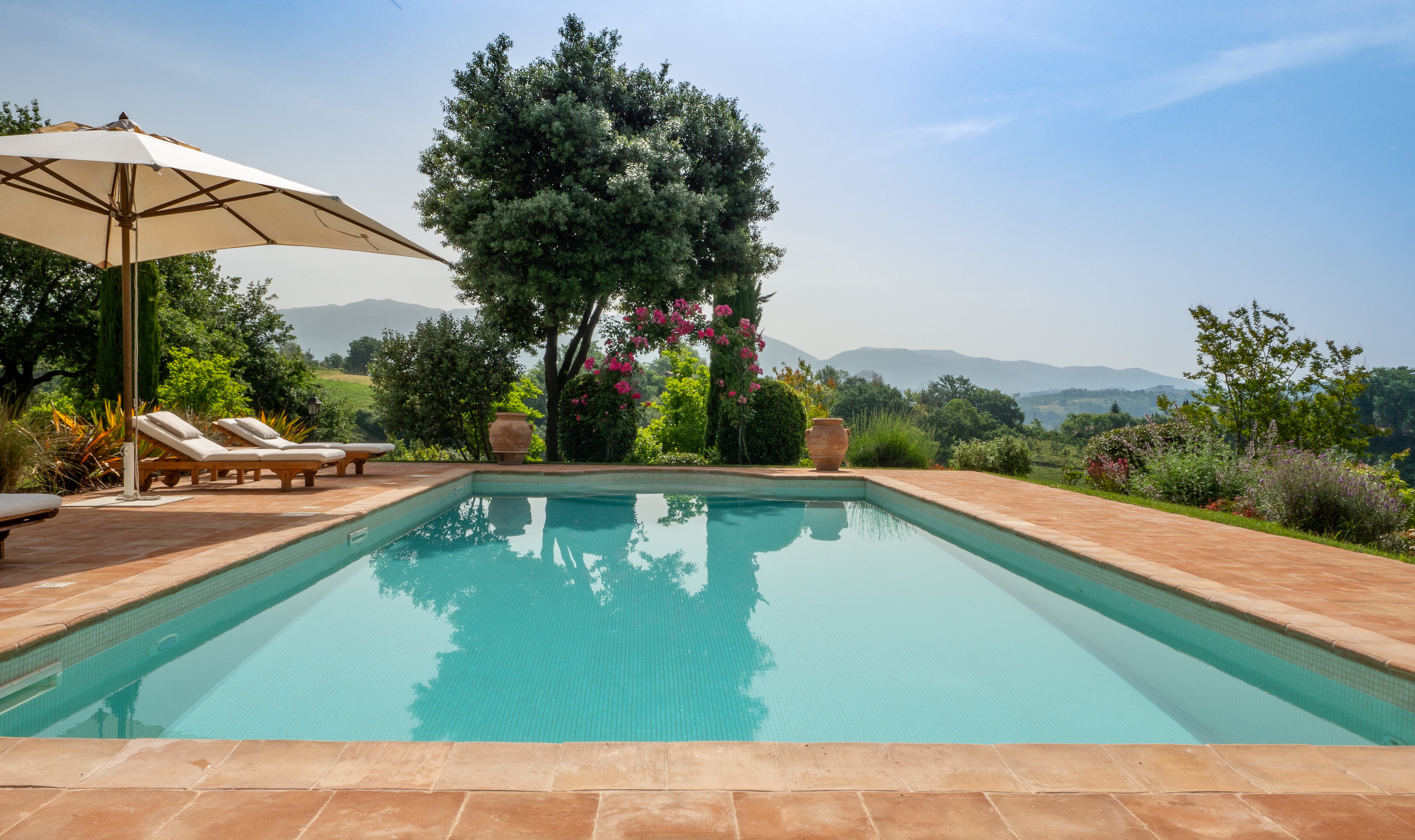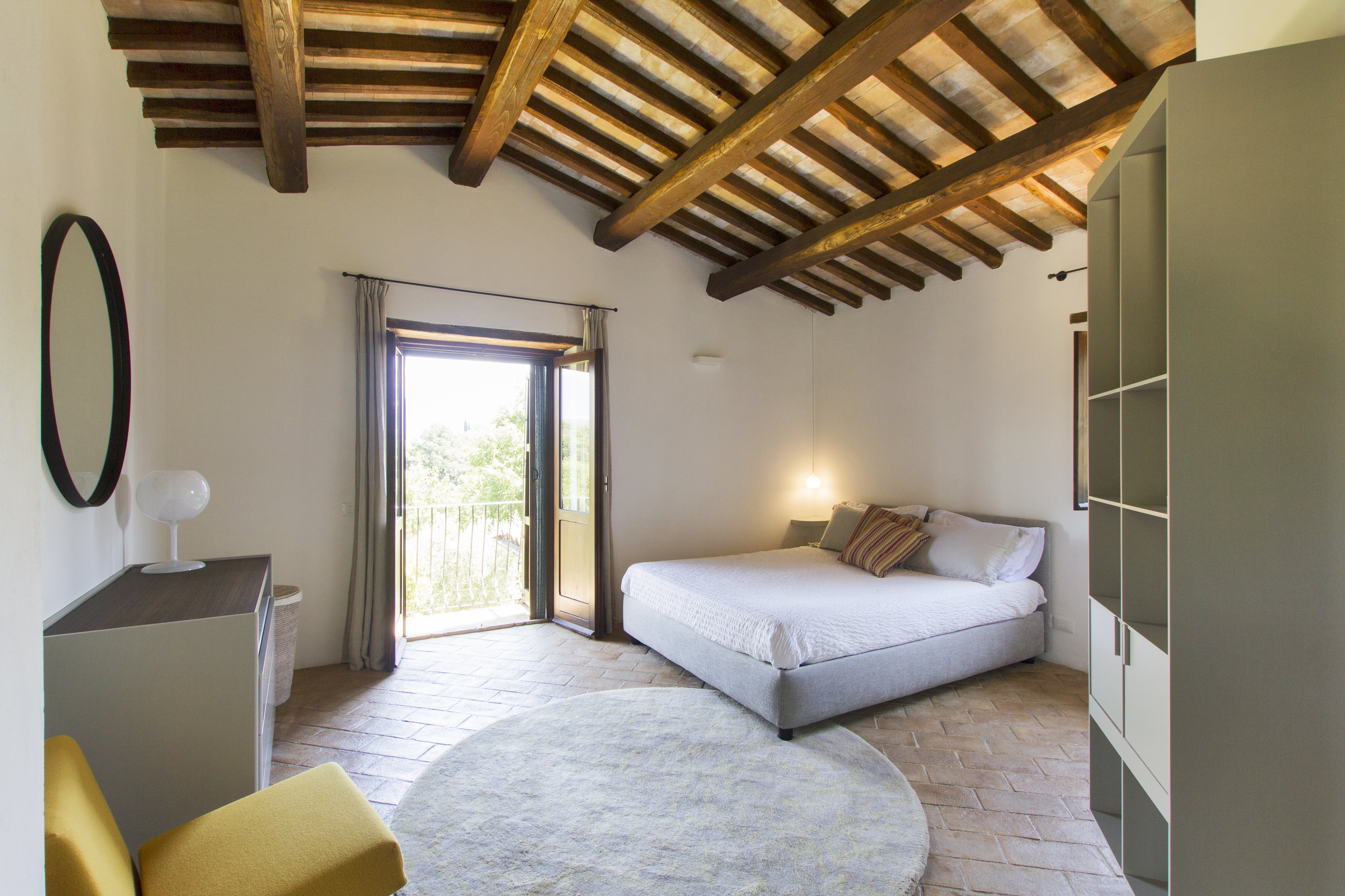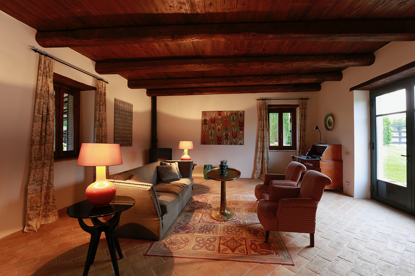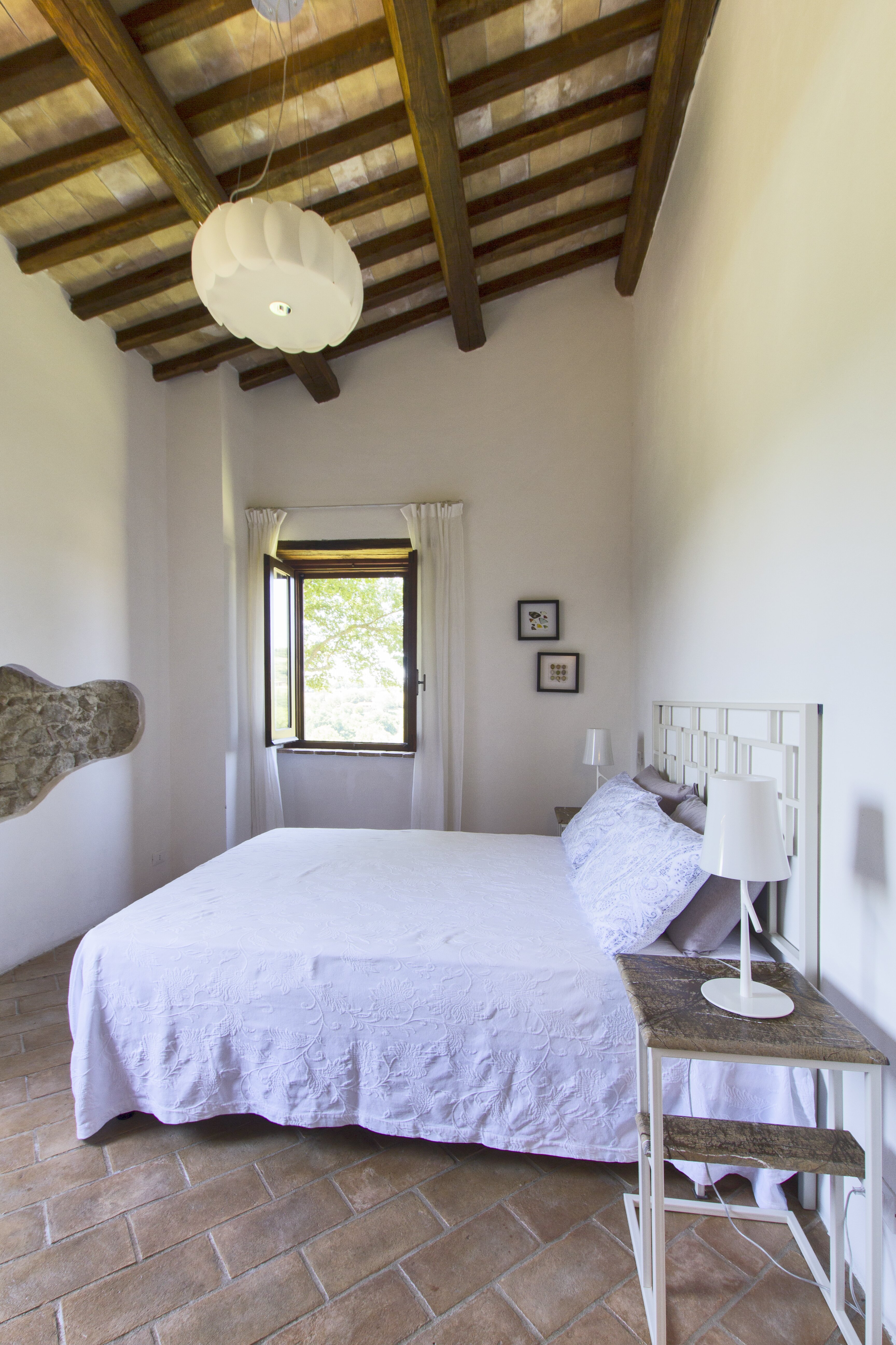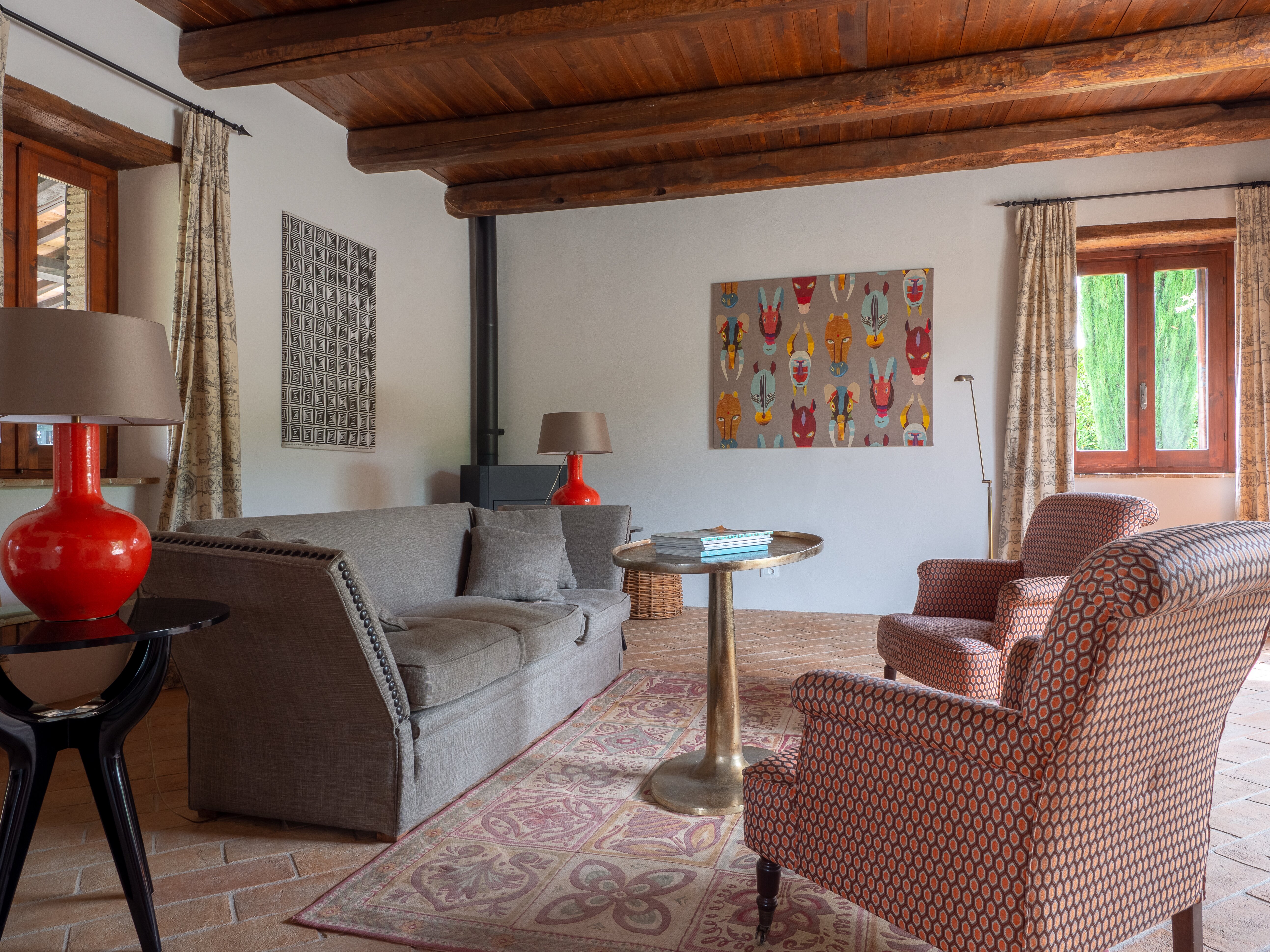 Casale La Sabina has been tastefully decorated, and a great deal of attention has been devoted to ensuring the finishings and furnishings are in keeping with the style of the building. The property features stunning wooden beams and shutters, as well as a stufa economica, a classic wood fire stove which can be used for cooking. The kitchen is well equipped and also has a hob and oven. Outside there is a Kamado barbecue and guests are welcome to use the Italian kitchen garden. The kitchen has a large wooden table, perfect for family dinners, and the cosy living room has a wood burning stove. There’s a small library as well as a shaded terrace, both the perfect respite from the Italian sun, or you can enjoy exploring the orchard and gardens, or take a dip in the private pool. On the first floor there is an en suite master bedroom with extensive views from the balcony, as well as two further bedrooms and a bathroom. The enchanting portico has magnificent views of the rolling countryside surrounding the property and will provide the perfect setting for al fresco meals.