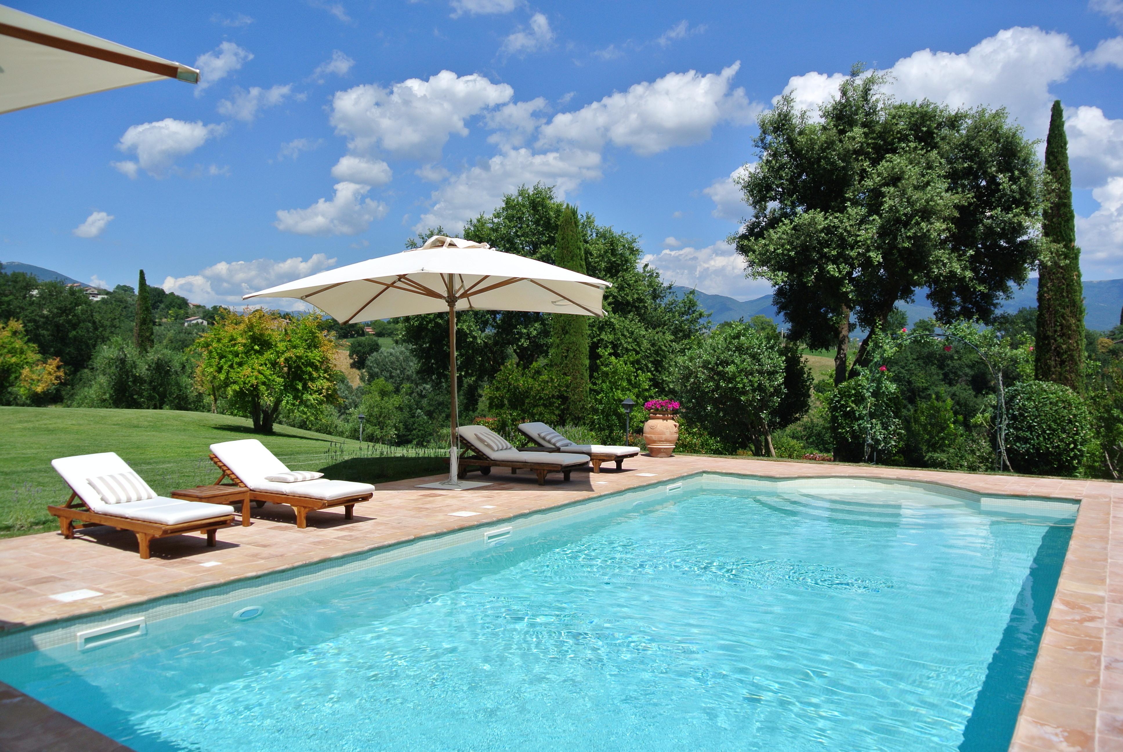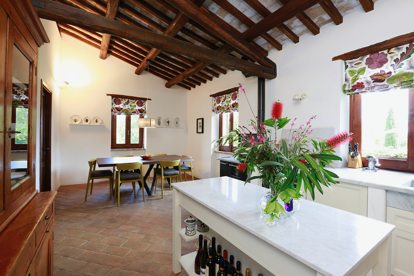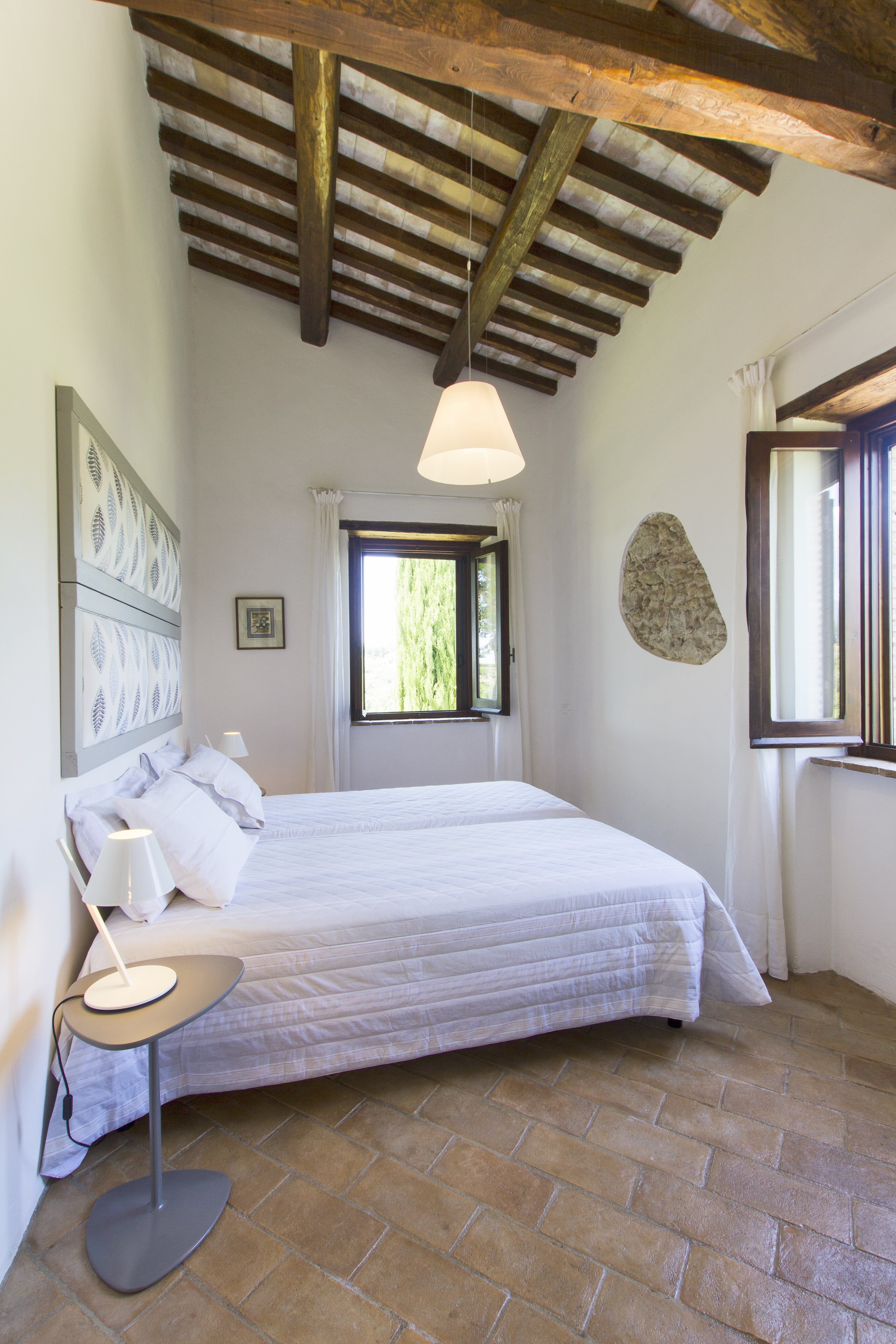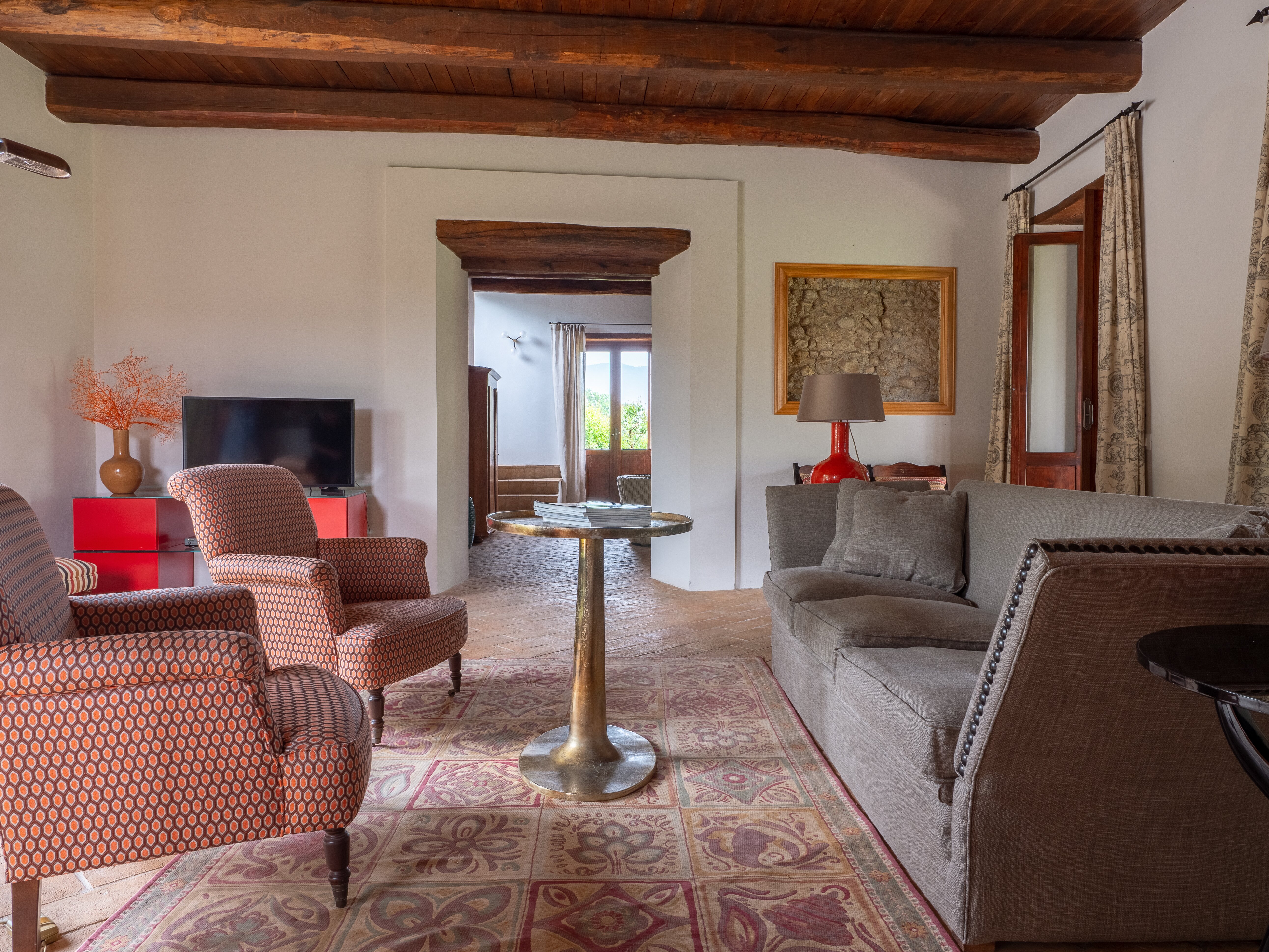 Casale La Sabina has been tastefully decorated, and a great deal of attention has been devoted to ensuring the finishings and furnishings are in keeping with the style of the building. The property features stunning wooden beams and shutters, as well as a stufa economica, a classic wood fire stove which can be used for cooking. The kitchen is well equipped and also has a hob and oven. Outside there is a Kamado barbecue and guests are welcome to use the Italian kitchen garden. The kitchen has a large wooden table, perfect for family dinners, and the cosy living room has a wood burning stove. There’s a small library as well as a shaded terrace, both the perfect respite from the Italian sun, or you can enjoy exploring the orchard and gardens, or take a dip in the private pool. On the first floor there is an en suite master bedroom with extensive views from the balcony, as well as two further bedrooms and a bathroom. The enchanting portico has magnificent views of the rolling countryside surrounding the property and will provide the perfect setting for al fresco meals.