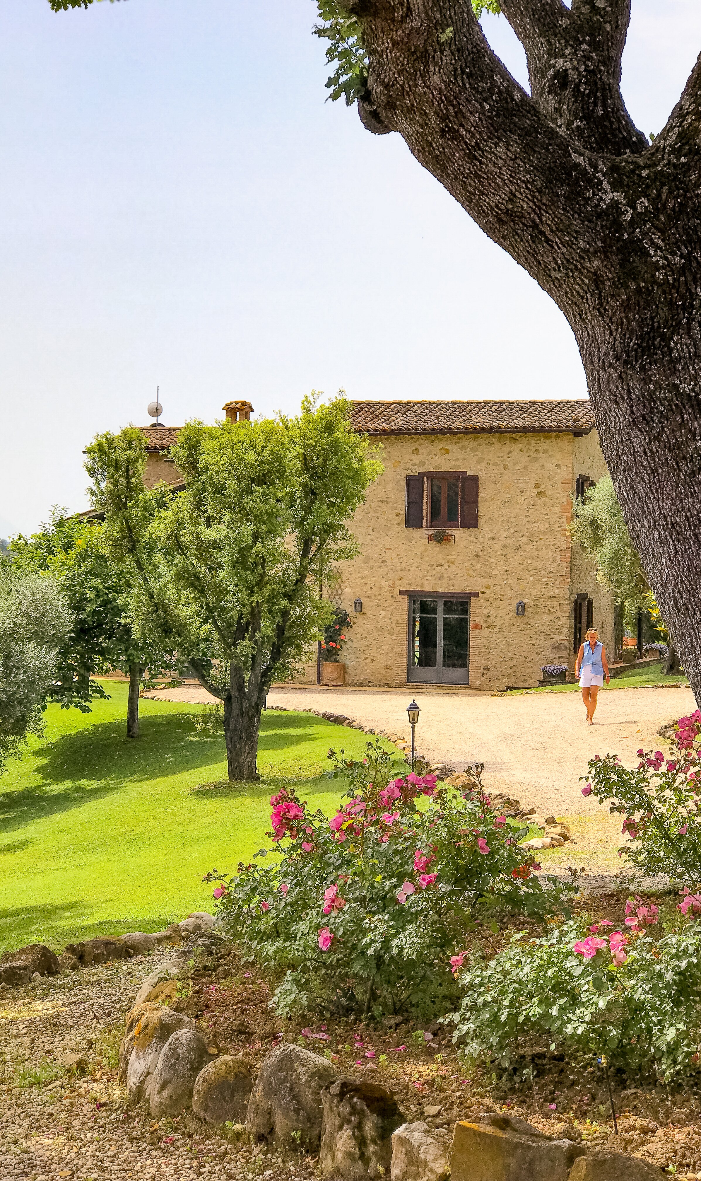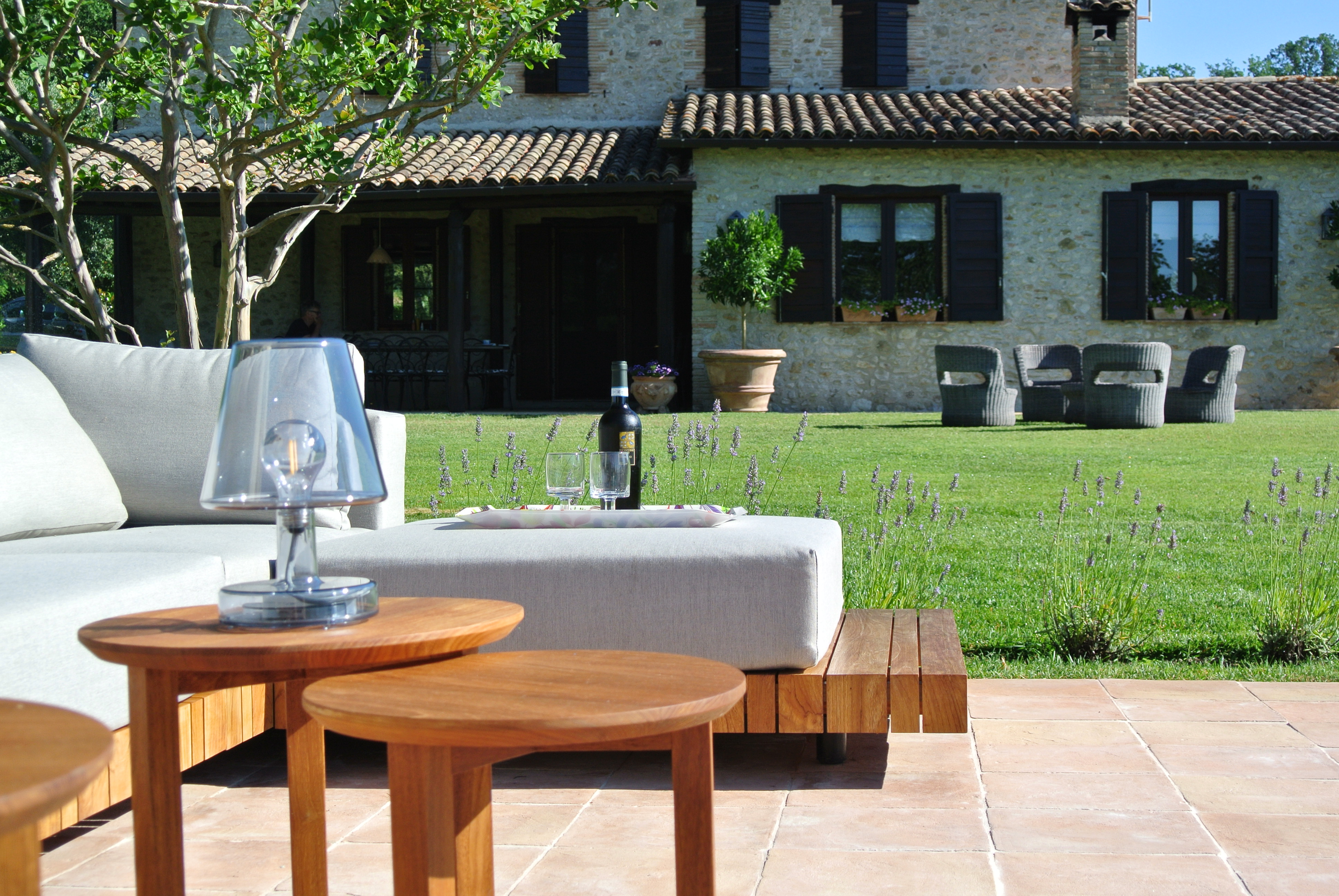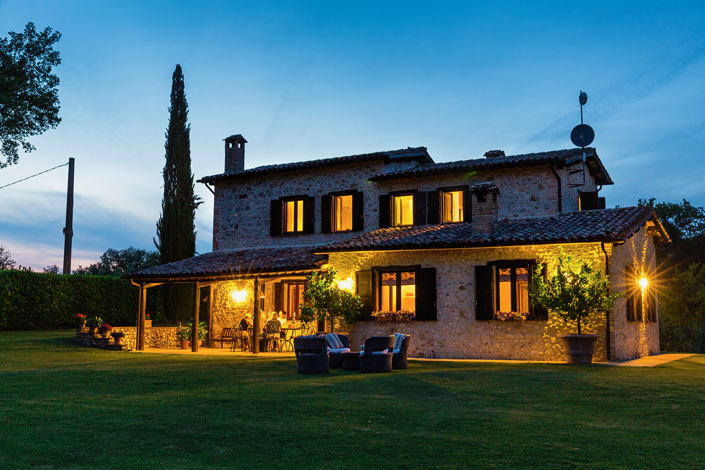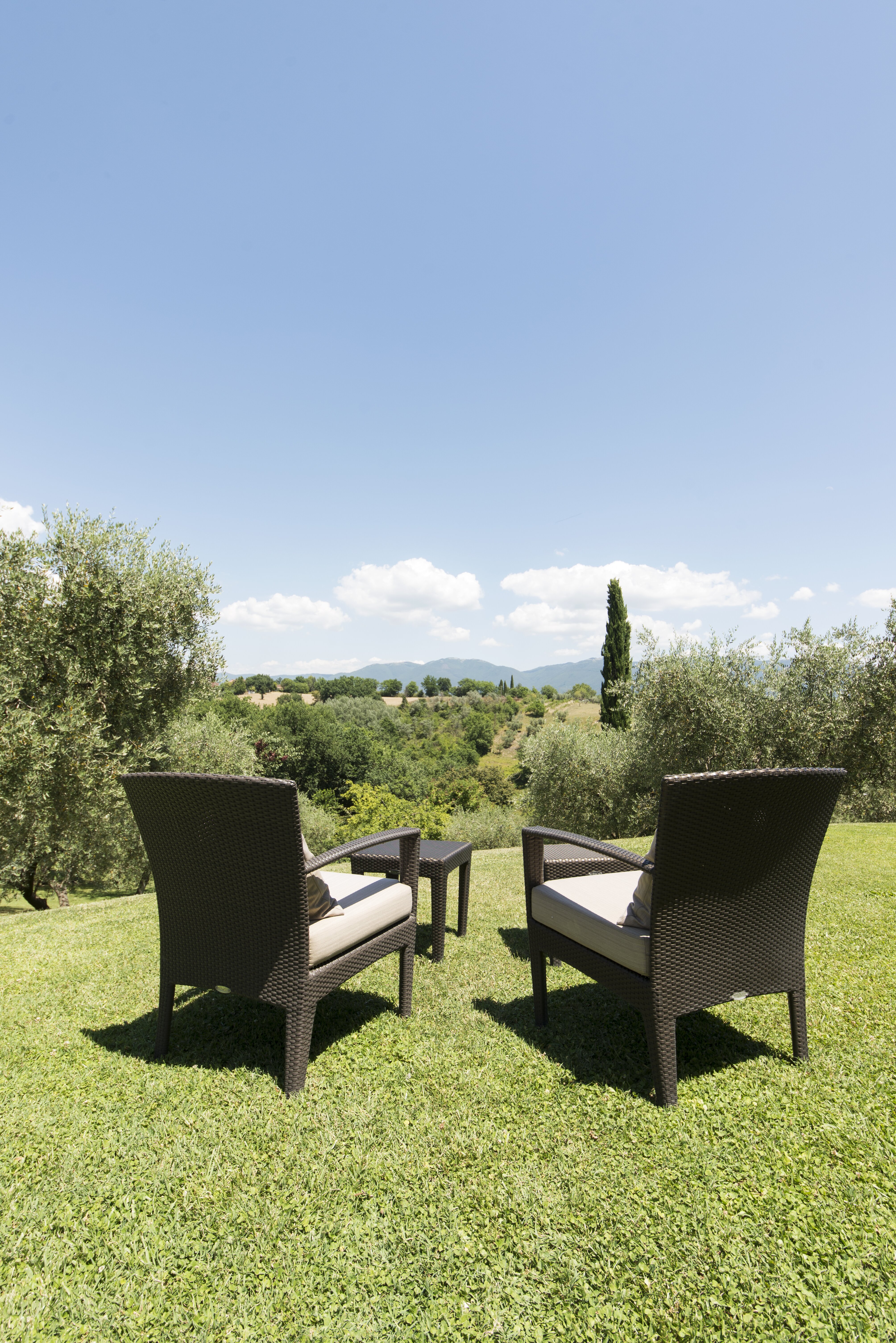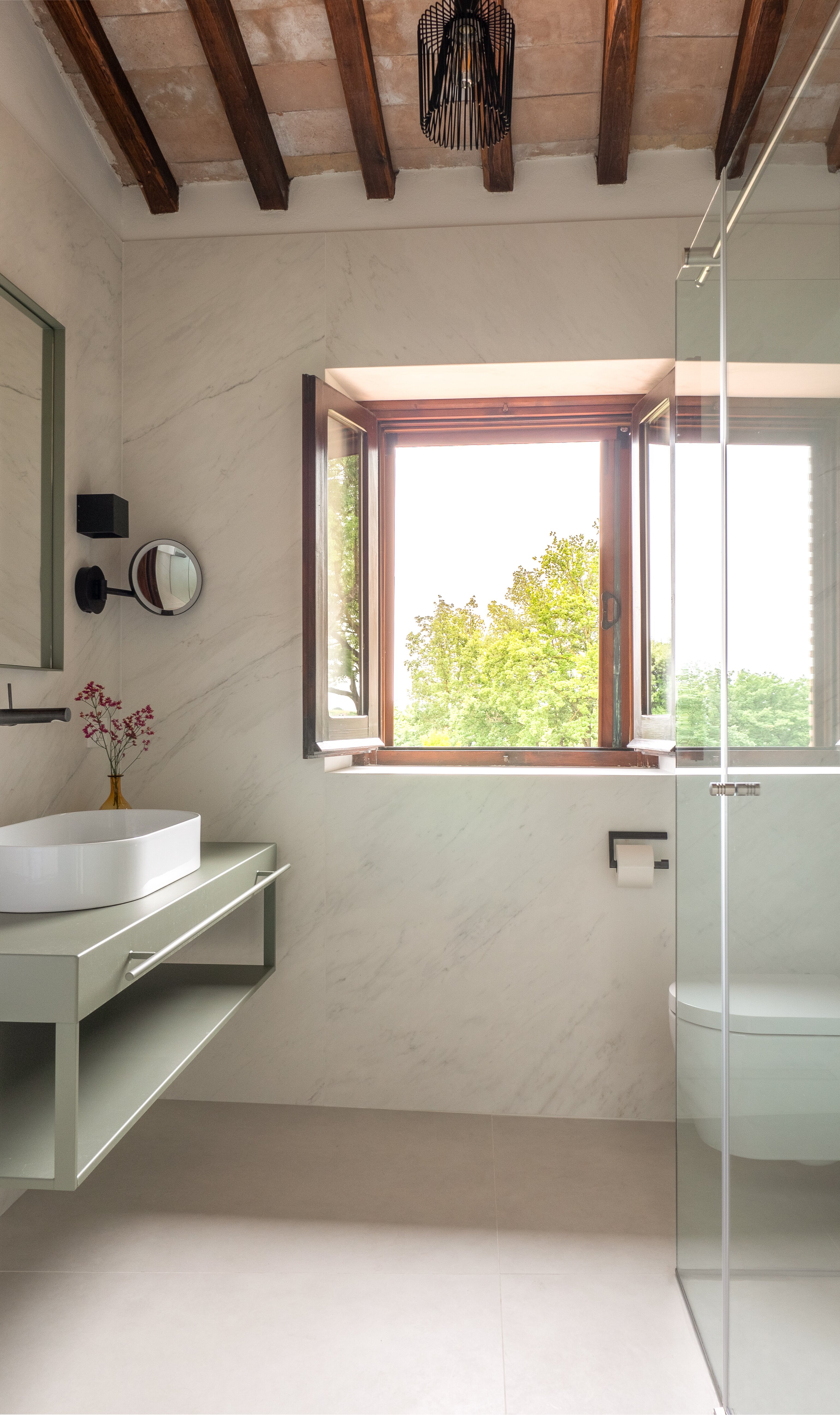Casale La Sabina has been tastefully decorated, and a great deal of attention has been devoted to ensuring the finishings and furnishings are in keeping with the style of the building. The property features stunning wooden beams and shutters, as well as a stufa economica, a classic wood fire stove which can be used for cooking. The kitchen is well equipped and also has a hob and oven. Outside there is a Kamado barbecue and guests are welcome to use the Italian kitchen garden. The kitchen has a large wooden table, perfect for family dinners, and the cosy living room has a wood burning stove. There’s a small library as well as a shaded terrace, both the perfect respite from the Italian sun, or you can enjoy exploring the orchard and gardens, or take a dip in the private pool. On the first floor there is an en suite master bedroom with extensive views from the balcony, as well as two further bedrooms and a bathroom. The enchanting portico has magnificent views of the rolling countryside surrounding the property and will provide the perfect setting for al fresco meals.