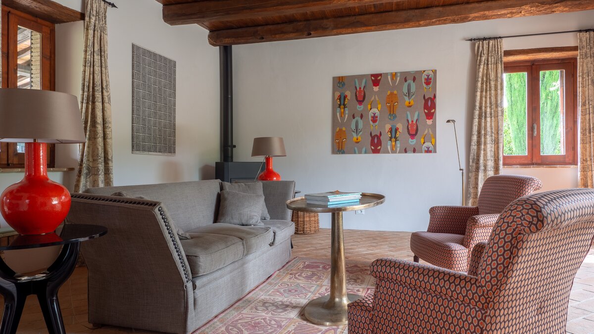 Casale La Sabina has been tastefully decorated, and a great deal of attention has been devoted to ensuring the finishings and furnishings are in keeping with the style of the building. The property features stunning wooden beams and shutters, as well as a stufa economica, a classic wood fire stove which can be used for cooking. The kitchen is well equipped and also has a hob and oven. Outside there is a Kamado barbecue and guests are welcome to use the Italian kitchen garden. The kitchen has a large wooden table, perfect for family dinners, and the cosy living room has a wood burning stove. There’s a small library as well as a shaded terrace, both the perfect respite from the Italian sun, or you can enjoy exploring the orchard and gardens, or take a dip in the private pool. On the first floor there is an en suite master bedroom with extensive views from the balcony, as well as two further bedrooms and a bathroom. The enchanting portico has magnificent views of the rolling countryside surrounding the property and will provide the perfect setting for al fresco meals.