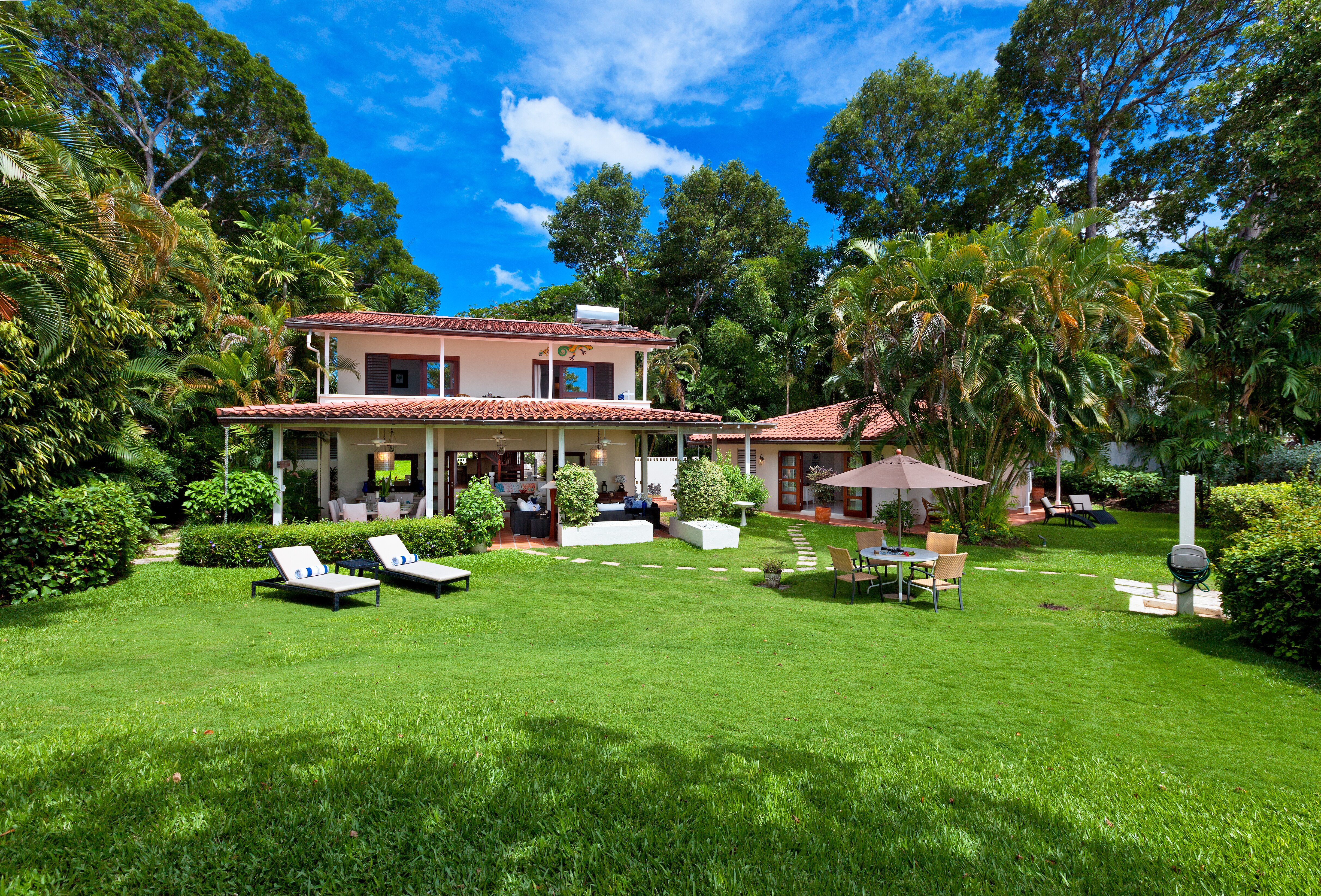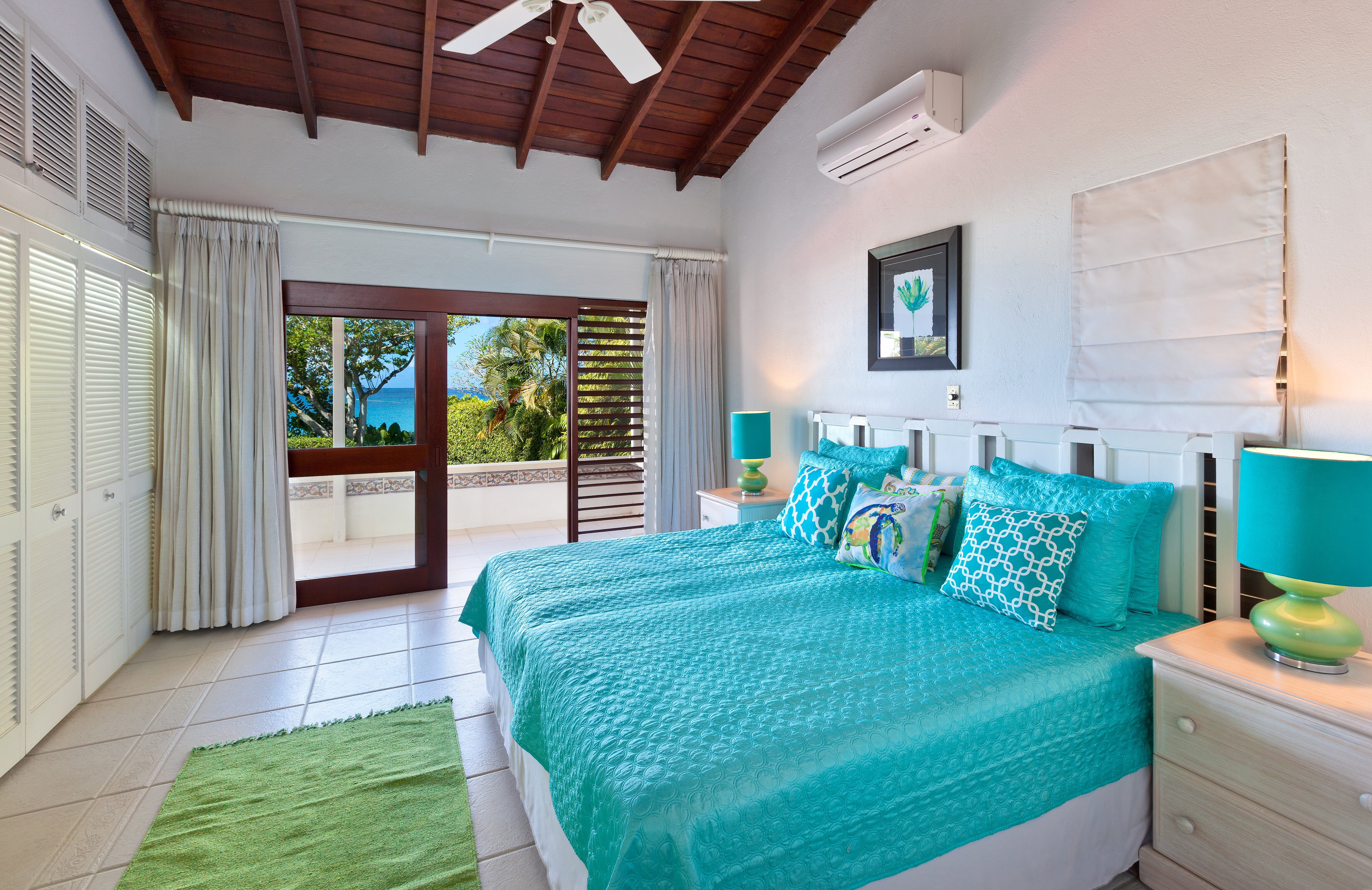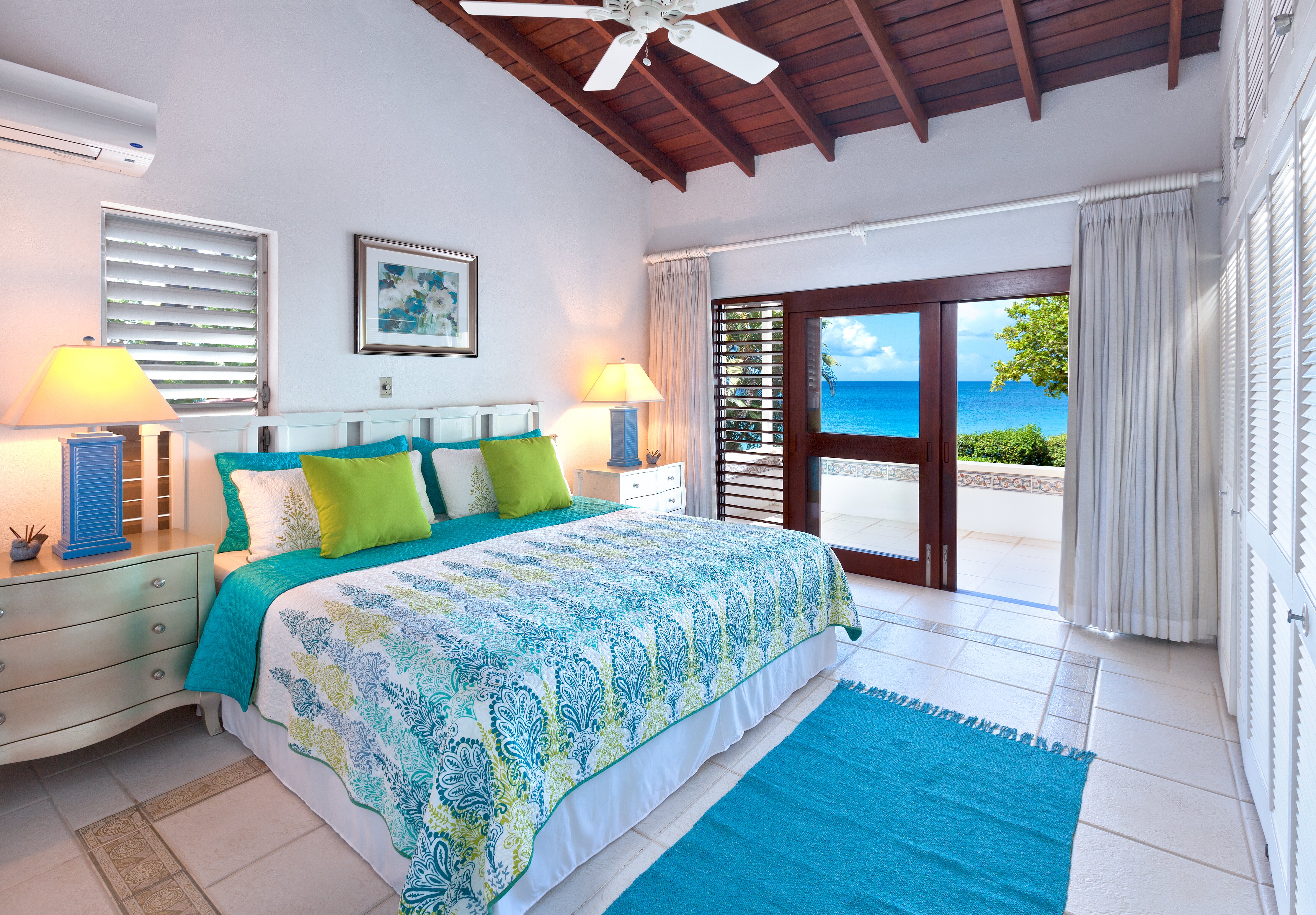 Privately screened by mature trees, with lawns and terraces for al fresco living, and the clear waters of the Caribbean lapping a white sand bay at the foot of the garden, this bright and welcoming villa is a perfectly charming place to chill. Throughout the house, décor and furnishings blend crisp white with vibrant fabrics in reds and aqua, ceiling fans boost the cooling sea breezes, and WiFi is available to touch base with the real world. Entry to the main house is into the double-height dining room, from which there is an open-tread staircase to two air-conditioned, en suite bedrooms on the upper floor, each with a raftered ceiling and doors to a shared sea-view balcony.