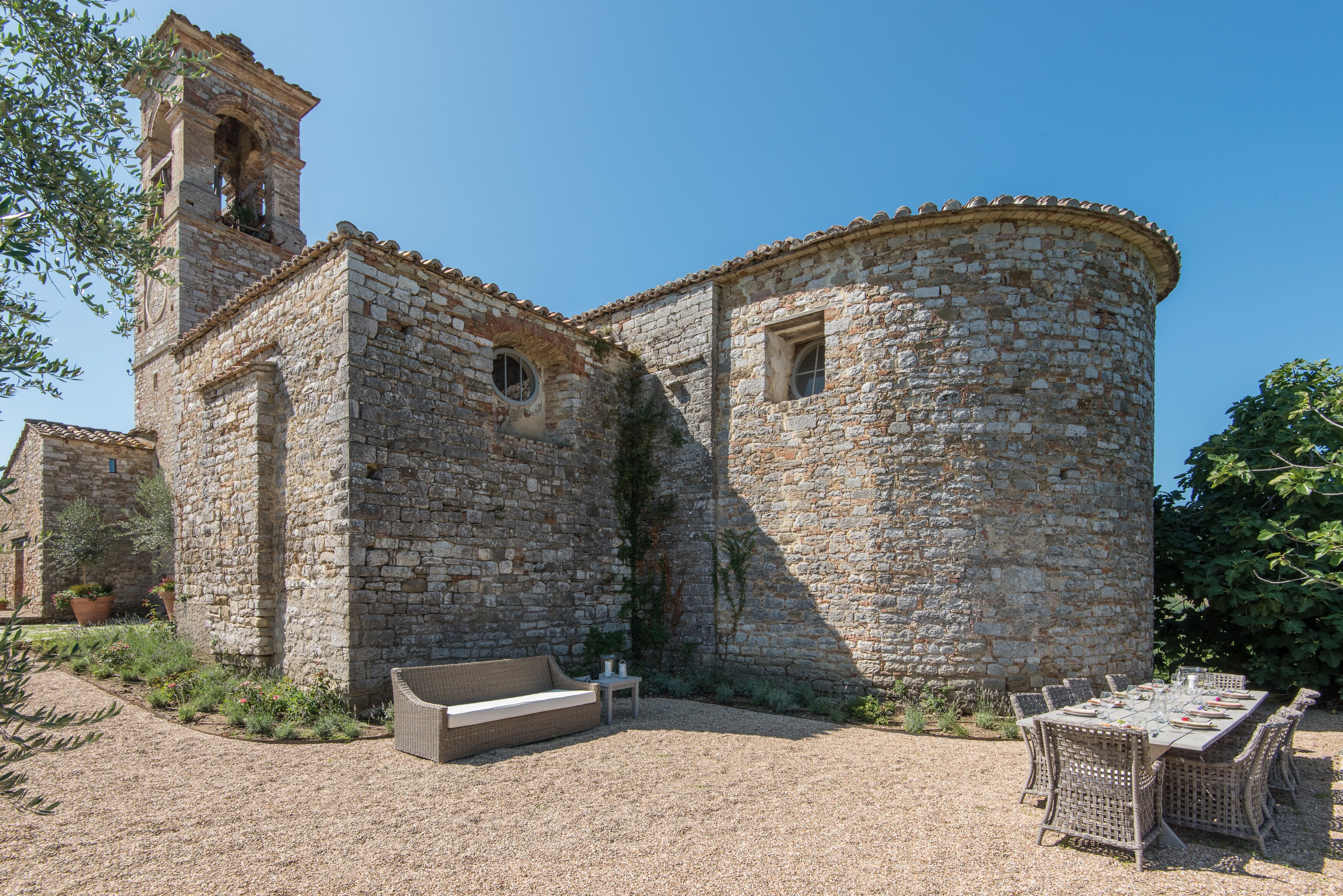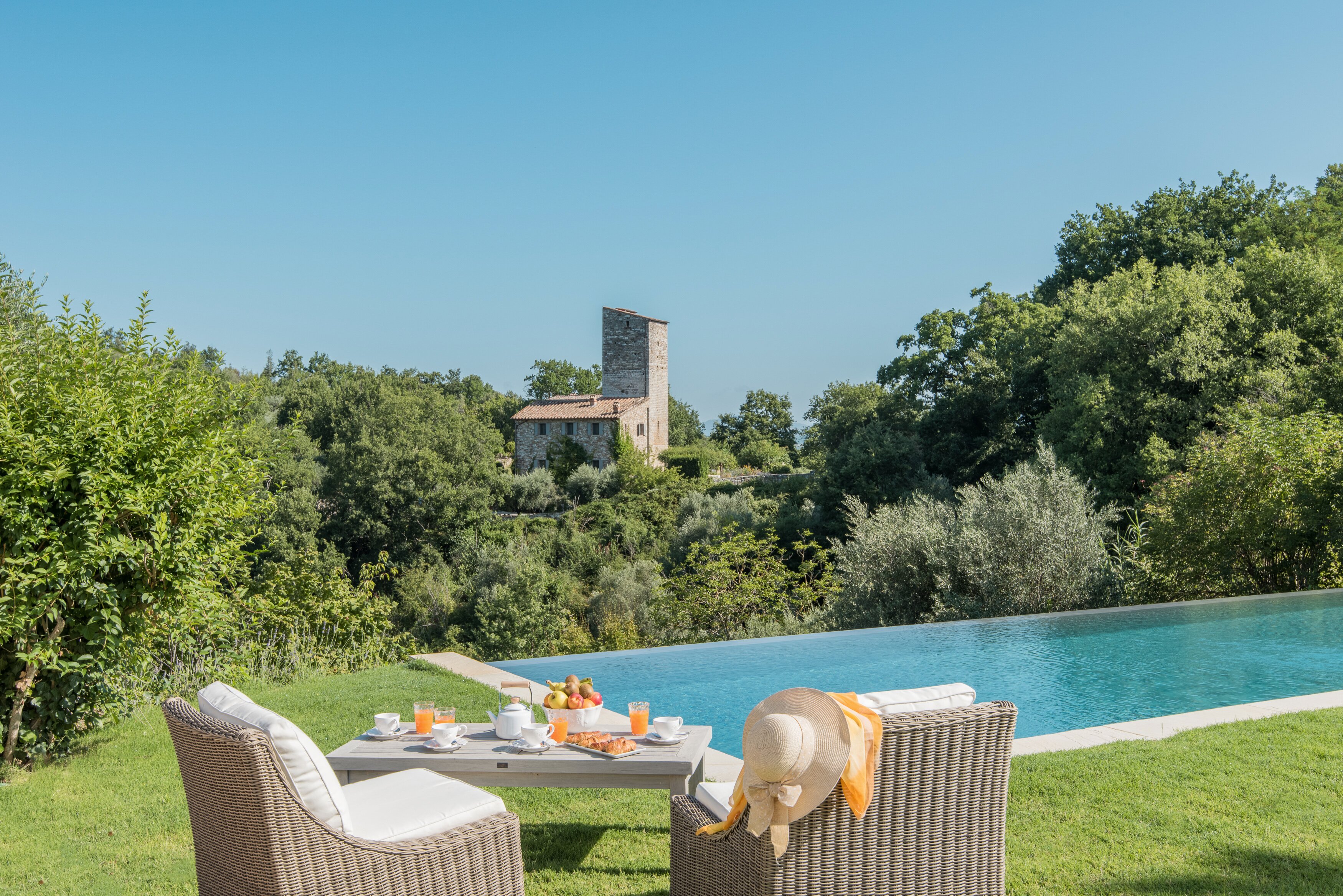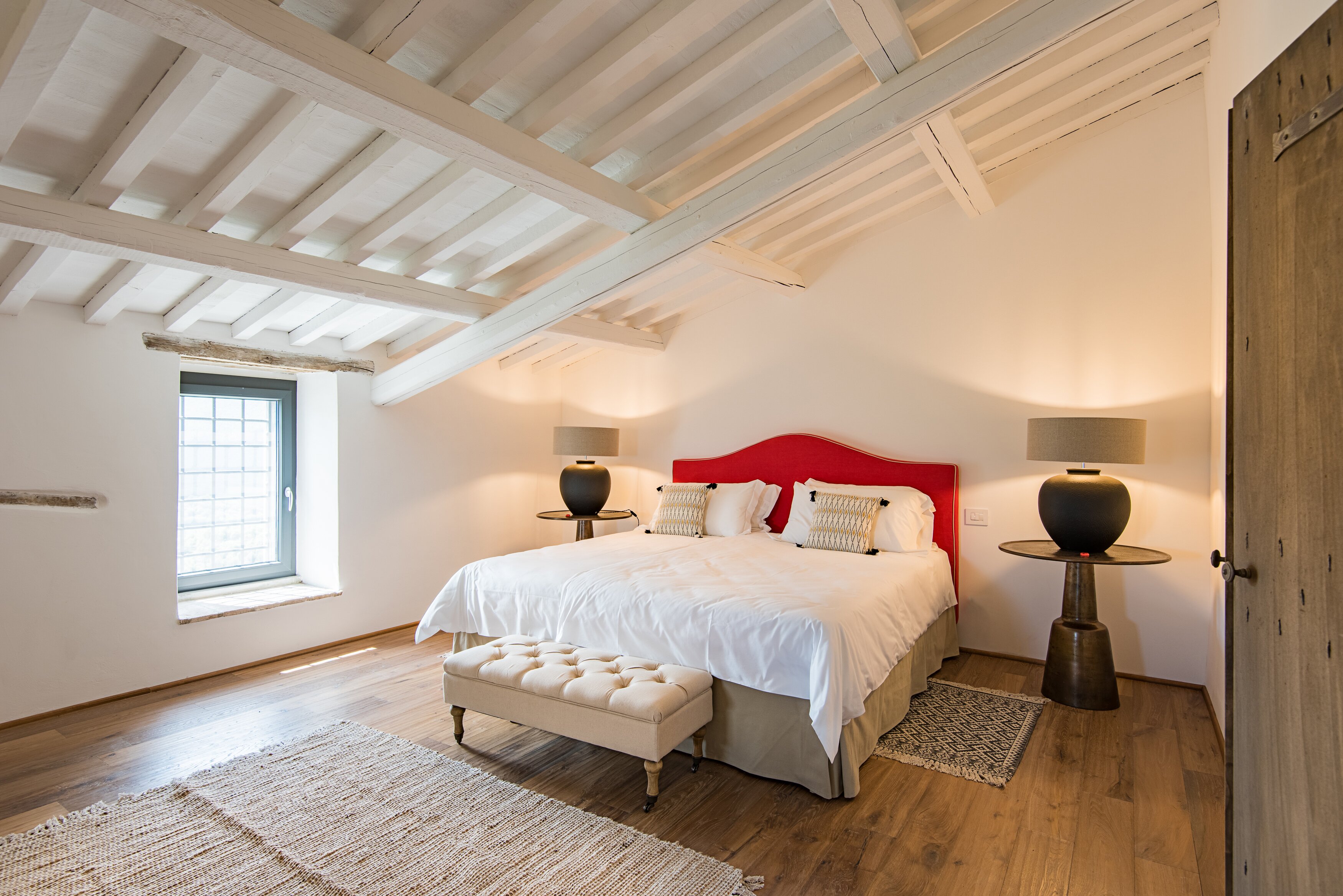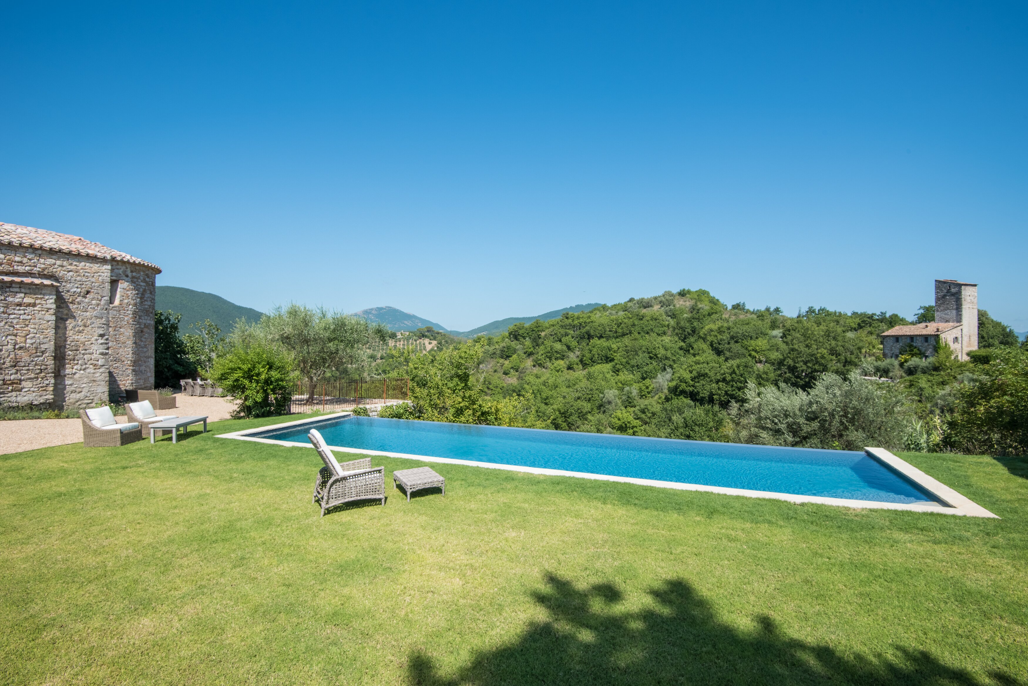 In a picture postcard setting on the border of Umbria and Tuscany, Colle Alto is an imposing historic house which has been carefully restored to create a one of a kind property. With traditional architectural features such as exposed wooden beamed ceilings and old stone fireplaces, the villa’s interior design is characterful and unique with more modern furnishings throughout. Gazing out over splendid panoramic views of the surrounding hills, the two buildings sit at opposite ends of the beautiful open garden where a sunken infinity pool basks in the sun. The main house comprises various generously sized living spaces, with ample space for indoor dining and relaxing, alongside a well-equipped open kitchen. There are six large double bedrooms, all of which are en suite with a mix of indulgent king and super king size beds for ultimate comfort; the master suite and one other room on the second floor both have access to a shared terrace with breathtaking views. The spacious annexe contains a further four double bedrooms with shower rooms en suite, plus a second kitchen and sitting room.
