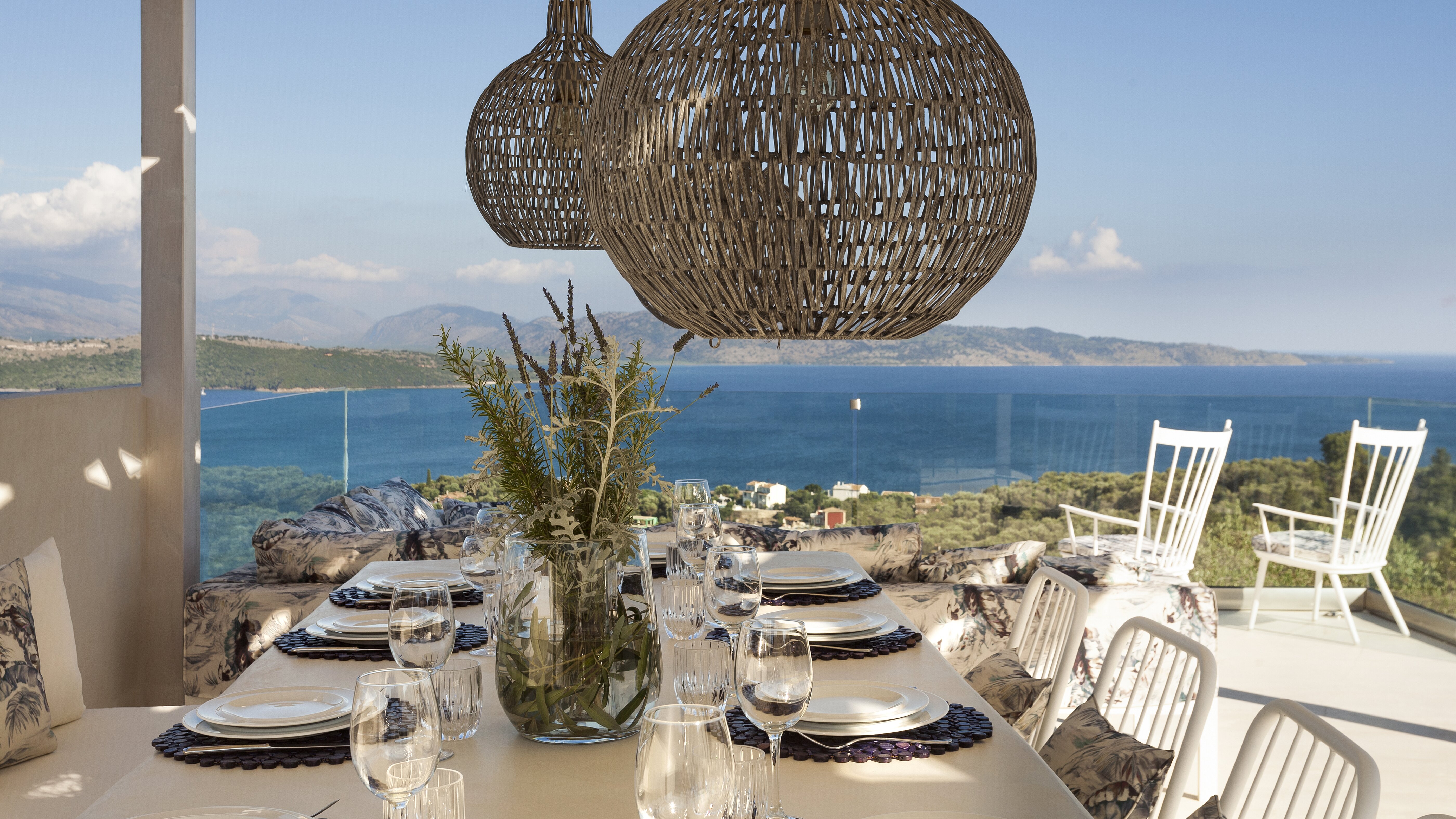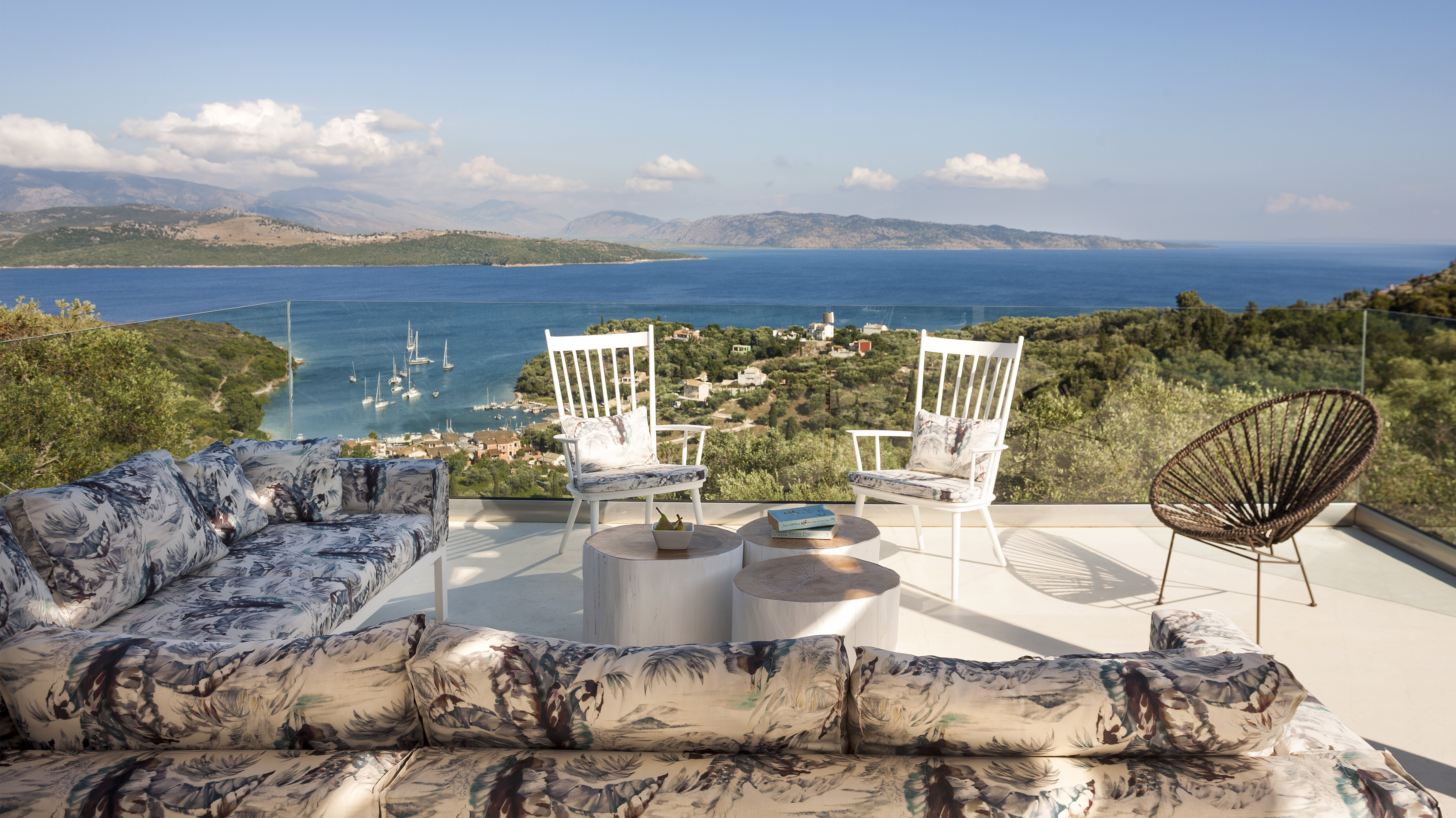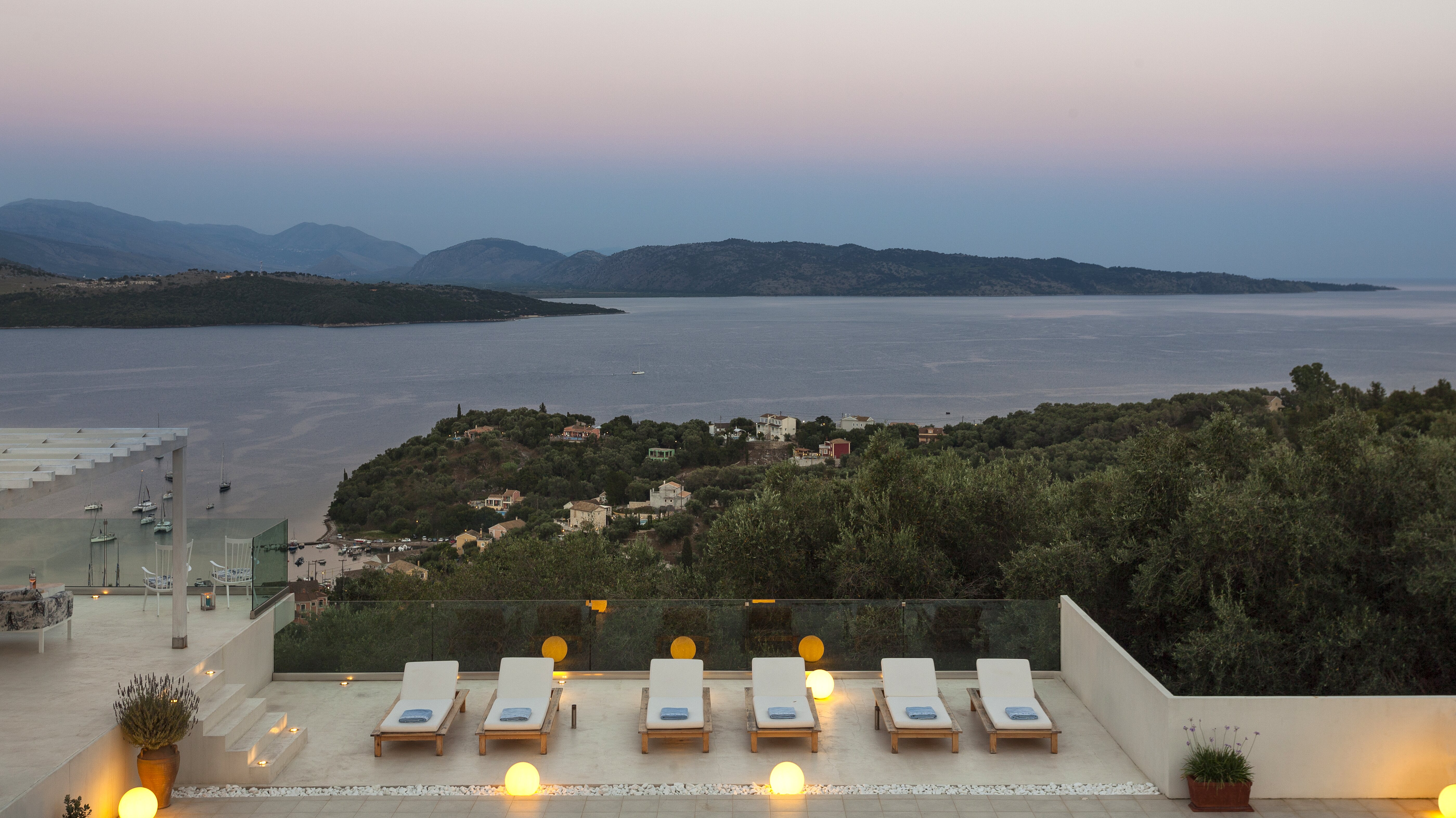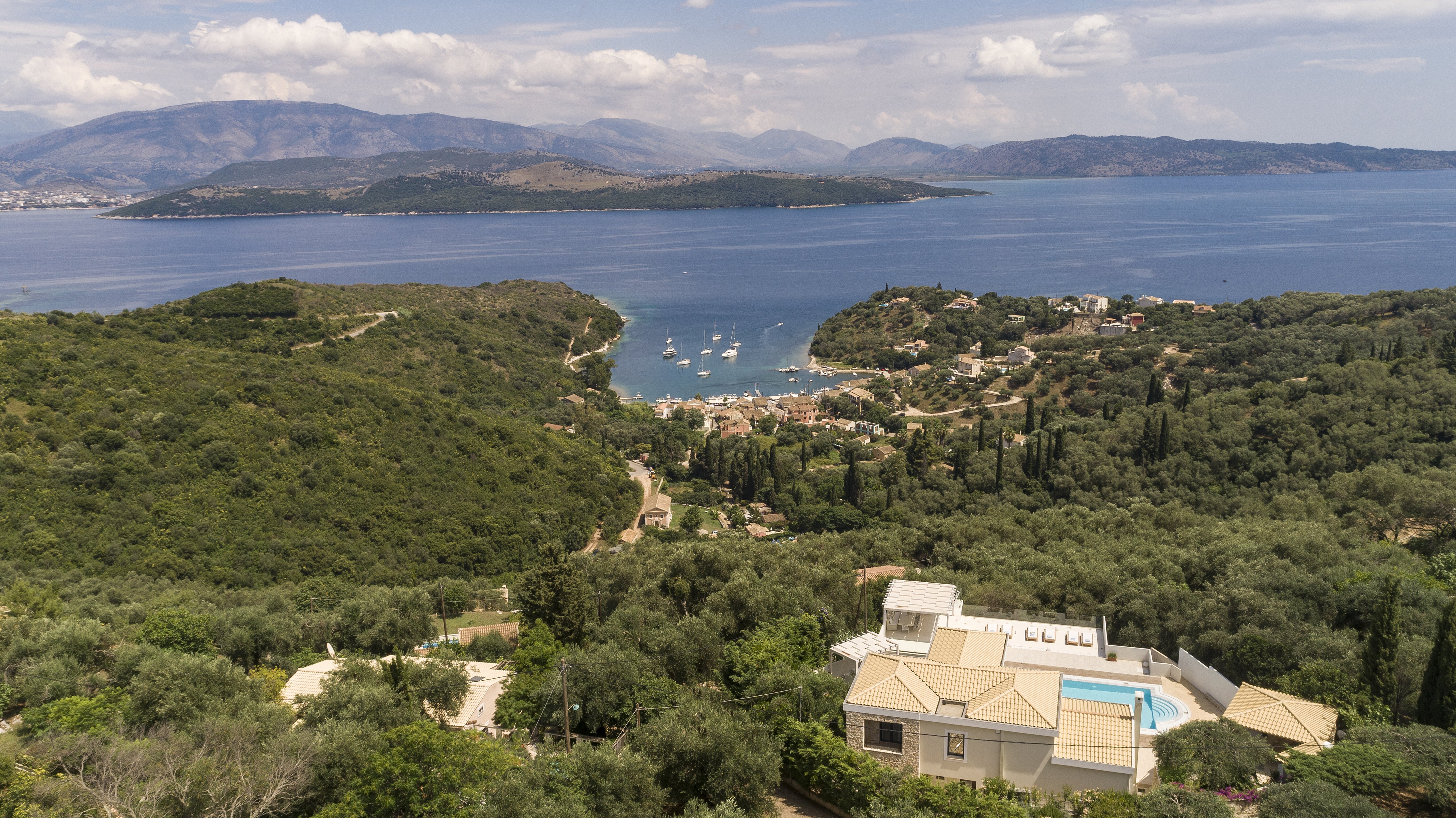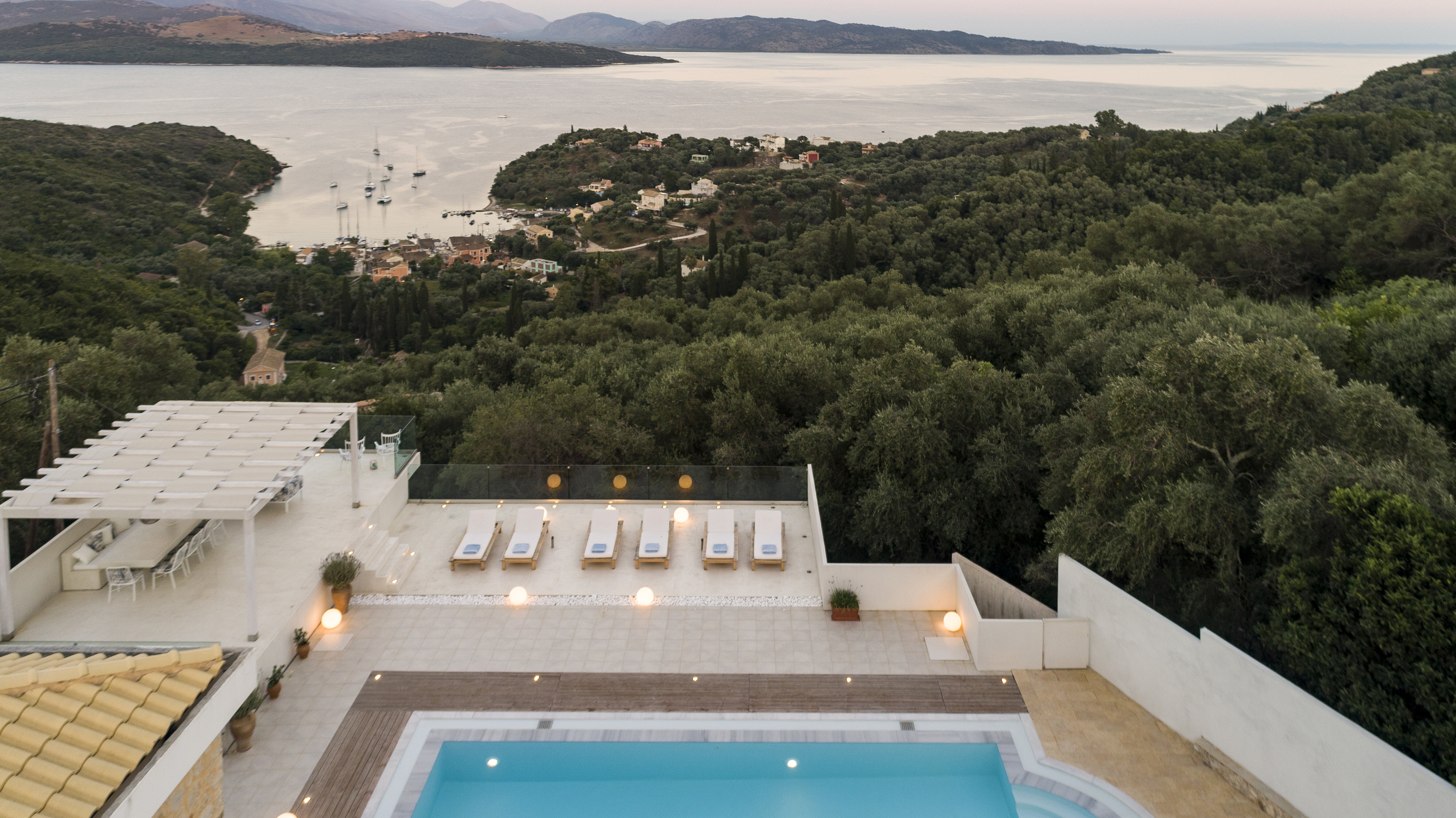 With glorious views of the hills and the harbour below, this is a modern and stylish luxury villa in Corfu, well placed for several beaches and bays, and including cook service for effortless leisure.