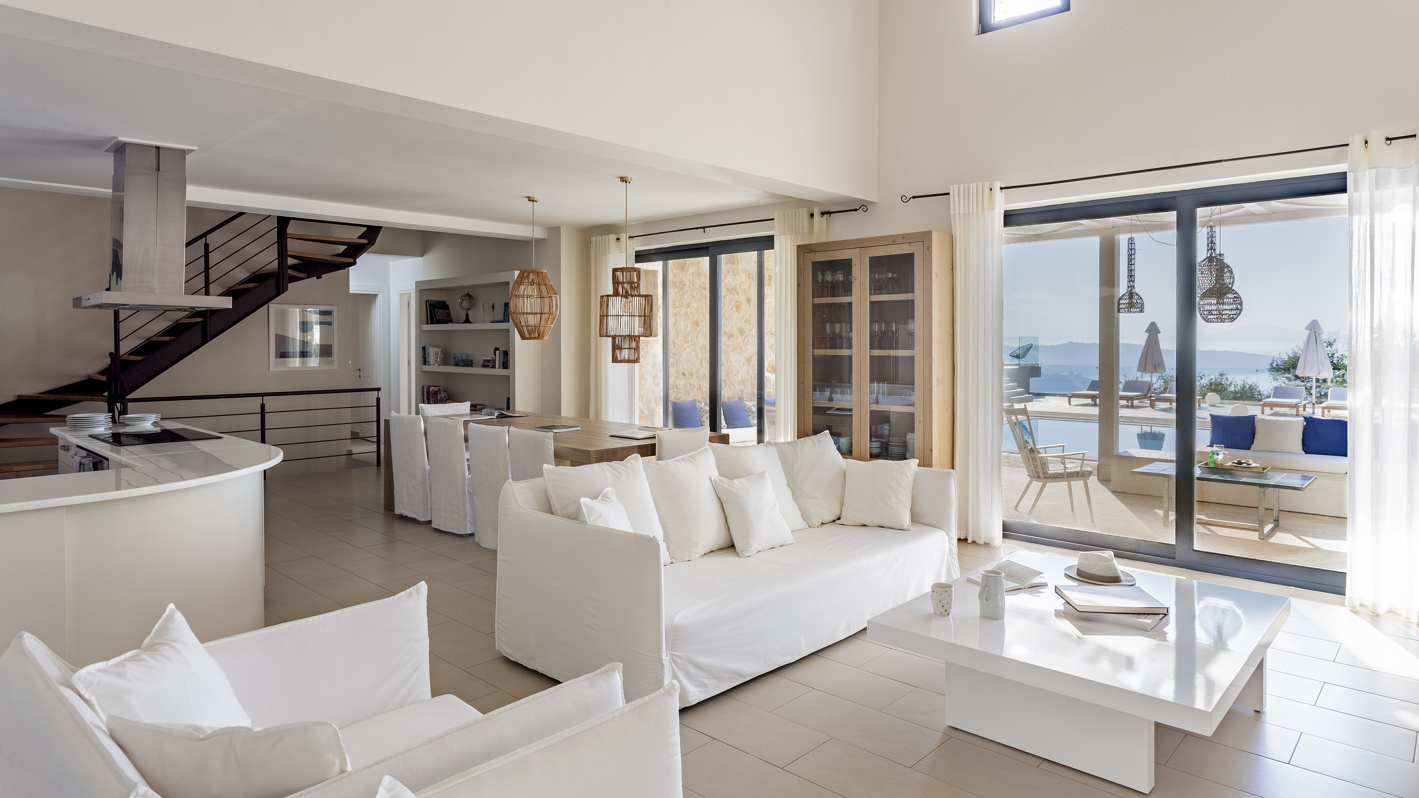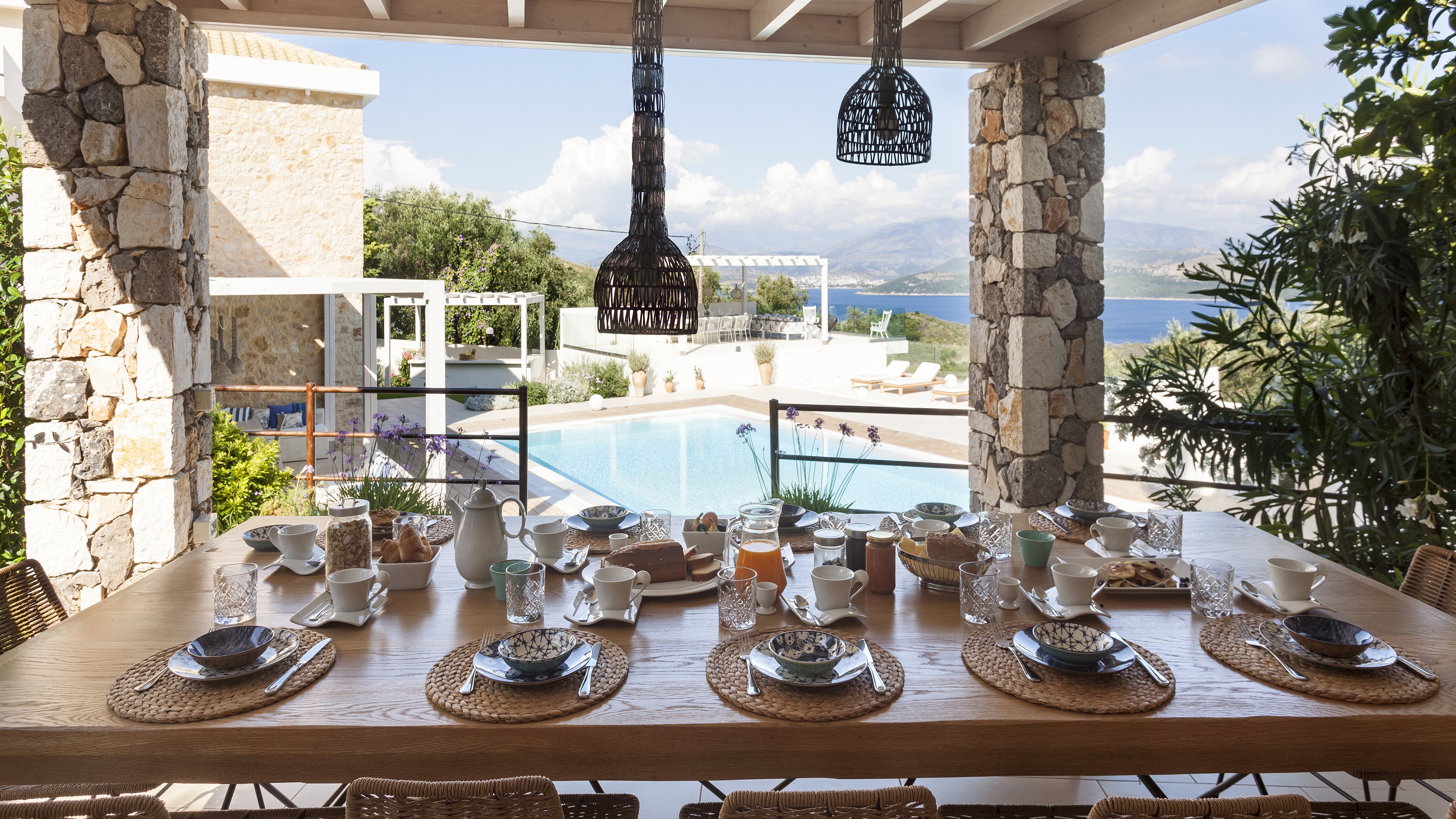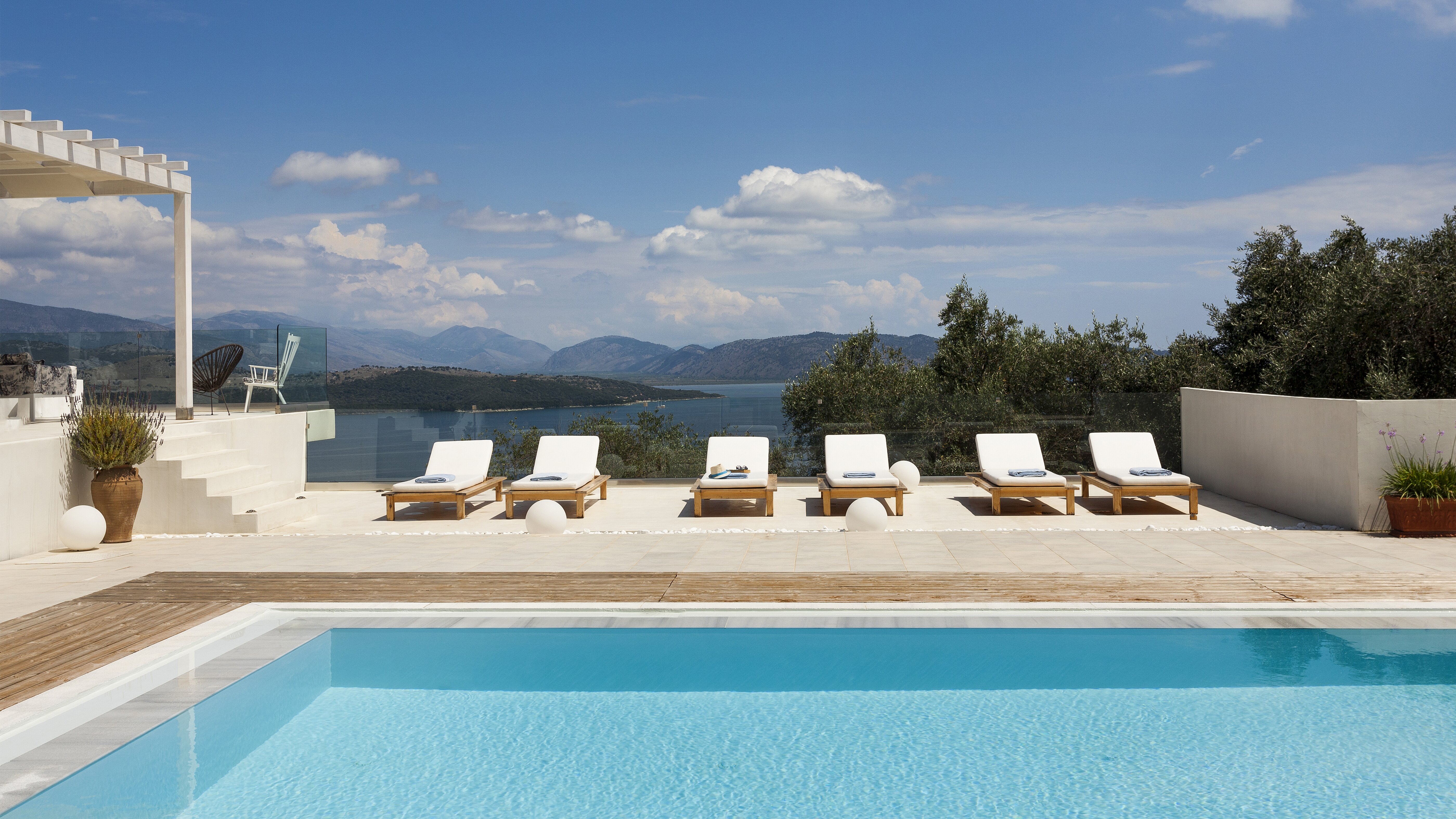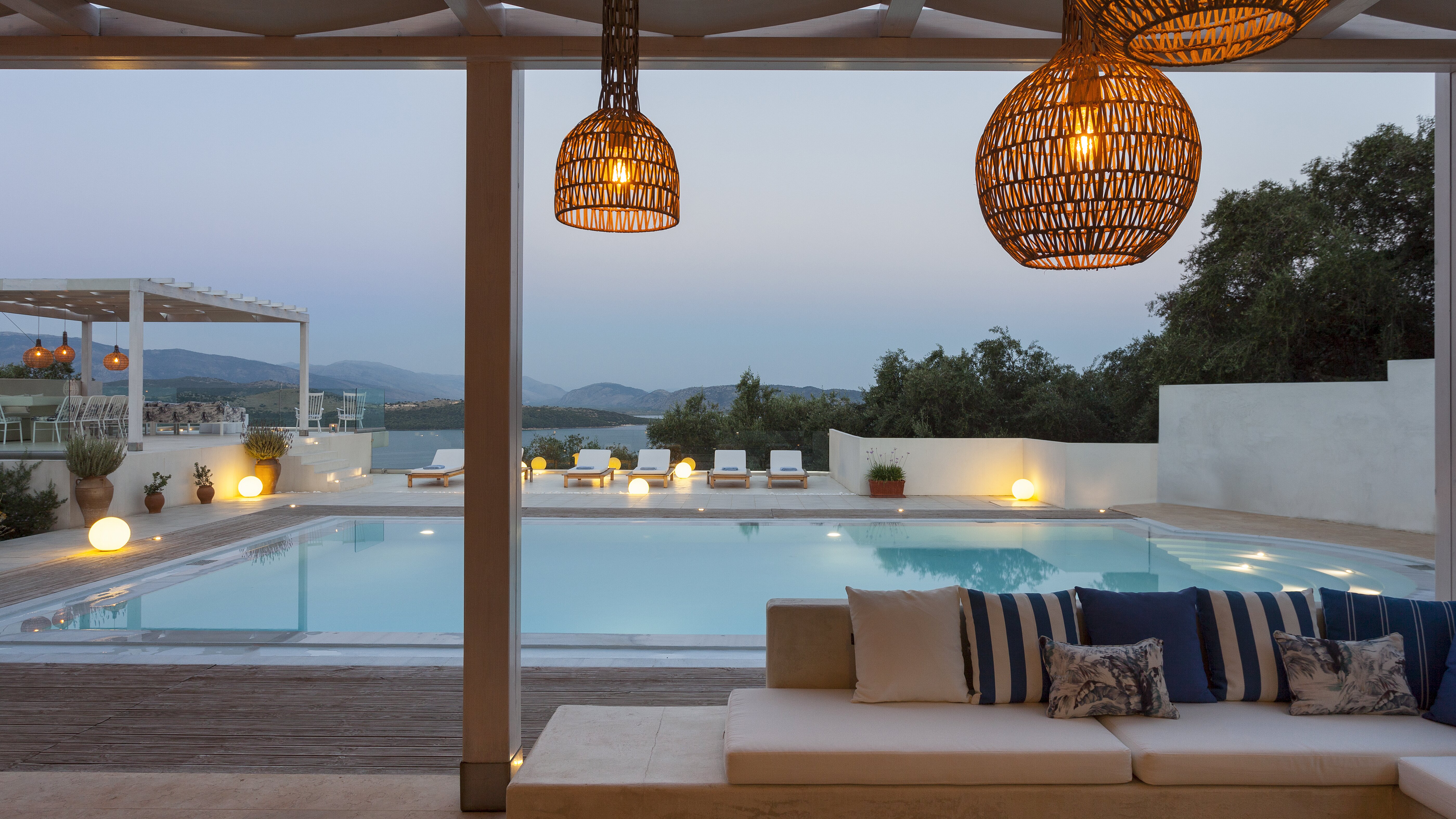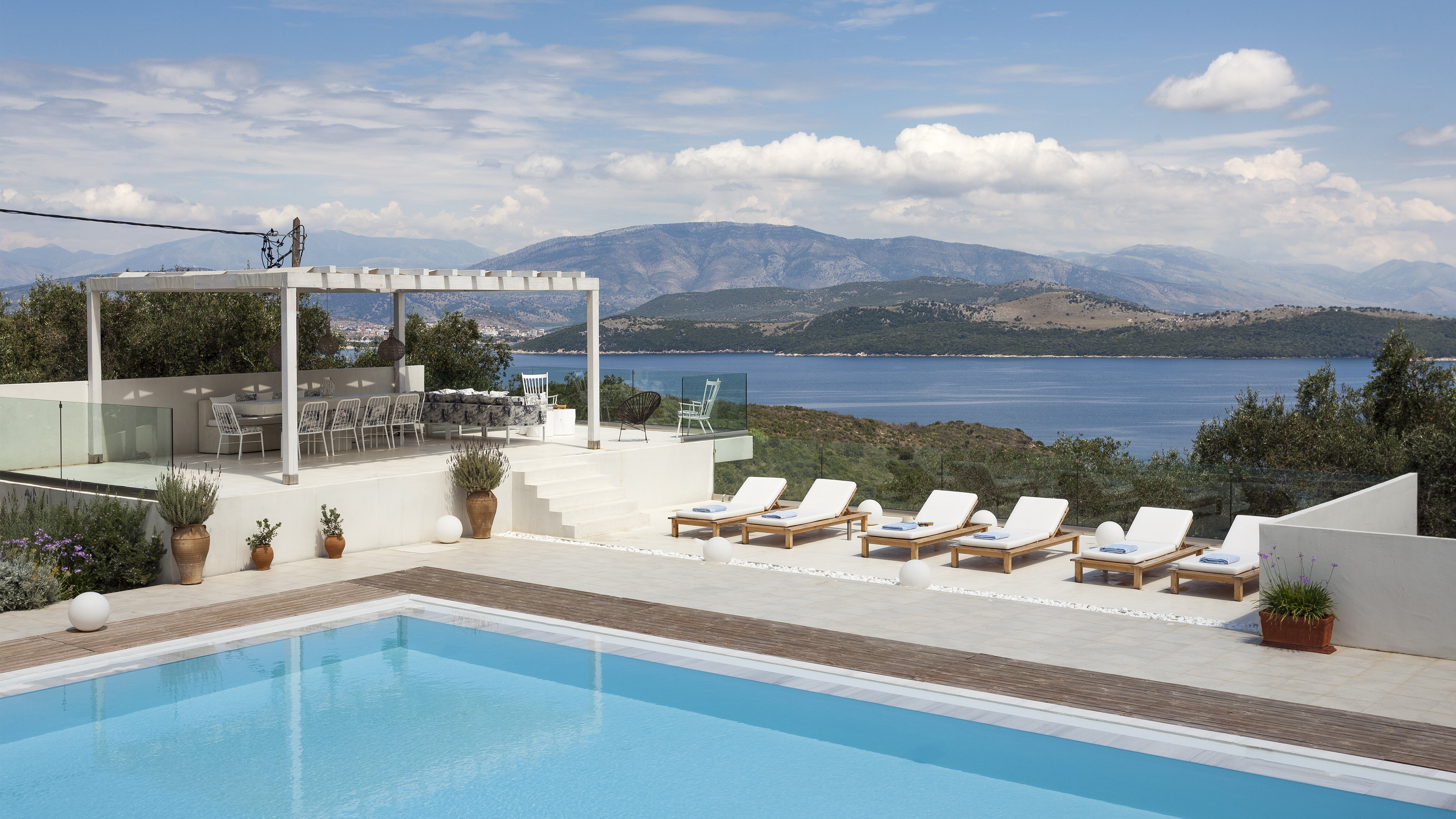 With glorious views of the hills and the harbour below, this is a modern and stylish luxury villa in Corfu, well placed for several beaches and bays, and including cook service for effortless leisure.