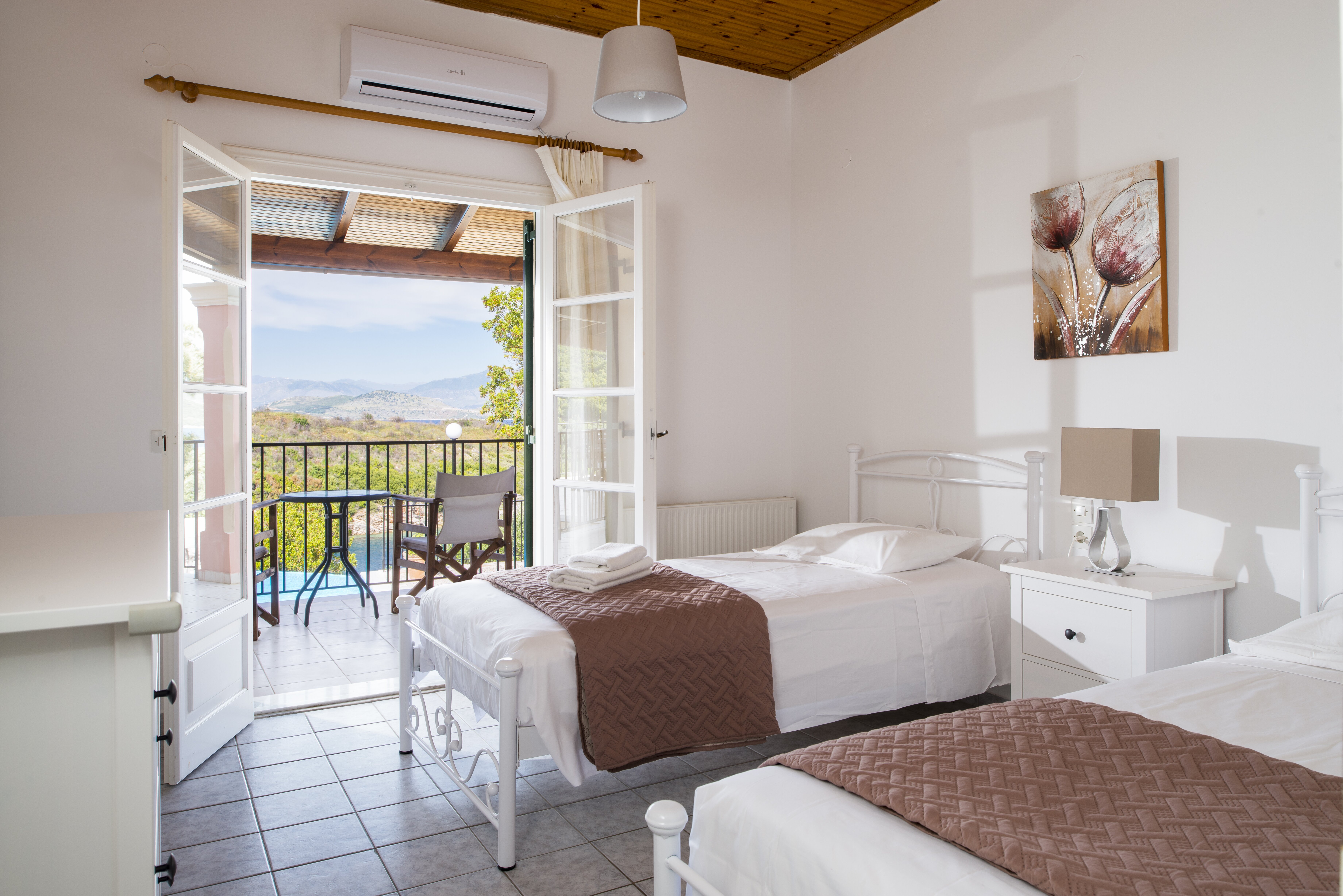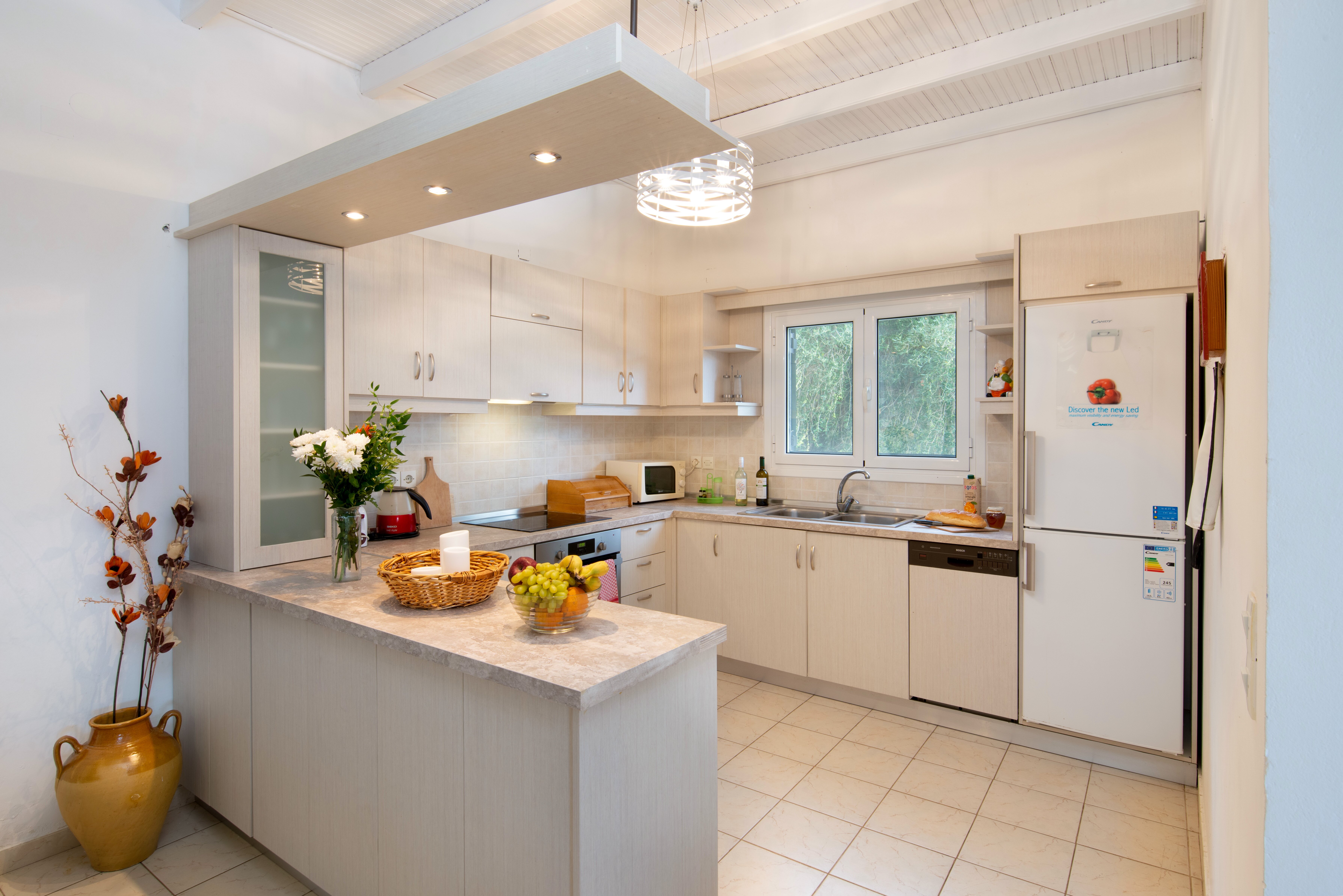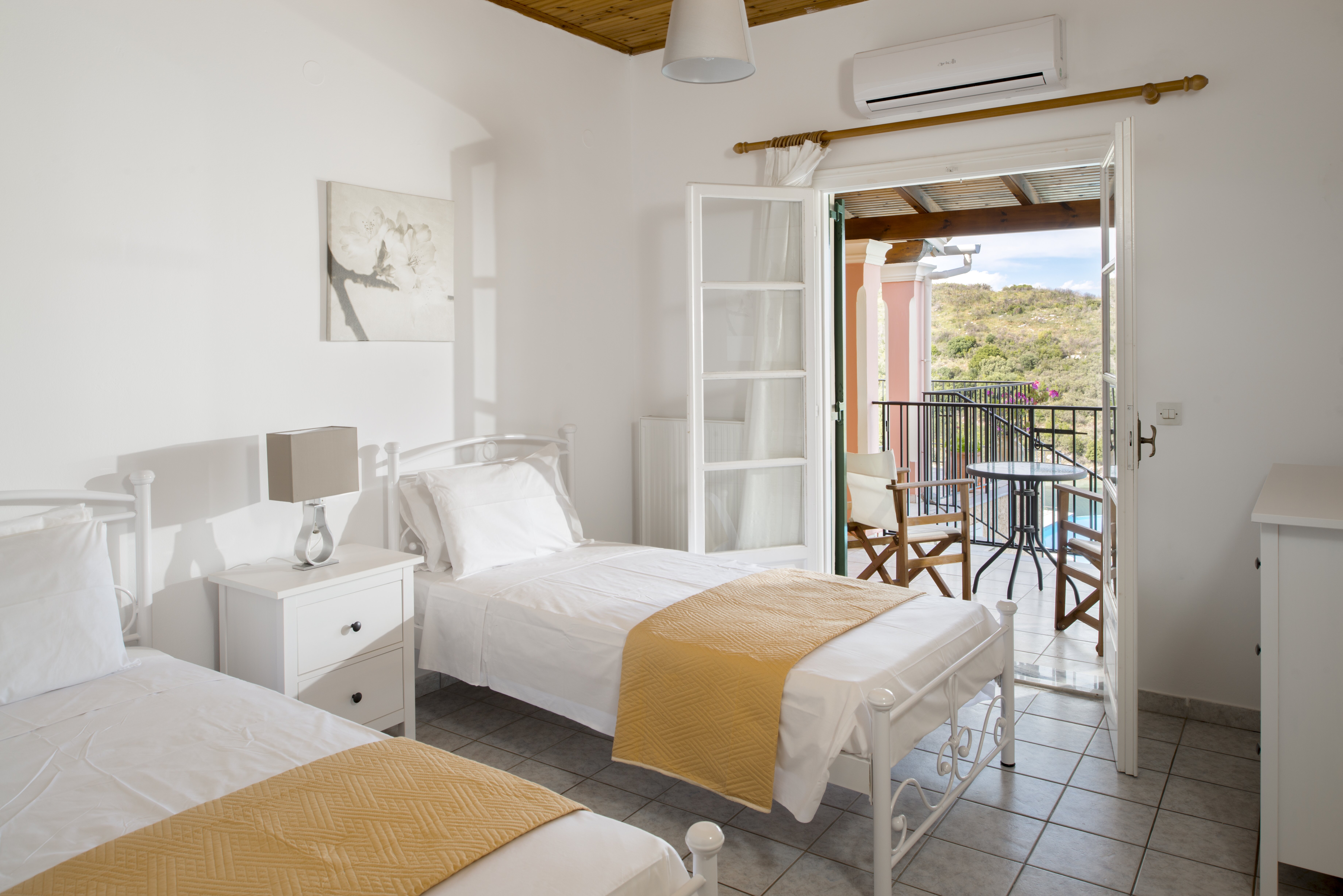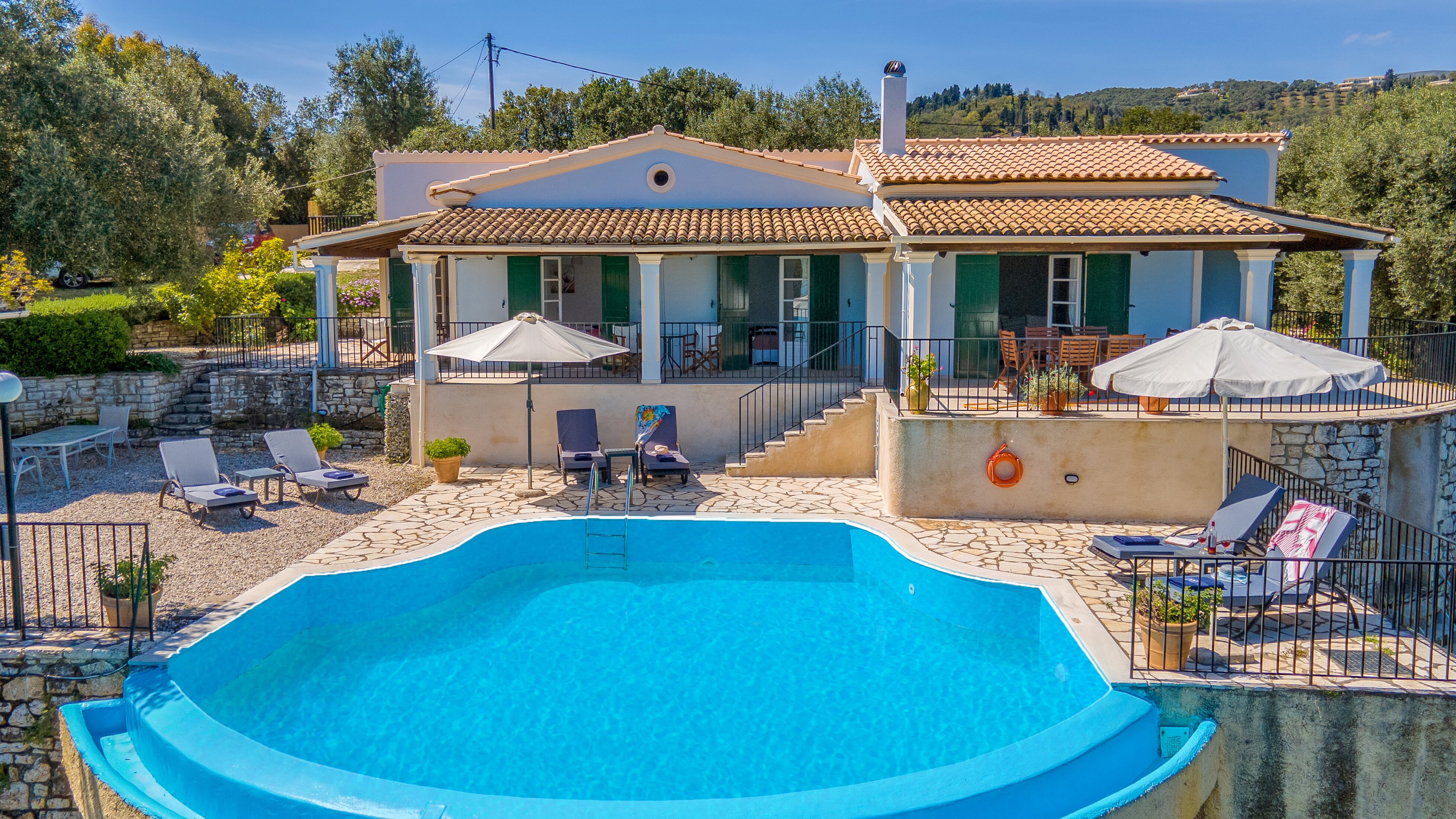The location is private and peaceful, almost at the tip of an olive grove promontory, with gorgeous views straight out to sea and back down the bay to the village, and with an air of wonderfully undisturbed idleness. Yet this pretty pink villa is just a ten minute stroll from the shops, beach and waterfront restaurants of little St Stephano, and a short drive from tennis in Kassiopi and excellent water sports on Kalami’s broad bay. A fine choice for a family holiday, the single storey villa has one double and two twin bedrooms, each with air conditioning.