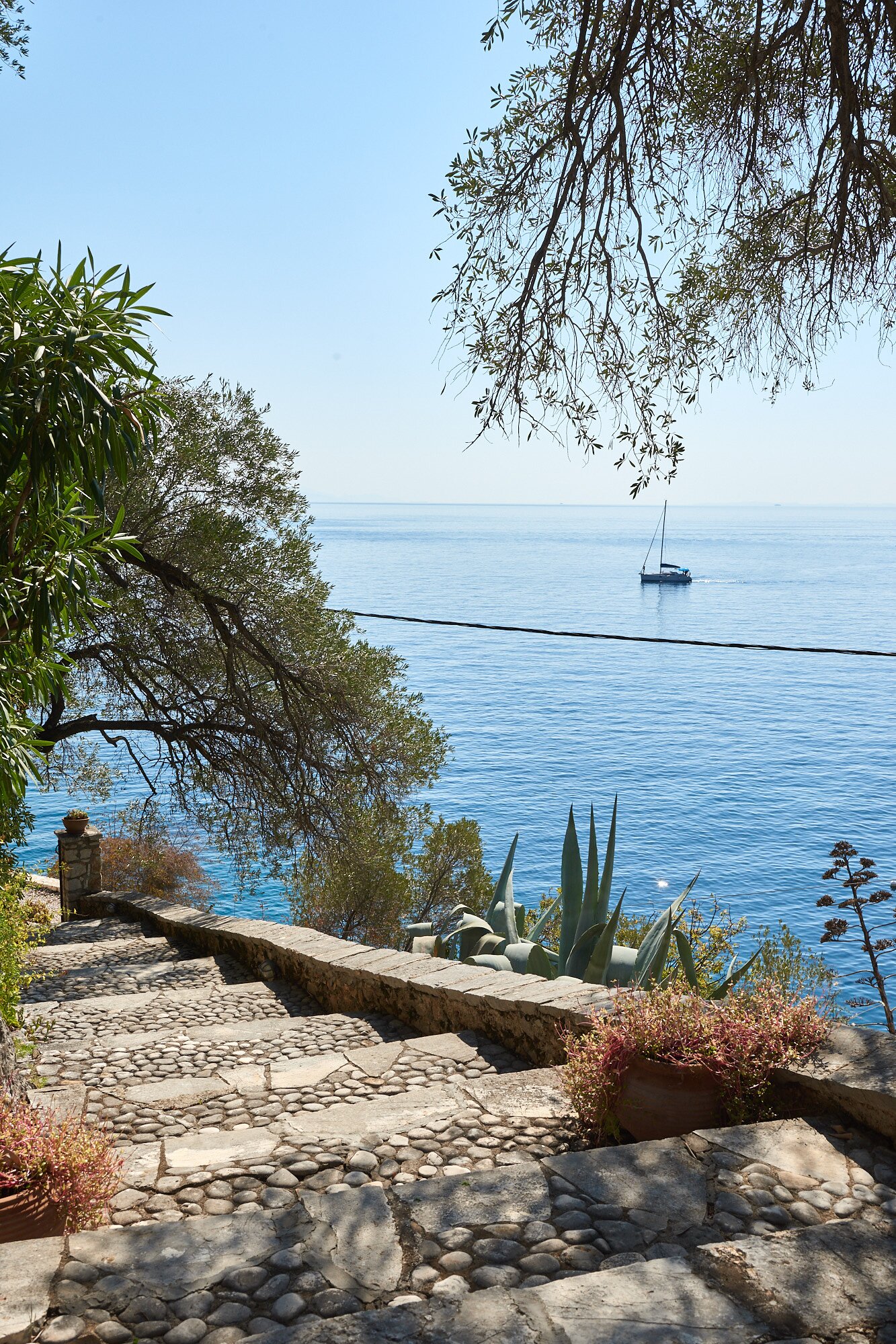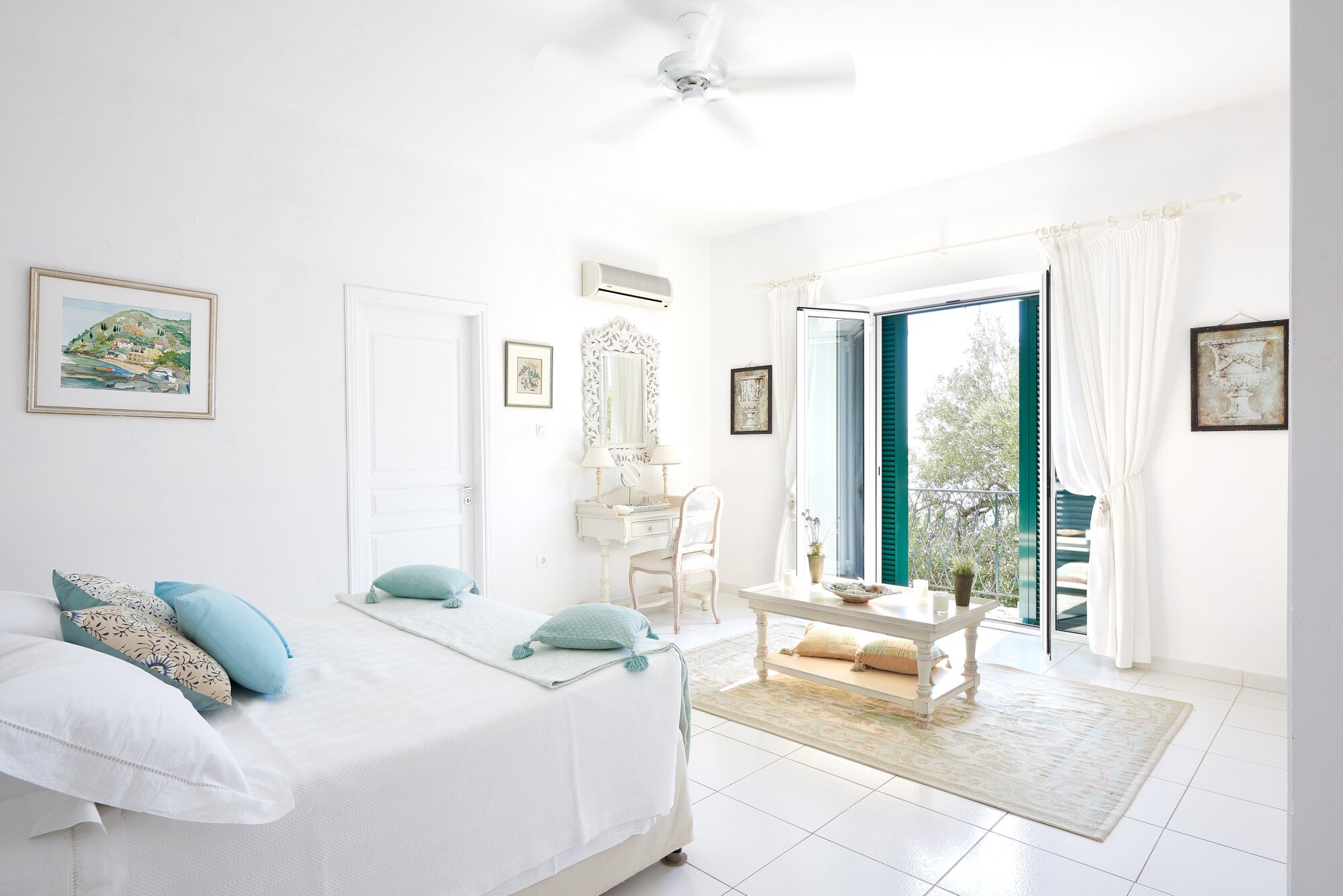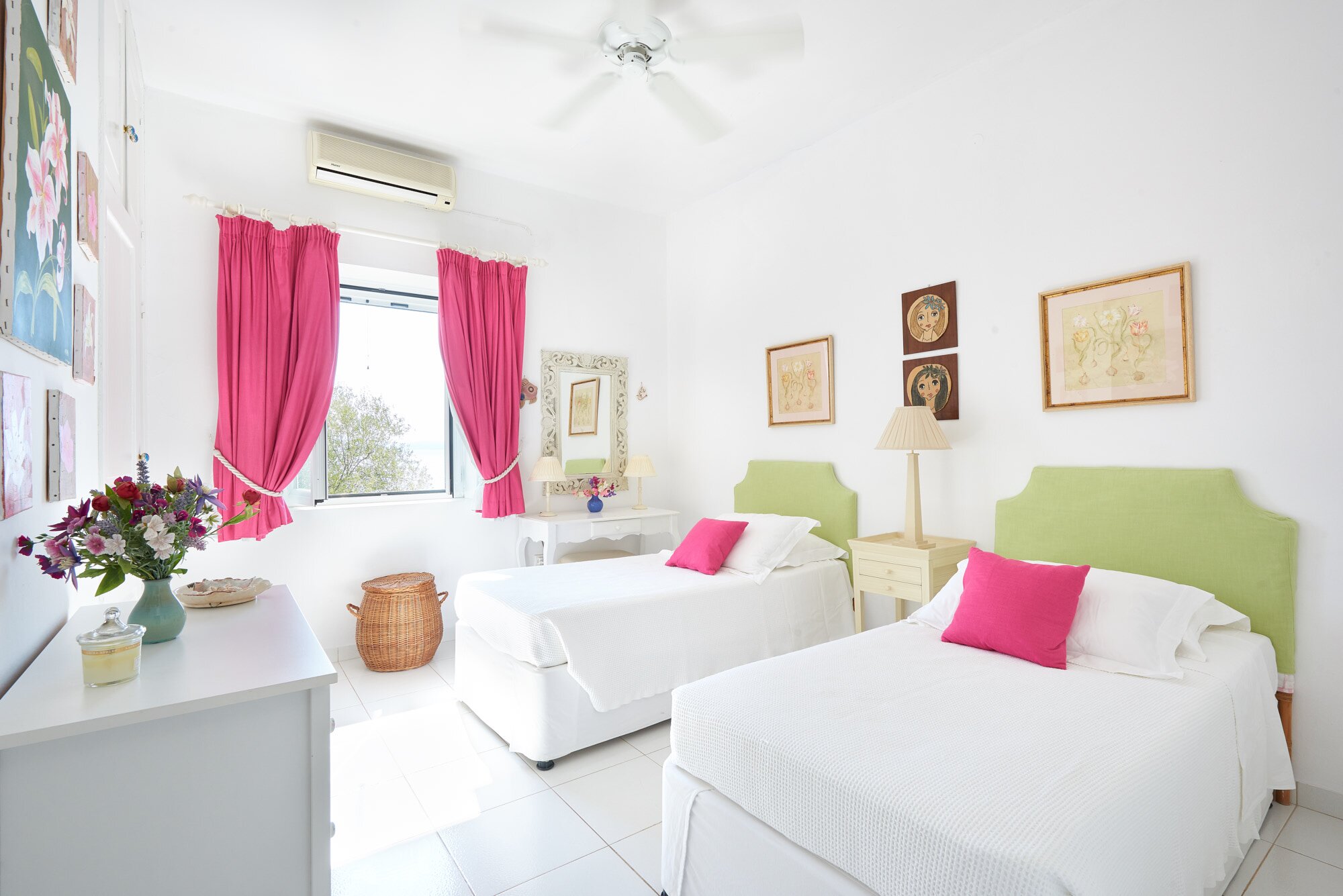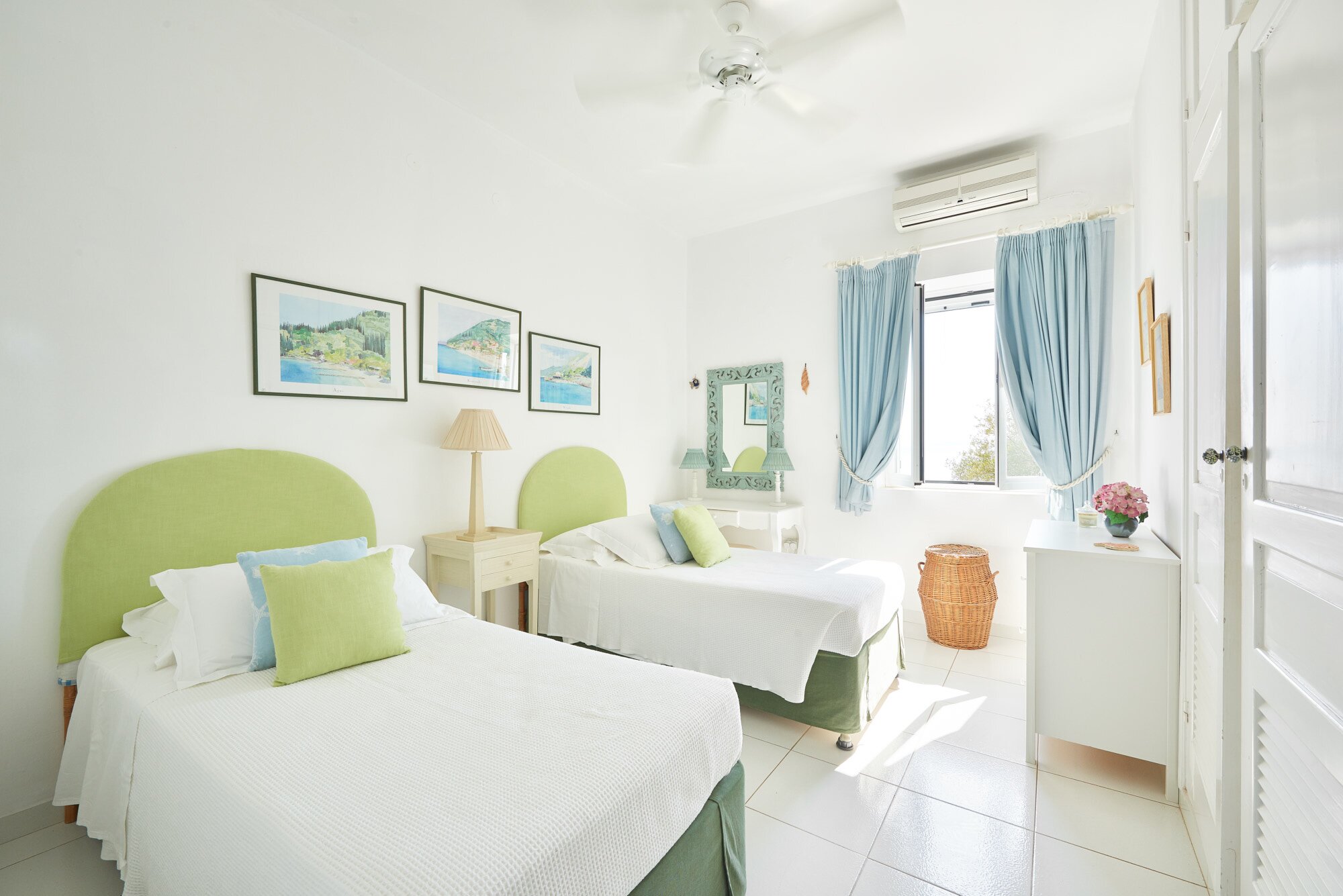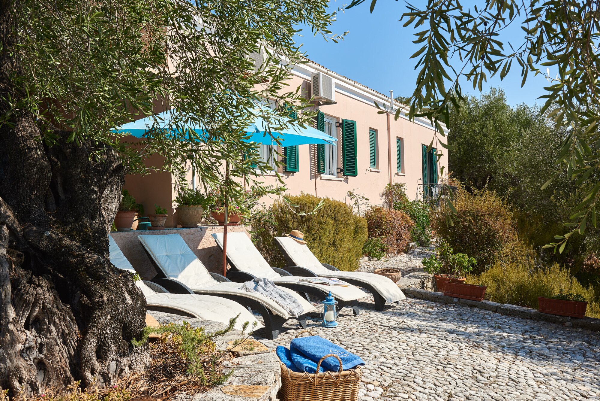 This is a very pretty villa in colourful gardens by the sea. An elegant sitting room sets the style of the house, furnished in white with elegant simplicity and opening out to a paved dining terrace. Perfectly placed for long leisurely lunches, with an awning for shade and the blue of the bay as a beautiful backdrop, this is adjacent to an al fresco ‘sitting room’, catching sea breezes and cooled by the dappled shade of mature trees. Kaminaki House has three charming bedrooms, each with air conditioning, and exudes an air of undisturbed idling which could be enhanced with (pre-bookable) cook service.