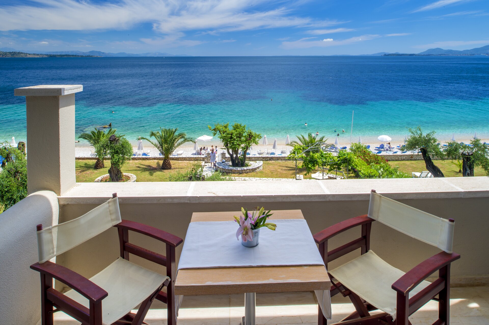 With uninterrupted views of the beach and the bay, this three storey building is raised above seafront lawns which are shaded with olive trees, punctuated with palms, and crossed by a paved path leading directly to the pebble shore. A timber decked walkway meets guests at the garden gate, non-motorised water sports are available from the beach, and there are a couple of tavernas within a two minute stroll; so these unpretentious apartments enjoy an enviable setting. Positioned about mid-way between Nissaki and Kalami, Krouzeri Beach typifies the relaxing, barefoot-casual tempo of this cluster of coastal villages, and is particularly popular with couples.
