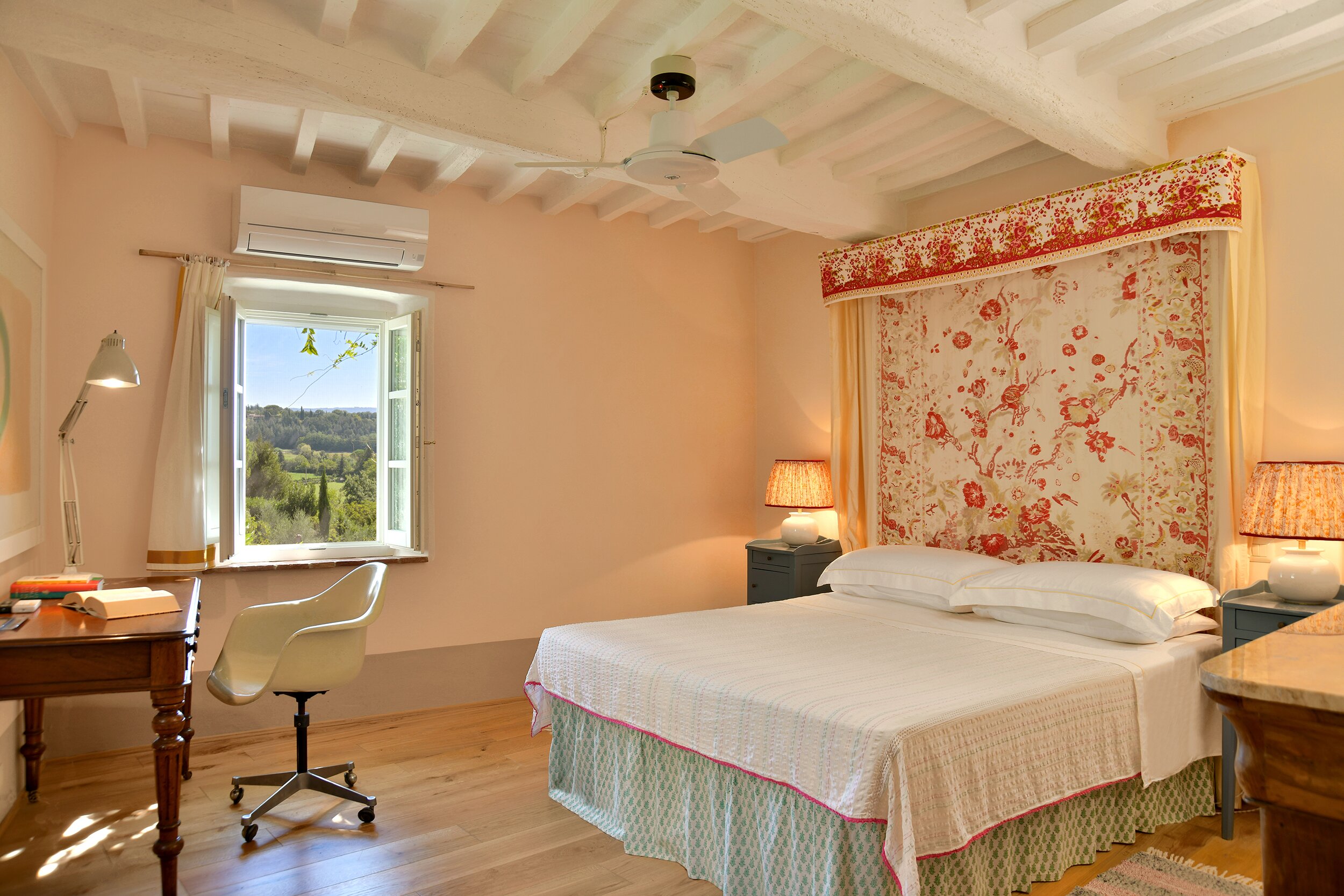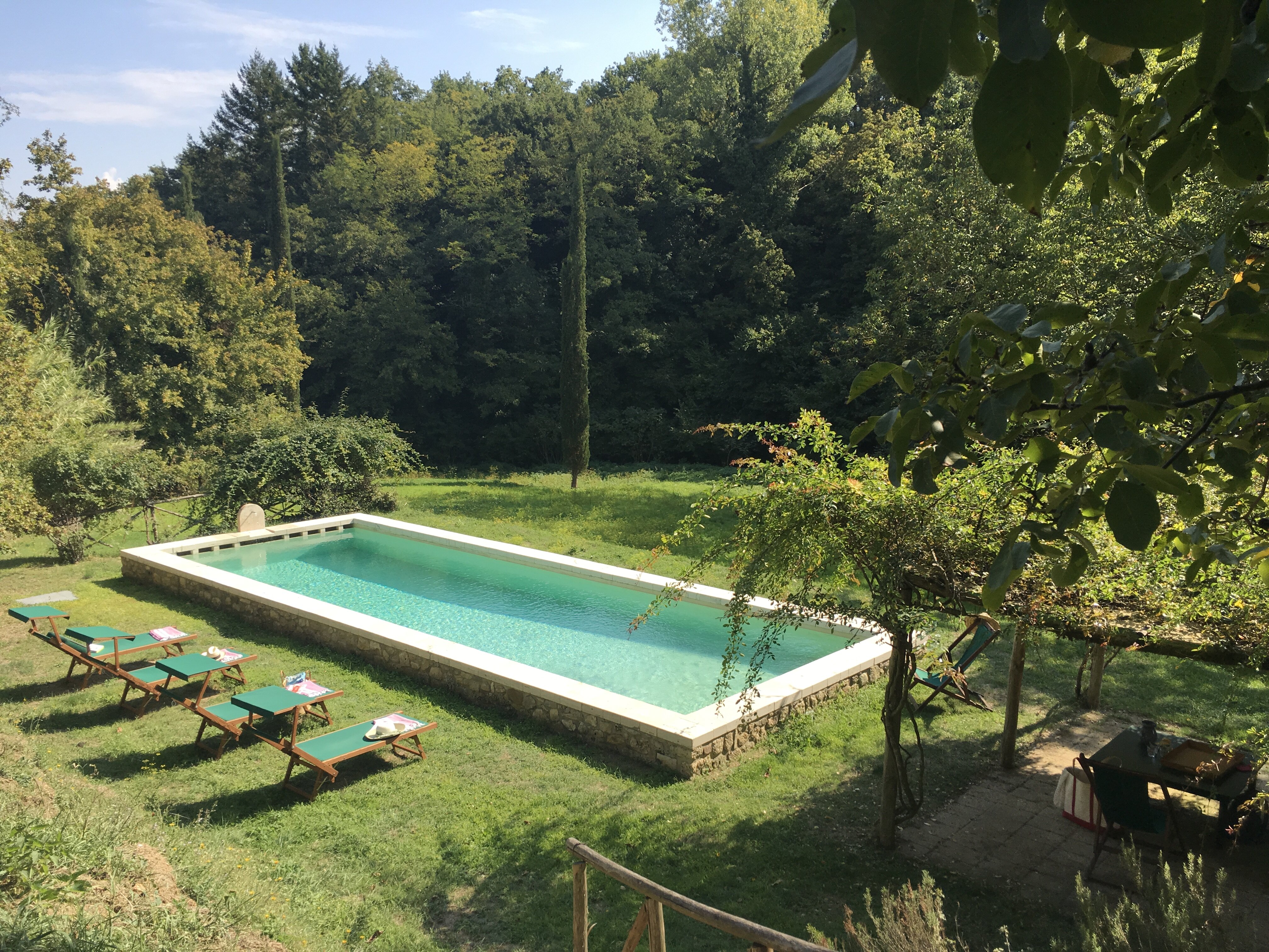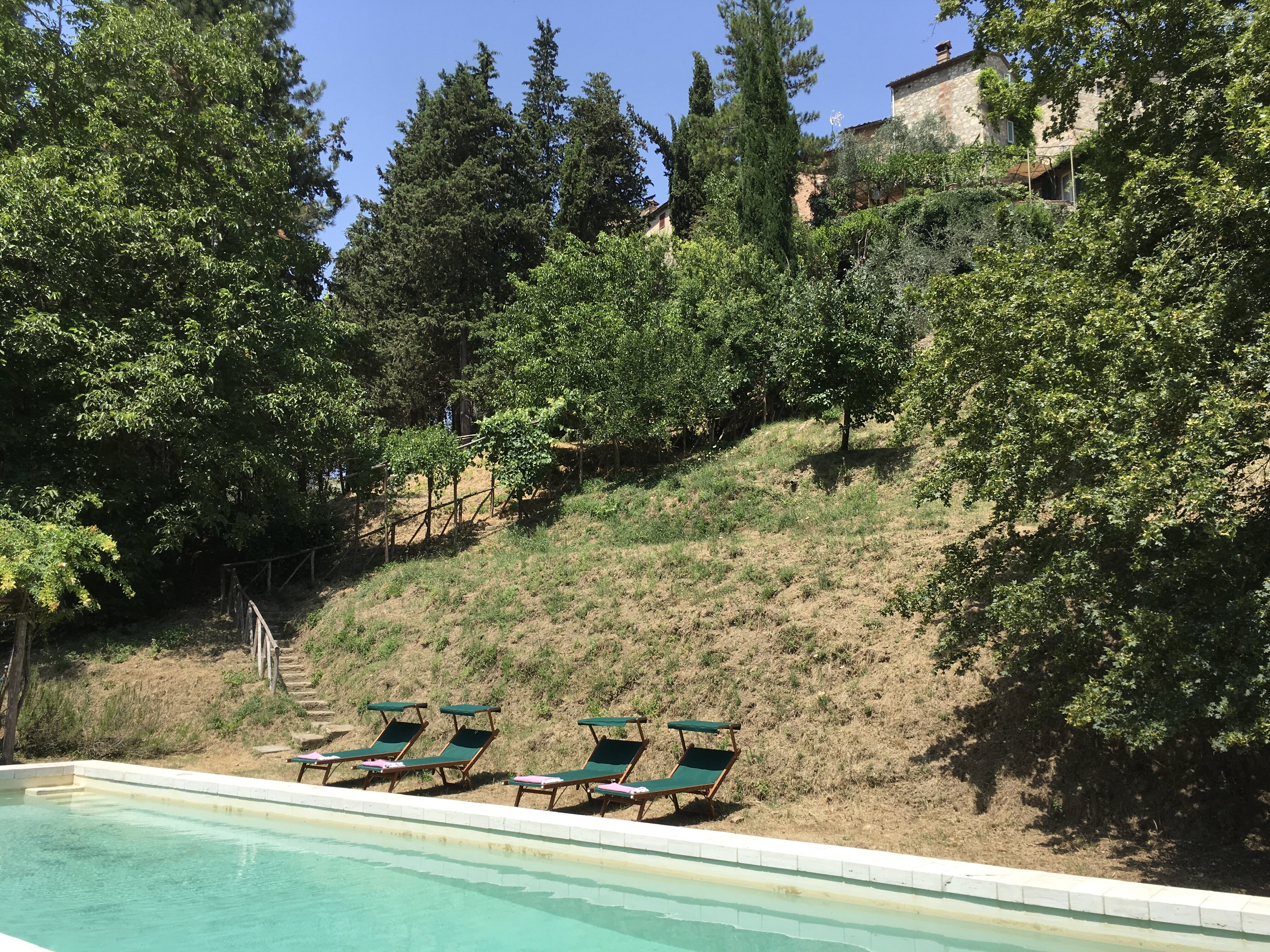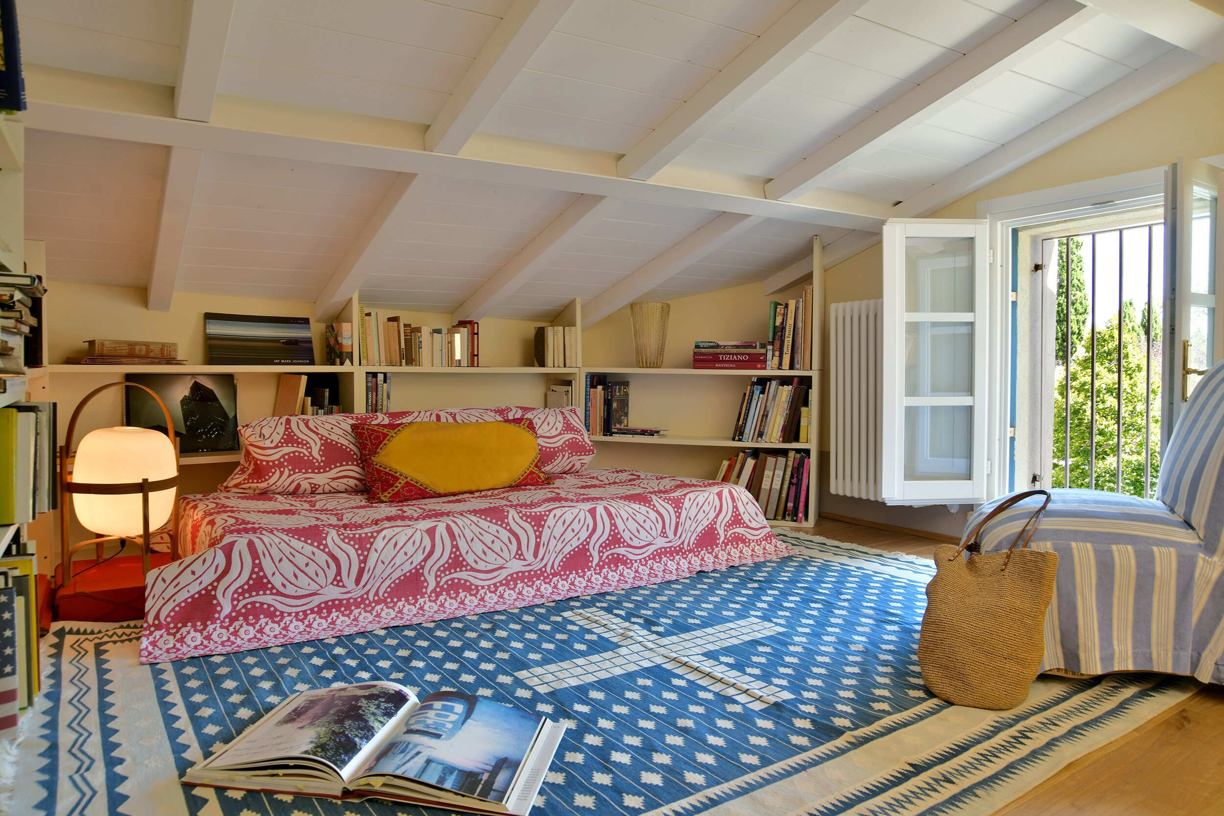 With gorgeous rural views, which get better with each flight of stairs, La Torre looks down over grassy slopes and terraces, sprinkled with trees and forming a cushion of peaceful privacy. A long flight of stone steps lead down from the villa to a lovely pool and poolside pergola, set amid lawns and screened in greenery for a sense of seclusion. But in fact, the tower house is just five hundred metres from shops and trattoria in Cetona’s cobbled streets, its vine-shaded terrace furnished for al fresco dining, with the medieval Citta della Pieve framed in an enchanting backdrop. From the terrace, doors lead in to a country kitchen and delightful living room, designed with arty rusticity and bright with kilims, cushions and pictures. The Tower is on 4 levels, and there is one spacious bedroom on each of the floors above, all furnished with a touch of romance and a few iconic pieces for the design connoisseurs. The villa has been recently renovated with the help of two architects adding new elegant bathrooms, closet space, a library room, a new entrance and a stone staircase. Ideal for a group of friends or for families with older children, La Torre could be booked together with an adjacent property, La Torretta, to accommodate additional guests in a fully self-contained villa for two.