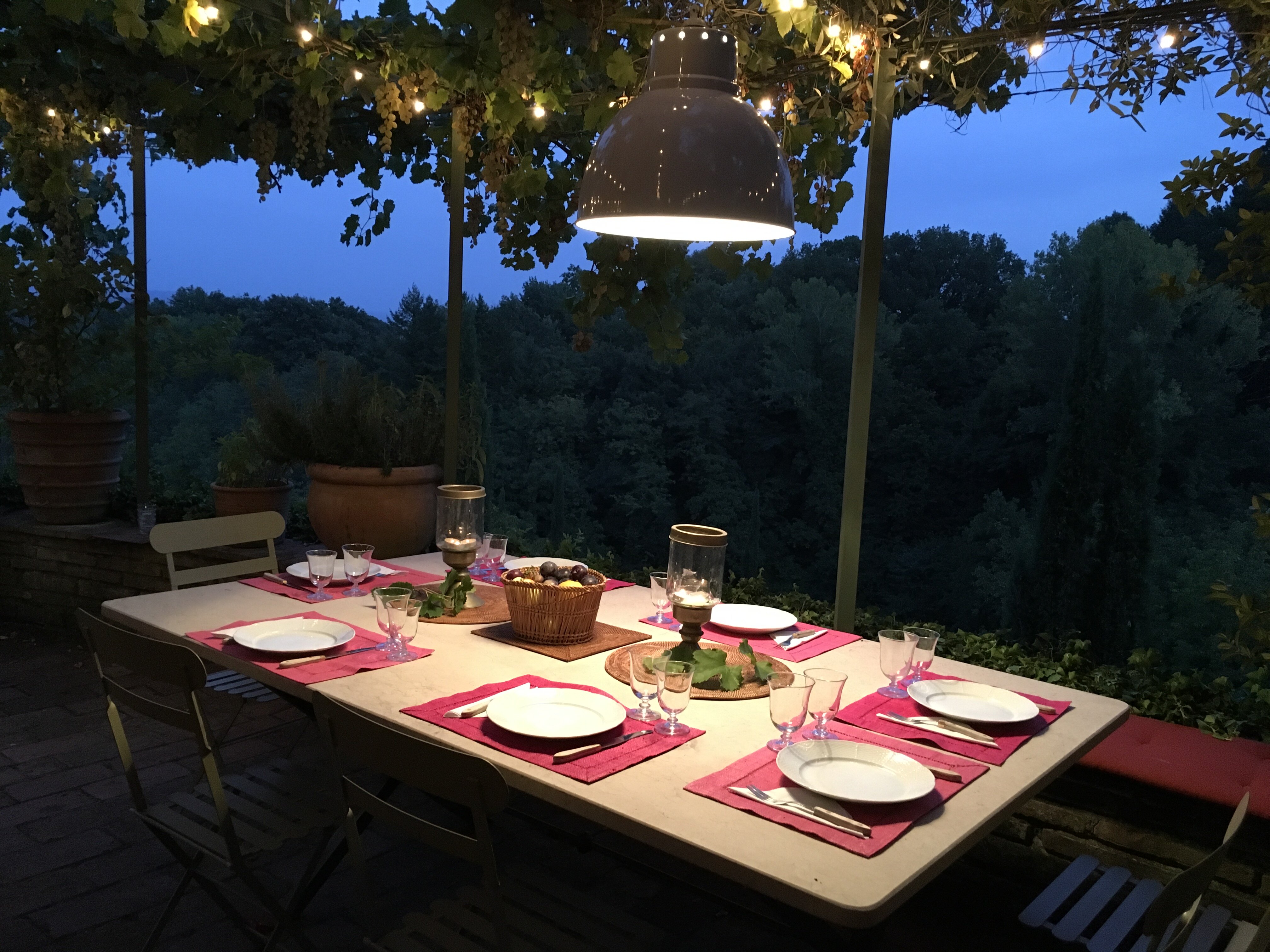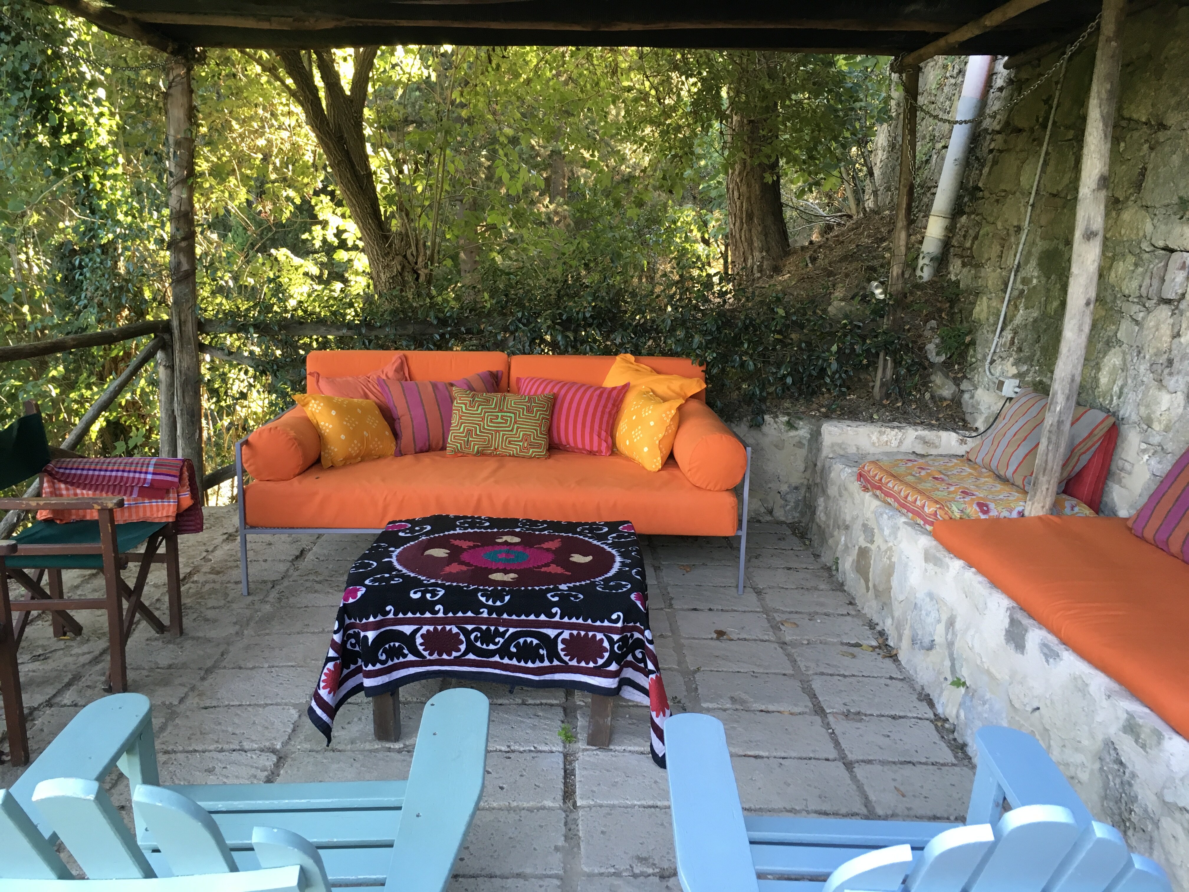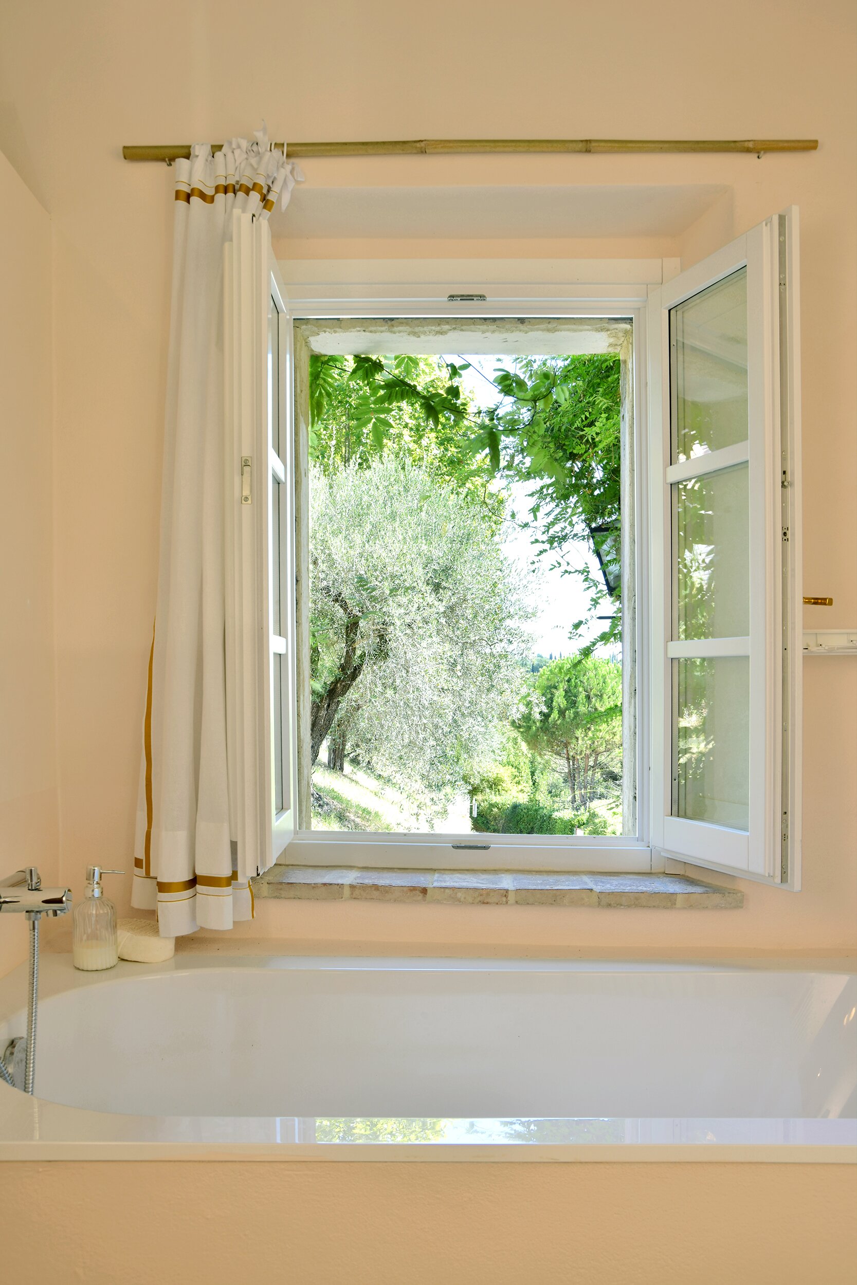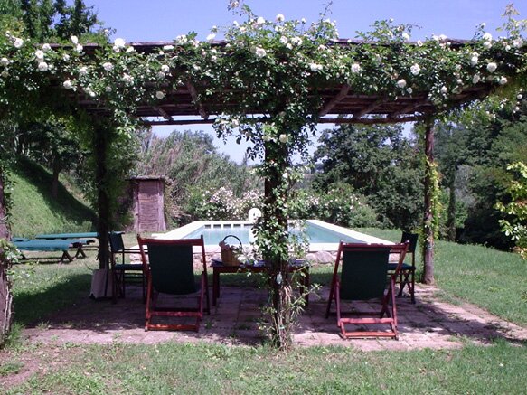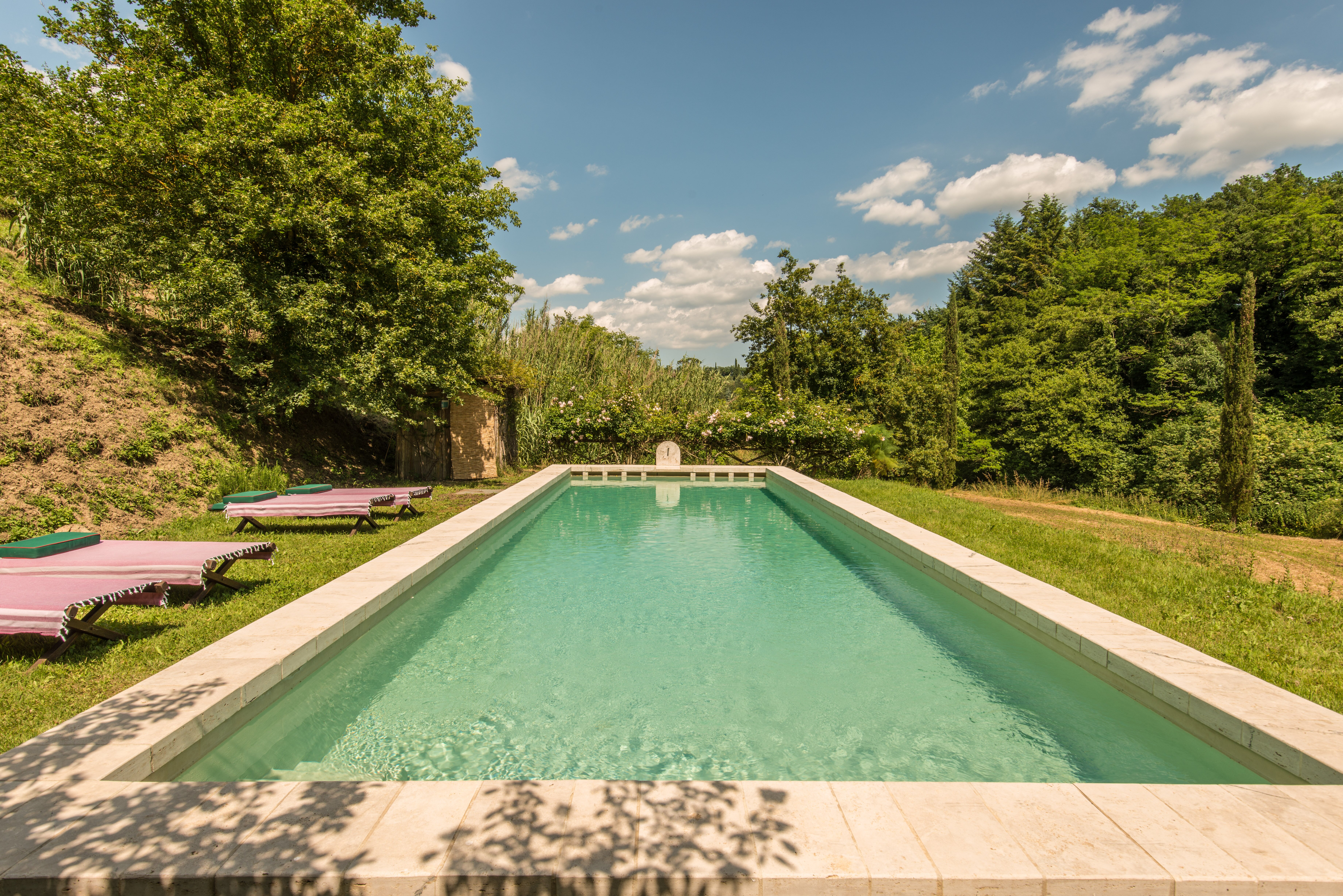 With gorgeous rural views, which get better with each flight of stairs, La Torre looks down over grassy slopes and terraces, sprinkled with trees and forming a cushion of peaceful privacy. A long flight of stone steps lead down from the villa to a lovely pool and poolside pergola, set amid lawns and screened in greenery for a sense of seclusion. But in fact, the tower house is just five hundred metres from shops and trattoria in Cetona’s cobbled streets, its vine-shaded terrace furnished for al fresco dining, with the medieval Citta della Pieve framed in an enchanting backdrop. From the terrace, doors lead in to a country kitchen and delightful living room, designed with arty rusticity and bright with kilims, cushions and pictures. The Tower is on 4 levels, and there is one spacious bedroom on each of the floors above, all furnished with a touch of romance and a few iconic pieces for the design connoisseurs. The villa has been recently renovated with the help of two architects adding new elegant bathrooms, closet space, a library room, a new entrance and a stone staircase. Ideal for a group of friends or for families with older children, La Torre could be booked together with an adjacent property, La Torretta, to accommodate additional guests in a fully self-contained villa for two.