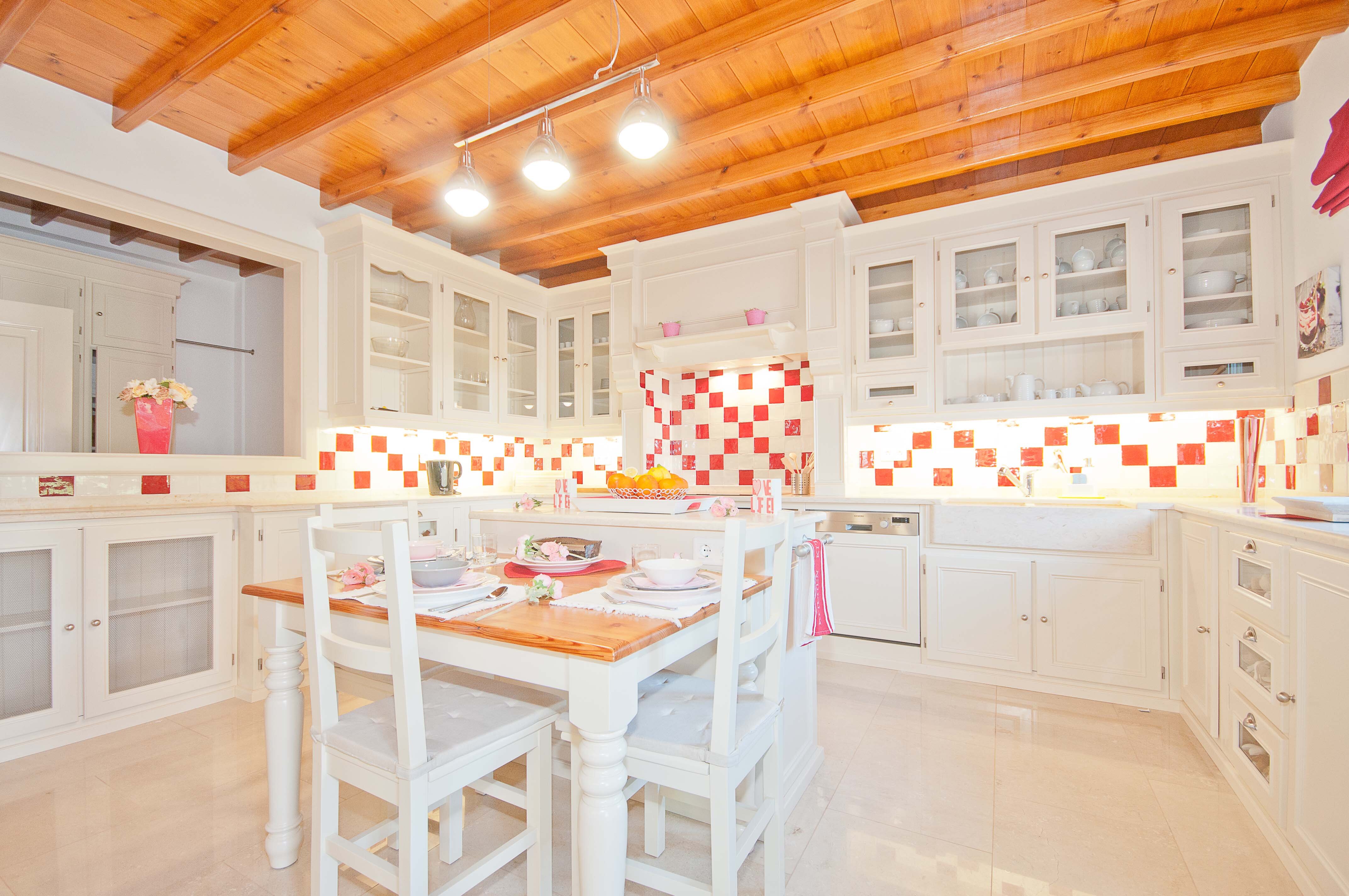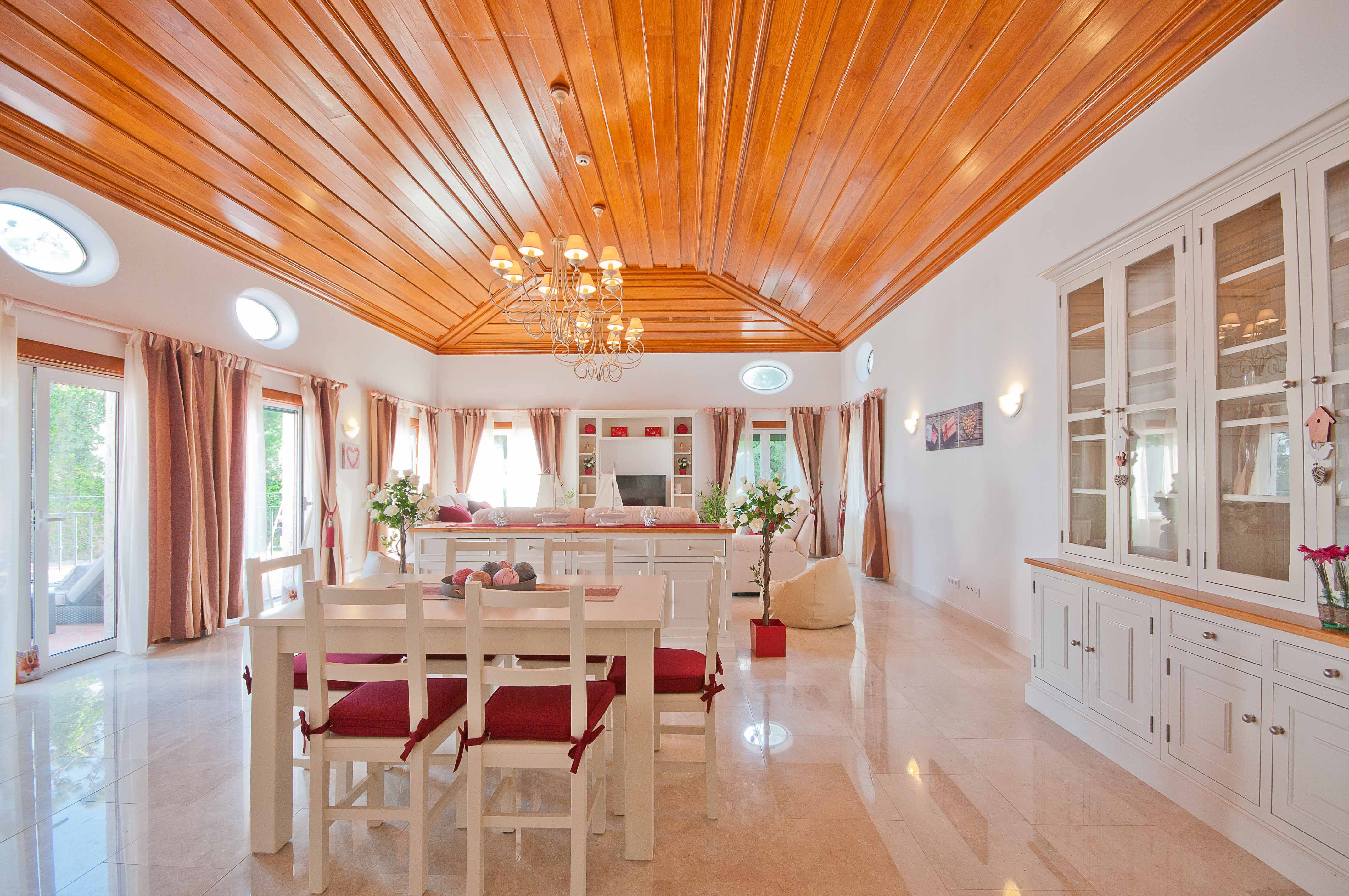 Topped by multi-level rooves, smartly painted in bold blue and white, and encompassing generous terraces framed by broad arches, Magnolia presents an imposing exterior, and the villa’s interiors are no less impressive. Polished floors and decorative timber ceilings frame brilliant white décor, highlighted with bright red fabrics, in a series of spacious and airy rooms, all well equipped for comfort. With air conditioning throughout, there are two bedrooms on the upper floor and three at ground level, each with en suite bath or shower room; while free-flowing social space includes an attractive breakfast kitchen, leading through archways to the large and lovely living/dining room, which has double doors to a part-shaded terrace, furnished with sofas and a dining suite.