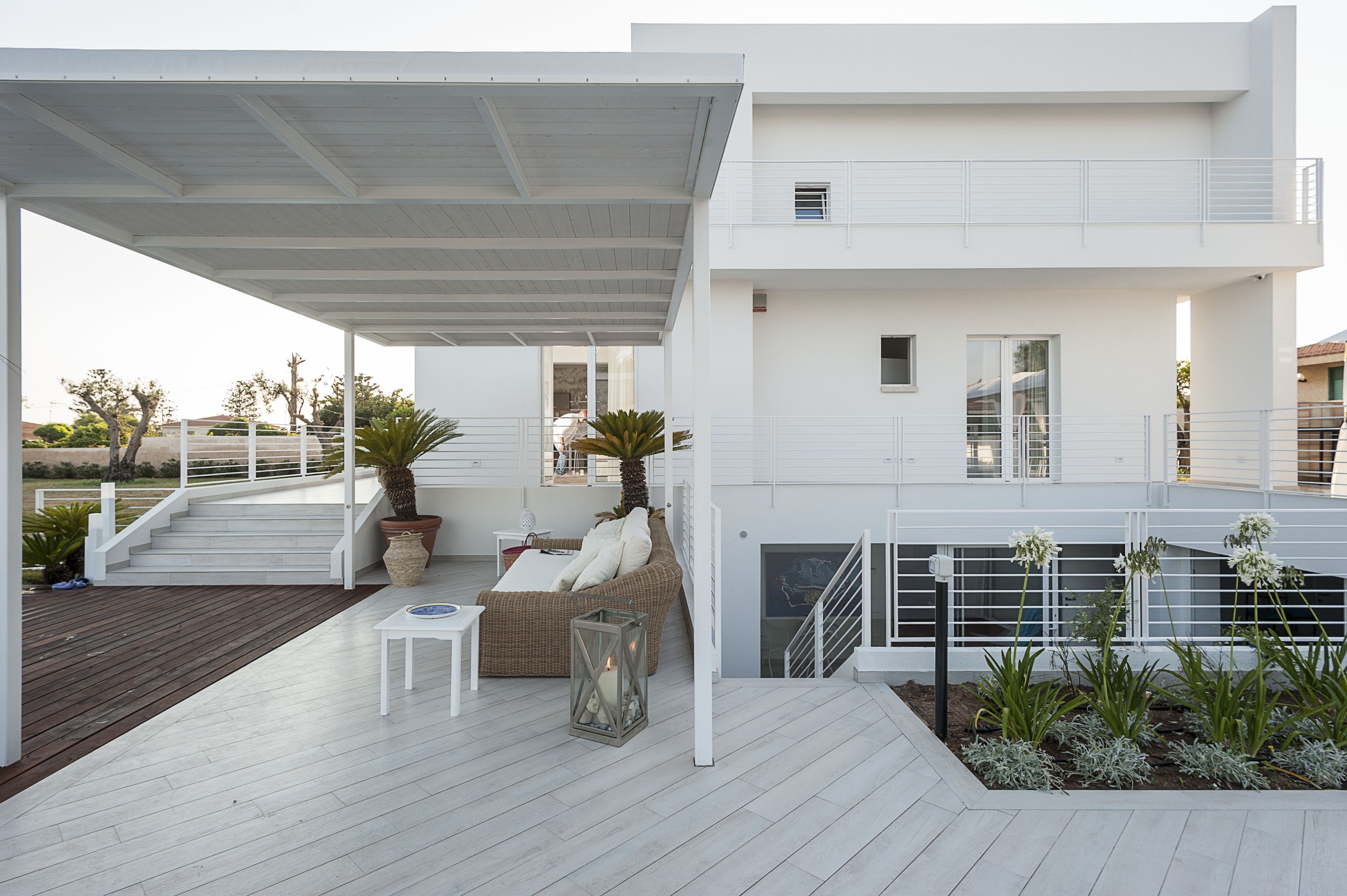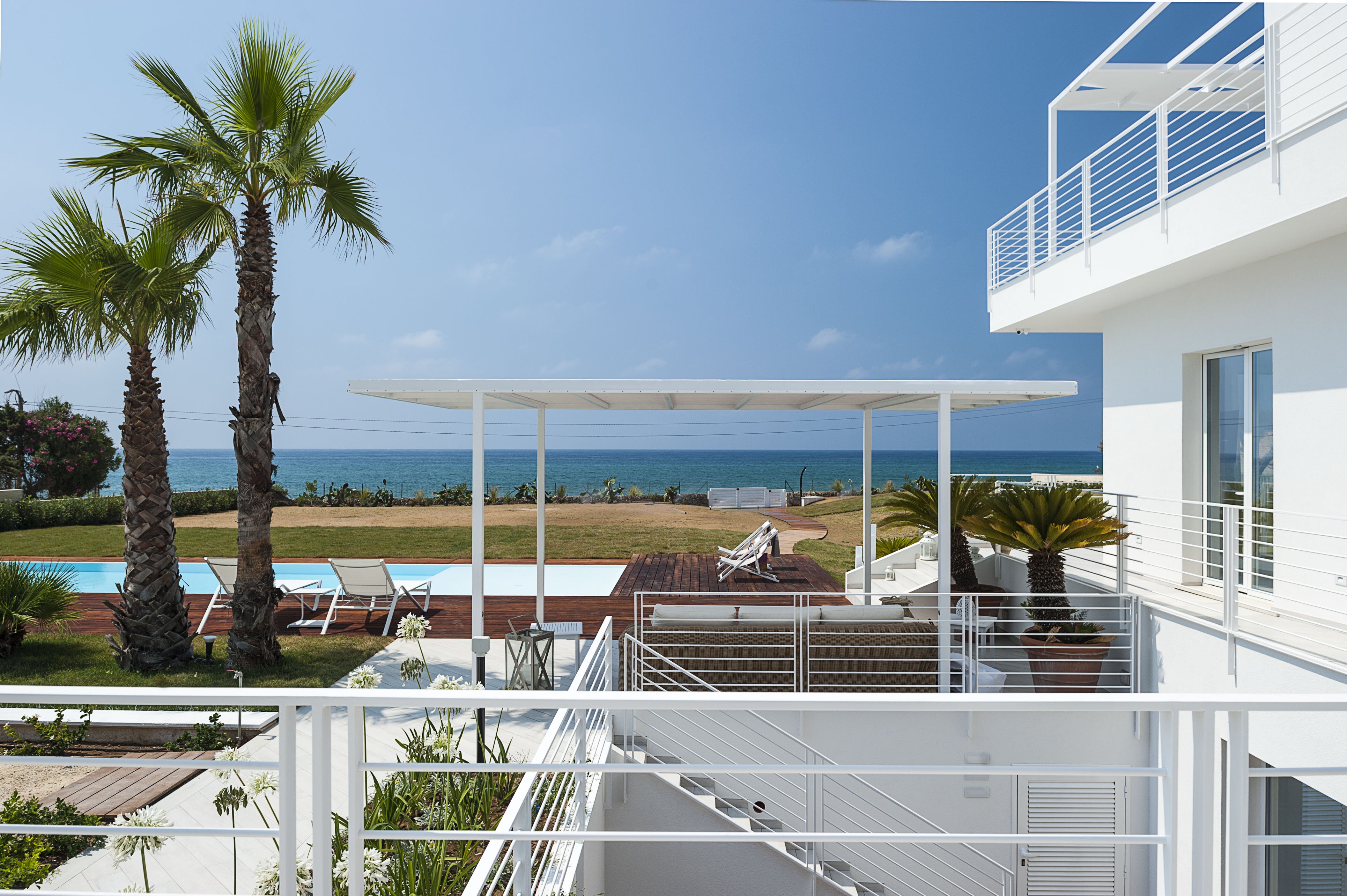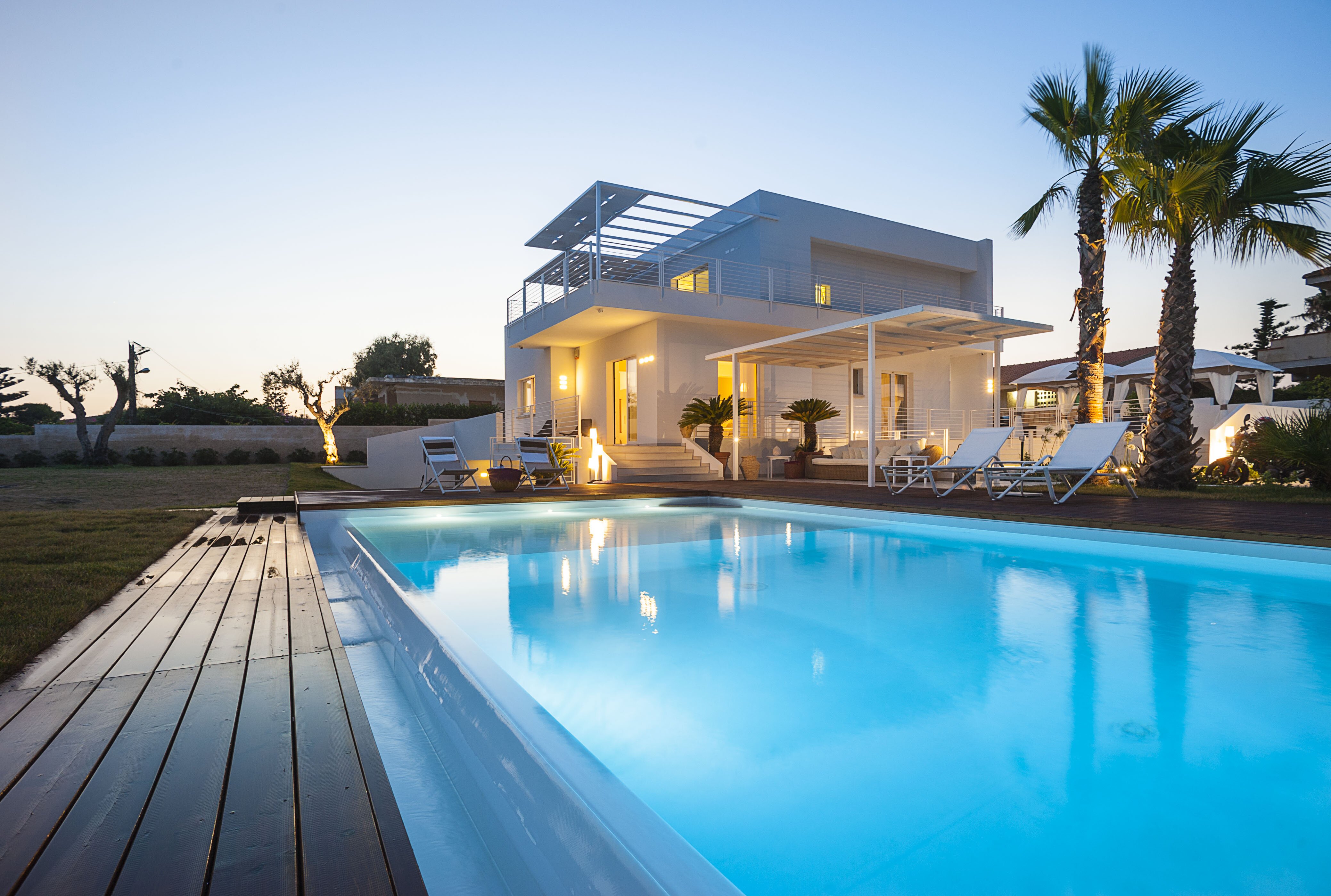 Set in south facing gardens of approximately half an acre just above the sea, Mare nel Blu is set in a residential area just west of the centre of the sea side resort of Marina di Modica. This large villa decorated in contemporary coastal style boasts extensive panoramic terraces at the front and rear of the property, by the pool and on the first floor to enjoy the sweeping sea views. The layout of the villa is suited to couples or two families travelling with a double and twin bedroom both on the ground and the lower ground floor and a master double bedroom with space for a cot in the adjacent sitting room on the top floor. All bedrooms are of a good size with excellent en suite facilities and the bedrooms and sitting area on the lower floor are very light. The gardens including a viewing platform set into the lawns near the sea for enjoying drinks at dusk.