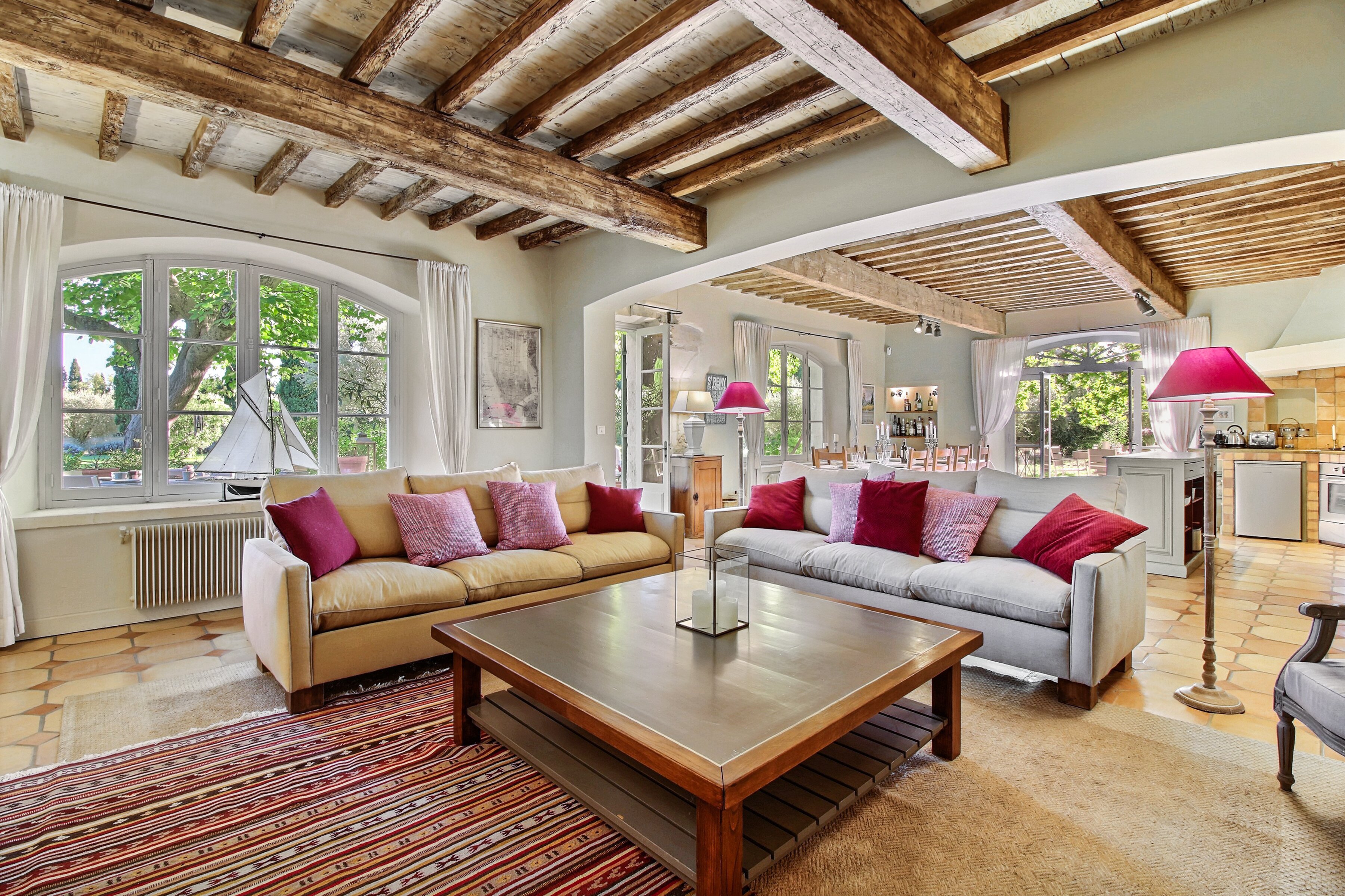 Brimming with comfort and character, this sturdy stone house nestles in gardens shaded with broad-leaf trees and studded with slim cypresses. Much loved and minimally manicured, the villa’s grounds include large lawns, a sunny orchard and olive grove, and pretty furnished patios for wining and dining, sprinkled with flower-filled plant pots. There’s table tennis in the shade and a vast fenced play area with den and swings. Herb hem a generous heatable swimming pool, served by a pool house with shower, fridge and al fresco dining area. Step inside and the house itself exudes an air of easy conviviality, with a huge open plan living room with dining and kitchen area serving the outside dining area with the large main kitchen accessed off this space. The library, an ideal home office space and the TV room also open to the south facing terraces. Set in two wings, an ideal layout for two families, the pretty and very comfortable south facing bedrooms are styled with charming elegance. The beautiful master bedroom is double aspect – some bedrooms have Juliet balconies on to the garden, another is set under the roof rafters.