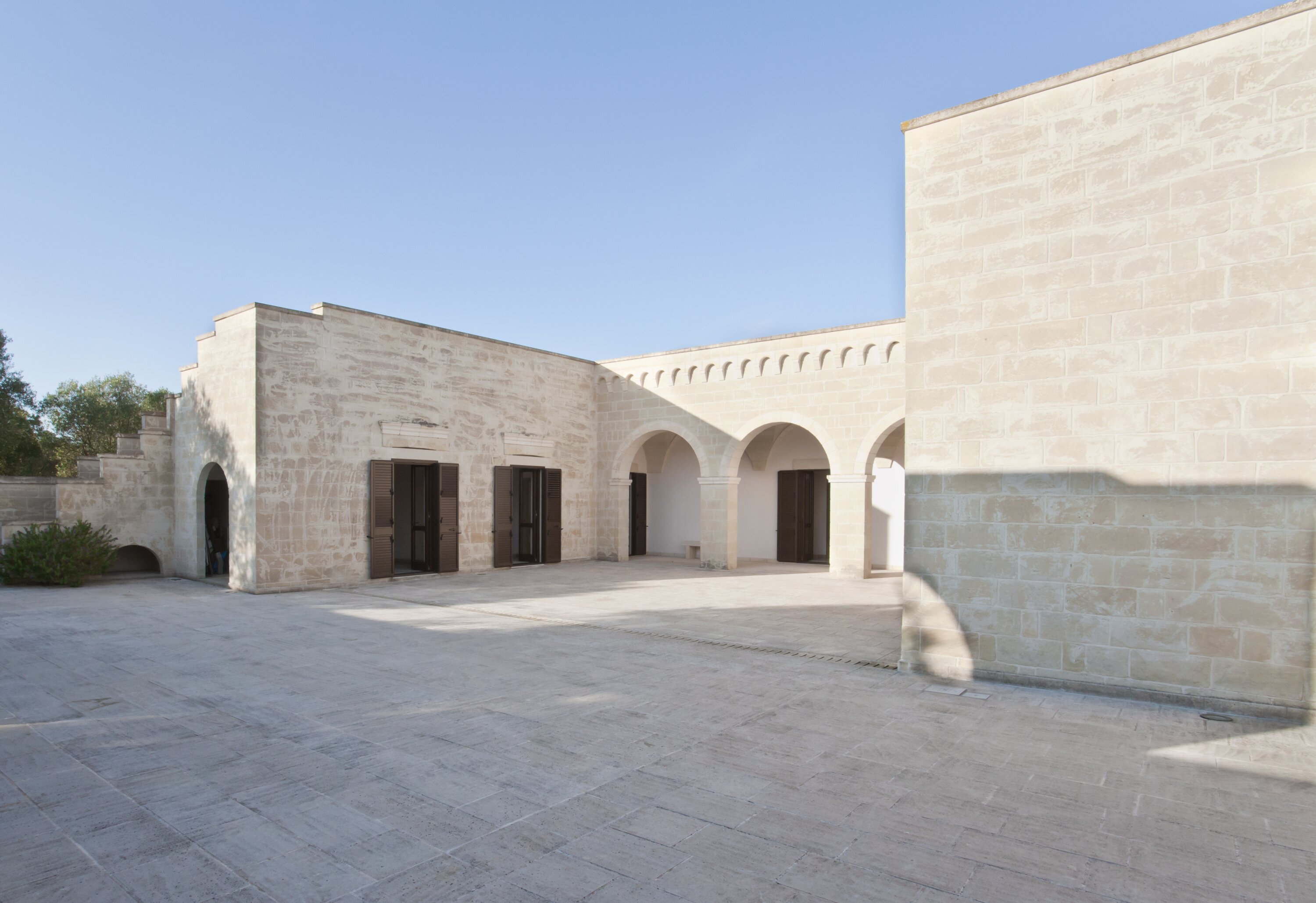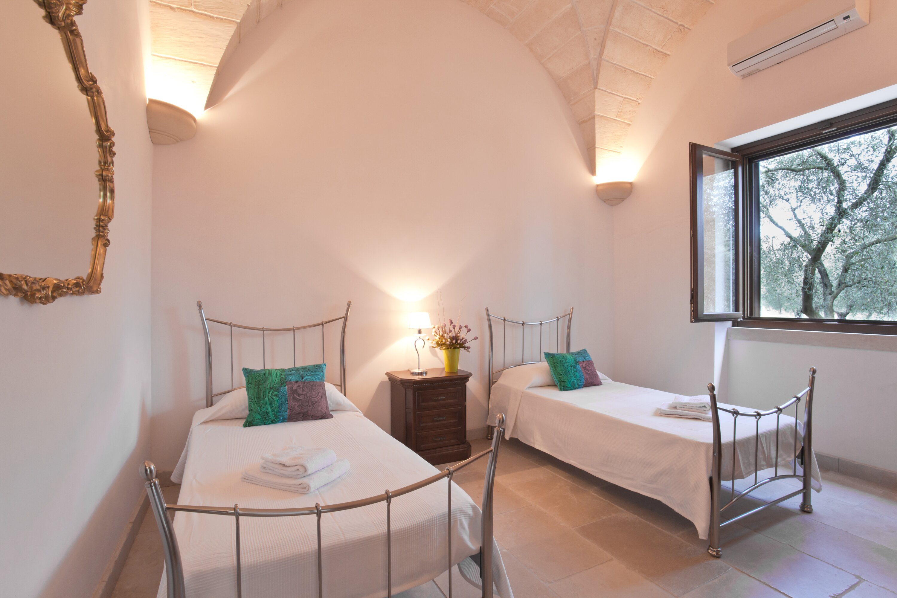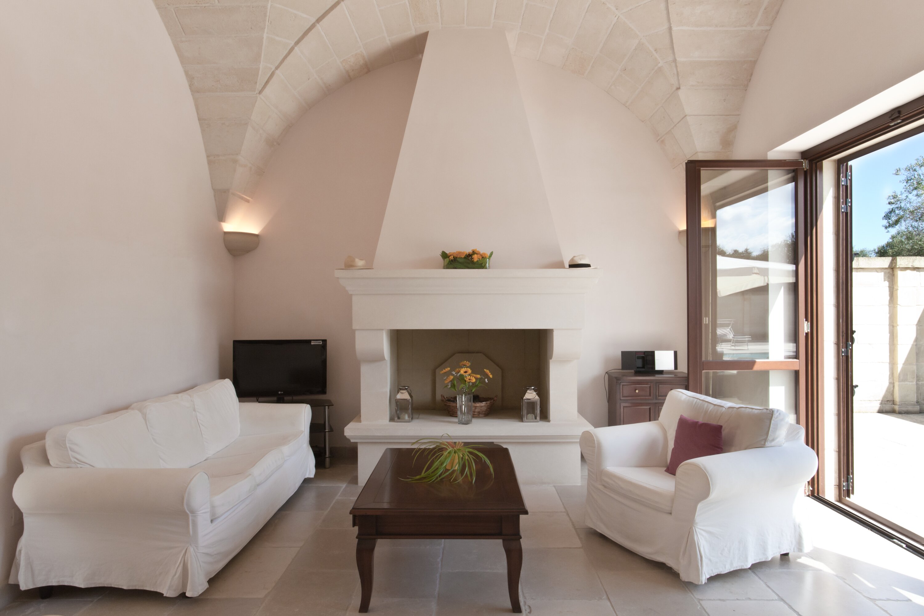 With contemporary décor, pale stone walls, marble floors and gloriously vaulted ceilings, this gorgeous house is quietly secluded in private rural acres, and exudes an air of cool, calm relaxation. A cloistered courtyard at the front of the villa has an almost Moorish feel, with gentle lighting for balmy evenings, highlighting the Masseria’s graceful architecture. A larger courtyard, to the rear, is home to an unusually large swimming pool, with parasol shade for a poolside seating area, and a pergola furnished for al fresco dining. French doors lead in from here to the living area, where an airy sitting room, all in creamy white, is open-plan to the dining kitchen, its sleek styling softened by country fabrics. And, in a layout which would offer extra privacy for two families, the bedrooms are accessed from the cloister, two in the central section, two in the side wing, and all air-conditioned, elegant and uncluttered. The living room is also air-conditioned. Surrounding the villa, its own olive groves are perfect for a stroll through the gnarled and ancient trees.