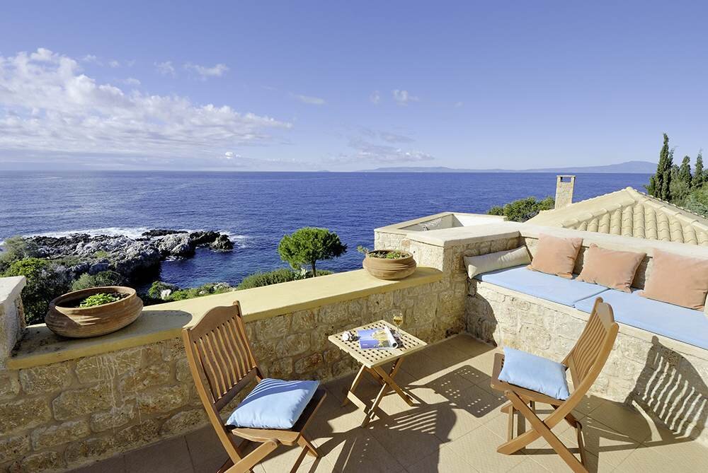There’s a sense of mellow serenity in the spacious interiors of this stylish villa, perhaps due to the background sound of the sea splashing on the rocks below, or the attractive use of natural materials which has earned the house a place in distinguished design magazines, or just because it has been planned and styled according to the principles of Feng Shui. Probably all three play their part, complemented by comfortable furnishings, uncluttered earth-toned décor, and a delightful dining terrace, set just above a rock-framed six-seat hot tub, both with blissful views of the bay.An excellent choice for a family or group of friends, the villa’s three air-conditioned bedrooms each have en suite bath or shower room, the ground floor room offering the flexibility of double or twin use, while the upper floor double opens on to a lovely furnished balcony. With rock bathing just below, the villa is within easy strolling distance of Stoupa’s shops, bars and tavernas, and the sandy Stoupa beach.