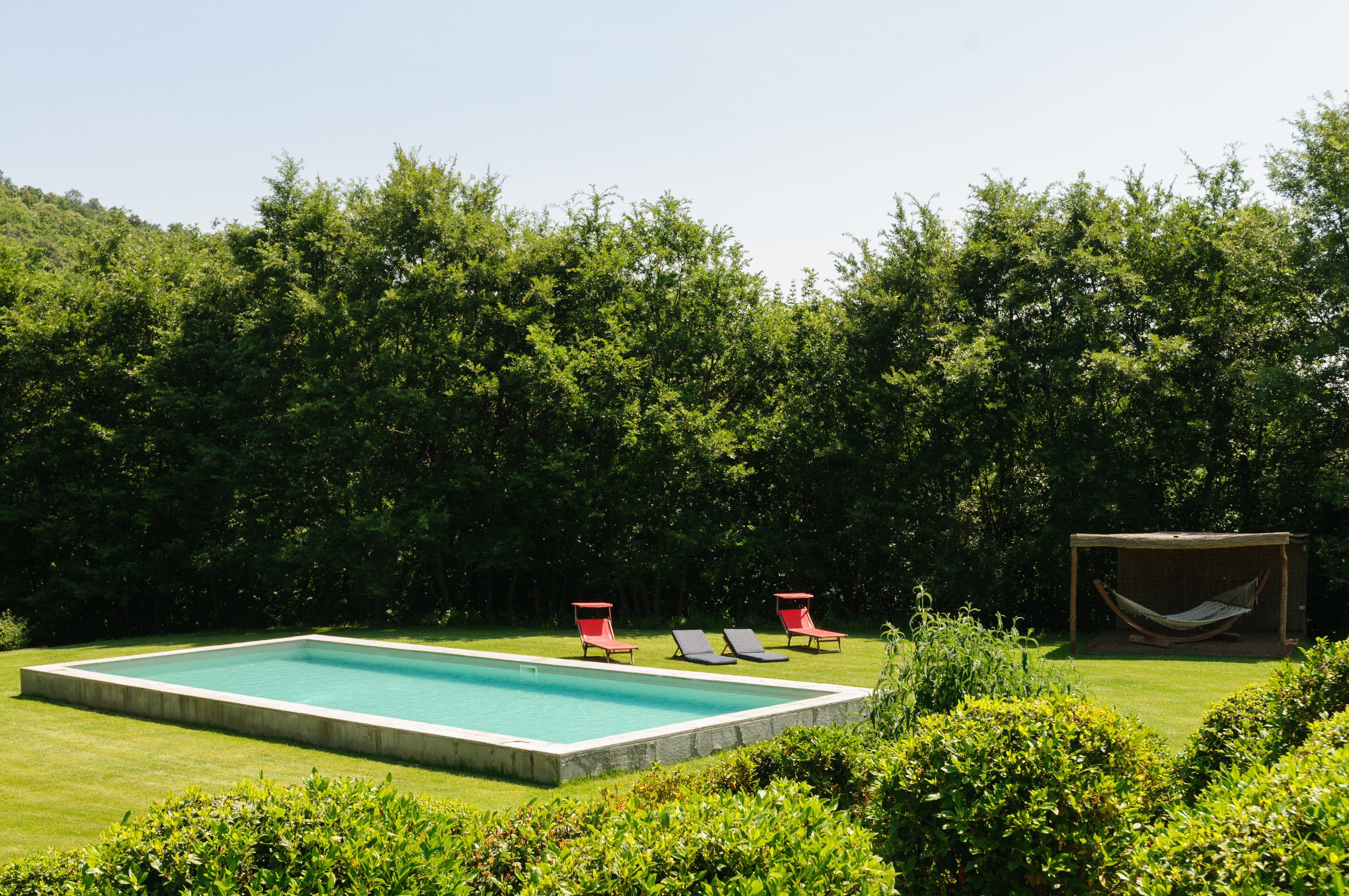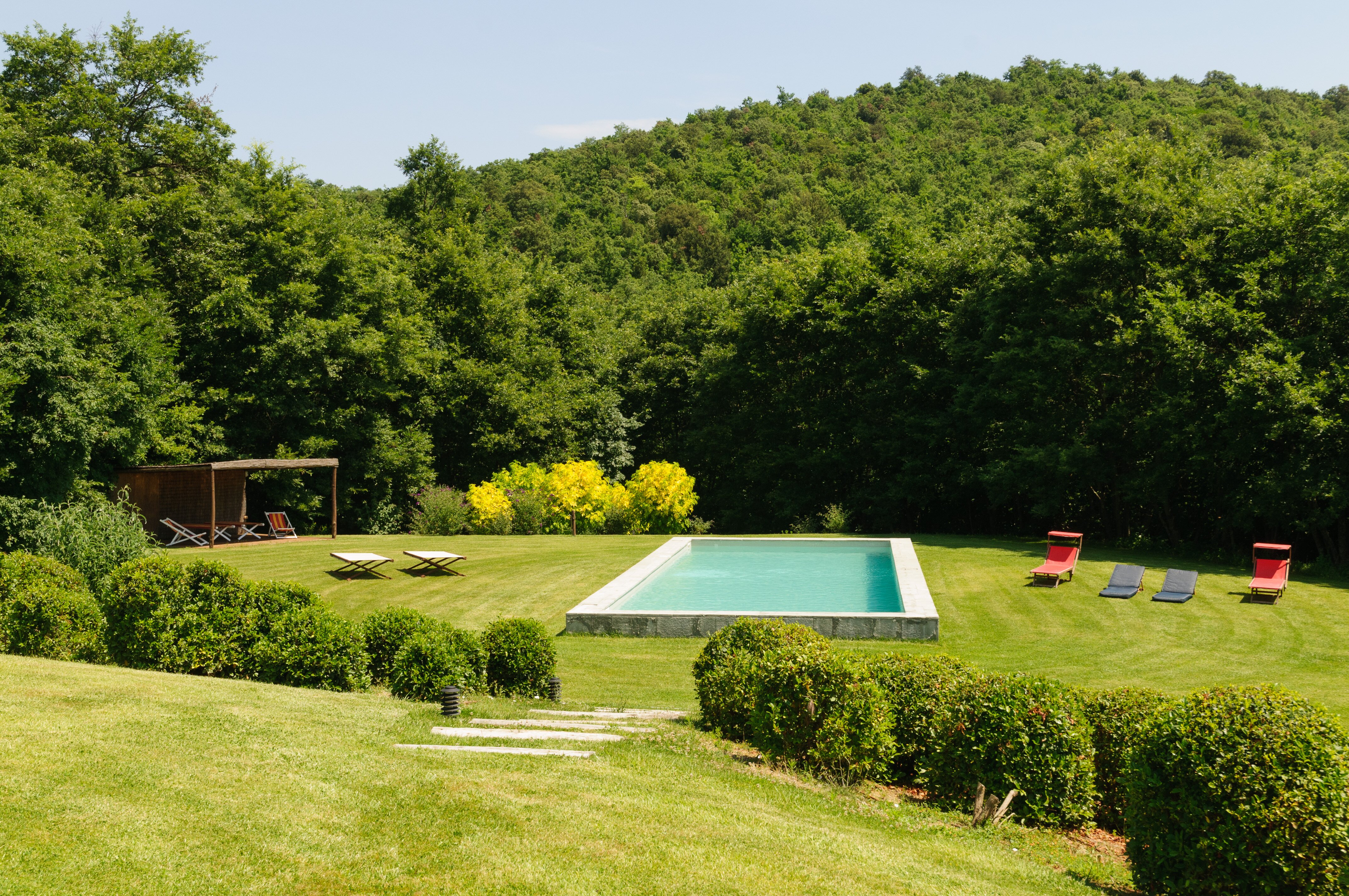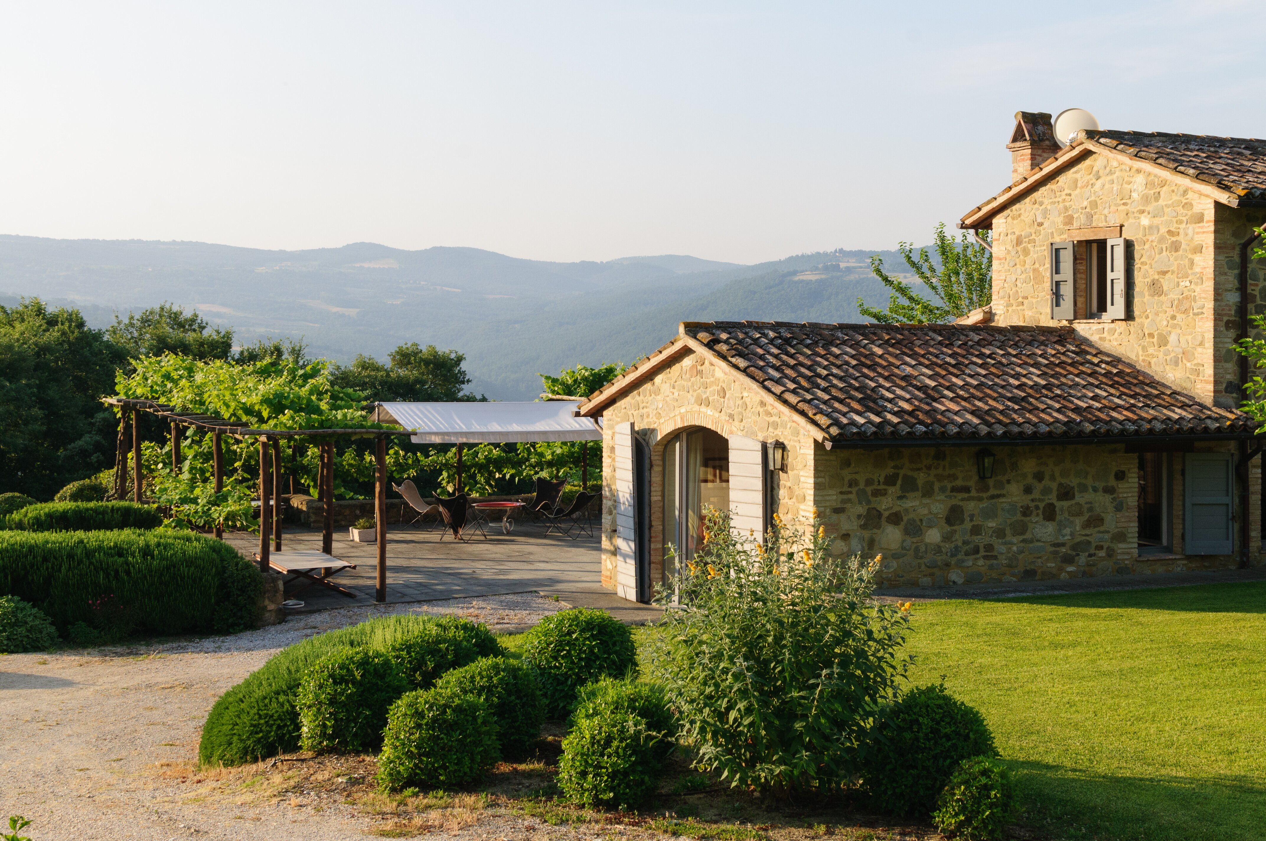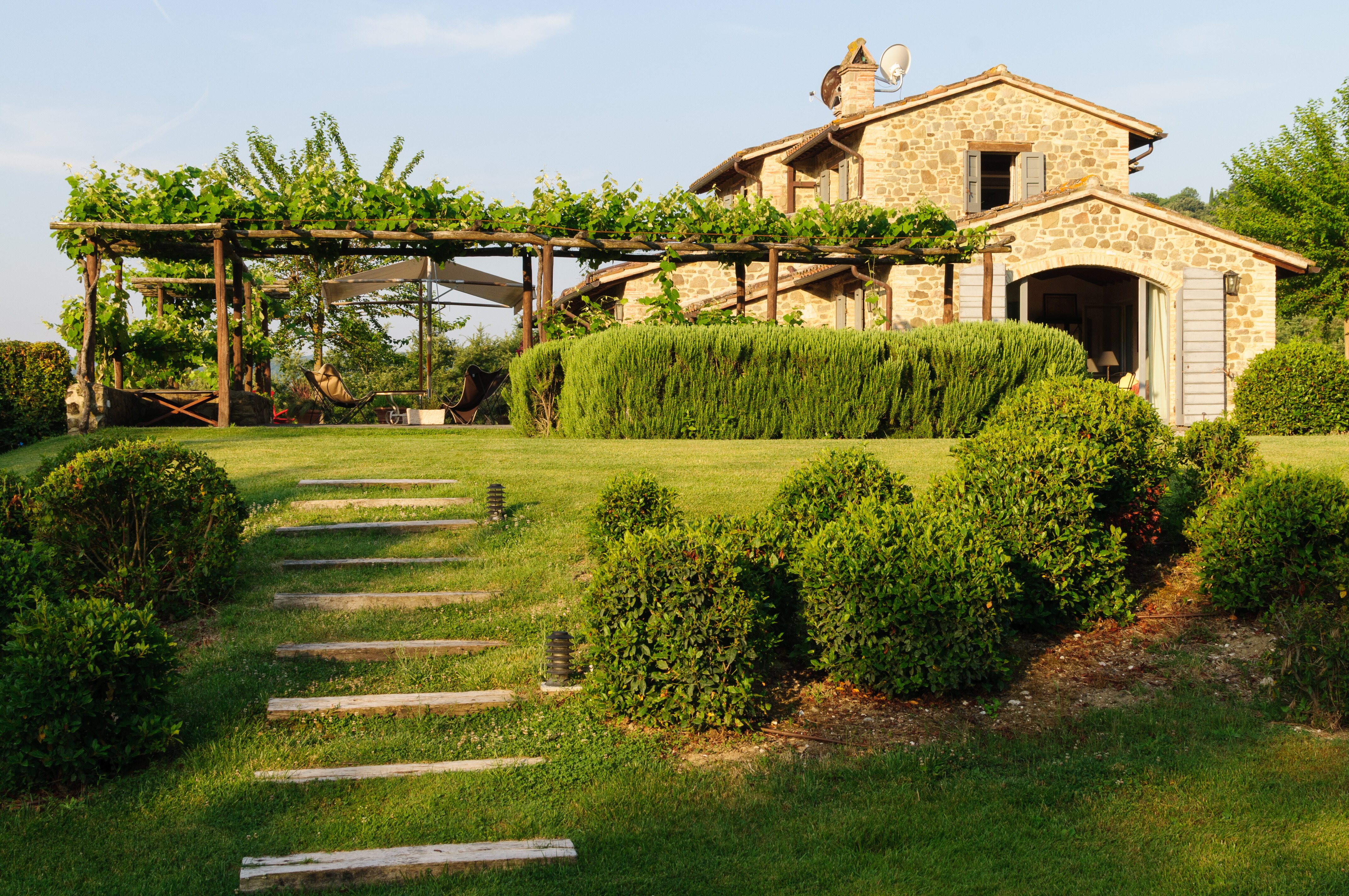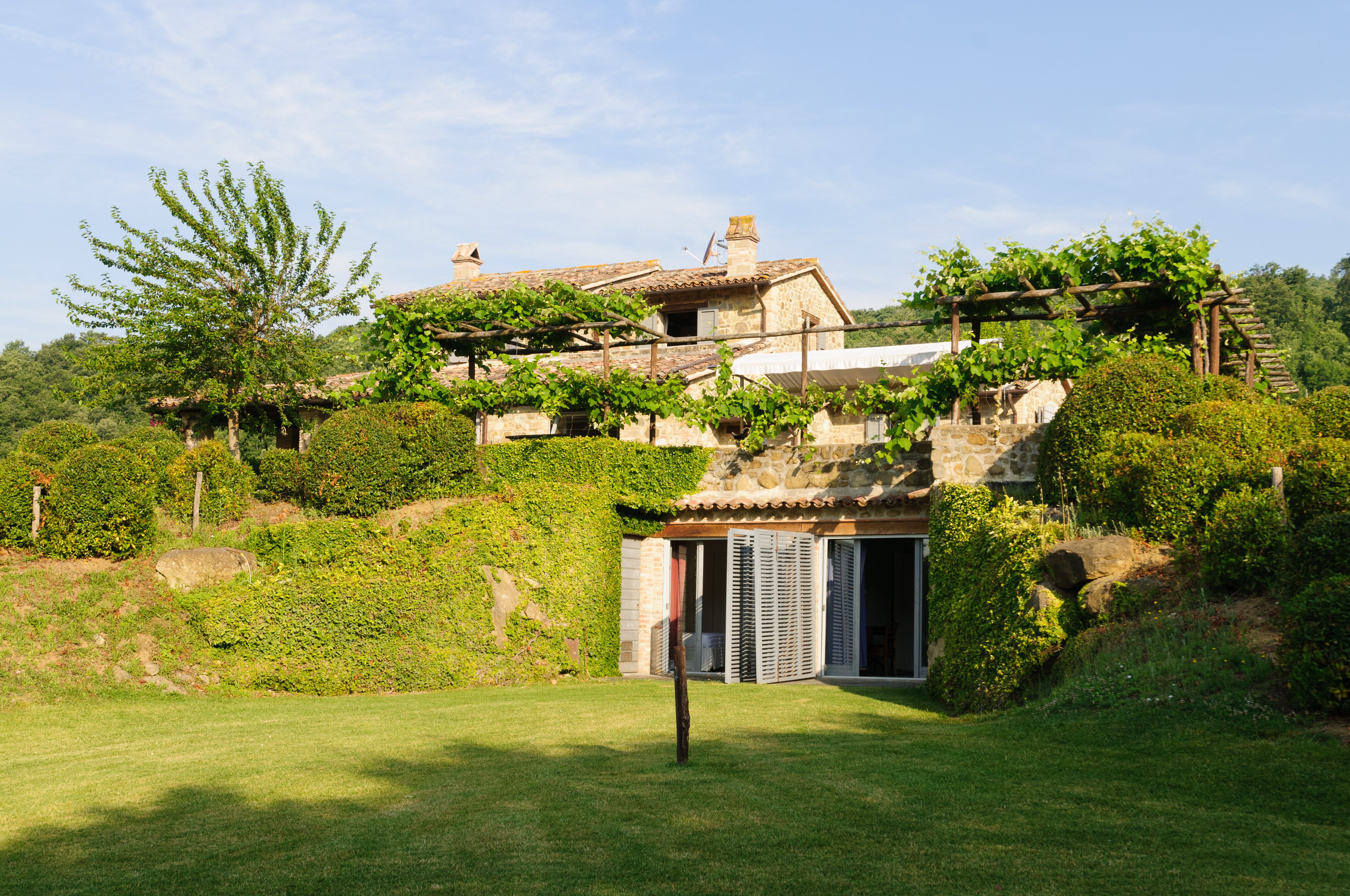 A perfect paradox of a house, this family villa is both stylish and informal, secluded yet close to the gorgeous town of Todi, and quite grown-up but with two hectares of grounds for children to run around. Furnished throughout with effortless elegance, the traditional stone walls and exposed roof rafters blend well with the fresh feel of the villa’s gently contemporary décor. Occupying the ground floor are two sitting rooms, one in cool creamy white and the other more casually dressed with cosy colours and floor cushions; and an ultra-modern kitchen and adjacent dining area, where cook service could be an added indulgence. These open out to a big covered terrace, forming al fresco living areas and looking out to the amazing views. Individually styled, and in a layout that may suit two families, two bedrooms share a bathroom on the first floor, and there are three en suite rooms at the lower level. And just below the house, in very spacious lawns, the generously large swimming pool is joined by a gazebo. Medieval Todi’s shops and restaurants are just 9km from the villa, Perugia and Assisi are both within a 50km drive, and there is a little local shop just 3km away.