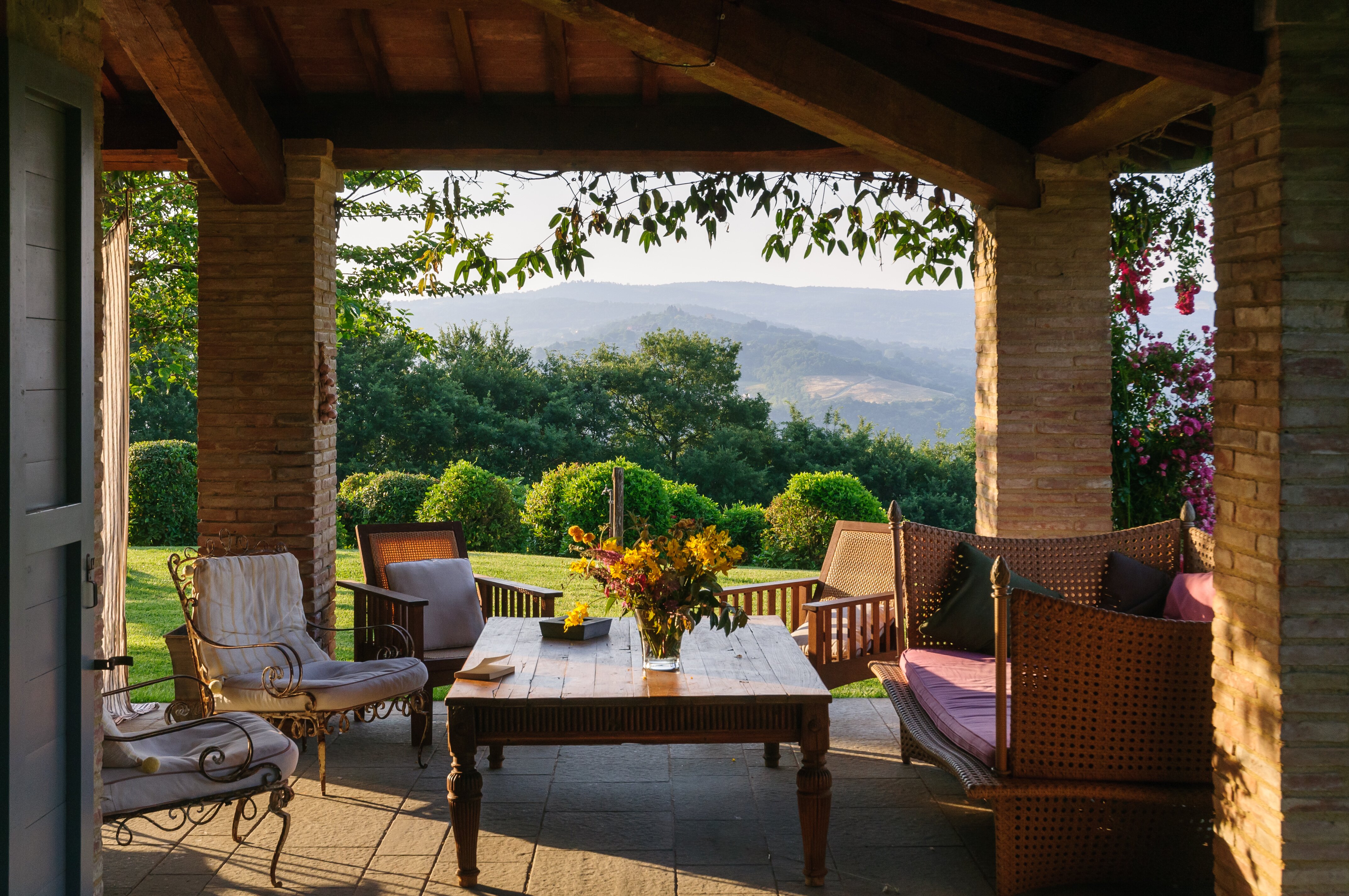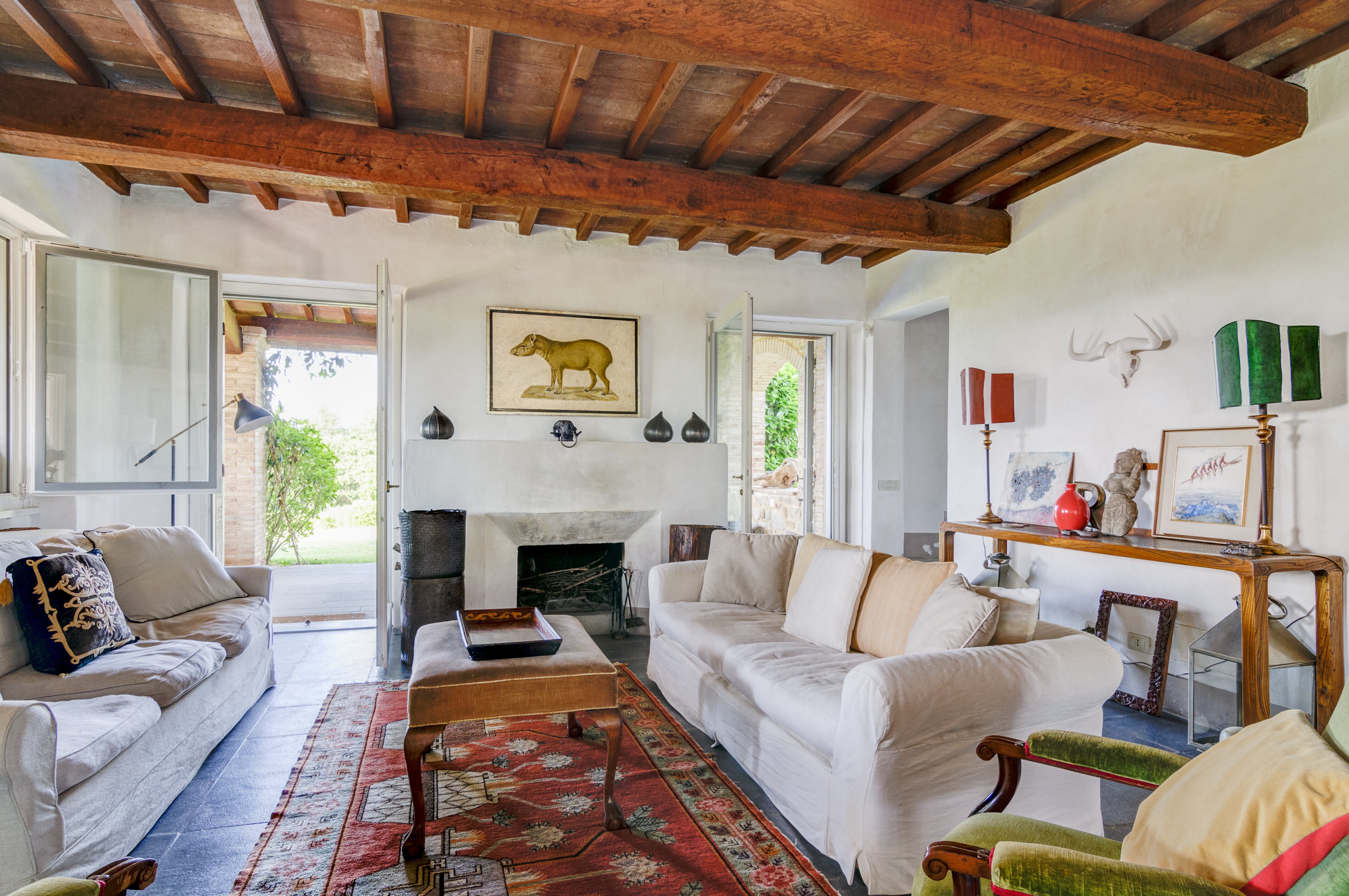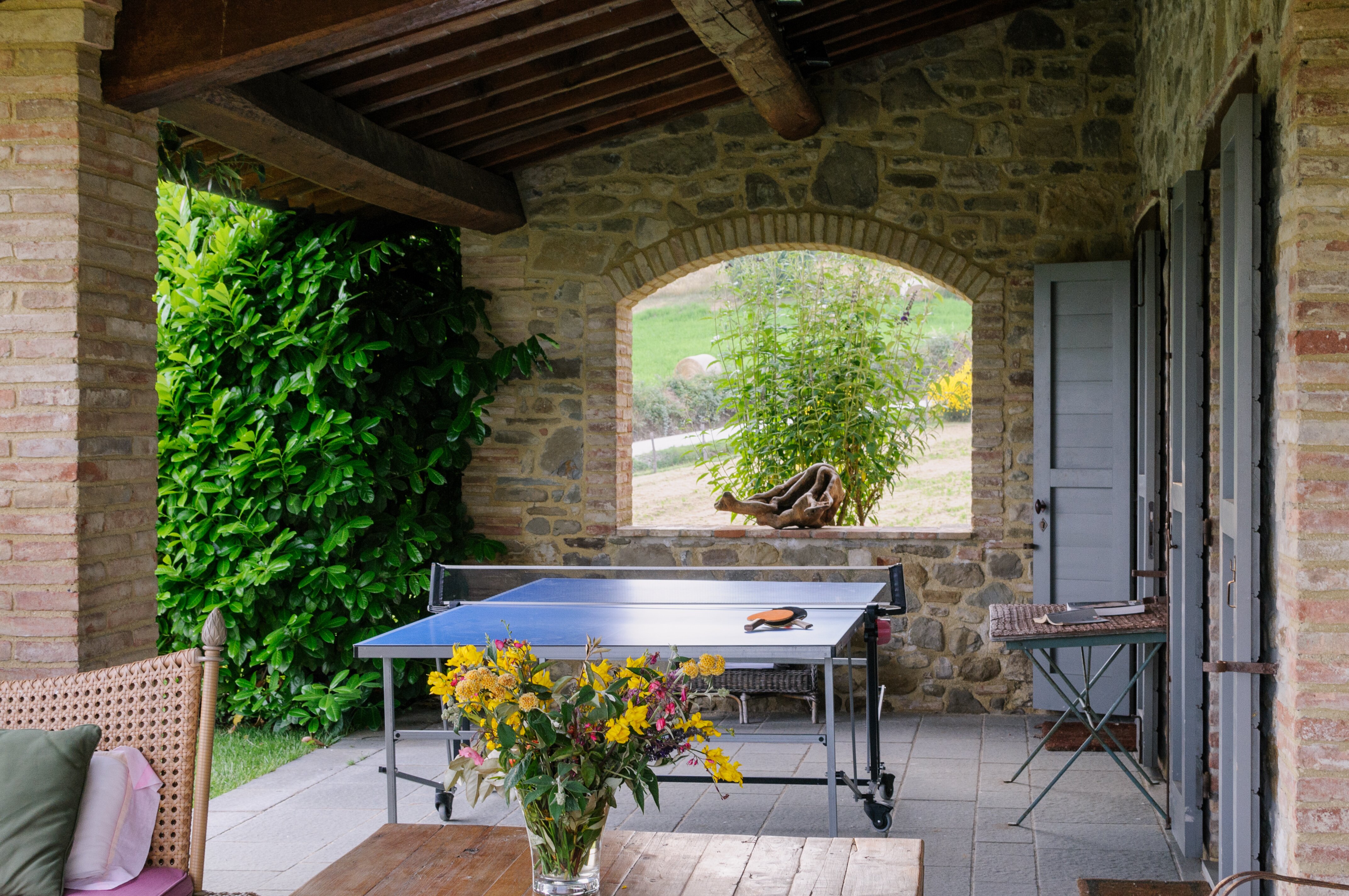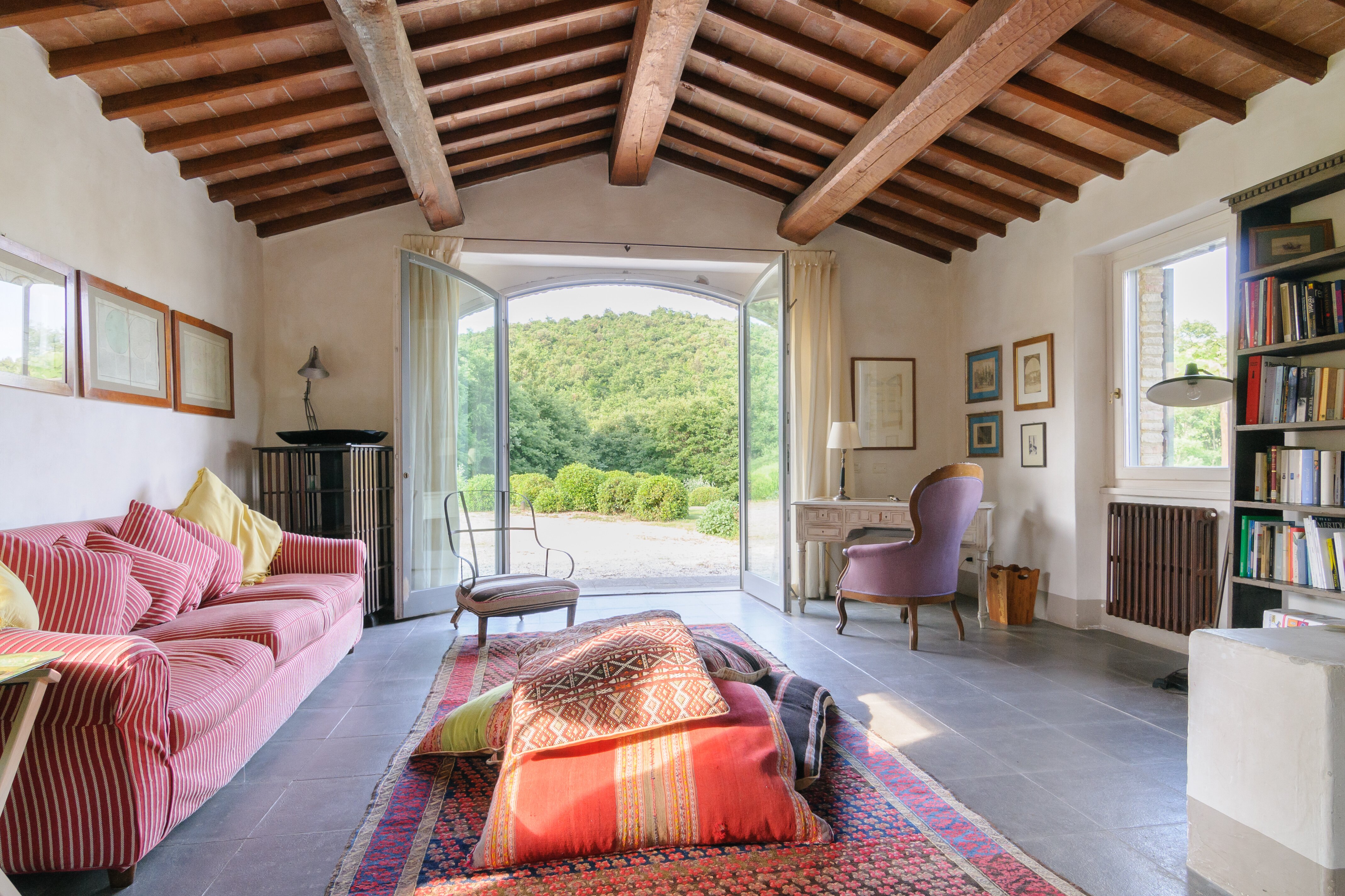 A perfect paradox of a house, this family villa is both stylish and informal, secluded yet close to the gorgeous town of Todi, and quite grown-up but with two hectares of grounds for children to run around. Furnished throughout with effortless elegance, the traditional stone walls and exposed roof rafters blend well with the fresh feel of the villa’s gently contemporary décor. Occupying the ground floor are two sitting rooms, one in cool creamy white and the other more casually dressed with cosy colours and floor cushions; and an ultra-modern kitchen and adjacent dining area, where cook service could be an added indulgence. These open out to a big covered terrace, forming al fresco living areas and looking out to the amazing views. Individually styled, and in a layout that may suit two families, two bedrooms share a bathroom on the first floor, and there are three en suite rooms at the lower level. And just below the house, in very spacious lawns, the generously large swimming pool is joined by a gazebo. Medieval Todi’s shops and restaurants are just 9km from the villa, Perugia and Assisi are both within a 50km drive, and there is a little local shop just 3km away.