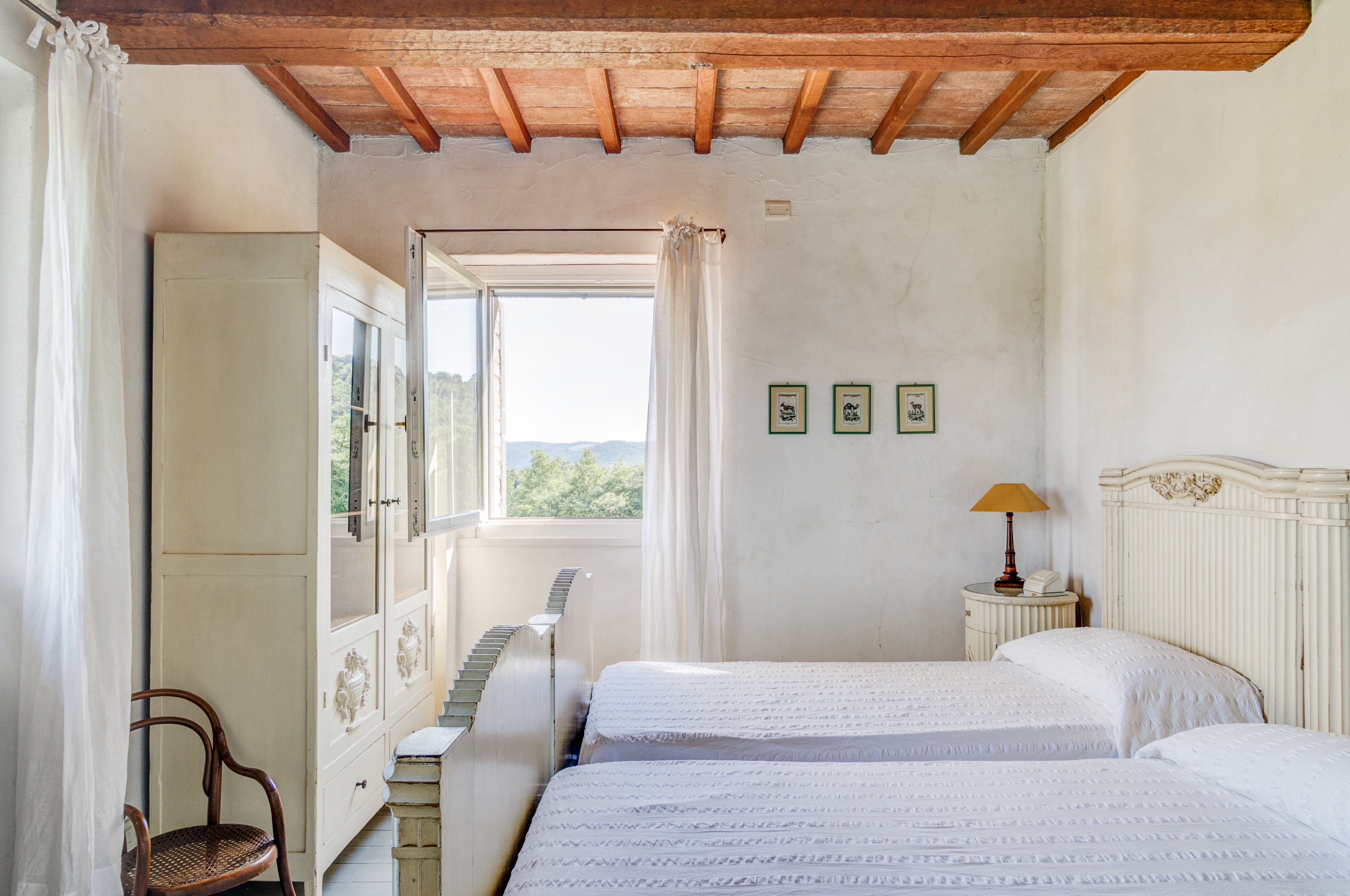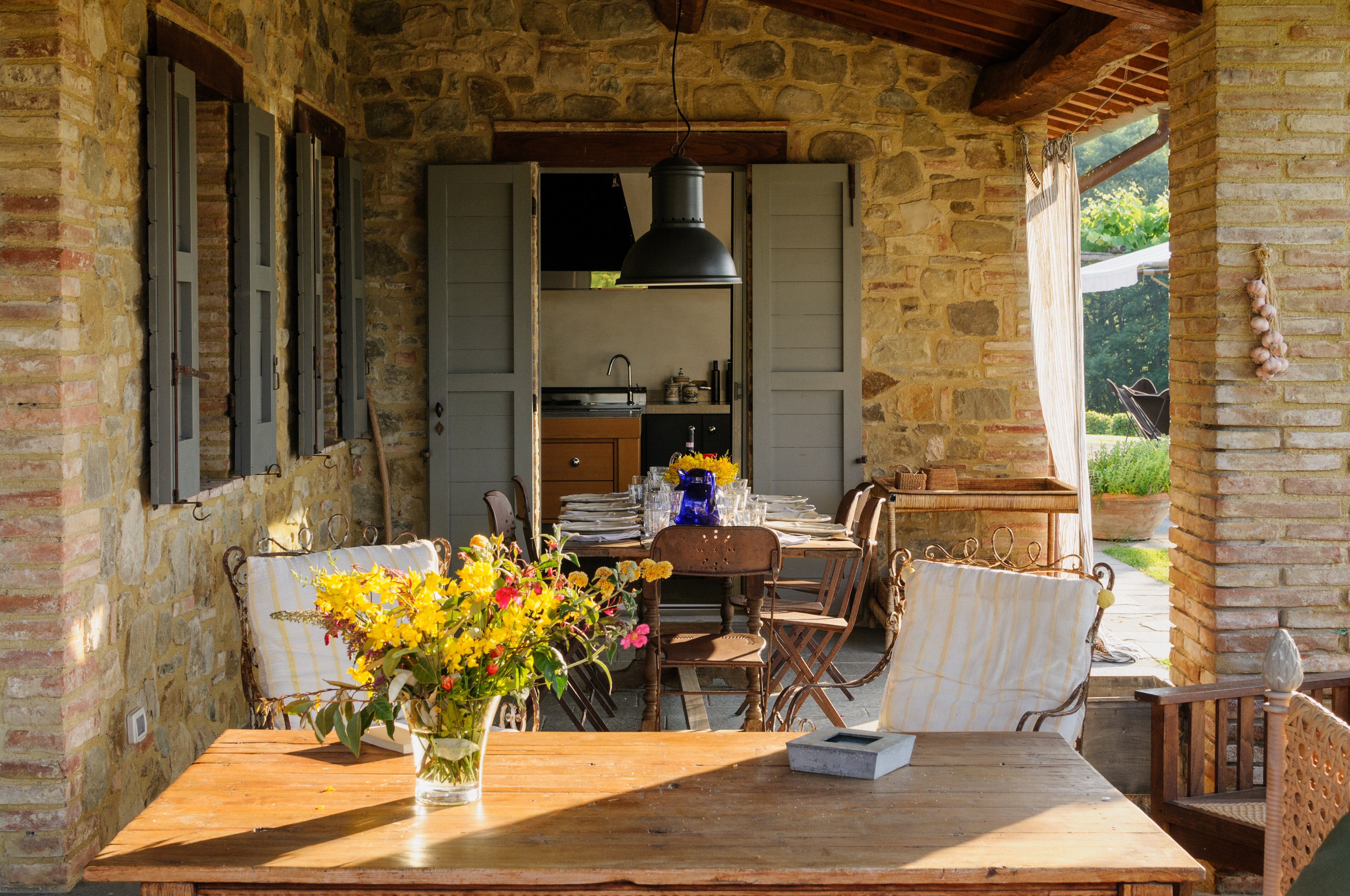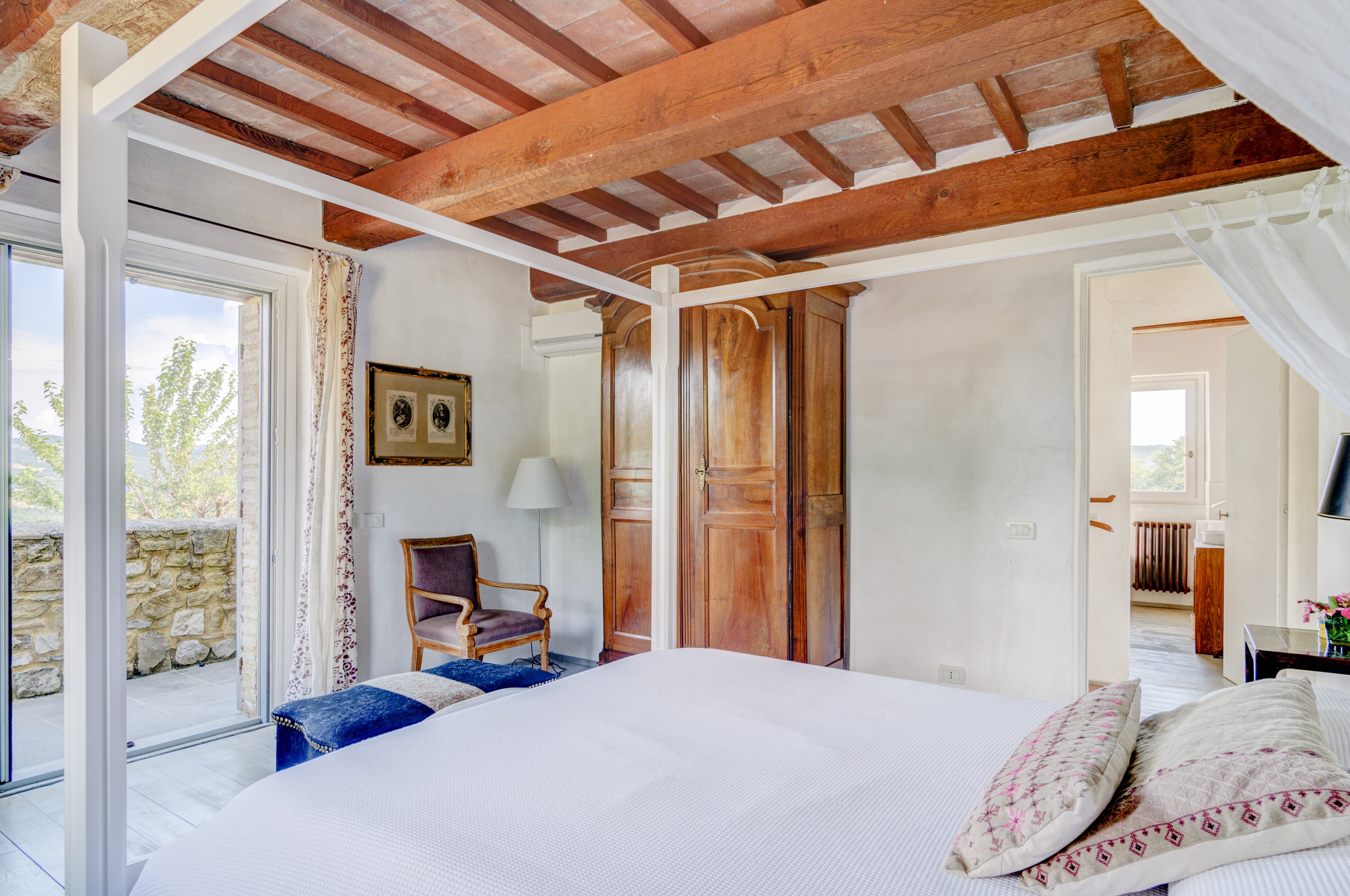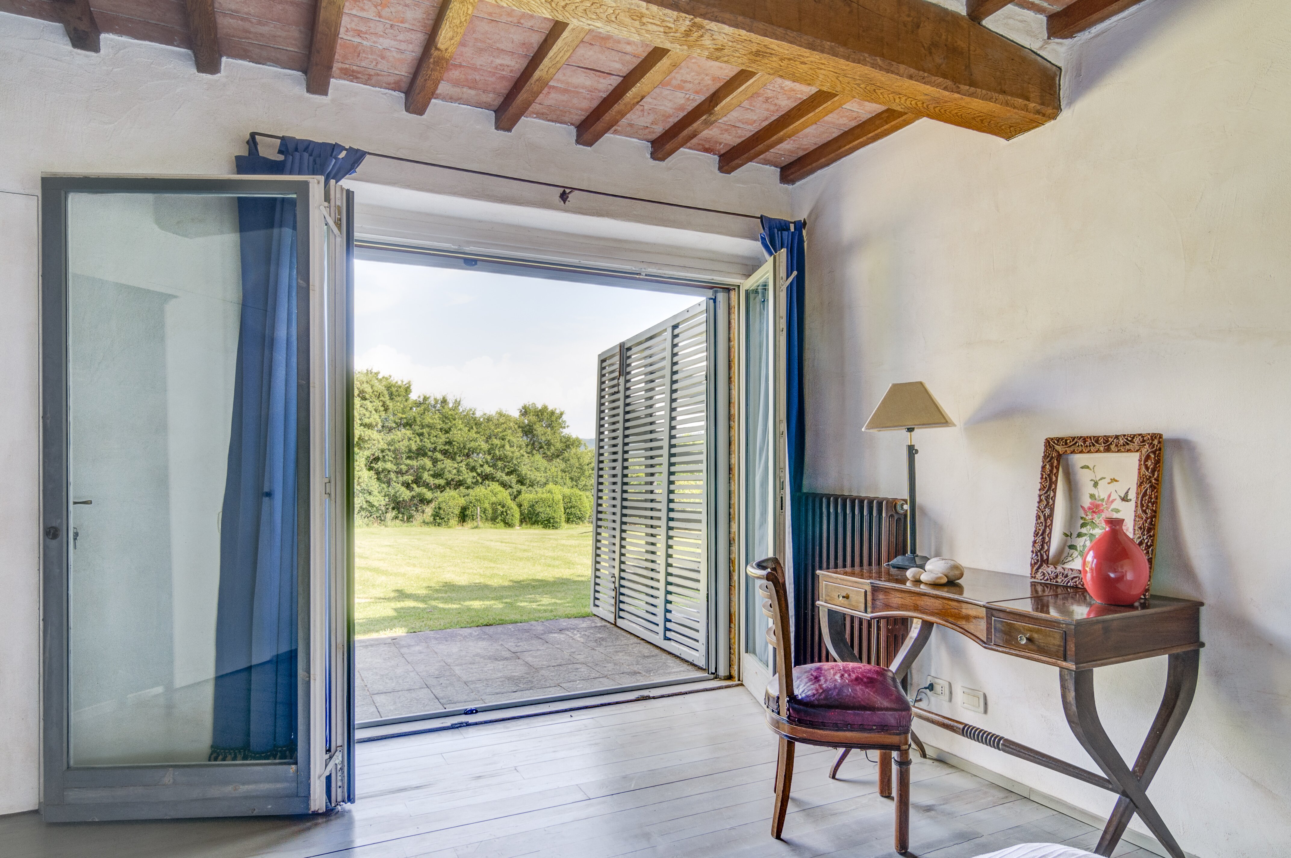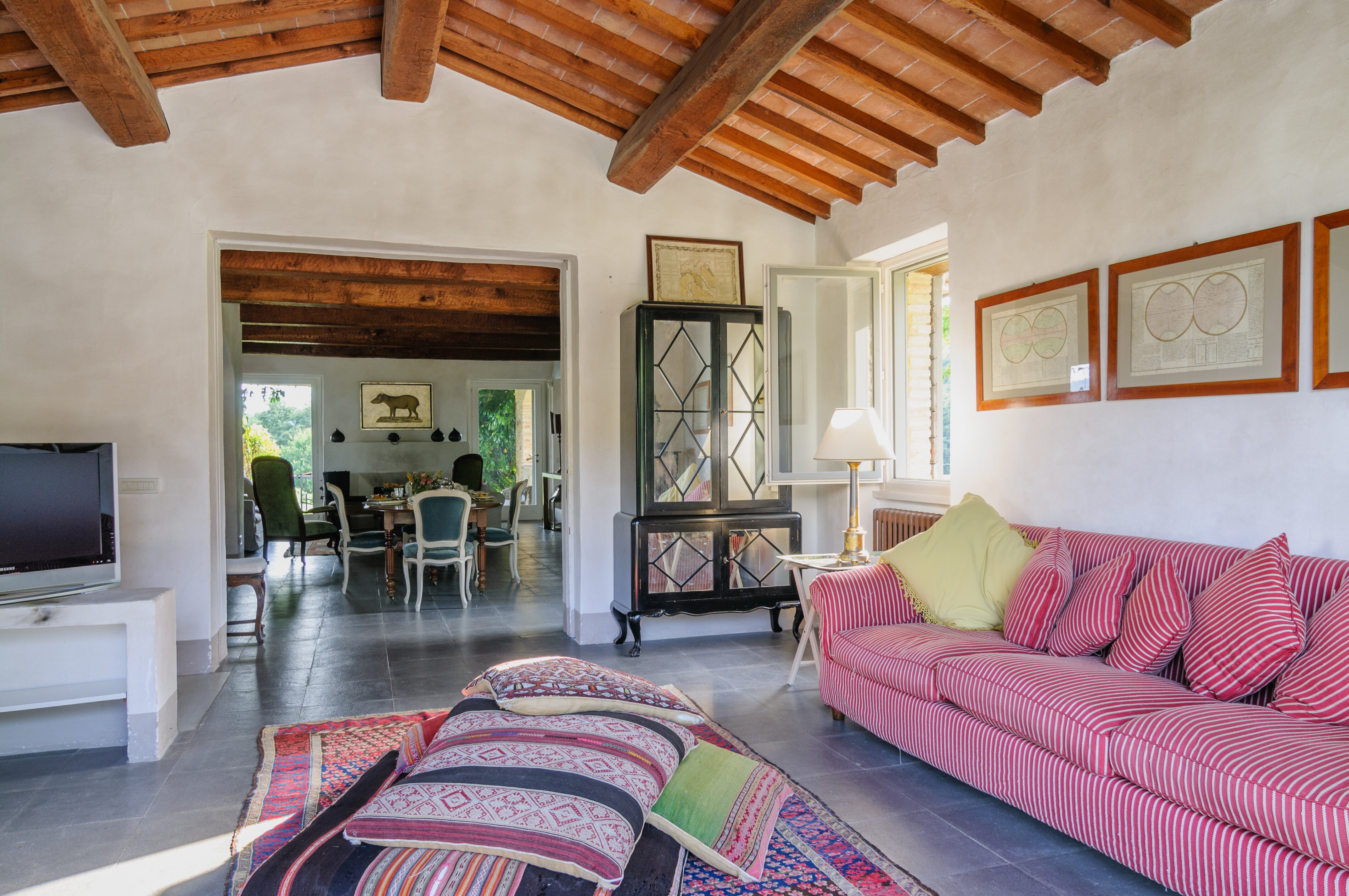 A perfect paradox of a house, this family villa is both stylish and informal, secluded yet close to the gorgeous town of Todi, and quite grown-up but with two hectares of grounds for children to run around. Furnished throughout with effortless elegance, the traditional stone walls and exposed roof rafters blend well with the fresh feel of the villa’s gently contemporary décor. Occupying the ground floor are two sitting rooms, one in cool creamy white and the other more casually dressed with cosy colours and floor cushions; and an ultra-modern kitchen and adjacent dining area, where cook service could be an added indulgence. These open out to a big covered terrace, forming al fresco living areas and looking out to the amazing views. Individually styled, and in a layout that may suit two families, two bedrooms share a bathroom on the first floor, and there are three en suite rooms at the lower level. And just below the house, in very spacious lawns, the generously large swimming pool is joined by a gazebo. Medieval Todi’s shops and restaurants are just 9km from the villa, Perugia and Assisi are both within a 50km drive, and there is a little local shop just 3km away.