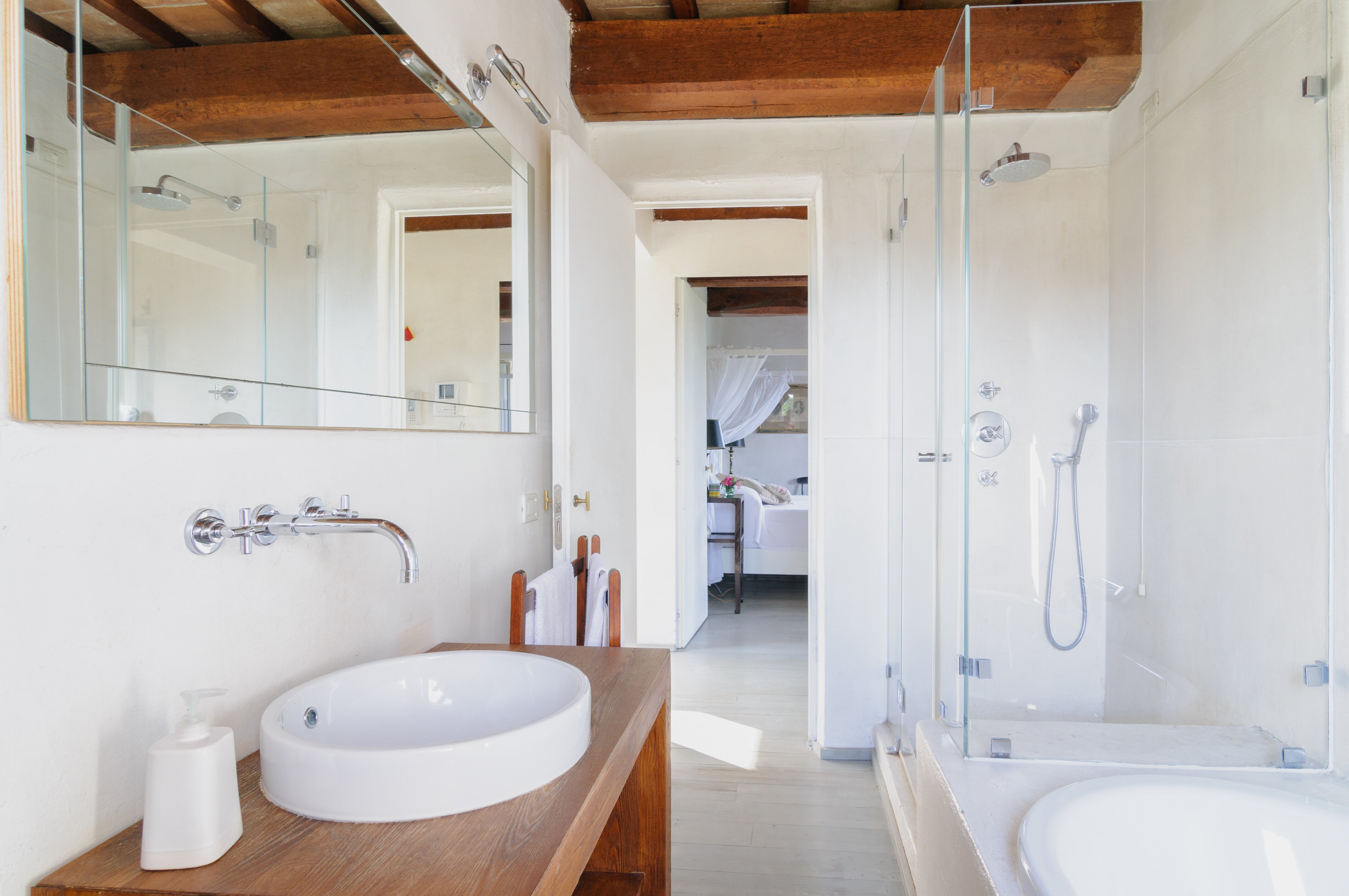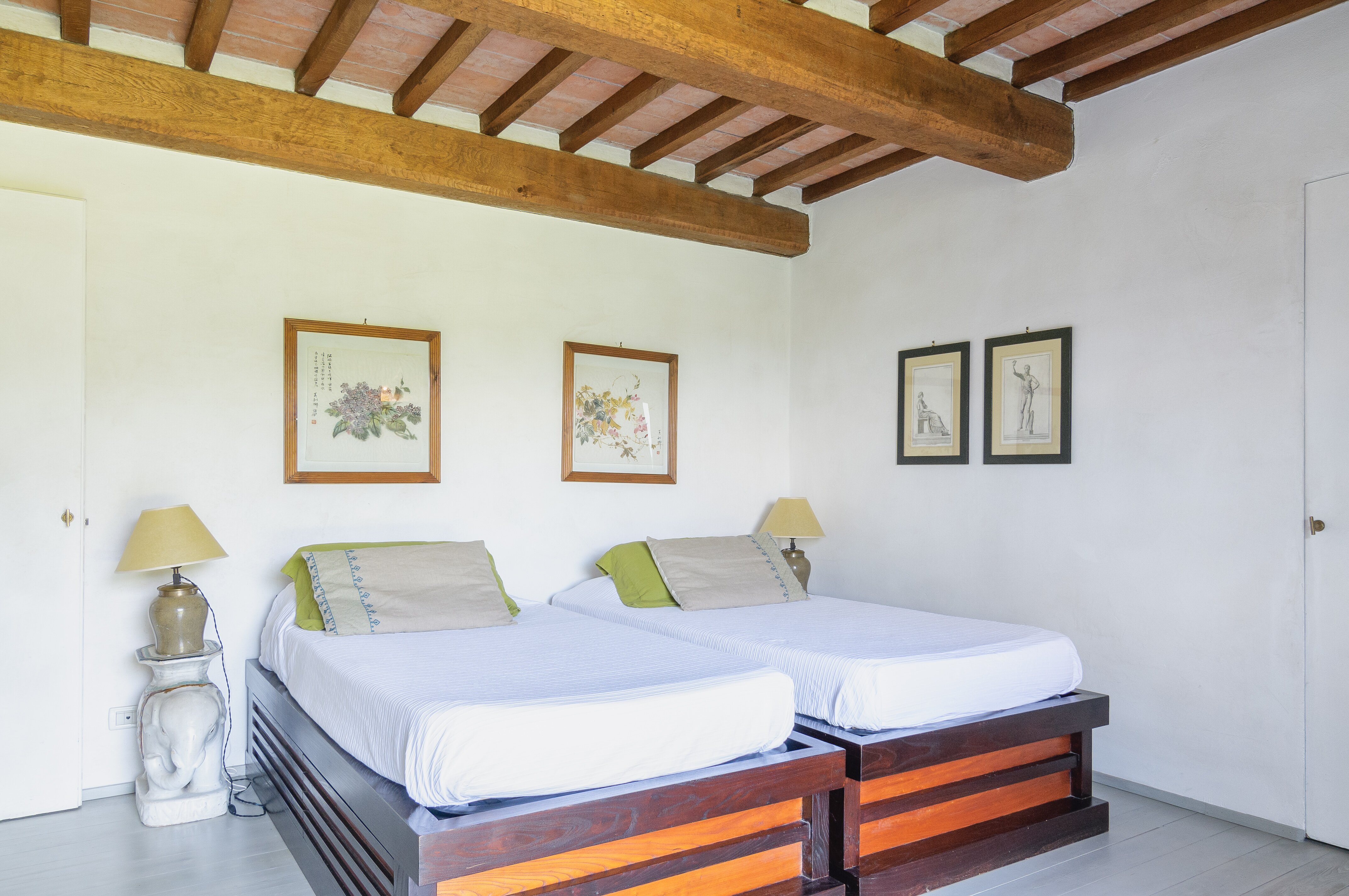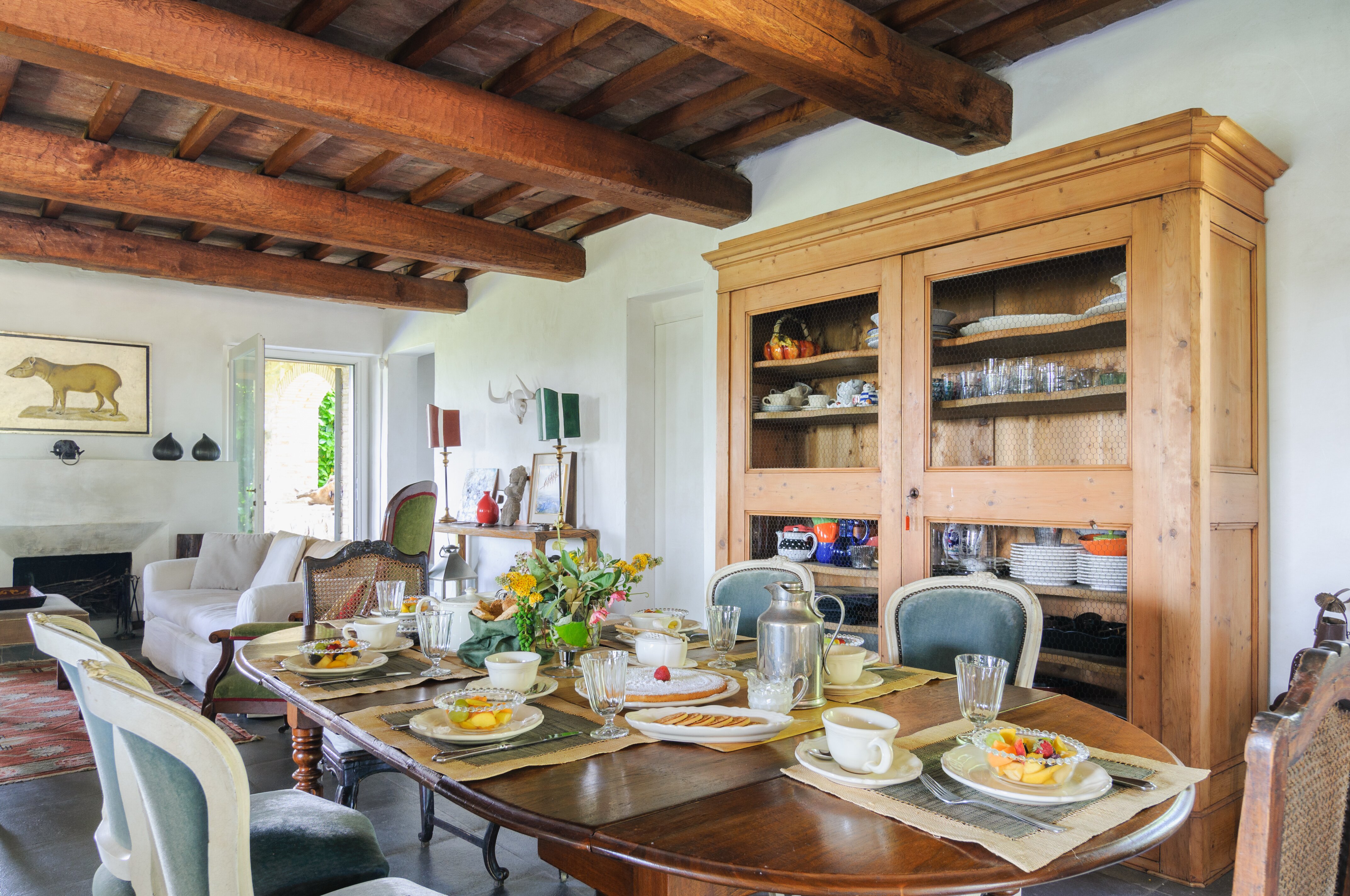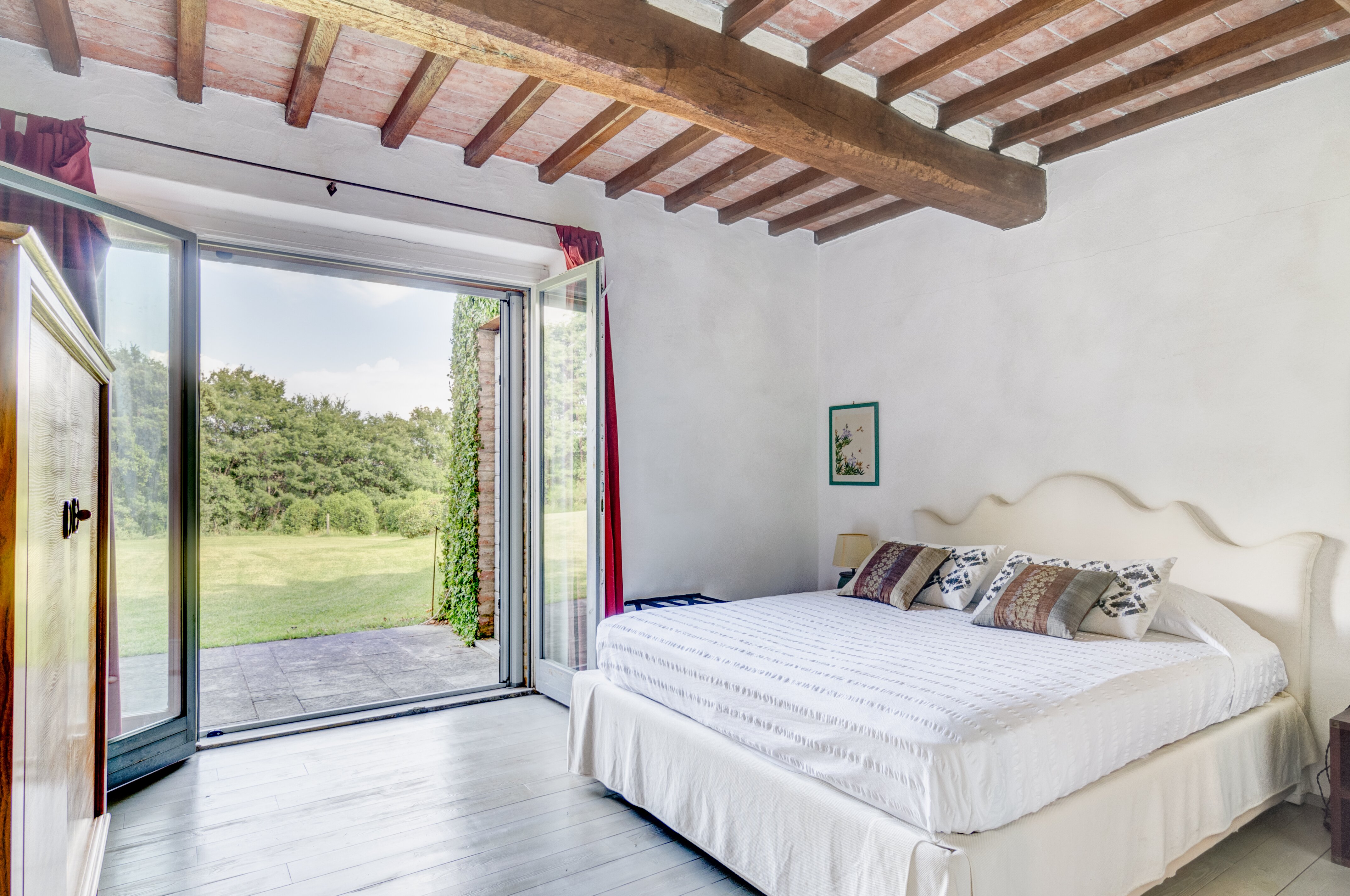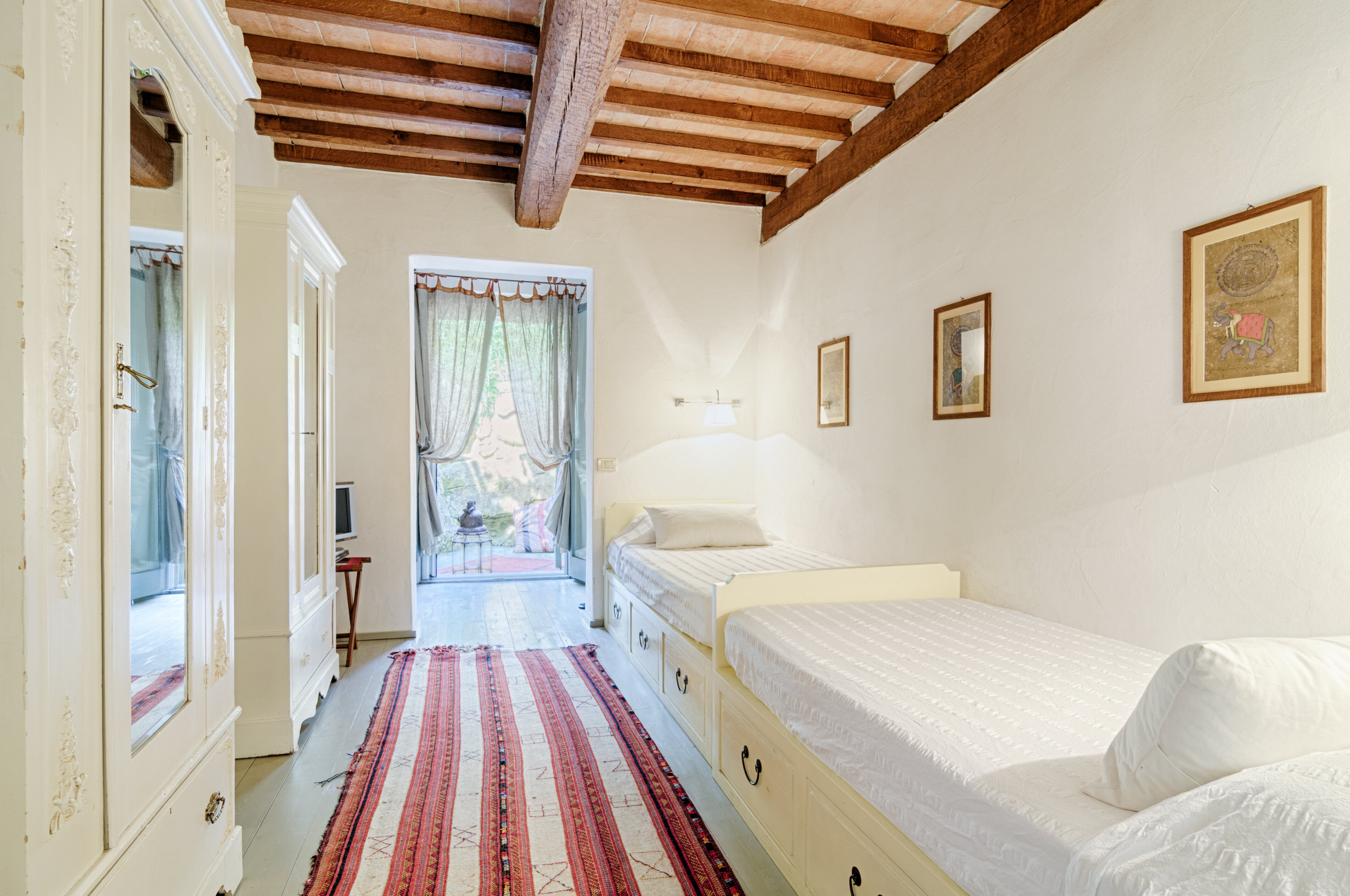 A perfect paradox of a house, this family villa is both stylish and informal, secluded yet close to the gorgeous town of Todi, and quite grown-up but with two hectares of grounds for children to run around. Furnished throughout with effortless elegance, the traditional stone walls and exposed roof rafters blend well with the fresh feel of the villa’s gently contemporary décor. Occupying the ground floor are two sitting rooms, one in cool creamy white and the other more casually dressed with cosy colours and floor cushions; and an ultra-modern kitchen and adjacent dining area, where cook service could be an added indulgence. These open out to a big covered terrace, forming al fresco living areas and looking out to the amazing views. Individually styled, and in a layout that may suit two families, two bedrooms share a bathroom on the first floor, and there are three en suite rooms at the lower level. And just below the house, in very spacious lawns, the generously large swimming pool is joined by a gazebo. Medieval Todi’s shops and restaurants are just 9km from the villa, Perugia and Assisi are both within a 50km drive, and there is a little local shop just 3km away.