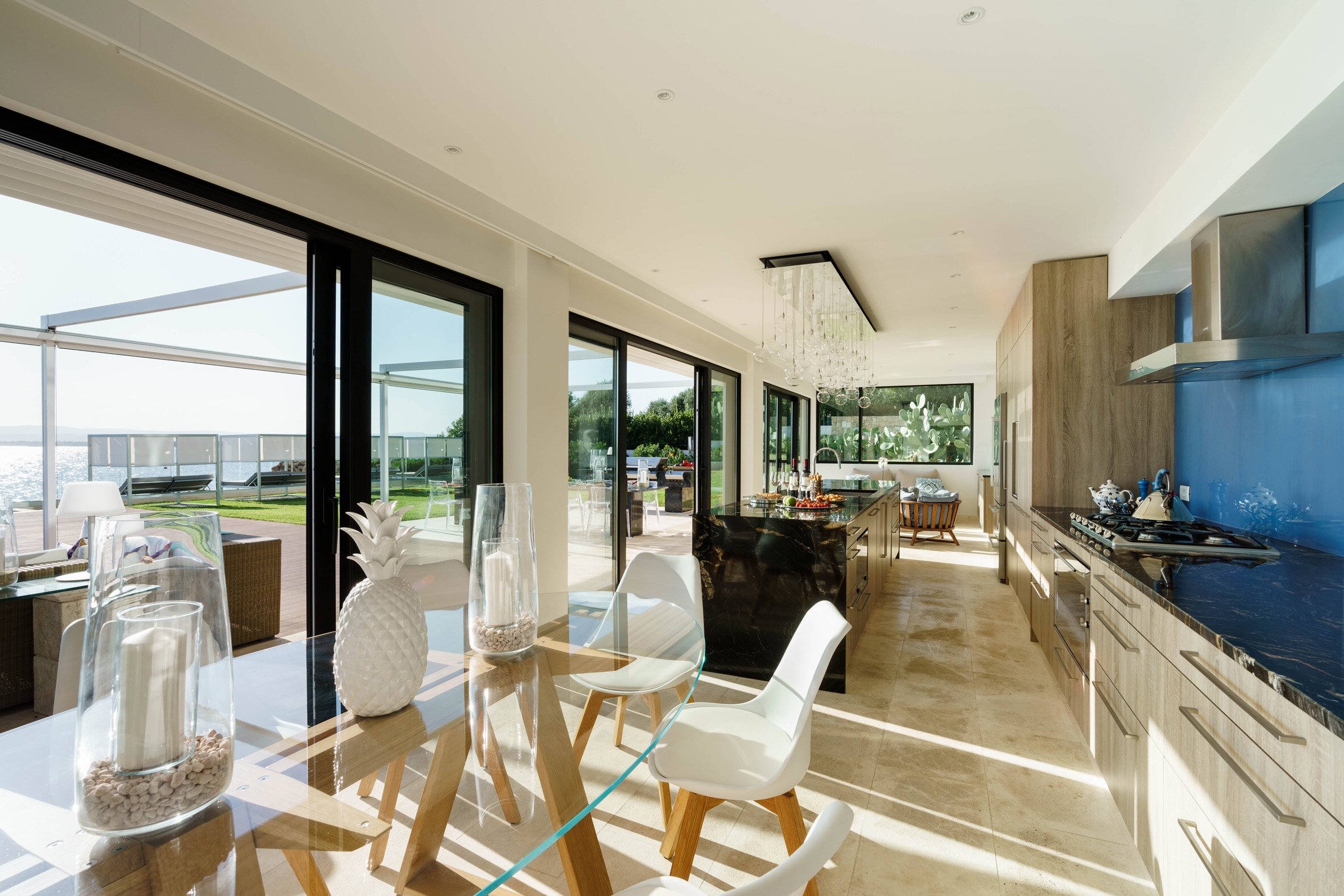 The views (especially when sunset hits) are nothing short of stunning at this premium property in Sicily, just 10km south of historic Siracusa. Set on a rocky promontory on the beautiful Maddalena Peninsula, the oceanfront setting definitely takes centre stage here. Huge glass windows take over the three-level house, and there’s a gorgeous amount of outdoor space to really soak up those views. There’s even gated access to the sea and rocks below. Head to the elegant heated pool for an indulgently pretty panorama, and there’s lovely lawned gardens and a large deck with ample lounging and dining areas, too. It’s a serious sun-trap throughout the day, but the expansive pool deck with the cosy rattan sofas are at their best when the sundowners come out. Evenings in also don’t get much better than enjoying a glorious grilled feast of local specialities at the giant granite dining table. For any meals enjoyed al fresco in the day time, there’s a retractable awning for much-needed shade during the hot Sicilian weather.