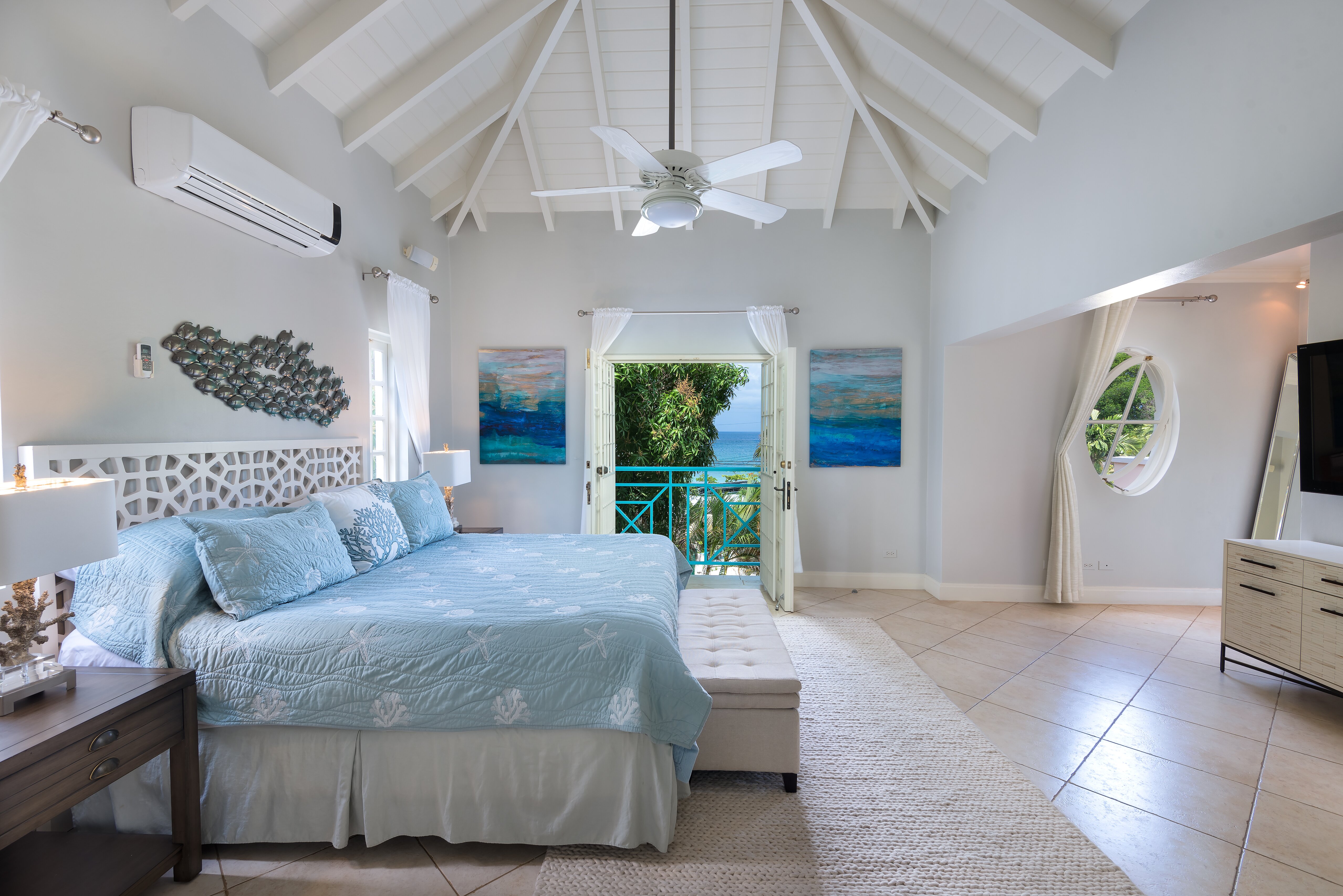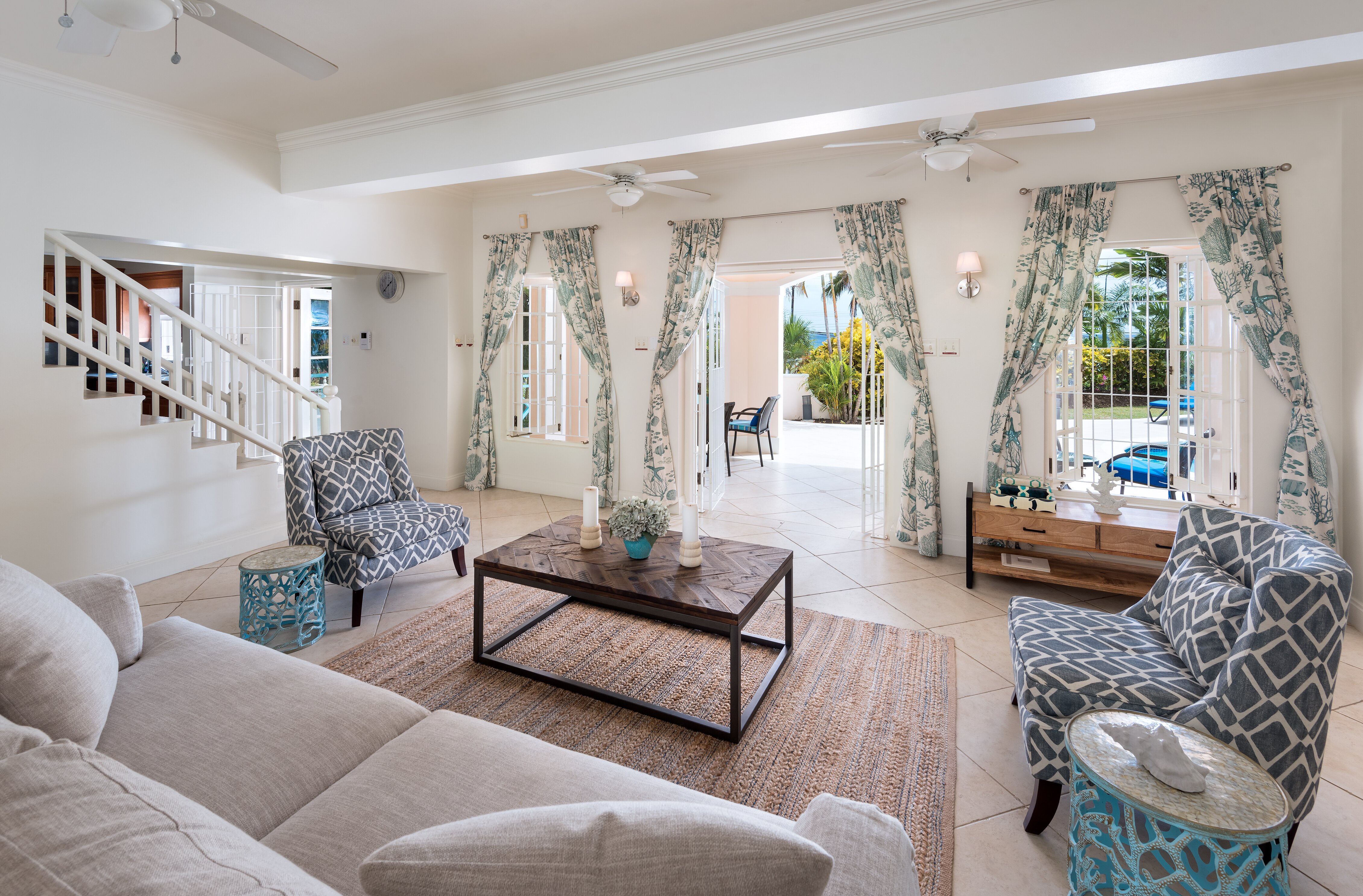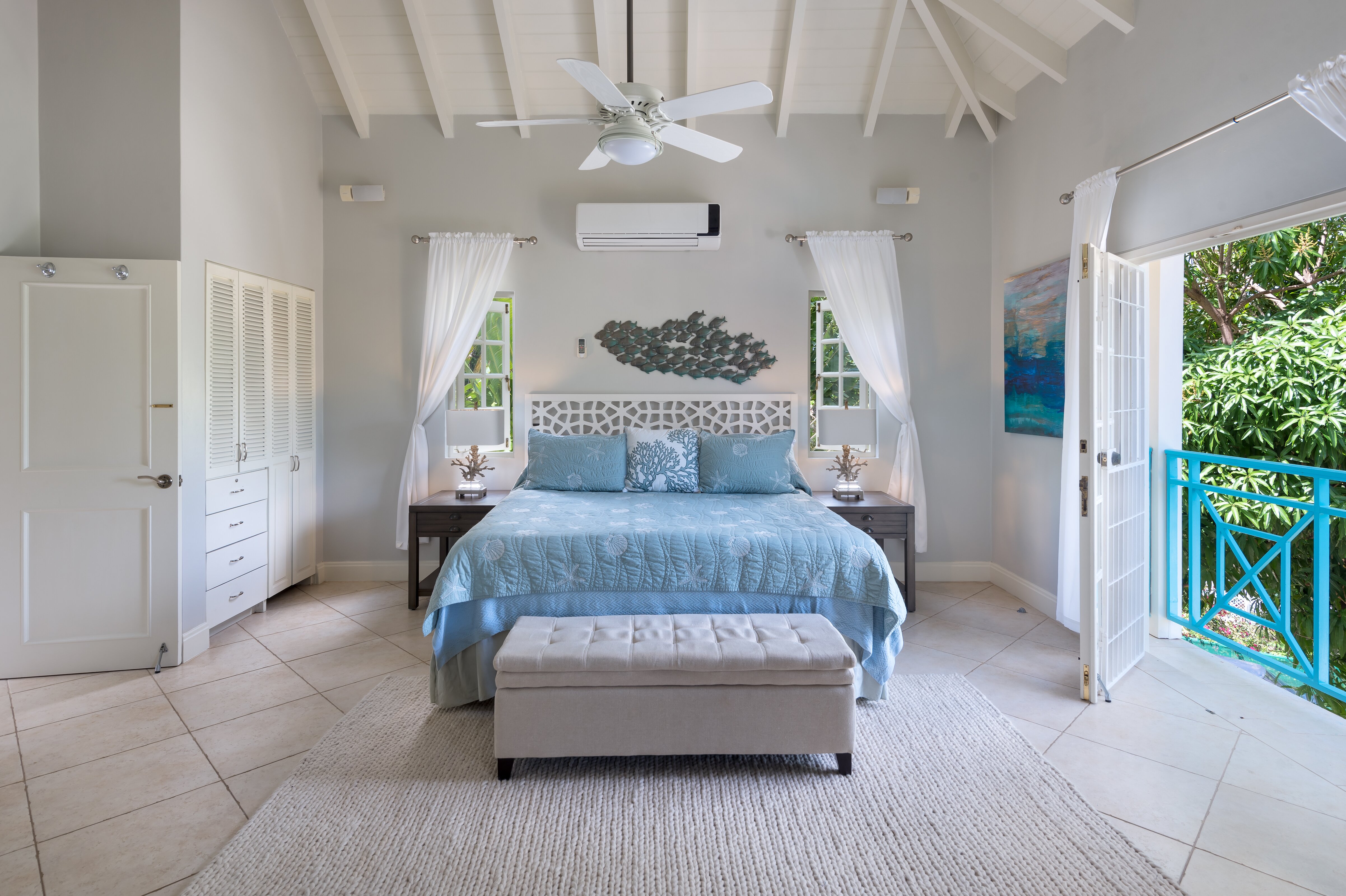 Sundown is a grand and comfortable property for groups of friends and families of up to eight. Ideally located, it’s slightly set back for peace and privacy with remarkable ocean views, while sandy Mullins beach is just a short walk away. Beautifully designed inside and out, Sundown offers guests comfort and indulgence in equal measure decorating in cool and calming shades of blue. Downstairs a fully-equipped kitchen is where the villa’s cook prepares two meals per day, for six days a week and includes a breakfast bar and a kitchen table. The TV room is ideal for teenagers, while a large living and dining room has plenty of room for both relaxing and dining indoors with double doors opening to the terrace. Outside, a shaded terrace adjacent to the house is furnished with comfortable seating overlooking the private pool in the centre of the lawn. At the bottom of the garden there’s a hammock for afternoon snoozing and a dining pergola, both surrounded by tall swaying palms