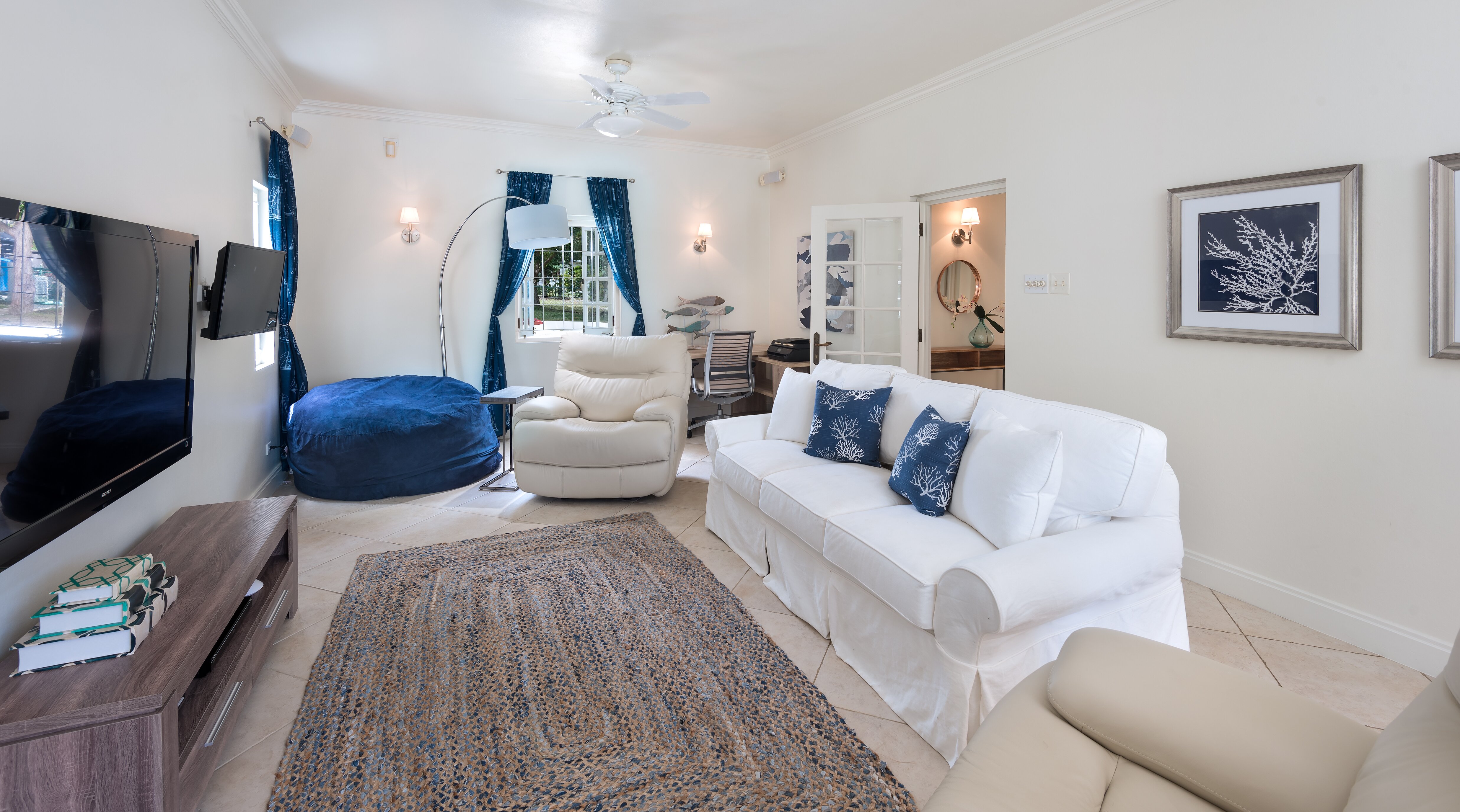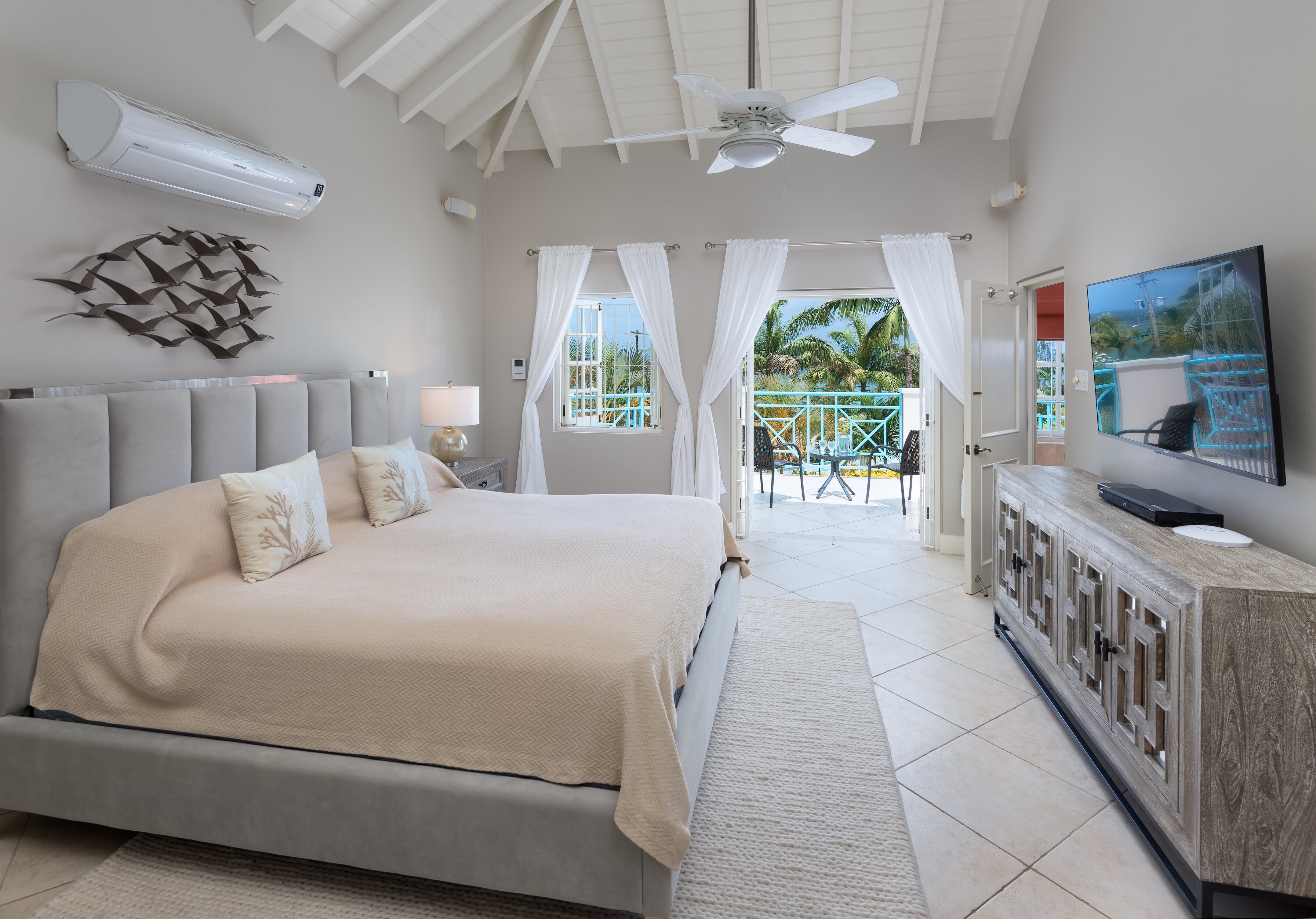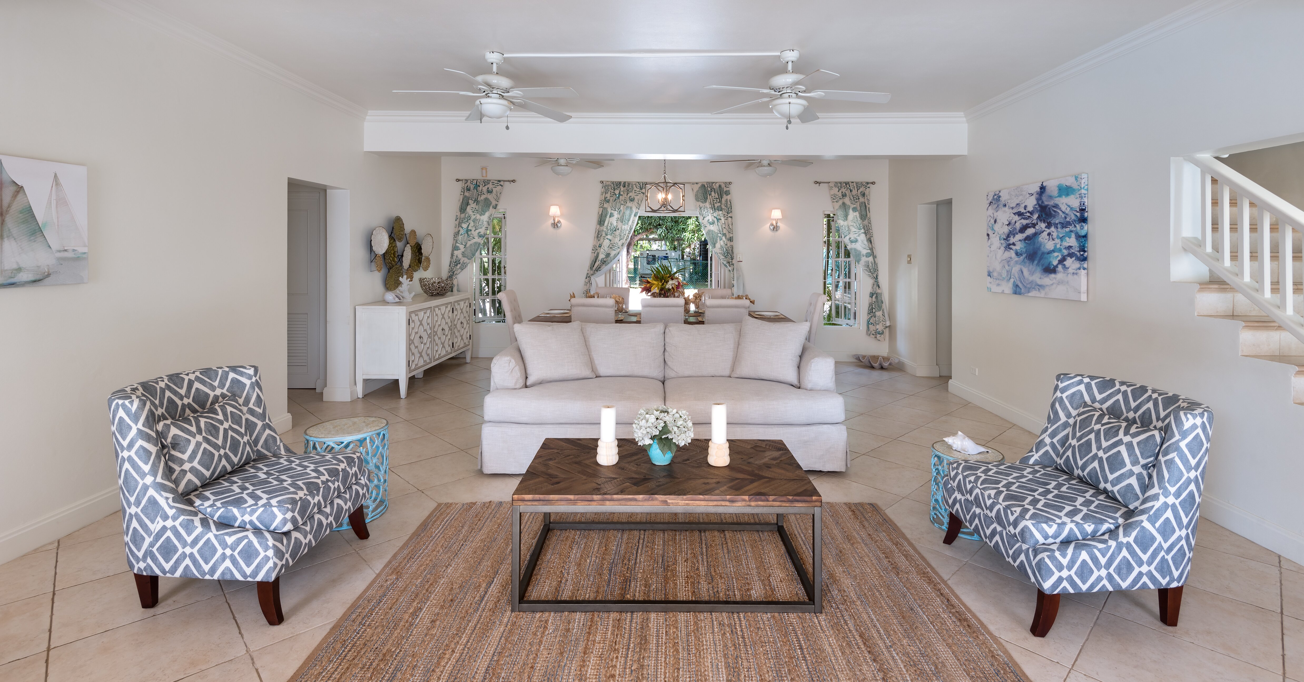 Sundown is a grand and comfortable property for groups of friends and families of up to eight. Ideally located, it’s slightly set back for peace and privacy with remarkable ocean views, while sandy Mullins beach is just a short walk away. Beautifully designed inside and out, Sundown offers guests comfort and indulgence in equal measure decorating in cool and calming shades of blue. Downstairs a fully-equipped kitchen is where the villa’s cook prepares two meals per day, for six days a week and includes a breakfast bar and a kitchen table. The TV room is ideal for teenagers, while a large living and dining room has plenty of room for both relaxing and dining indoors with double doors opening to the terrace. Outside, a shaded terrace adjacent to the house is furnished with comfortable seating overlooking the private pool in the centre of the lawn. At the bottom of the garden there’s a hammock for afternoon snoozing and a dining pergola, both surrounded by tall swaying palms