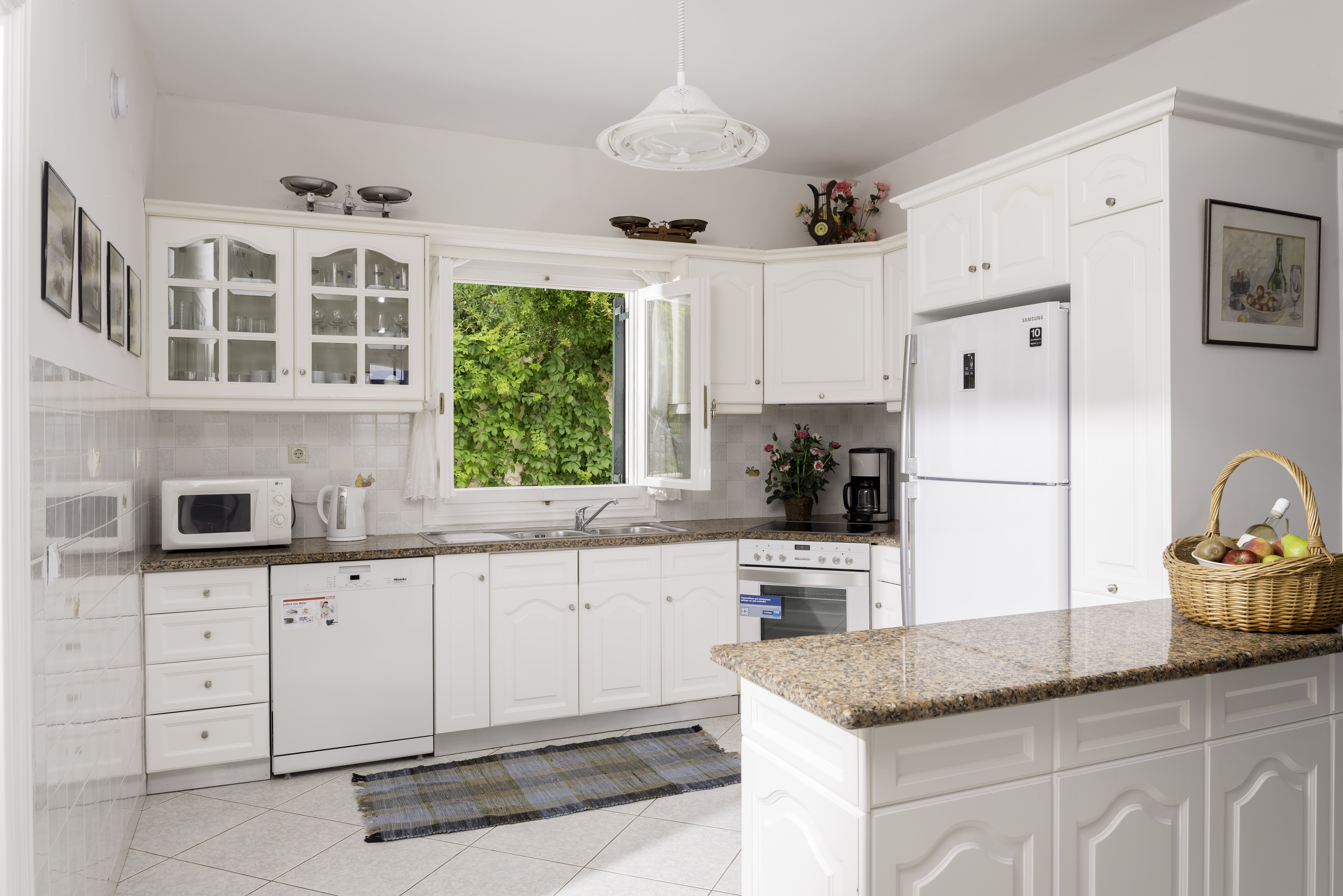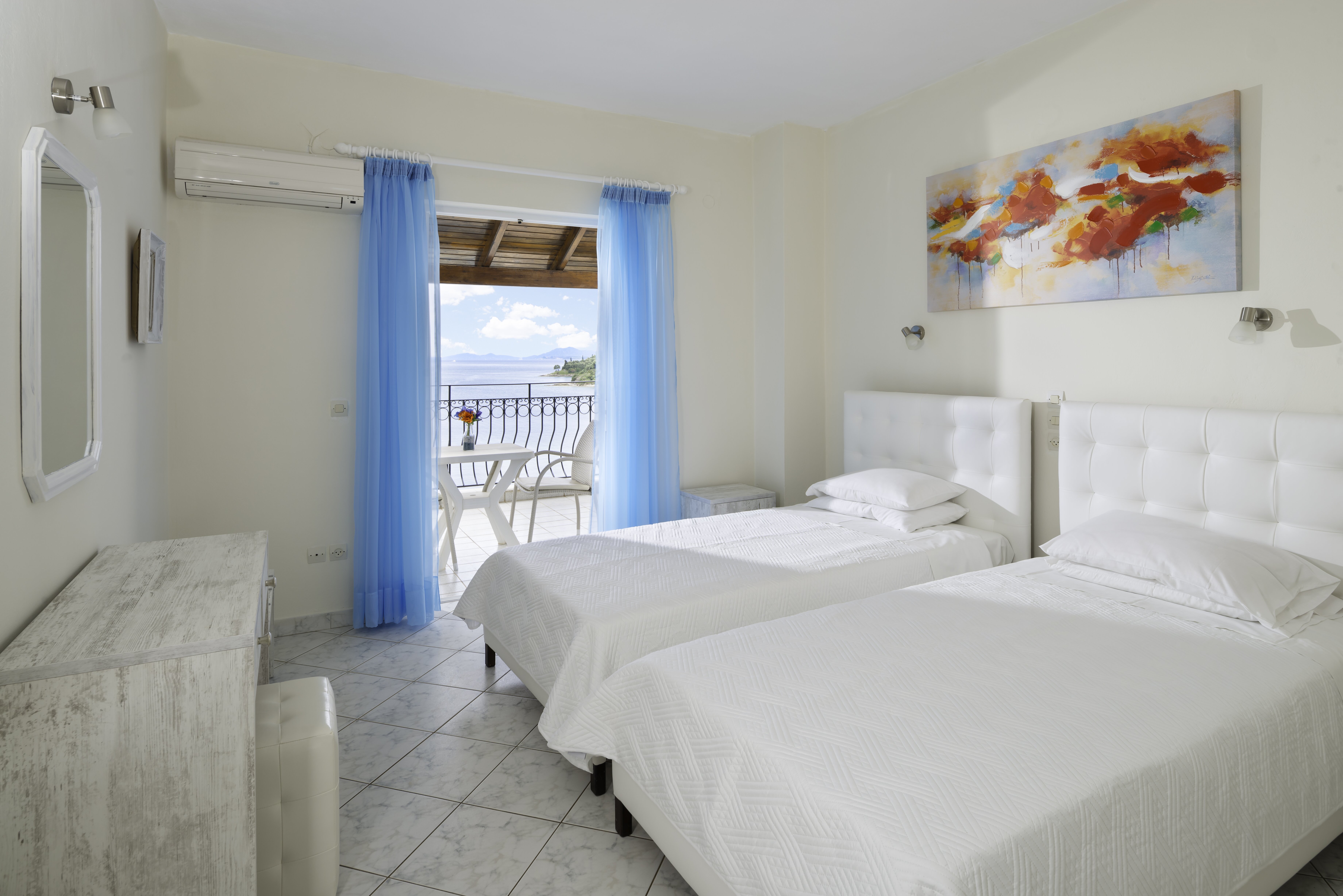 Reached via a stepped path, a two minute walk from its parking area, this welcoming villa is elevated for blissful sea views, immediately above a lovely little shore, where smooth rocks are nature’s gift for sunbathing, and boats can be moored at the end of a day’s sailing. An excellent choice for two families or a group of friends, Thalassa has a master double and a twin bedroom in each of its left and right wings, all opening on to a balcony, and a studio for two on the lower ground (poolside) level, which has its own kitchenette. In between, the ground floor is a bright and spacious, open-plan living room combining the kitchen, dining and sitting areas, with French doors out to the furnished terrace for those gorgeous coastal views. With satellite TV and WiFi, and with air conditioning in all the bedrooms, this very comfortable villa is equally inviting outdoors, where there are ample loungers around the swimming pool, and a poolside pergola-shaded dining area is complete with a built-in barbecue. St. Stephano beach is a five minute walk from the villa, and Kassiopi’s nightlife and Avlaki are both just a short drive away.