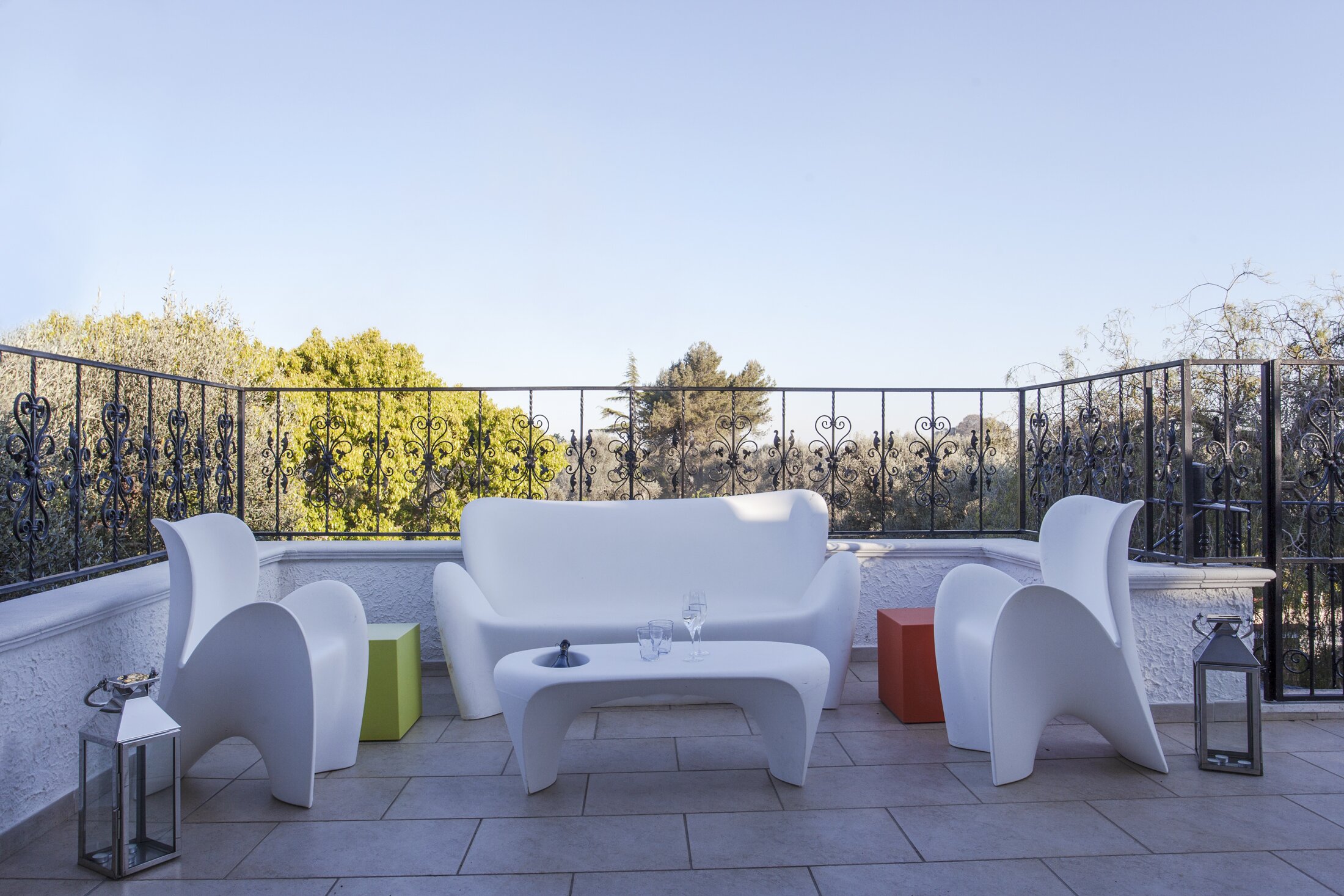 The open-air cinema can be set up on request under an outside pergola - a projector and screen and 12 reclining chairs with foot rest and bean bags.