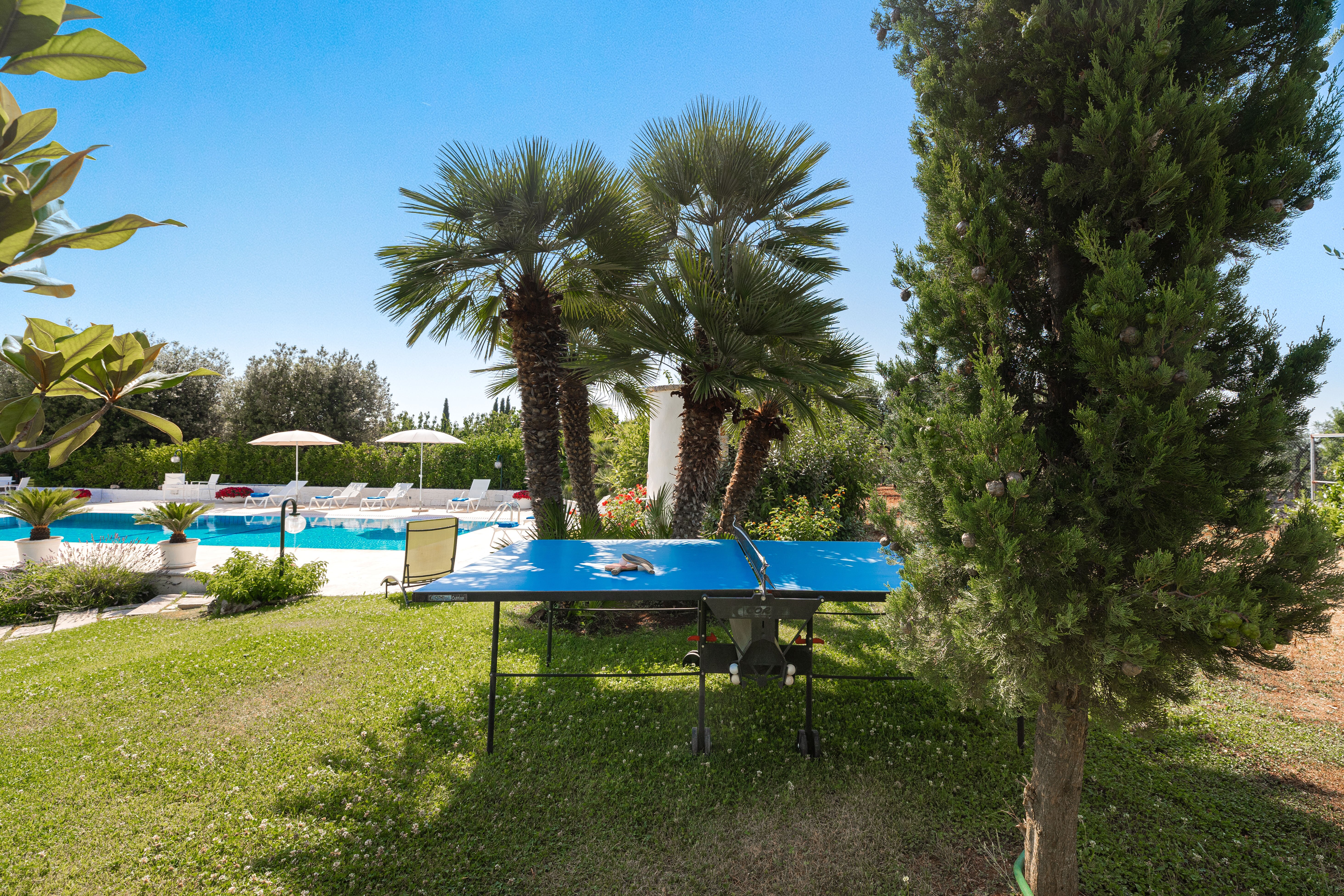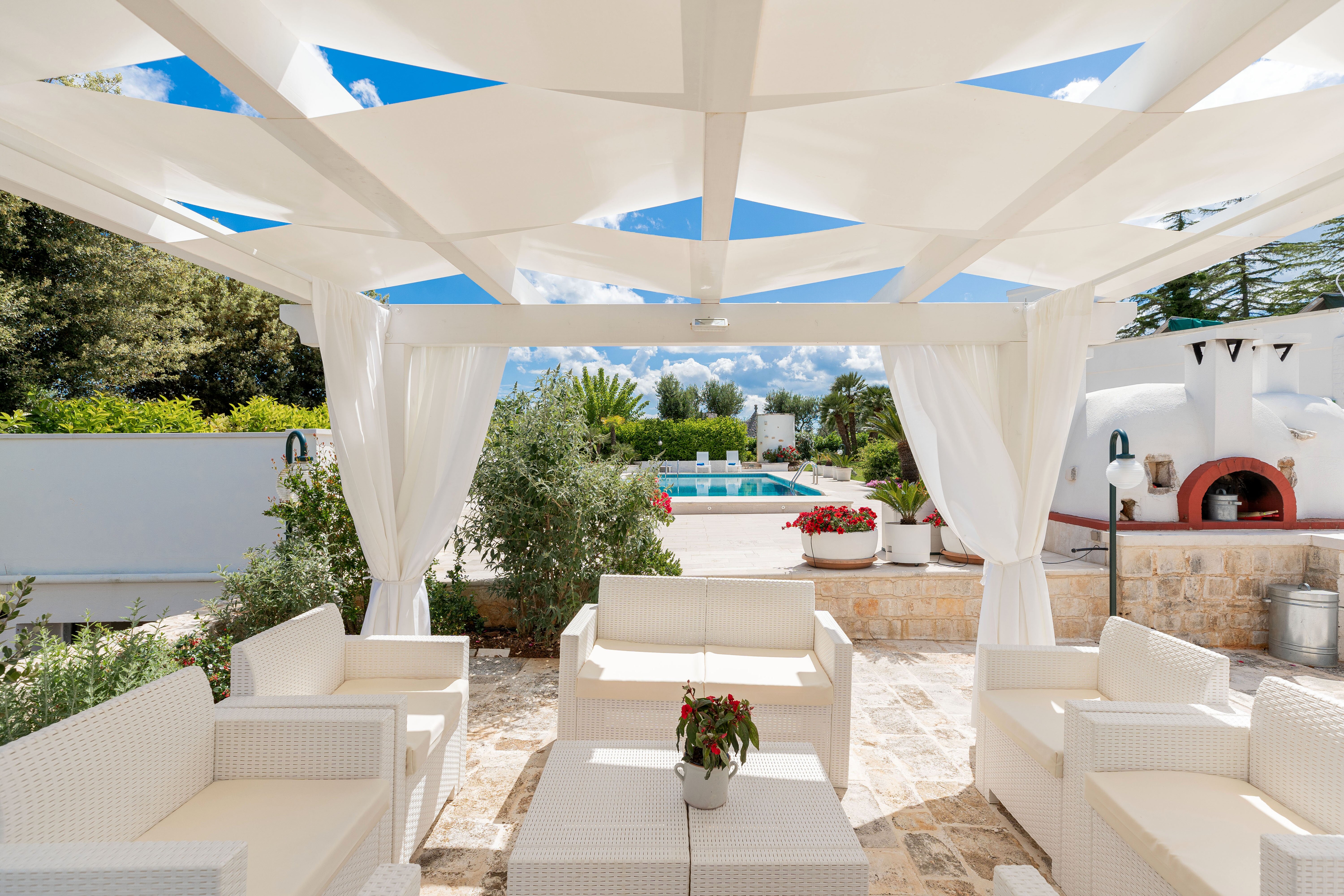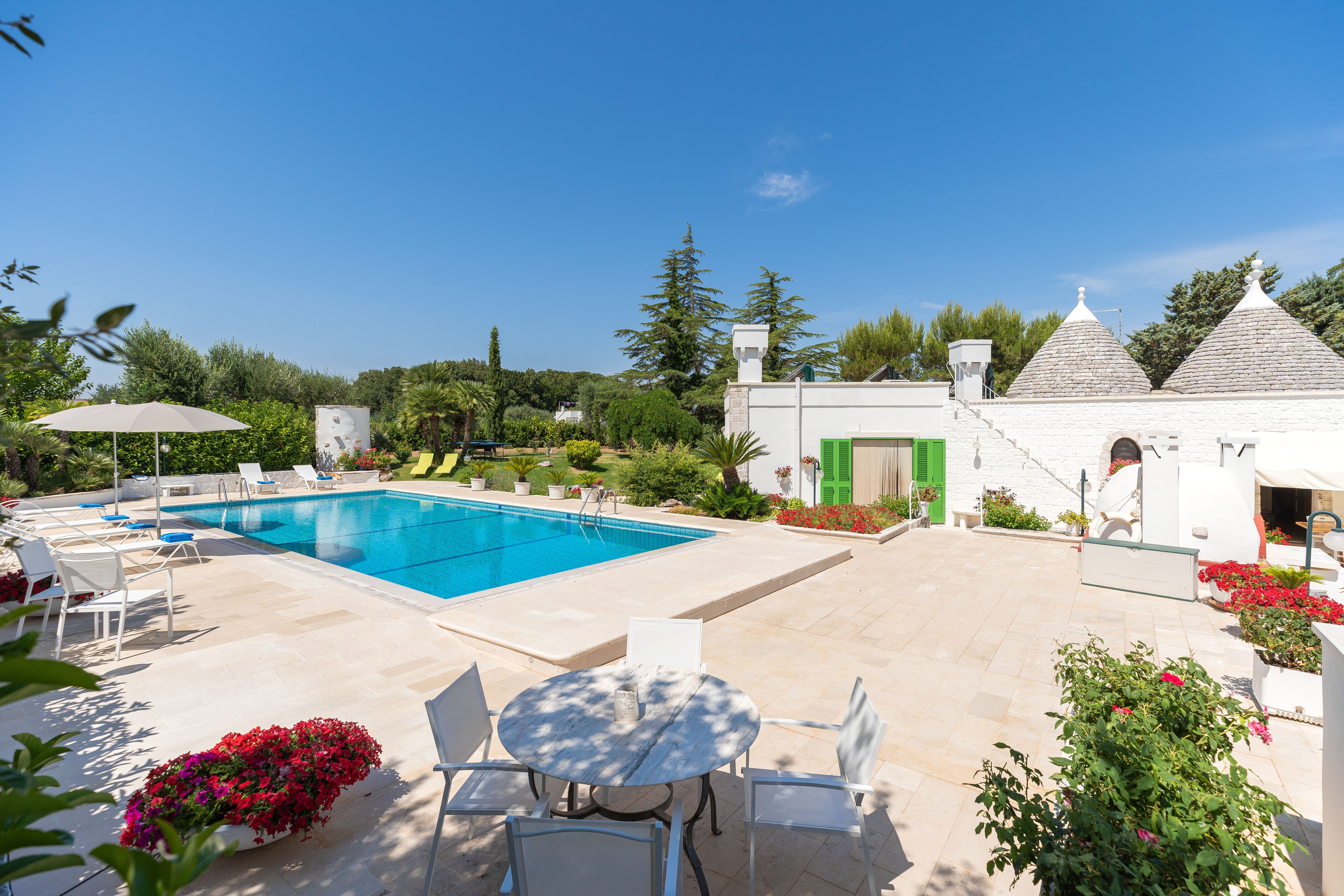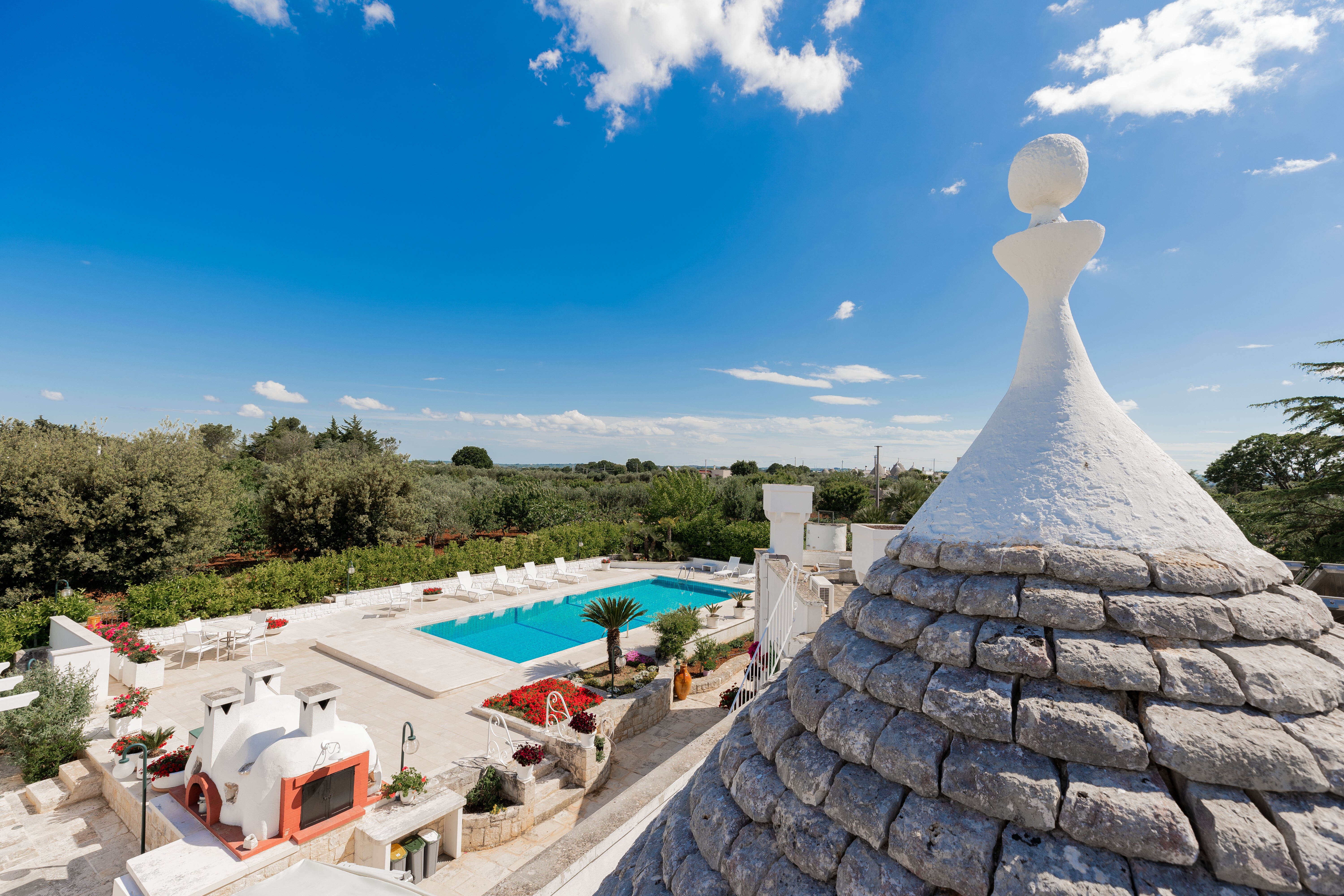 Making the most of the Mediterranean climate, this lovely little trulli house is thoughtfully designed and very well equipped for indoor/outdoor living. A generously sized swimming pool is the focal point of the grounds, its poolside terrace punctuated with colourful flower beds and young palms, and backed by the clustered fruit trees of the villa’s private orchard. A canopied dining terrace, well-equipped outside kitchen with barbecue and wood-burning pizza oven make al fresco lunches a delight, and there is table tennis and a utility / shower room in the garden too. There are many different seating areas in sun and shade in the gardens. The layout of the house itself is ideal for two families. In the characterful trulli section, there are two bedrooms, a living room and kitchenette opening out to a patio; and interconnecting doors link the historic building with the more recent part, with a further double and twin bedroom and a light and well-equipped open-plan kitchen/living room. Enjoying very good privacy in its gated gardens, the villa is actually just 1.5km from shops and restaurants in the centre of Cisternino, reached on foot along the country lanes. An excellent restaurant Osteria Sant' Anna and a minor train station with connections to Lecce are closer. A 10km drive leads to a choice of sandy beaches and beach clubs, and Martina Franca, Ostuni and Alberobello are all within 20km.