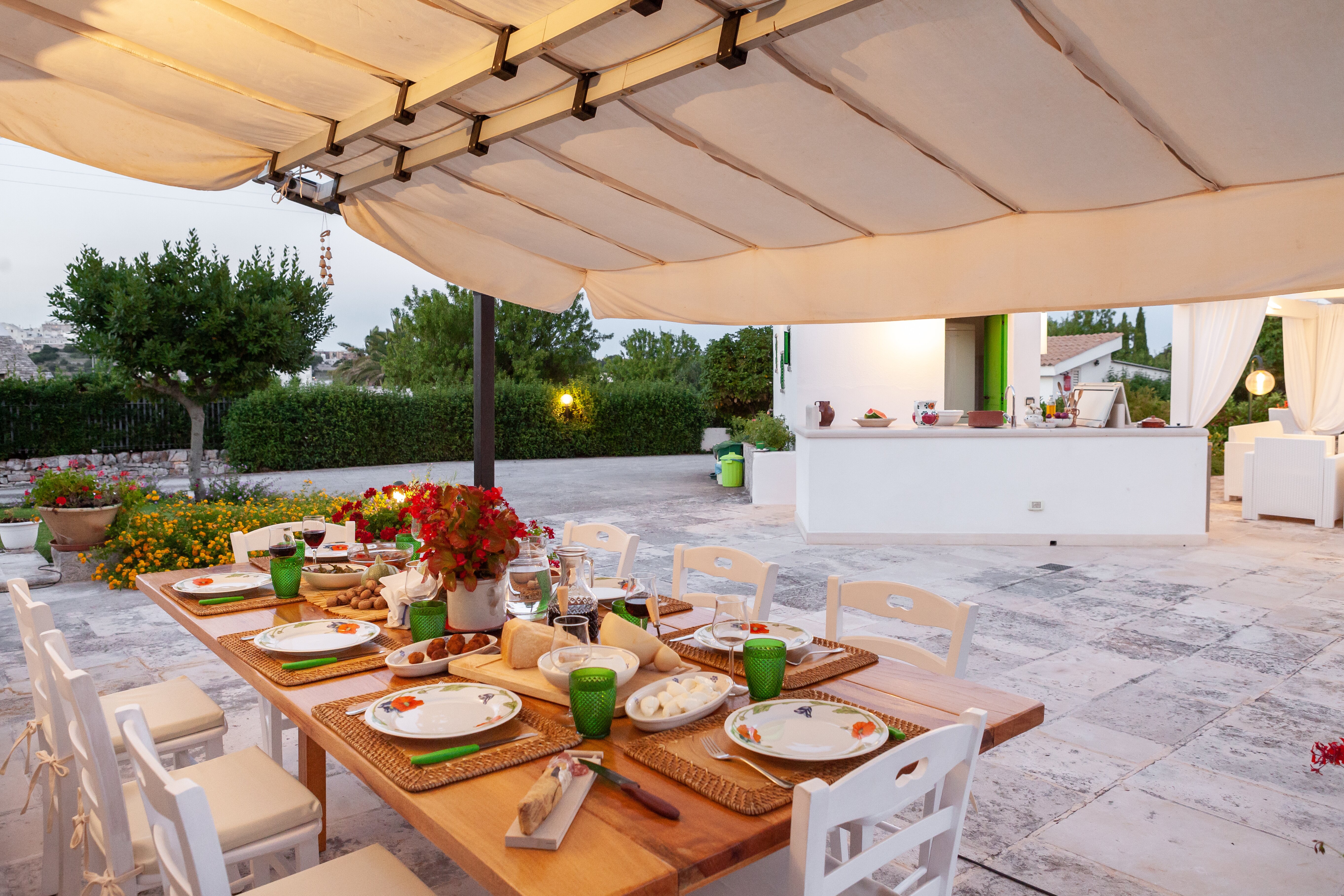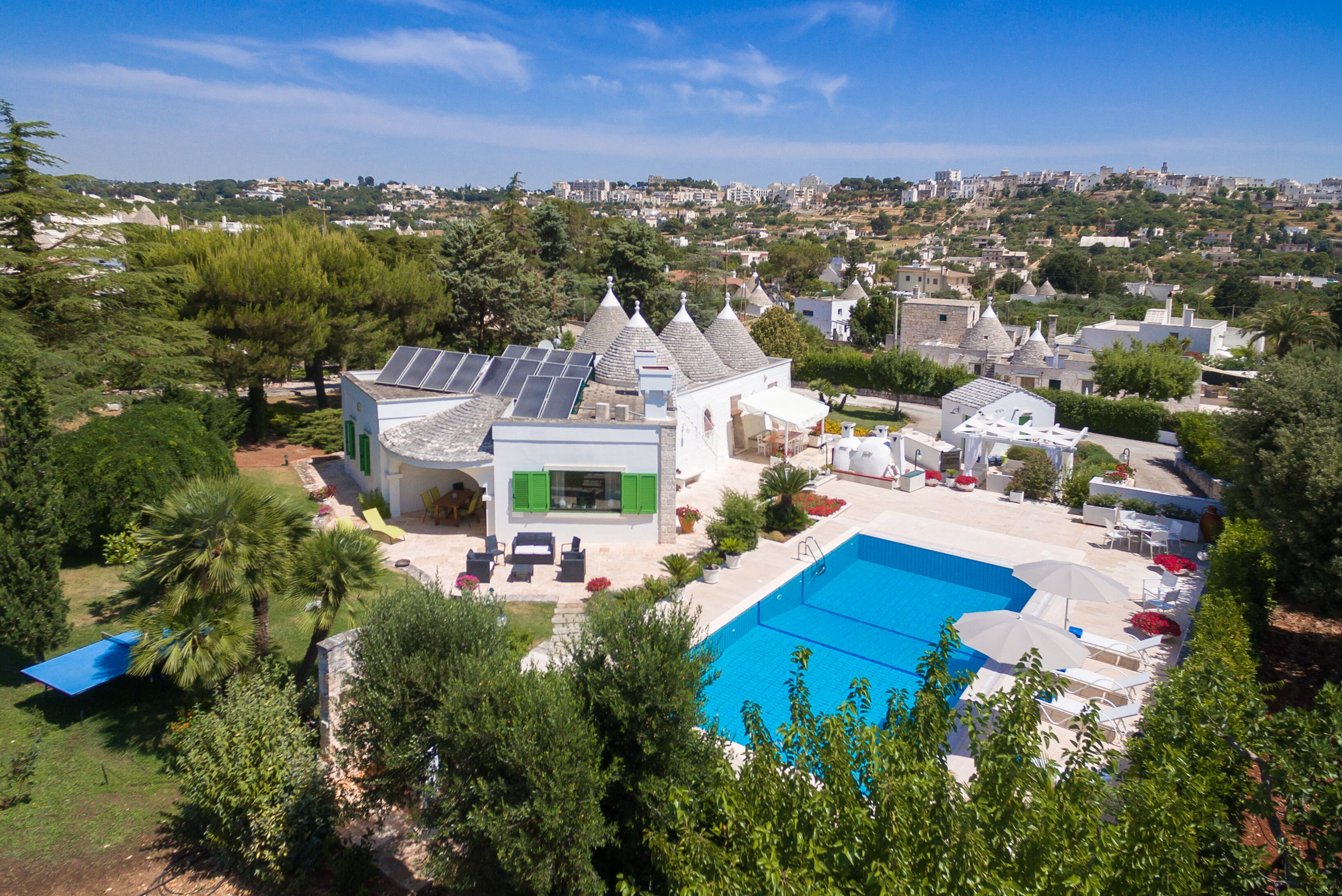 Cushioned in mature gardens, within walking distance to Cisternino, this well-equipped and very private villa in Puglia has four distinctive trullo cones, well-equipped outside kitchen, a solar heated pool, and is furnished in very attractive and comfortable country style.