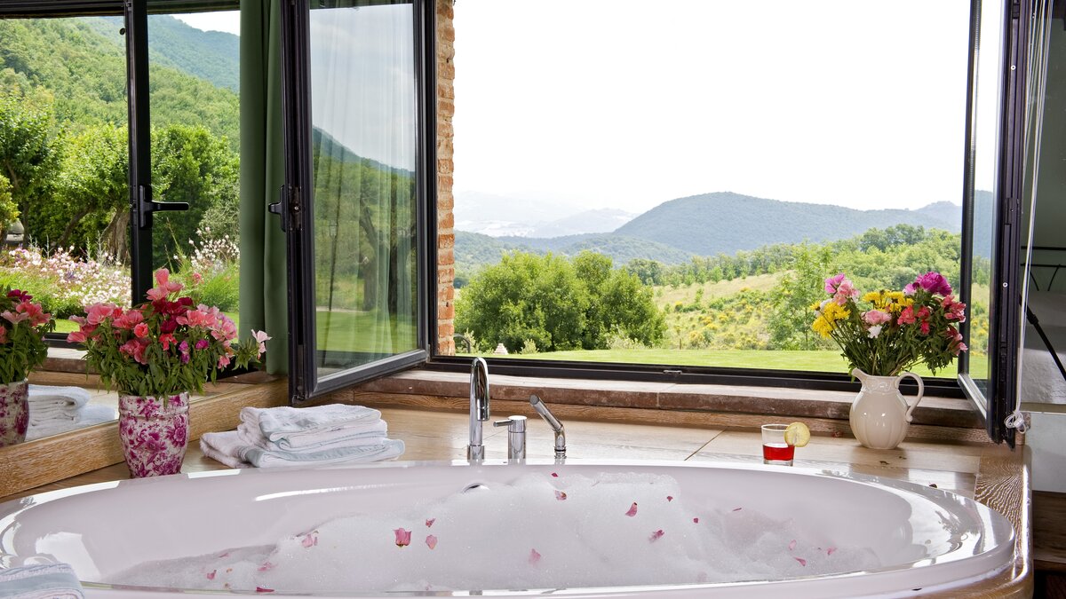 This luxury villa in Umbria’s hills has its origins in the 14th century, and the former farmhouse is still steeped in charm and character, though it now sits amid immaculate lawns, and is stylishly furnished and fully equipped with 21st century comfort. Superb for a special occasion, a golfing holiday, and for gatherings of family or friends, its nine bedroom accommodation utilises all the old stone buildings, divided to form a romantic studio-style cottage for two; and three virtually self-contained suites, each with its own kitchen and living room. The largest of these, the Tramonto Suite, has the get-together social space, with a big sitting room and a dining room designed for eighteen guests, where cook service could be an invaluable addition. With its own putting green in the very private gardens, the villa’s beautiful infinity pool and adjacent Jacuzzi gaze out to views of Antognolla’s medieval castle and Robert Trent Jones Jr golf course, which can be reached in five minutes via a private path. There is a restaurant and bar at the Golf Club, Pierantonio’s shops are 9km away, and Umbertide is 15km from the villa.