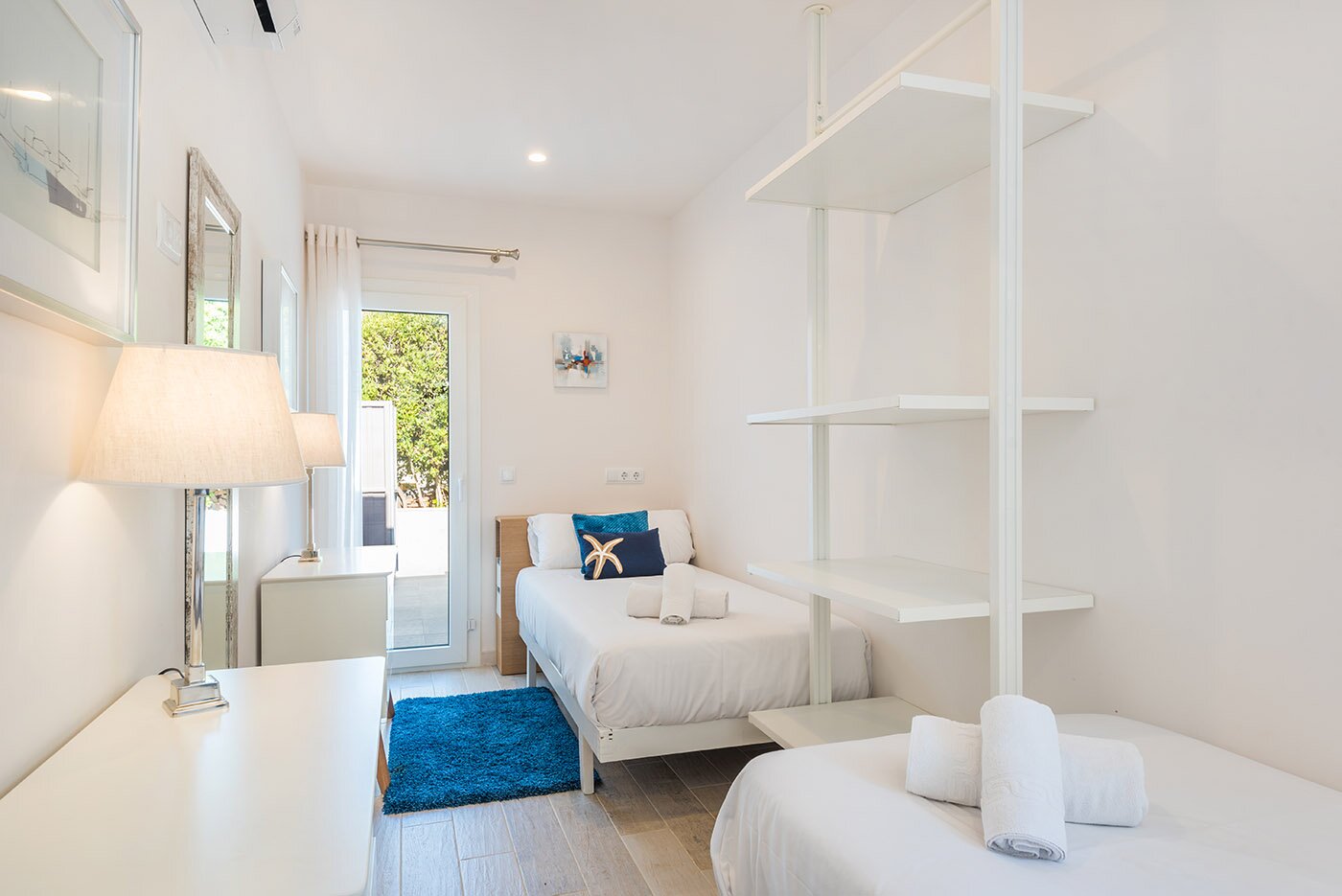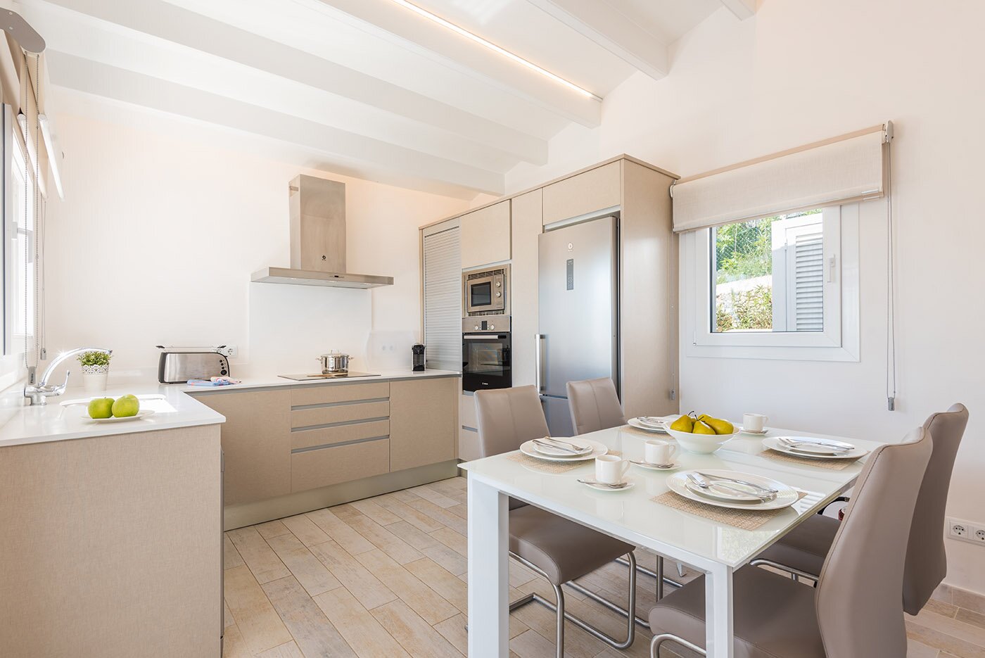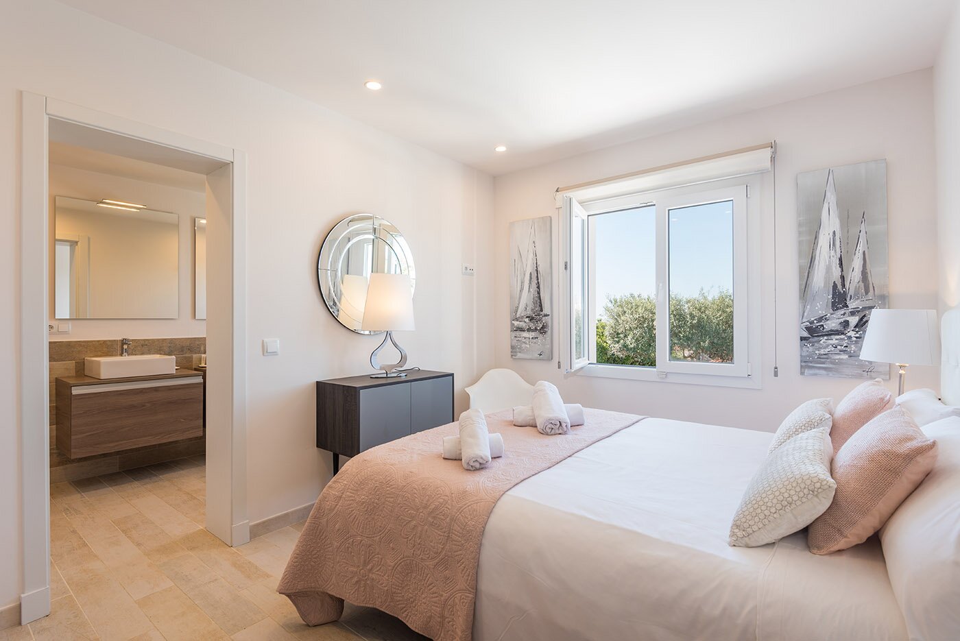 Facilities for outdoor living include a shaded terrace for al fresco dining and another, ideal for sundowners, with cushioned built-in seating. Both overlook the private pool, its sunny terrace furnished with loungers and parasols and privately screened with greenery. Set in a residential area, the villa is a walkable 1.1km from Son Bou’s sands and varied amenities, and old-world Alaior is a 10km drive away.