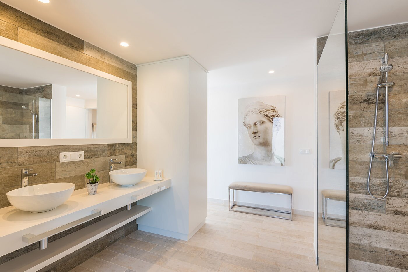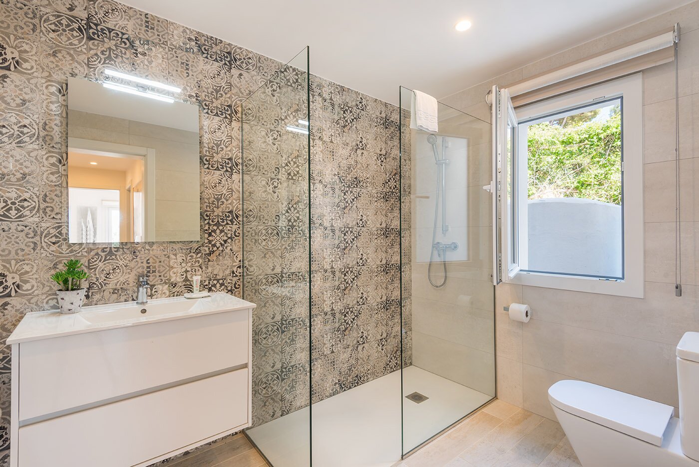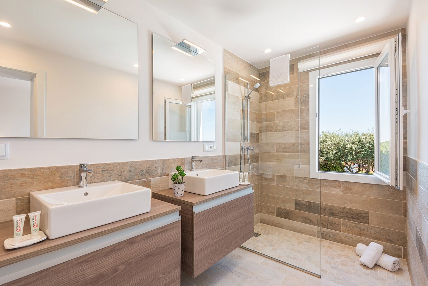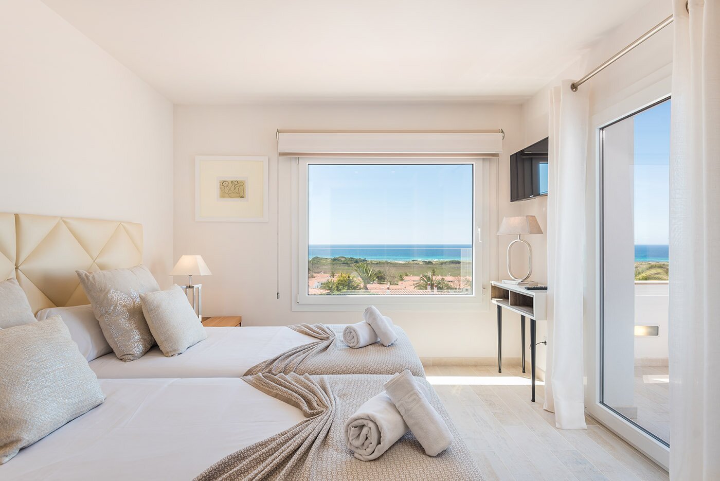 Facilities for outdoor living include a shaded terrace for al fresco dining and another, ideal for sundowners, with cushioned built-in seating. Both overlook the private pool, its sunny terrace furnished with loungers and parasols and privately screened with greenery. Set in a residential area, the villa is a walkable 1.1km from Son Bou’s sands and varied amenities, and old-world Alaior is a 10km drive away.