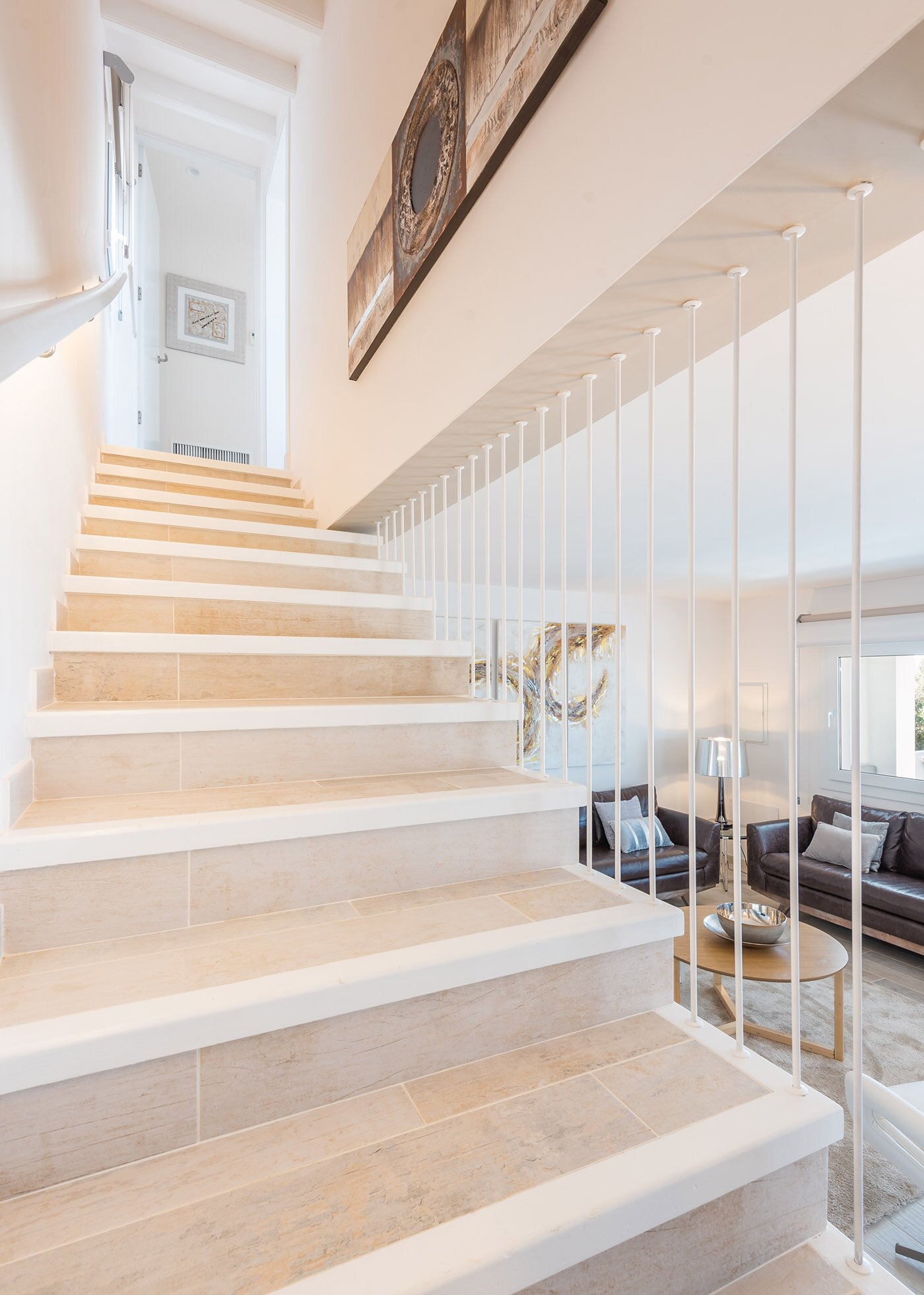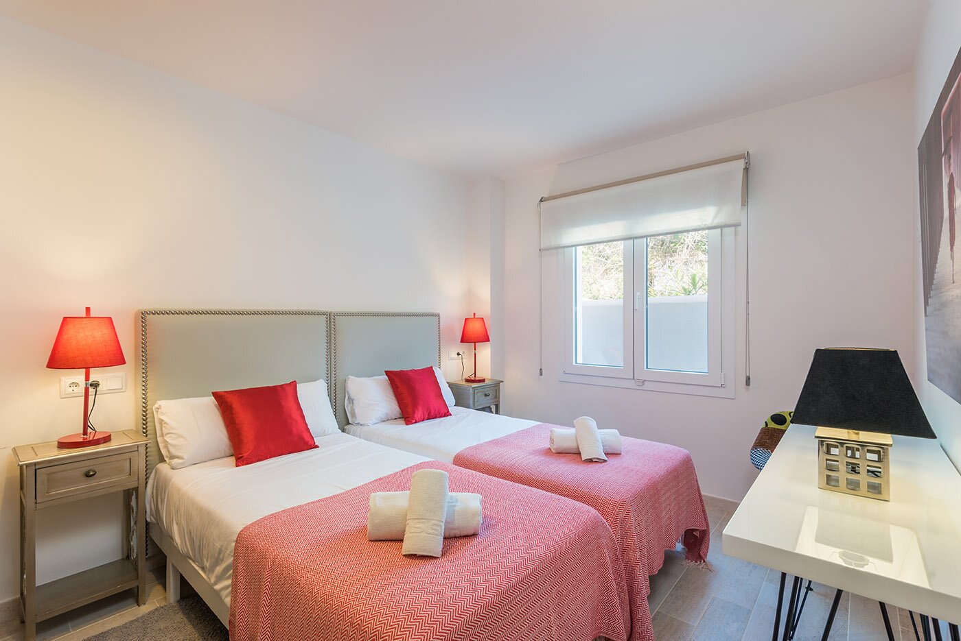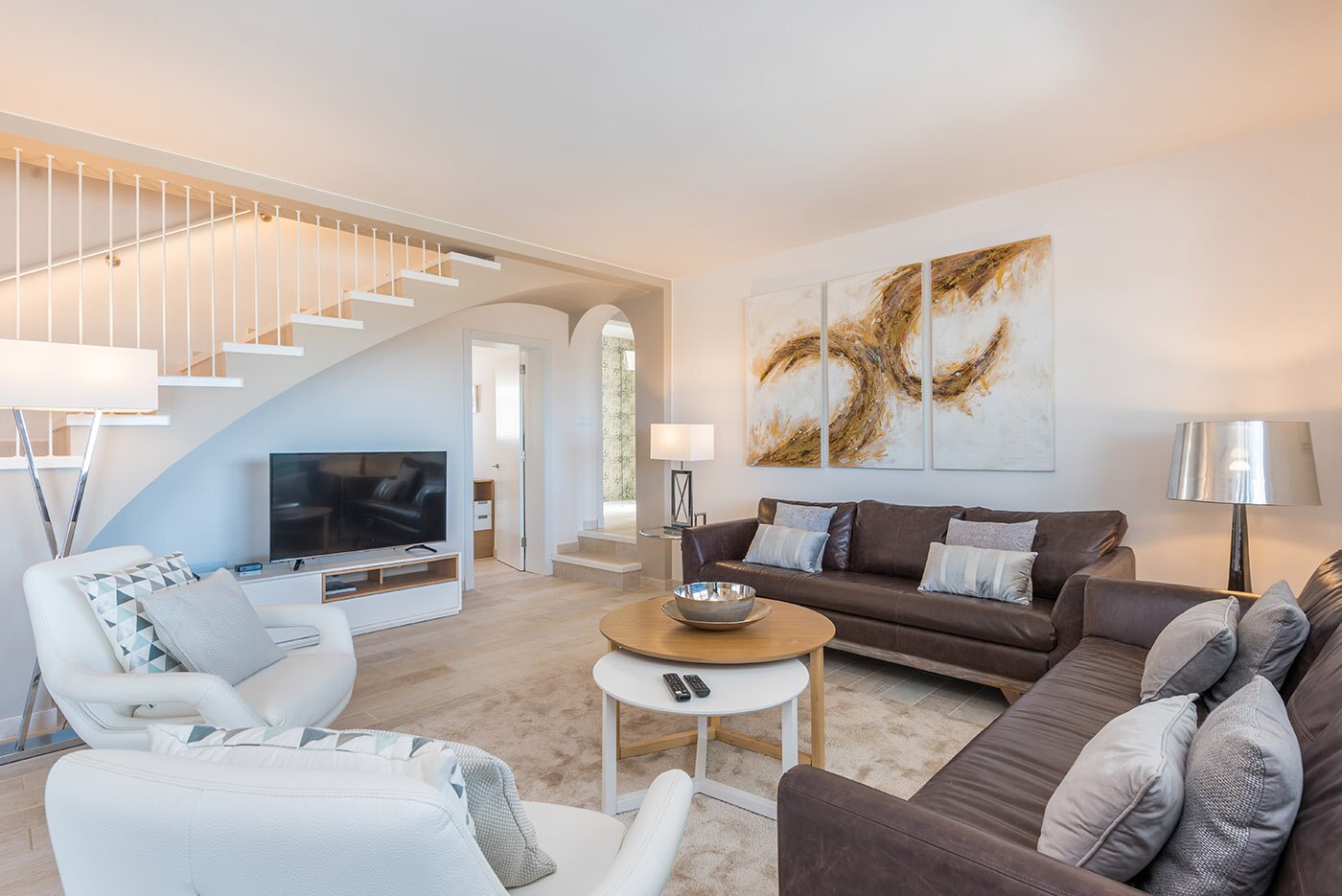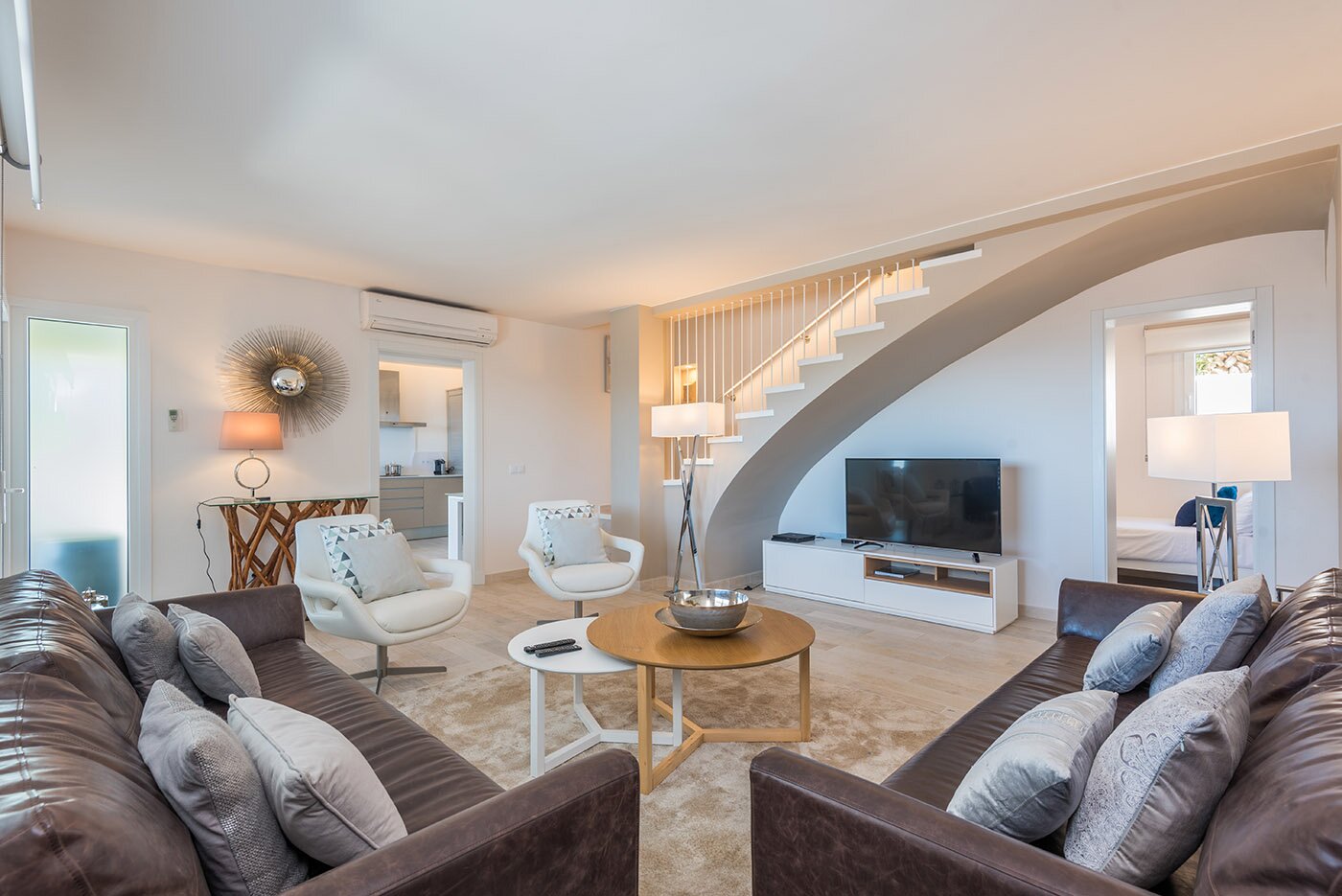 The sharp monochrome exterior of this modern villa is a hint of the sense of style to be found within, but there is equal emphasis on form and function, so comfort is not compromised in the very contemporary interiors of Villa del Sol. Bold artworks and carefully chosen objets d’art complement big sofas piled with cushions, chic bedrooms and shower rooms are each individually designed, and the breakfast kitchen is as smart as it is well-equipped. With air-conditioning, WiFi and satellite TV, the house has a good mix of three twin and two double bedrooms, in a layout which would suit two families, and offers glorious views over terracotta roof tops to the deep blue of the bay.