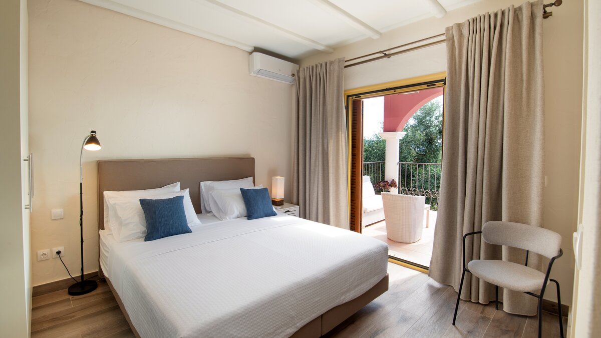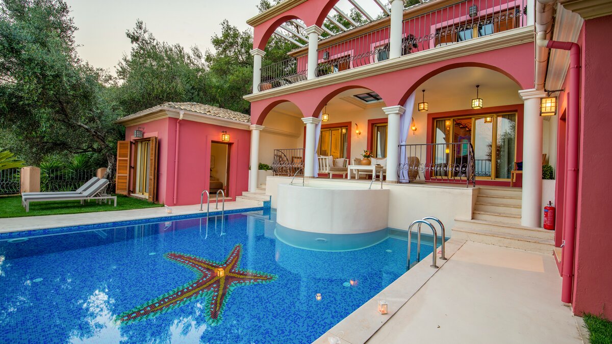 Secluded but far from reclusive, this elegant villa is stepped into the hillside above St. Stephano, quietly cushioned among mature trees, yet within easy reach of the pretty harbour village below. Villa Felicia stands out from the crowd with its crimson walls, colonnaded terraces and mosaic infinity pool and jacuzzi. Inside, on the contrary is decorated in neutral shades with a minimalist, contemporary feel. Air-conditioned throughout, the villa’s open-plan kitchen/dining room is on a raised level with doors to an al fresco sitting room terrace overlooking the beautiful bay. Below, at either side of the swimming pool - so ideal for a morning dip, two double bedrooms are each privately accessed only from the garden. The top floor of the house is shared by a third double bedroom and the master suite, which opens on to a balcony with blissful views; while outside, paved paths lead through lawned gardens to a dining area under the trees. The shops, beach and harbour-front tavernas of St Stephano are a short drive away.