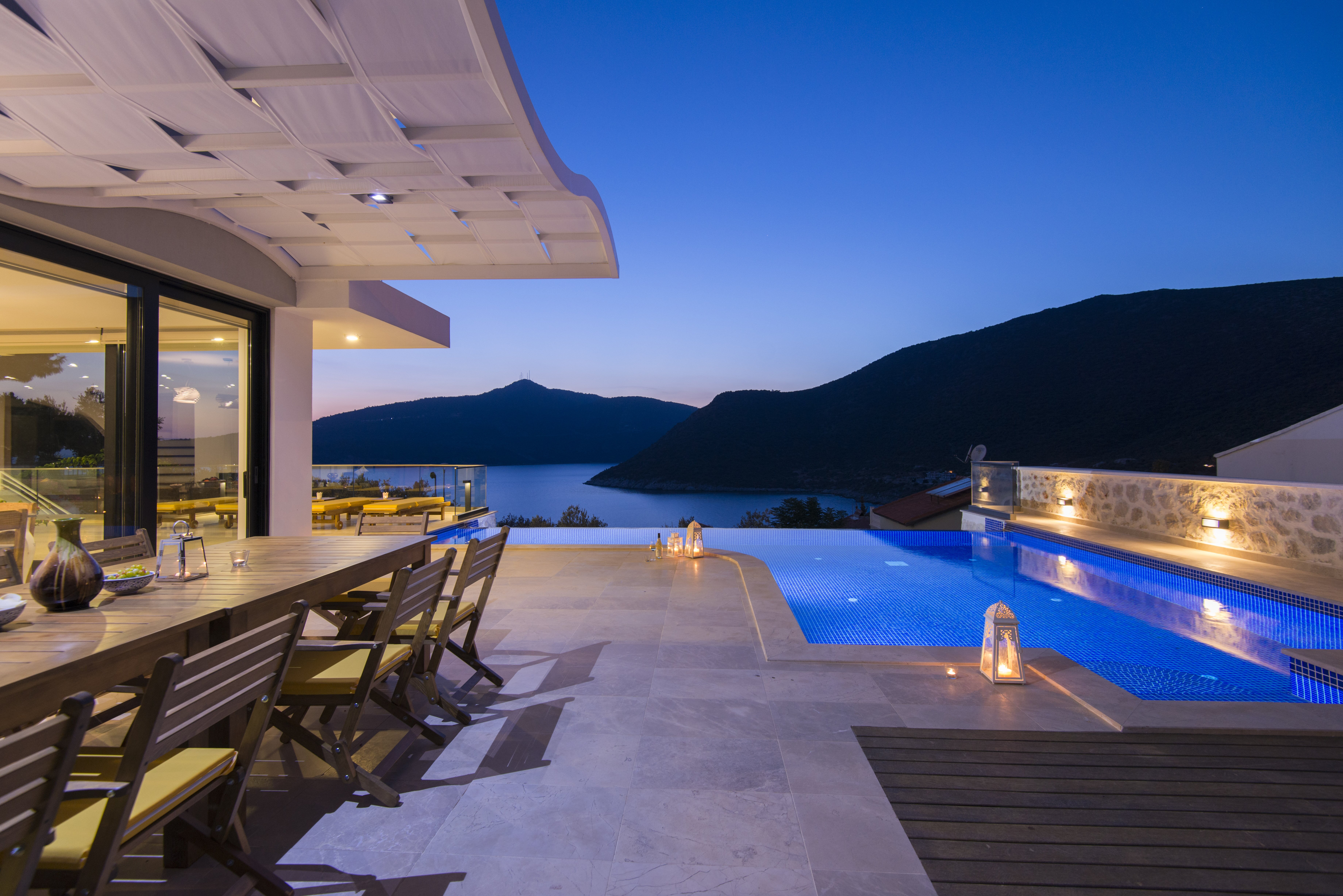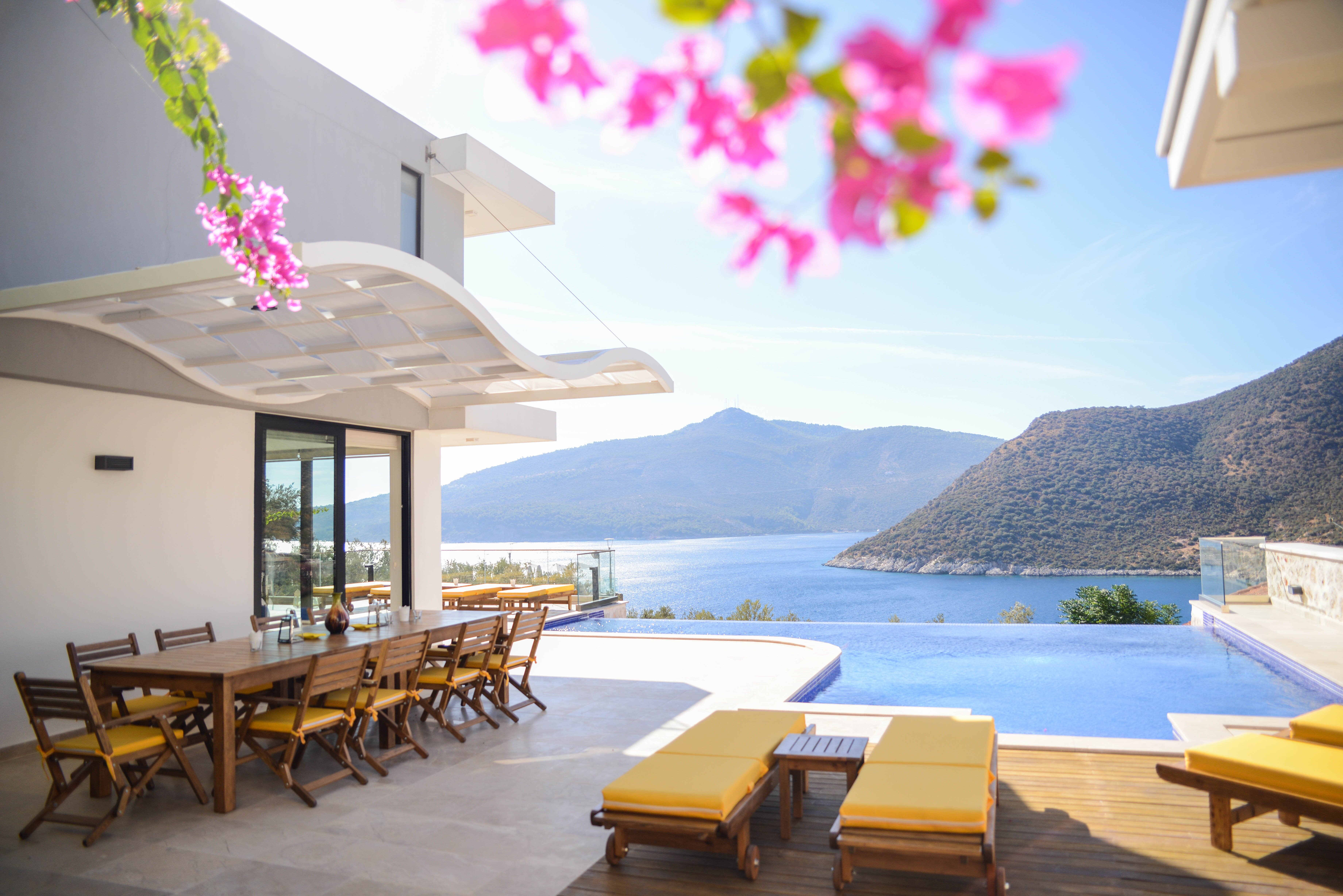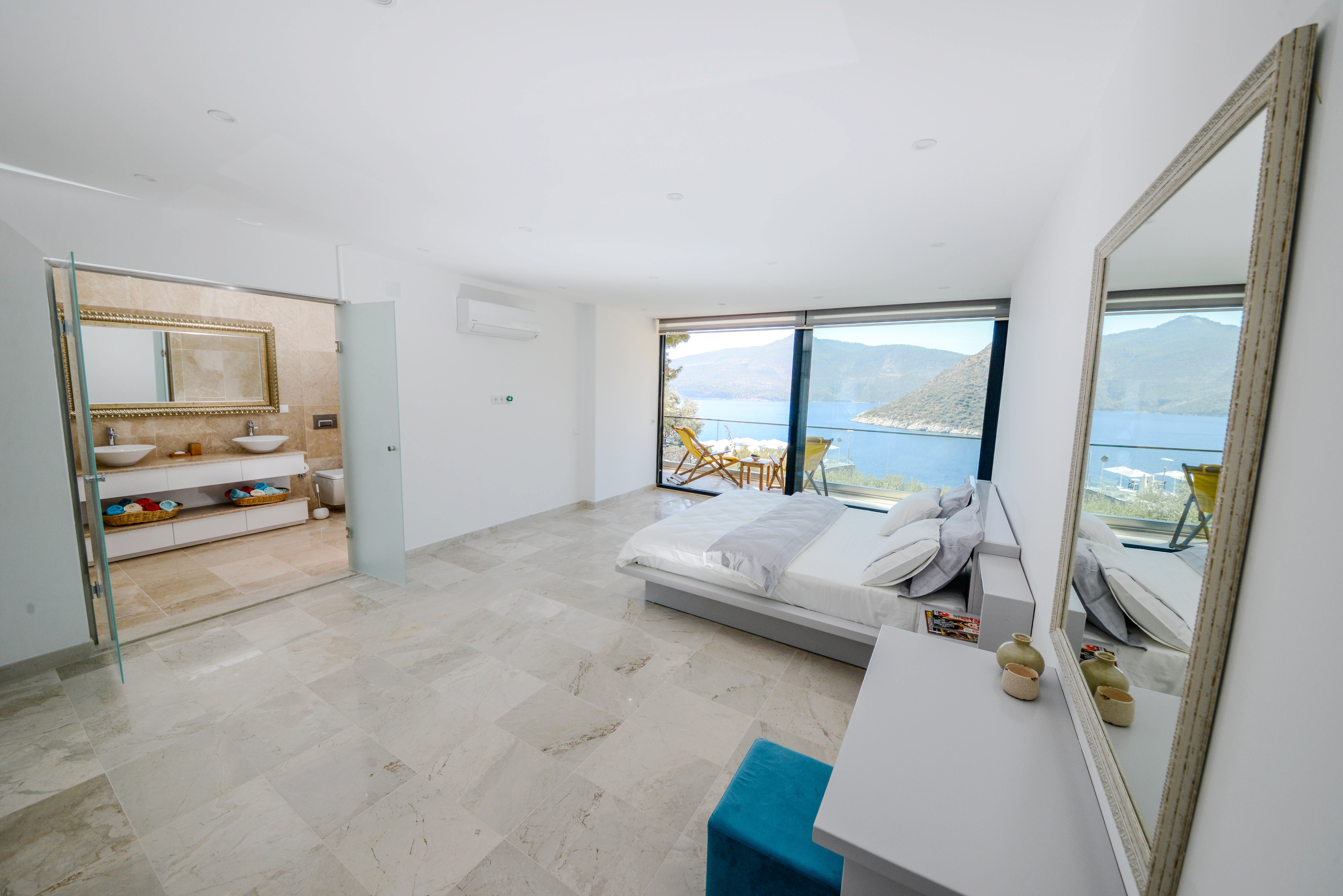 This modern five bedroom villa offers an exceptional high standard of accommodation in a great location nearby to the Kalamar beach club, one of Kalkan's best beach clubs. Contemporary architecture and design mixed with extraodinary sea views have come together to create some great living spaces perfect for a group of friends or extended family group. Set over three levels Villa Kalamar has an independent studio on the lower ground floor perfect for teenagers or grandparents and then four more bedrooms in the main house spread over the ground floor and first floor. Each bedroom in the main house has access to balconies with sea views out to the Kalamar Bay and bedrooms on the first floor also have great fitted wardrobe space. A spacious open plan living room, dining and kitchen on the ground floor leads out through sliding doors to the pool area with a bar and a stone built barbecue where one can enjoy refreshments by the pool in the day and sundowners whilst making the most of the evening sun looking out to sea across the pool.
