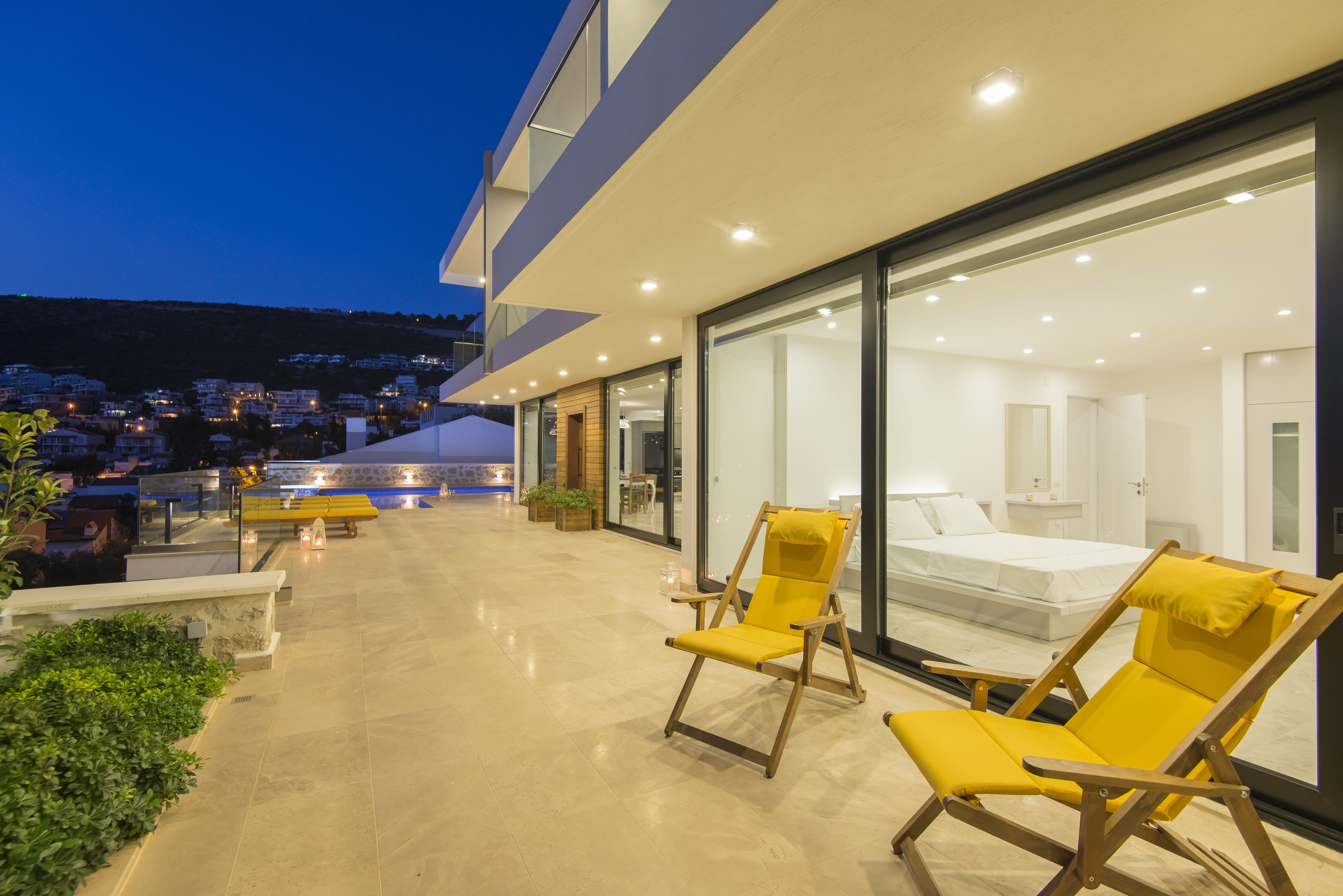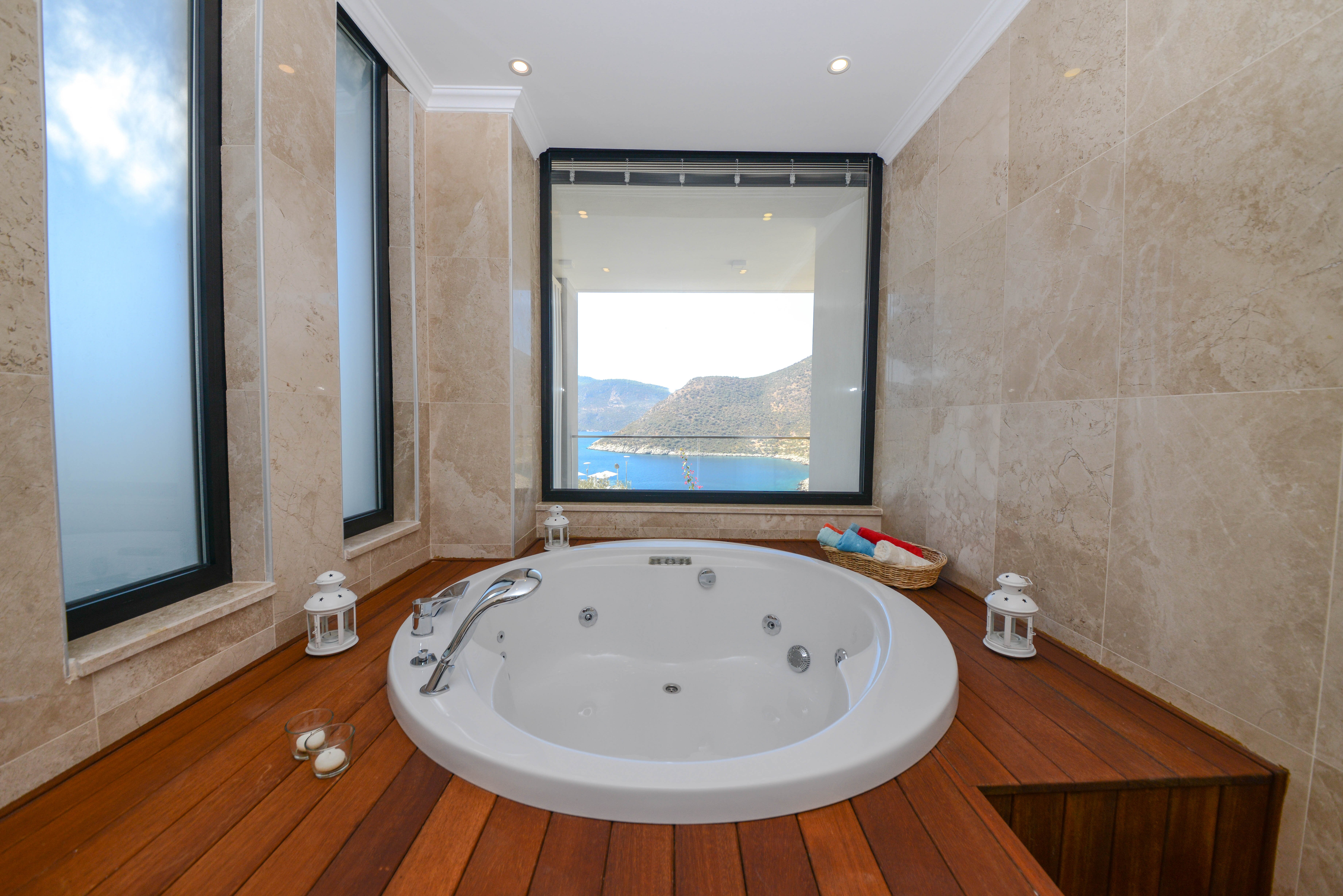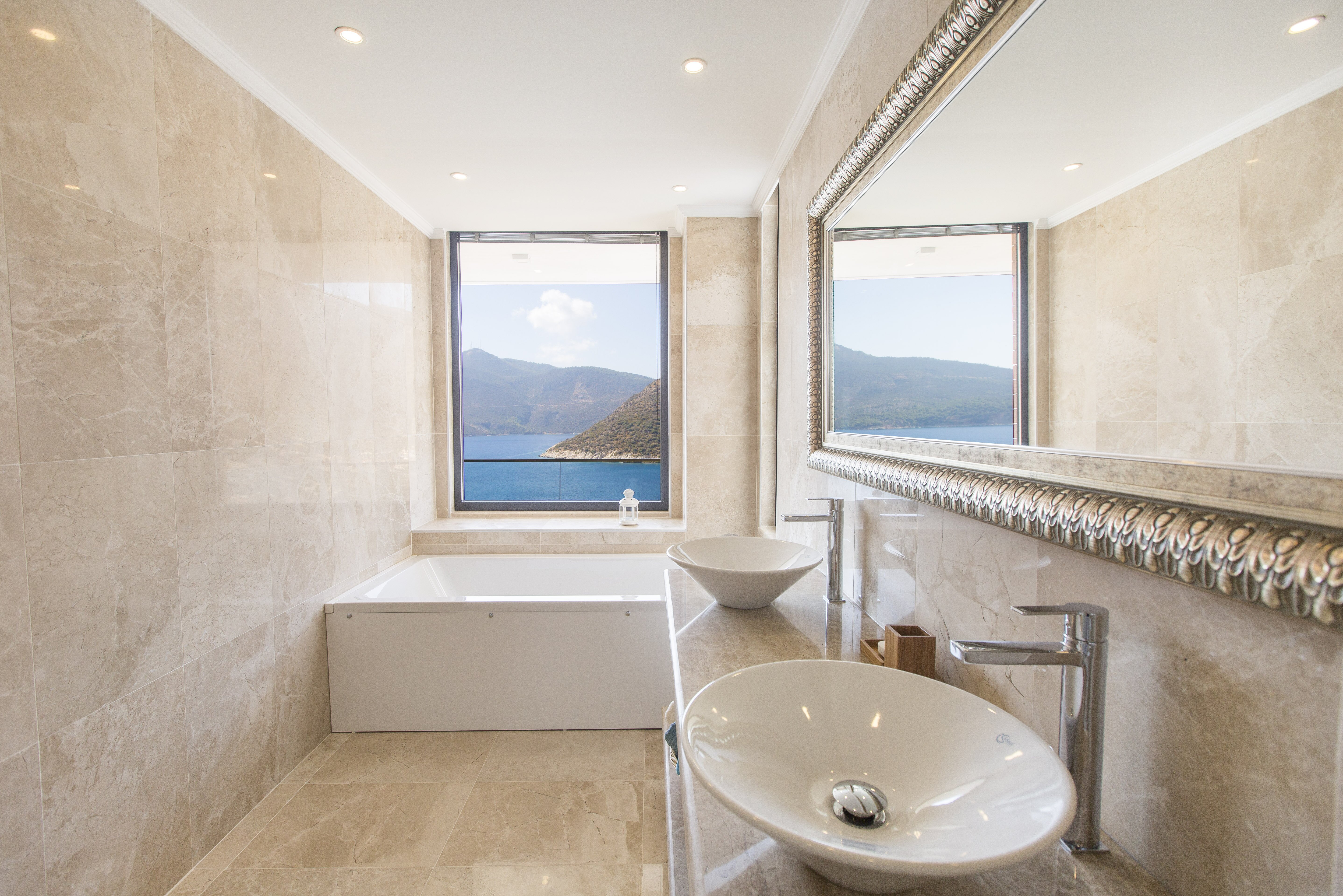 This modern five bedroom villa offers an exceptional high standard of accommodation in a great location nearby to the Kalamar beach club, one of Kalkan's best beach clubs. Contemporary architecture and design mixed with extraodinary sea views have come together to create some great living spaces perfect for a group of friends or extended family group. Set over three levels Villa Kalamar has an independent studio on the lower ground floor perfect for teenagers or grandparents and then four more bedrooms in the main house spread over the ground floor and first floor. Each bedroom in the main house has access to balconies with sea views out to the Kalamar Bay and bedrooms on the first floor also have great fitted wardrobe space. A spacious open plan living room, dining and kitchen on the ground floor leads out through sliding doors to the pool area with a bar and a stone built barbecue where one can enjoy refreshments by the pool in the day and sundowners whilst making the most of the evening sun looking out to sea across the pool.