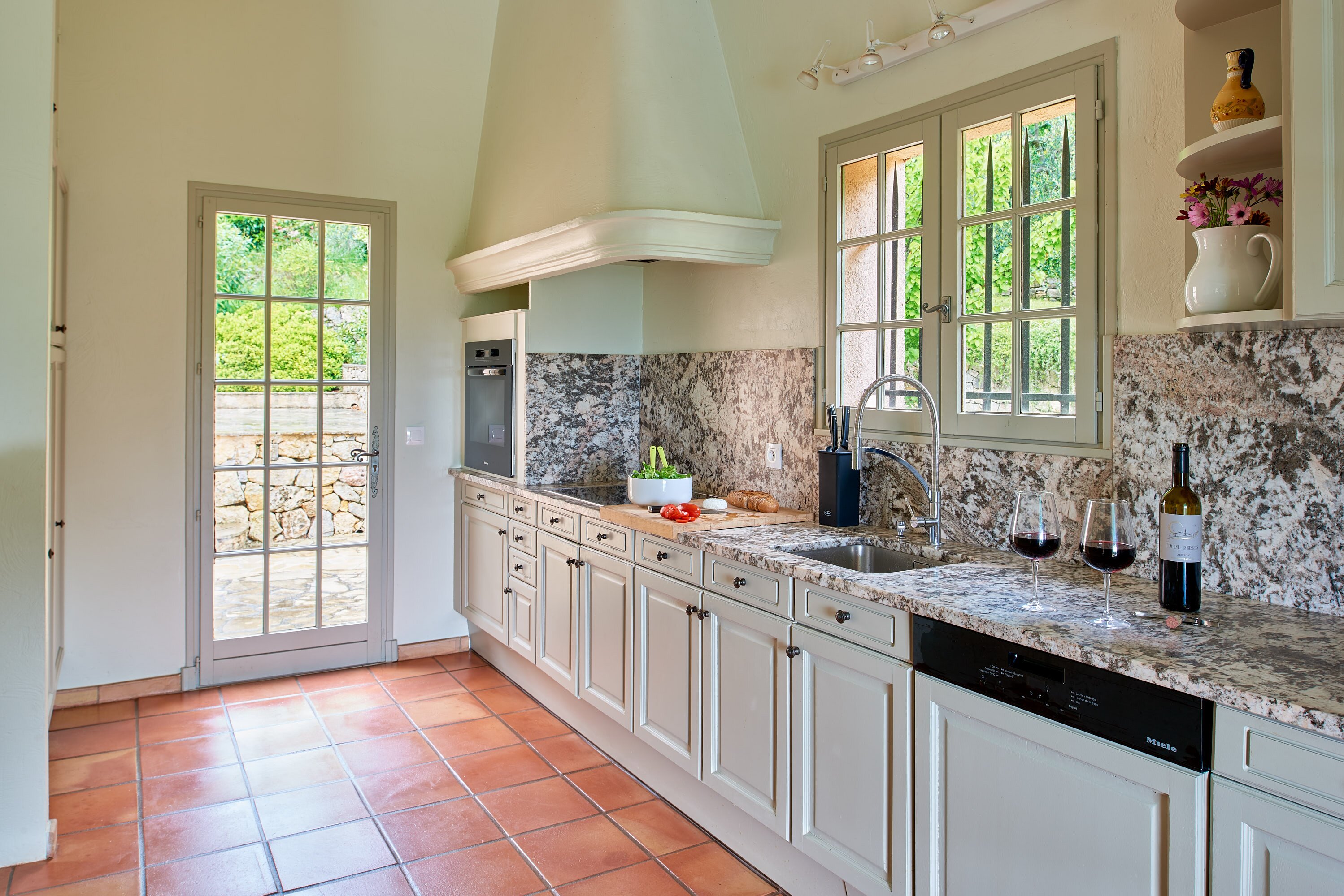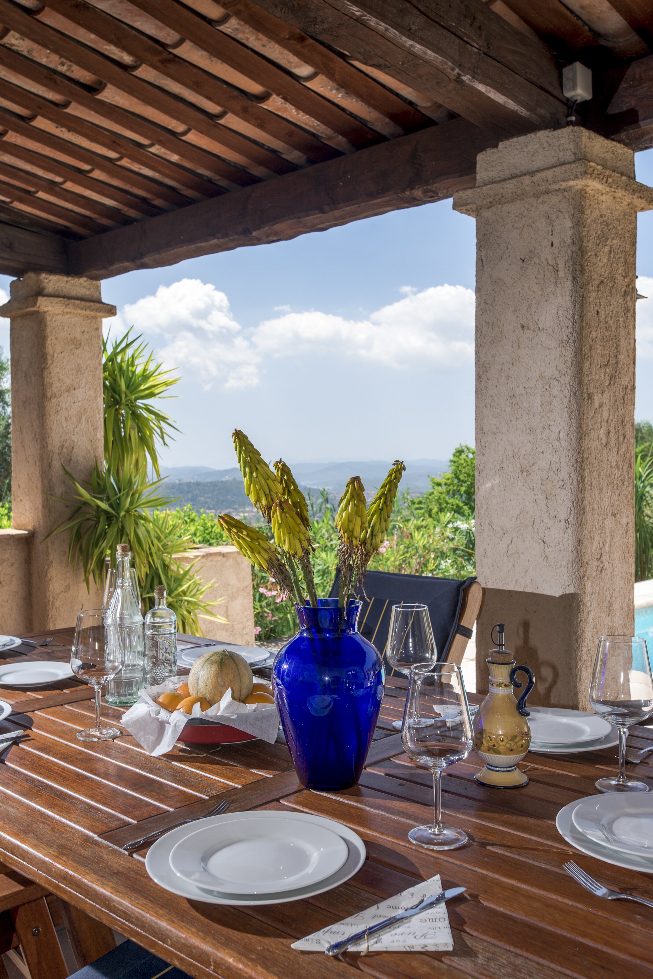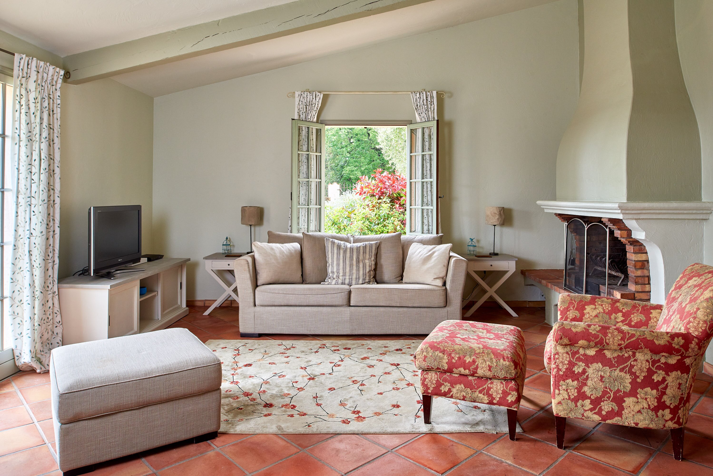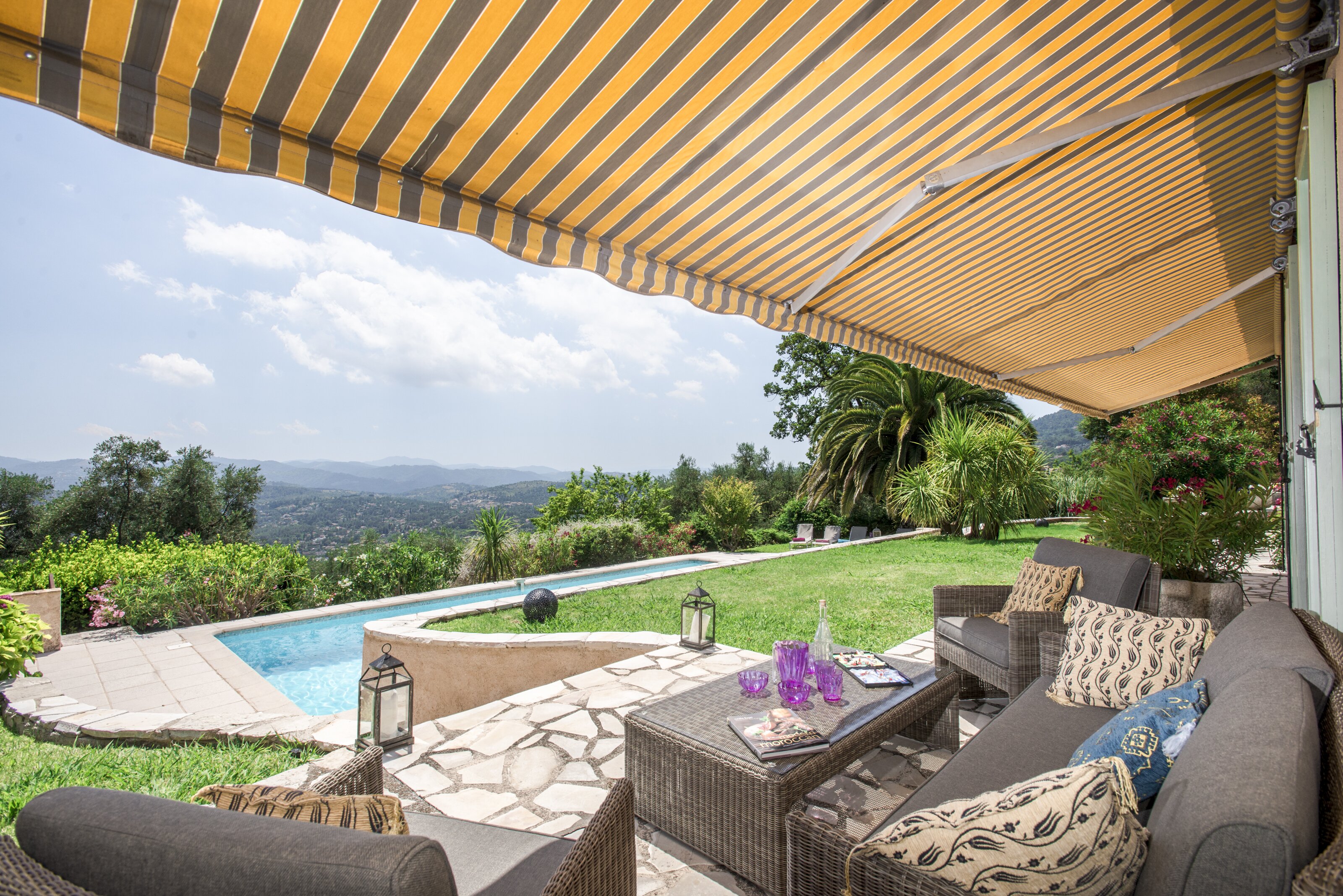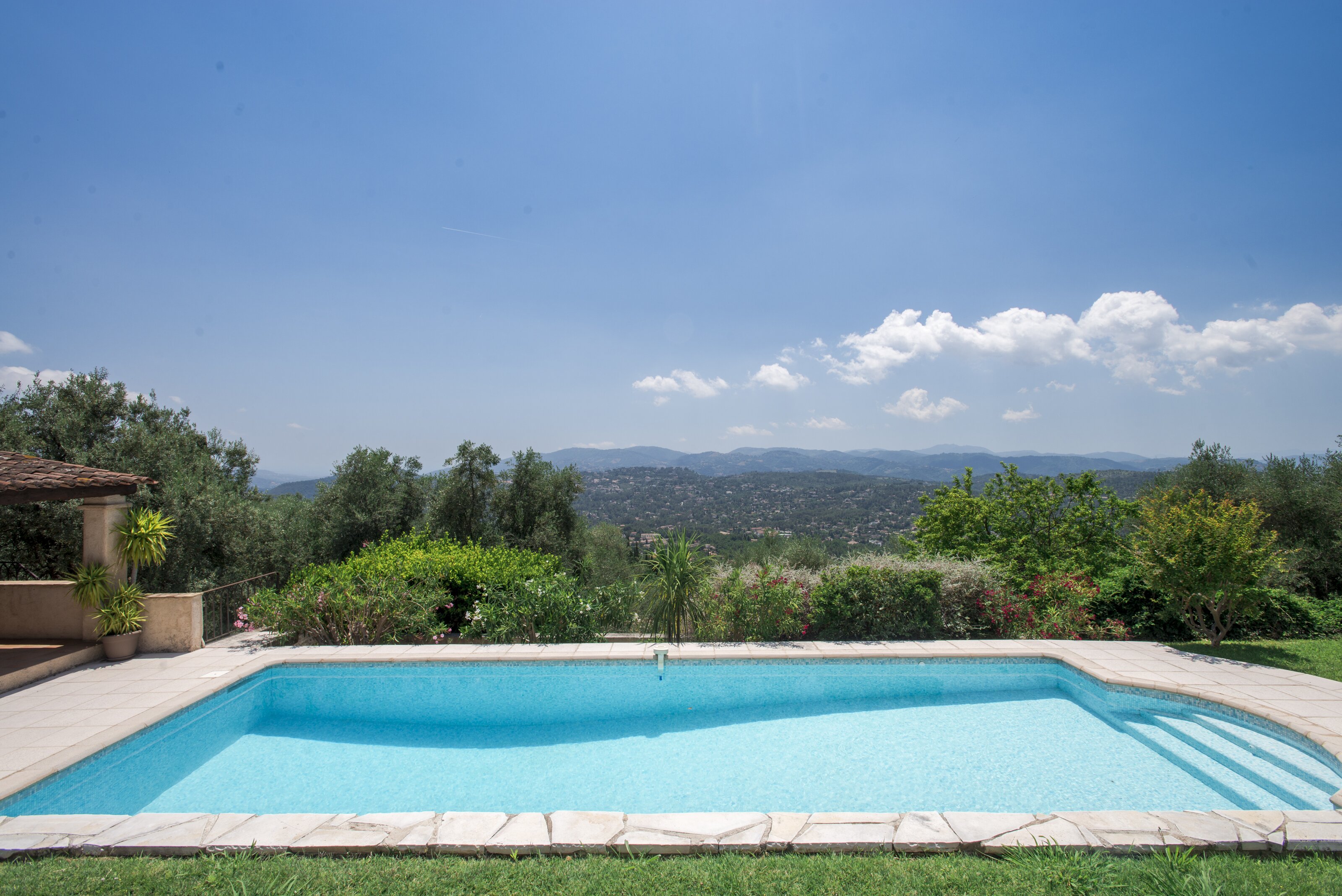 Set high in the Cabris hills, with sweeping panoramas to the Bay of Cannes and the Esterel sanctuary, this is that wonderful combination of peaceful privacy and easy access. Restaurants in medieval Cabris village are just 3km away, shops in Peymeinade are 5km and beaches in glamorous Cannes and Antibes are within a 25km drive. But the villa’s tranquil tiered gardens are a real temptation to idleness. Terraces wrap around the house, one facing east and furnished for breakfast in the morning sun; another, canopied for shade, forms a south-facing al fresco sitting room, overlooking the olive grove; and a third, sunset patio is accessed through one of the bedrooms. Set in its own paved terrace, a 12.5 metre swimming pool with a pool house at the end, complete with dining suite, summer kitchen and barbecue / fireplace. Inside the very welcoming house are three simply-styled bedrooms, and a spacious open-plan living room includes a galley kitchen, sitting and dining areas, all with French doors to the garden. And for complete relaxation, cook service can be added.
